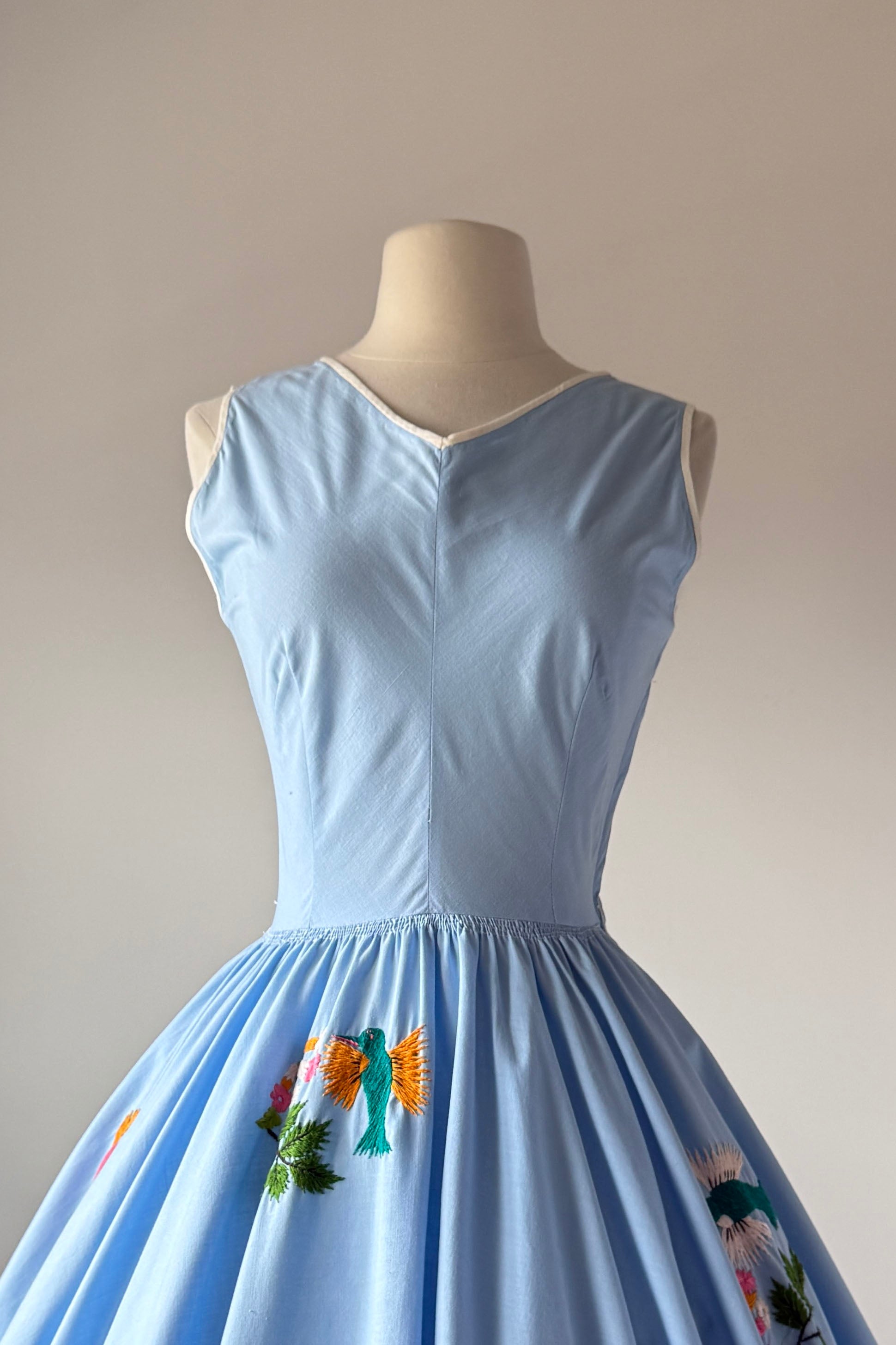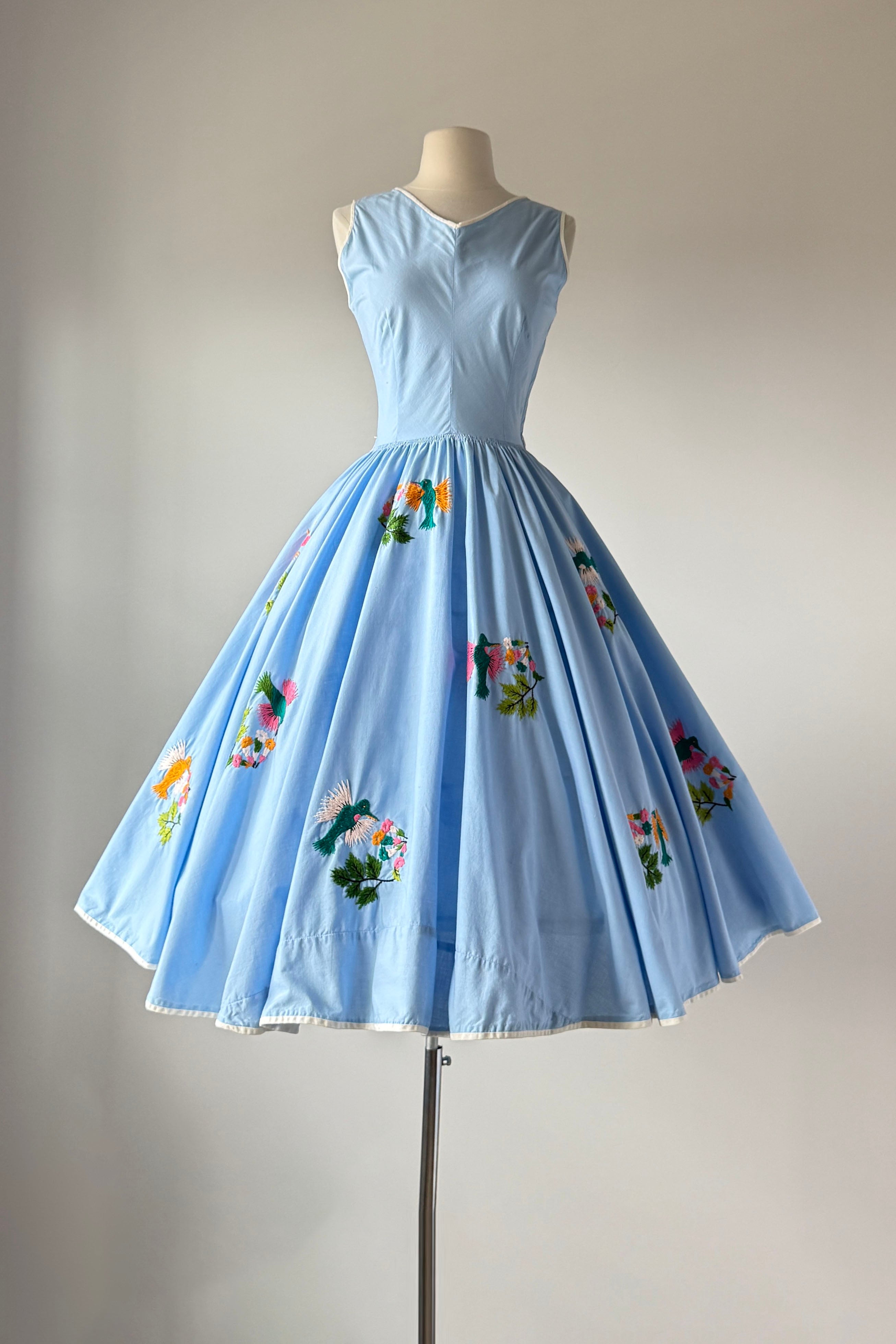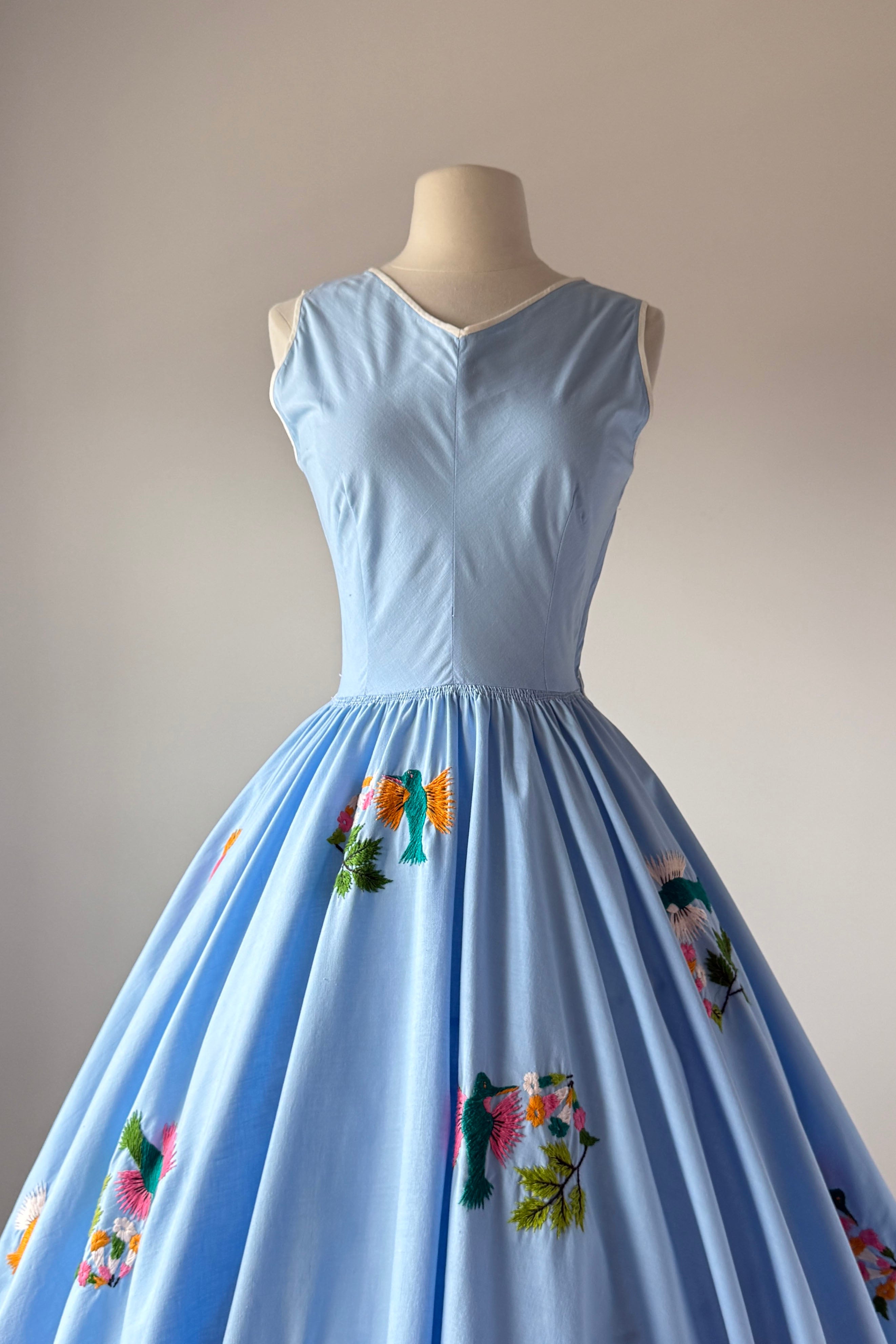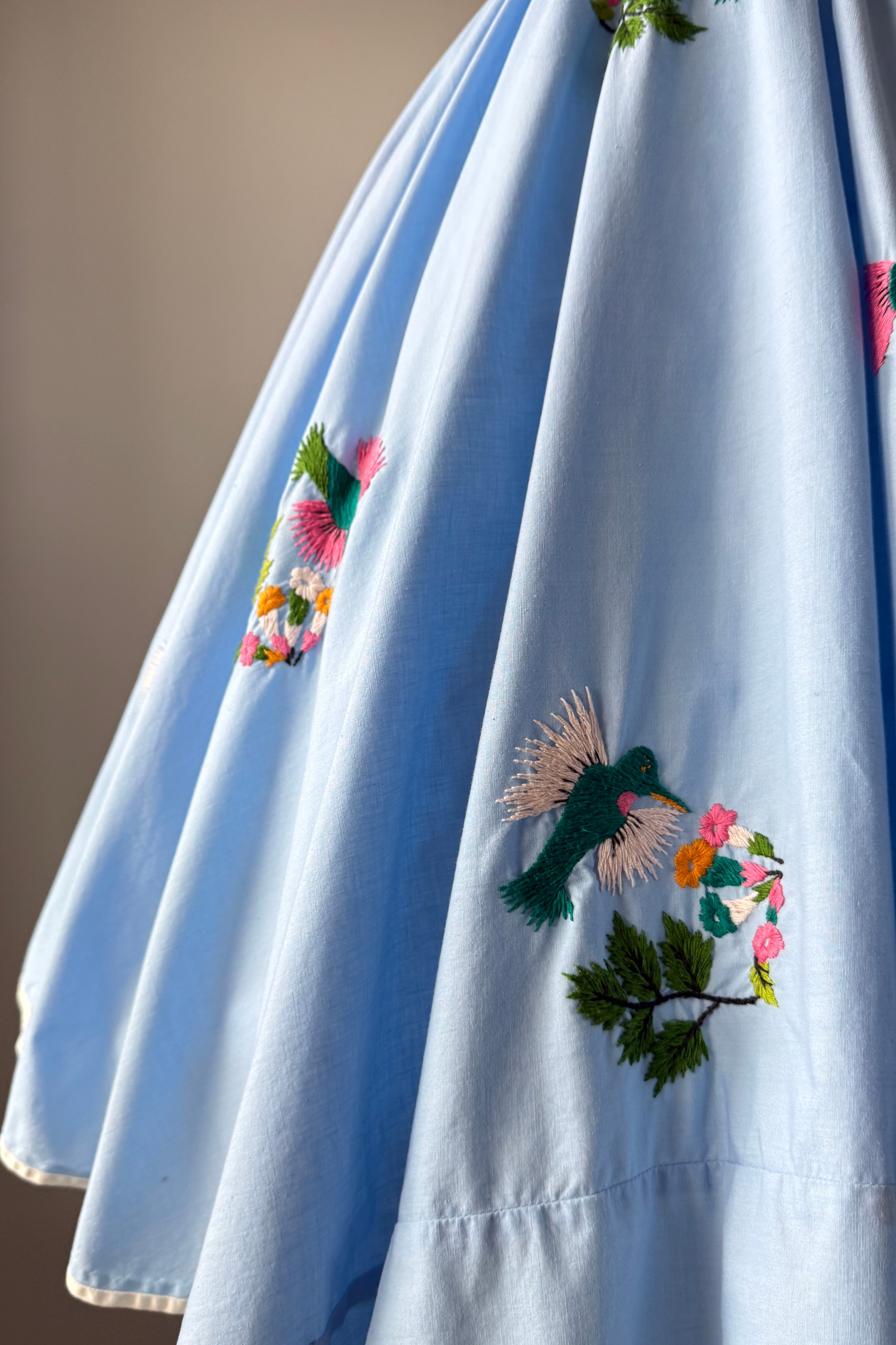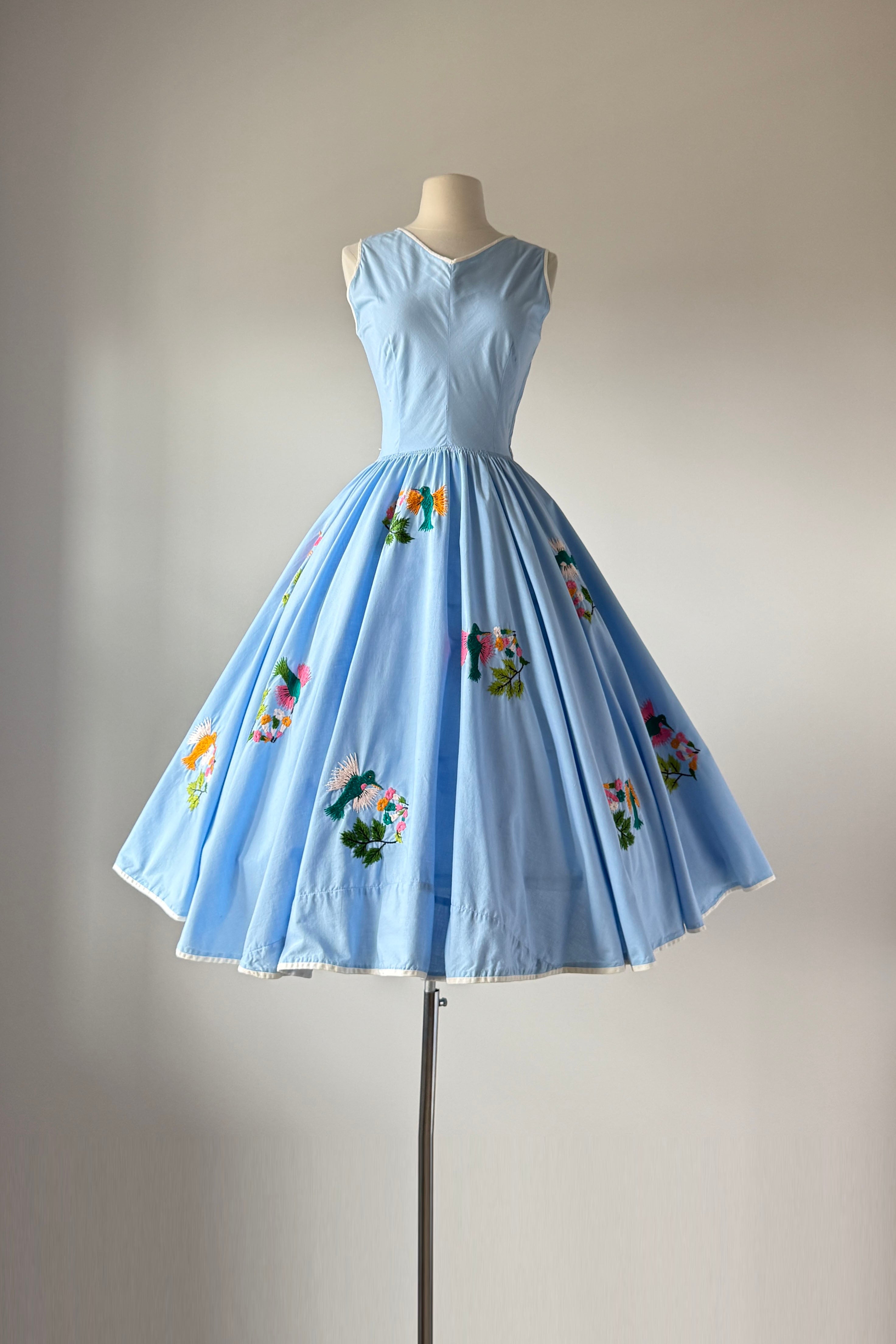 VINTAGE DRESSVintage 1950s dress. Features blue cotton with yarn embroidery hummingbirds, huge full sweep skirt, metal side zipper. By Tachi Castillo. Tachi (Luz Maria) Castillo was born in Mexico City in 1918. In 1930 her family settled in Taxco, because her father, a military engineer, was overseeing the installation of a telegraph system in that part of Mexico. She enjoyed the companionship of four brothers and one sister, all of whom soon established impressive, and often international, reputations for their accomplishments. Tachi Castillo’s brothers were soon renowned for their distinctive silver jewelry designs and Tachi was the first to introduce hand-embroidered dresses in Taxco, despite having been advised not to pursue any career other than designing or working with silver. The first two dresses she designed and created were sold from the silver shop the same morning she put them there. Around 1937 Tachi Castillo opened her eponymous store in Casa Borda and sometime before the end of the 1940s she married Alphonso Ramirez-Mendoza, a textile designer who later managed her business. In 1944 Tachi Castillo and her husband opened a store in Taxco and named it Gracias a Dios (thanks be to God), across the street from her family home. Her fashion designs caught the eye of a vacationing Hollywood actress, Joan Fontaine, who brought many of Tachi’s dresses back with her. Soon Tachi Castillo was dressing other Hollywood stars, such as Brigitte Bardot and Lana Turner. Non-Hollywood celebrities could be seen in Castillo designs, too, such as Princess Anne and Frida Kahlo. Her feminine and romantic designs of cotton pintuck peasant blouses and wide swirly skirts skillfully paired the wonderful designs of her native Mexico with modern, hand-painted, and hand-embroidered designs. She is credited with having created the popular “Mexican wedding dress” while she also specialized in colorful evening apparel. Tachi Castillo never retired and worked until she died in 1999. Her family home is now a popular, charming , and historic hotel named Hotel Mi Casita (Hotel My House), owned and operated by her family. Info courtesy of the Vintage Fashion GuildExcellent condition. A few tiny spots. Freshly laundered and ready to wear.XS/S. Length 48Bodice 17Bust 36-37Waist 26-27As with all vintage, please expect wear consistent with age. All sales are final. No order cancellations.0810 | 2608
