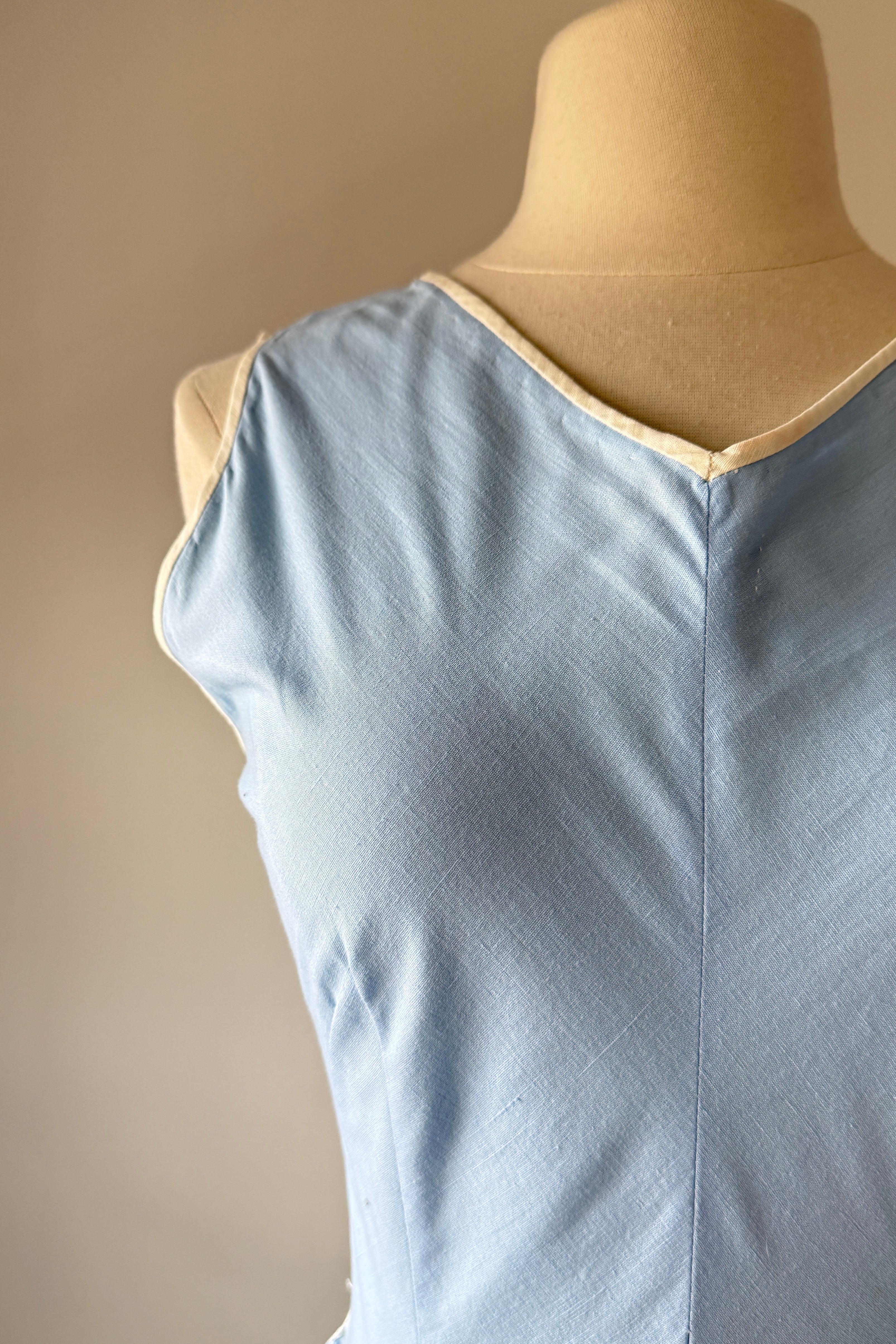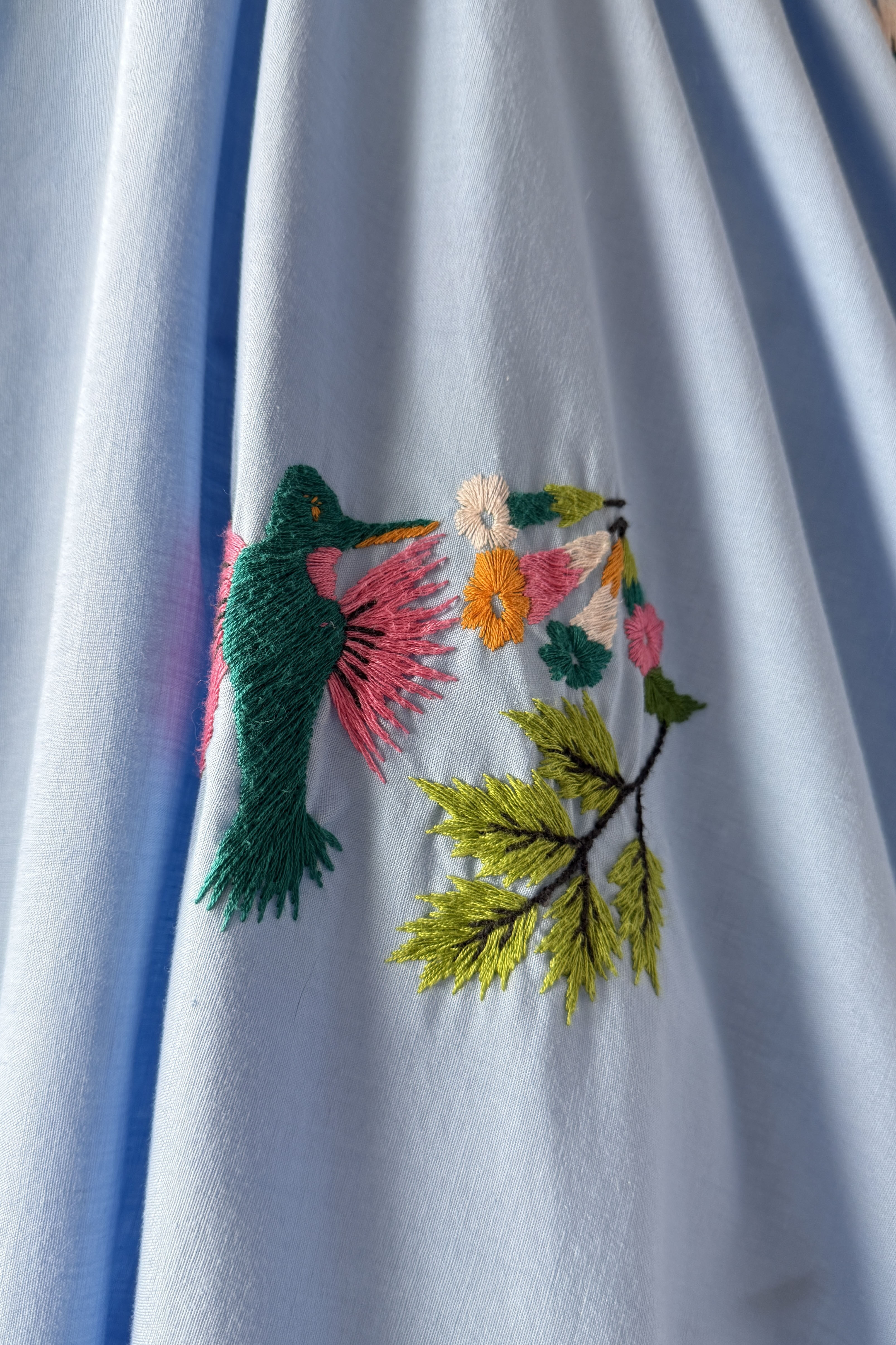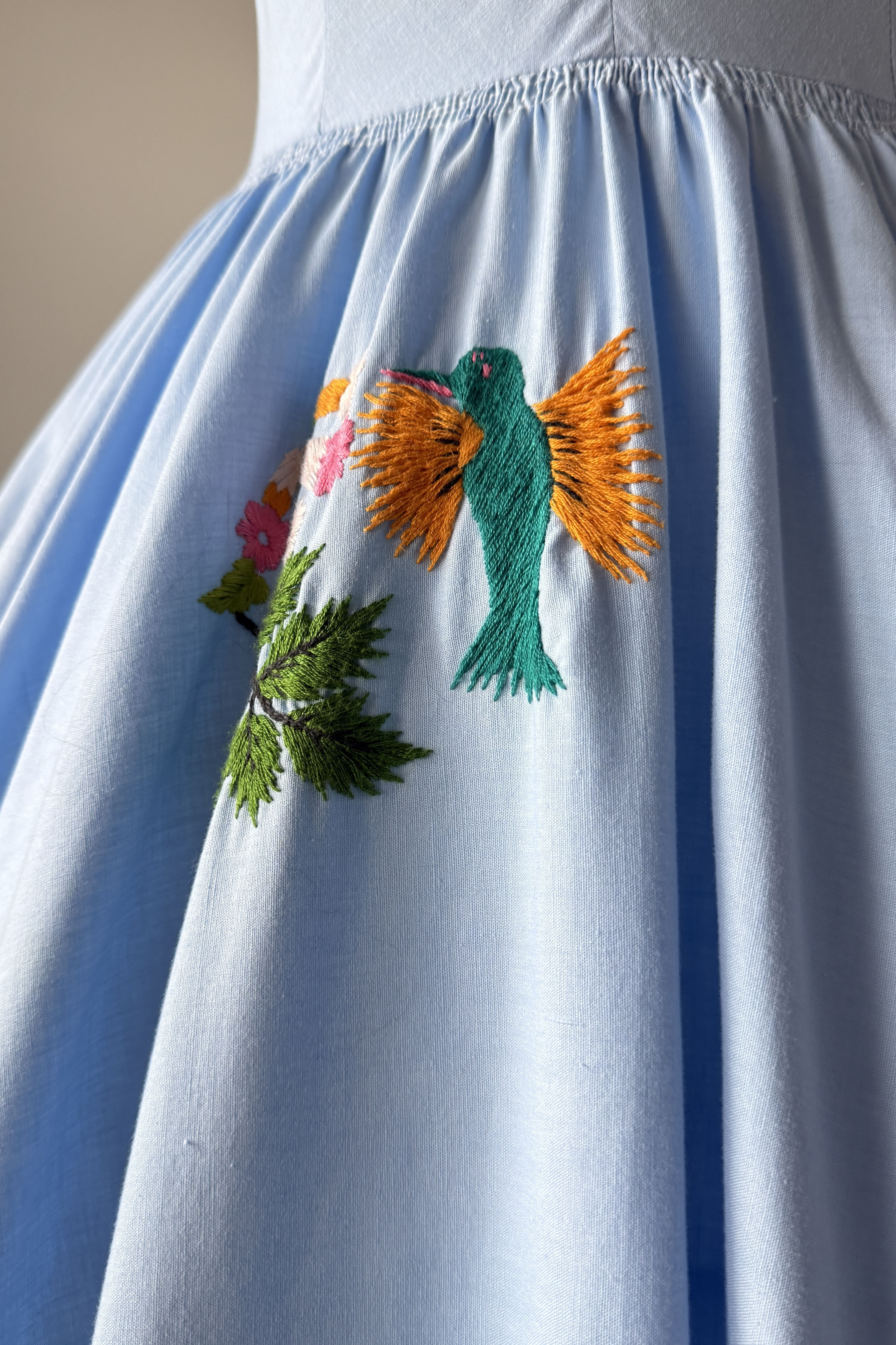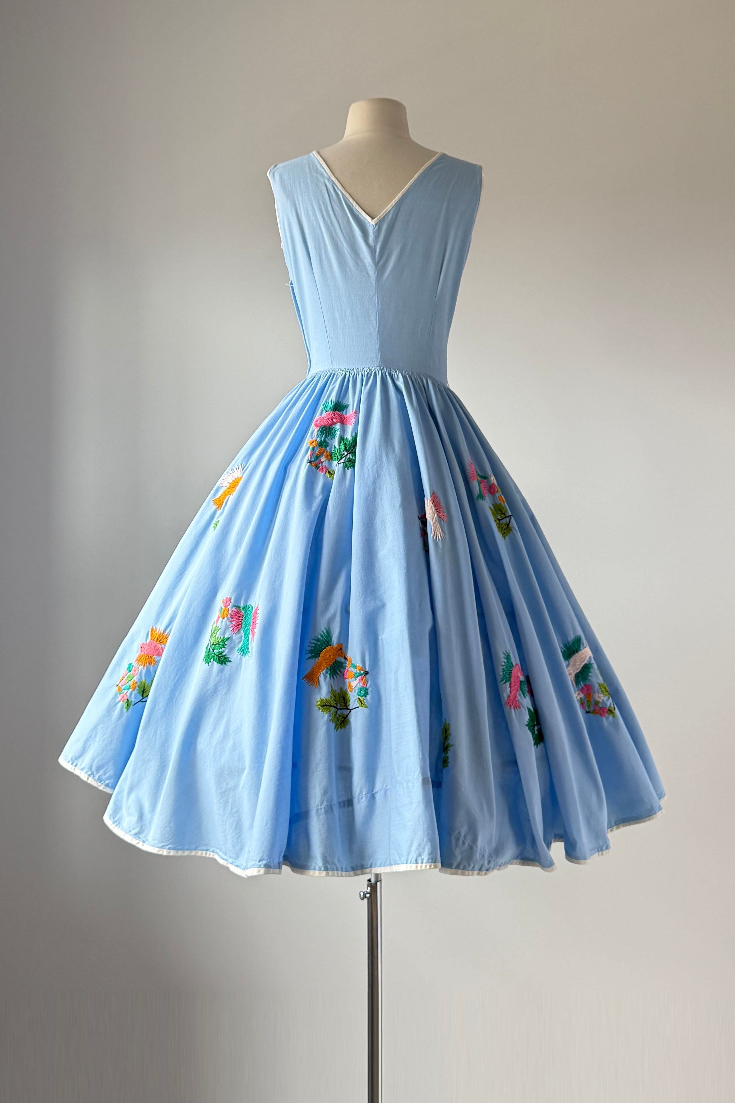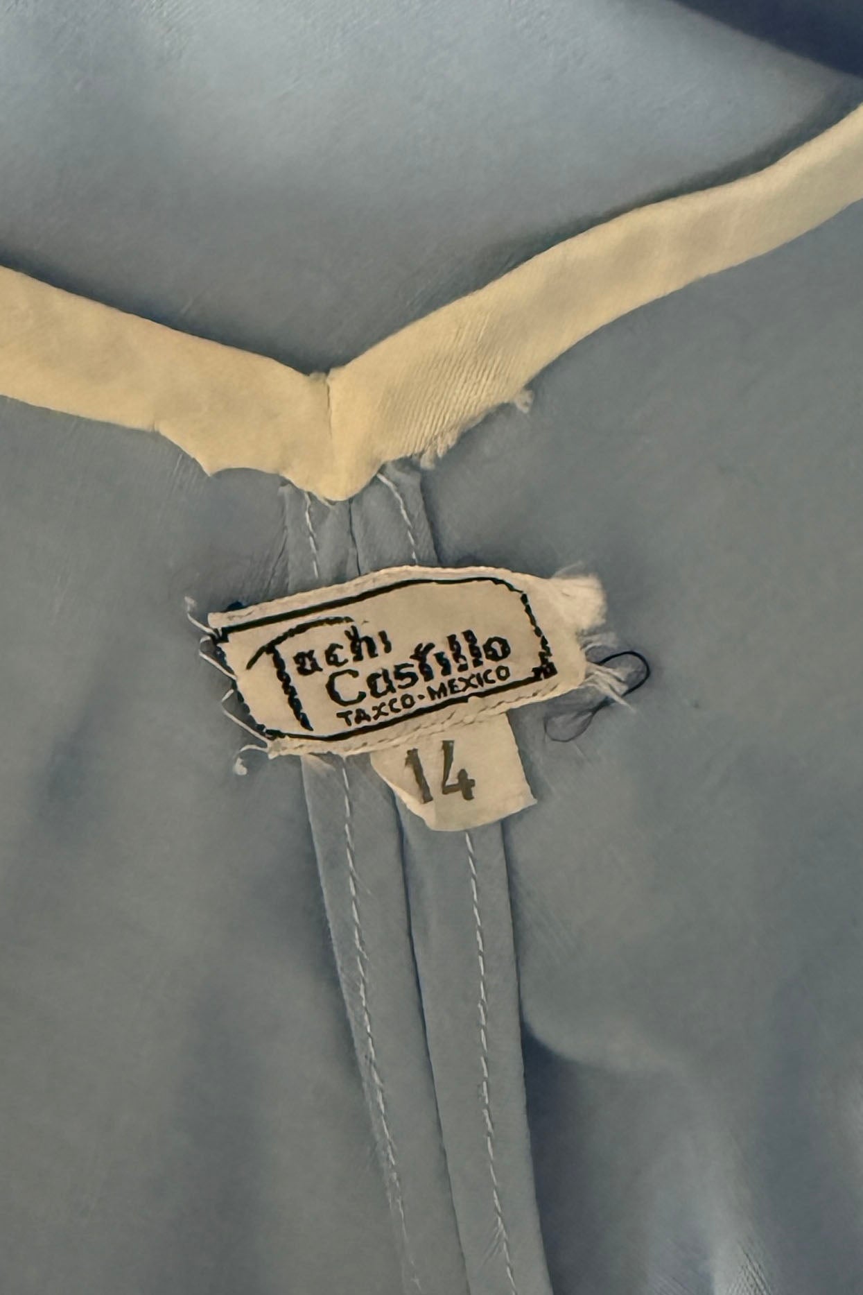 VINTAGE DRESSVintage 1950s dress. Features blue cotton with yarn embroidery hummingbirds, huge full sweep skirt, metal side zipper. By Tachi Castillo. Tachi (Luz Maria) Castillo was born in Mexico City in 1918. In 1930 her family settled in Taxco, because her father, a military engineer, was overseeing the installation of a telegraph system in that part of Mexico. She enjoyed the companionship of four brothers and one sister, all of whom soon established impressive, and often international, reputations for their accomplishments. Tachi Castillo’s brothers were soon renowned for their distinctive silver jewelry designs and Tachi was the first to introduce hand-embroidered dresses in Taxco, despite having been advised not to pursue any career other than designing or working with silver. The first two dresses she designed and created were sold from the silver shop the same morning she put them there. Around 1937 Tachi Castillo opened her eponymous store in Casa Borda and sometime before the end of the 1940s she married Alphonso Ramirez-Mendoza, a textile designer who later managed her business. In 1944 Tachi Castillo and her husband opened a store in Taxco and named it Gracias a Dios (thanks be to God), across the street from her family home. Her fashion designs caught the eye of a vacationing Hollywood actress, Joan Fontaine, who brought many of Tachi’s dresses back with her. Soon Tachi Castillo was dressing other Hollywood stars, such as Brigitte Bardot and Lana Turner. Non-Hollywood celebrities could be seen in Castillo designs, too, such as Princess Anne and Frida Kahlo. Her feminine and romantic designs of cotton pintuck peasant blouses and wide swirly skirts skillfully paired the wonderful designs of her native Mexico with modern, hand-painted, and hand-embroidered designs. She is credited with having created the popular “Mexican wedding dress” while she also specialized in colorful evening apparel. Tachi Castillo never retired and worked until she died in 1999. Her family home is now a popular, charming , and historic hotel named Hotel Mi Casita (Hotel My House), owned and operated by her family. Info courtesy of the Vintage Fashion GuildExcellent condition. A few tiny spots. Freshly laundered and ready to wear.XS/S. Length 48Bodice 17Bust 36-37Waist 26-27As with all vintage, please expect wear consistent with age. All sales are final. No order cancellations.0810 | 2608