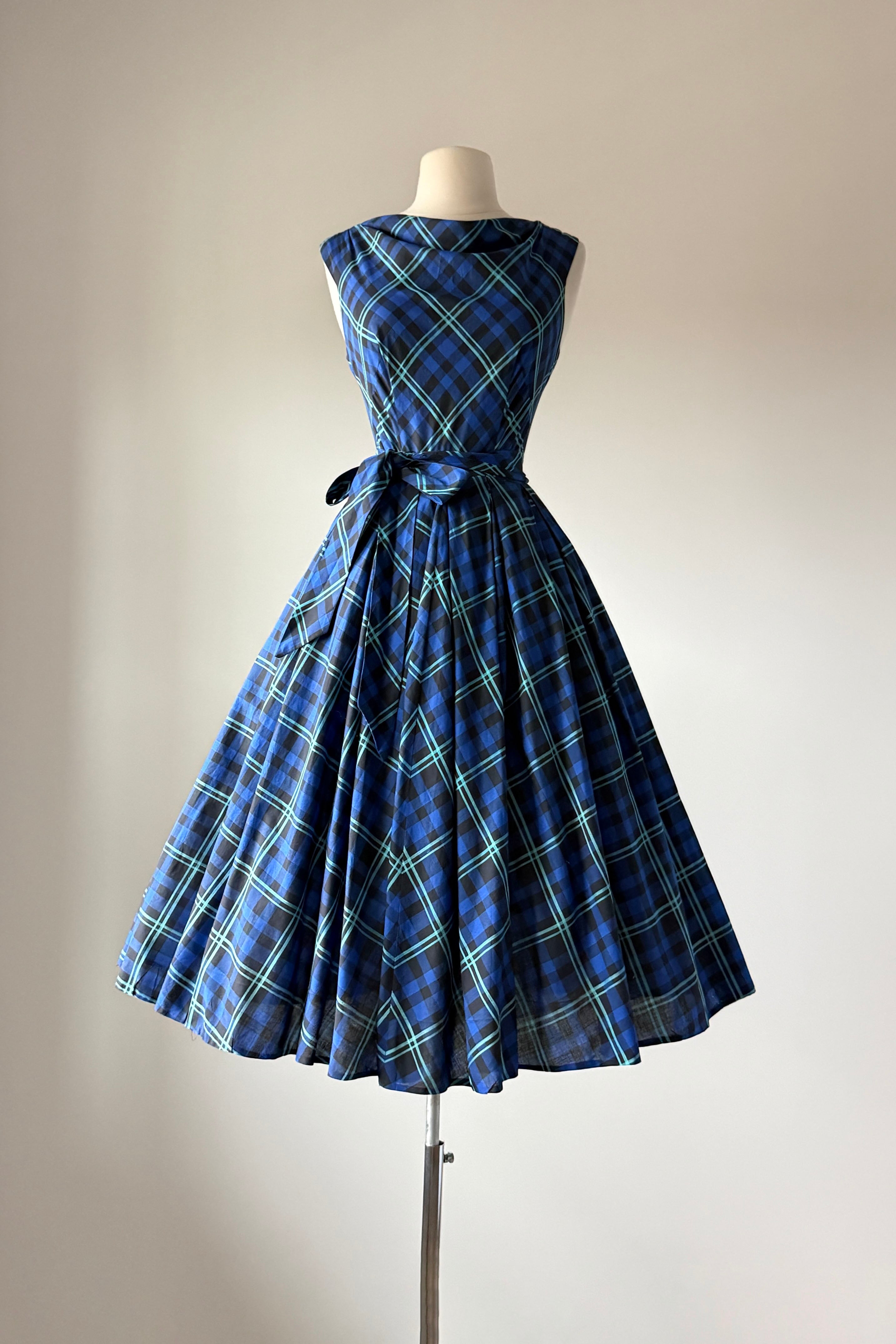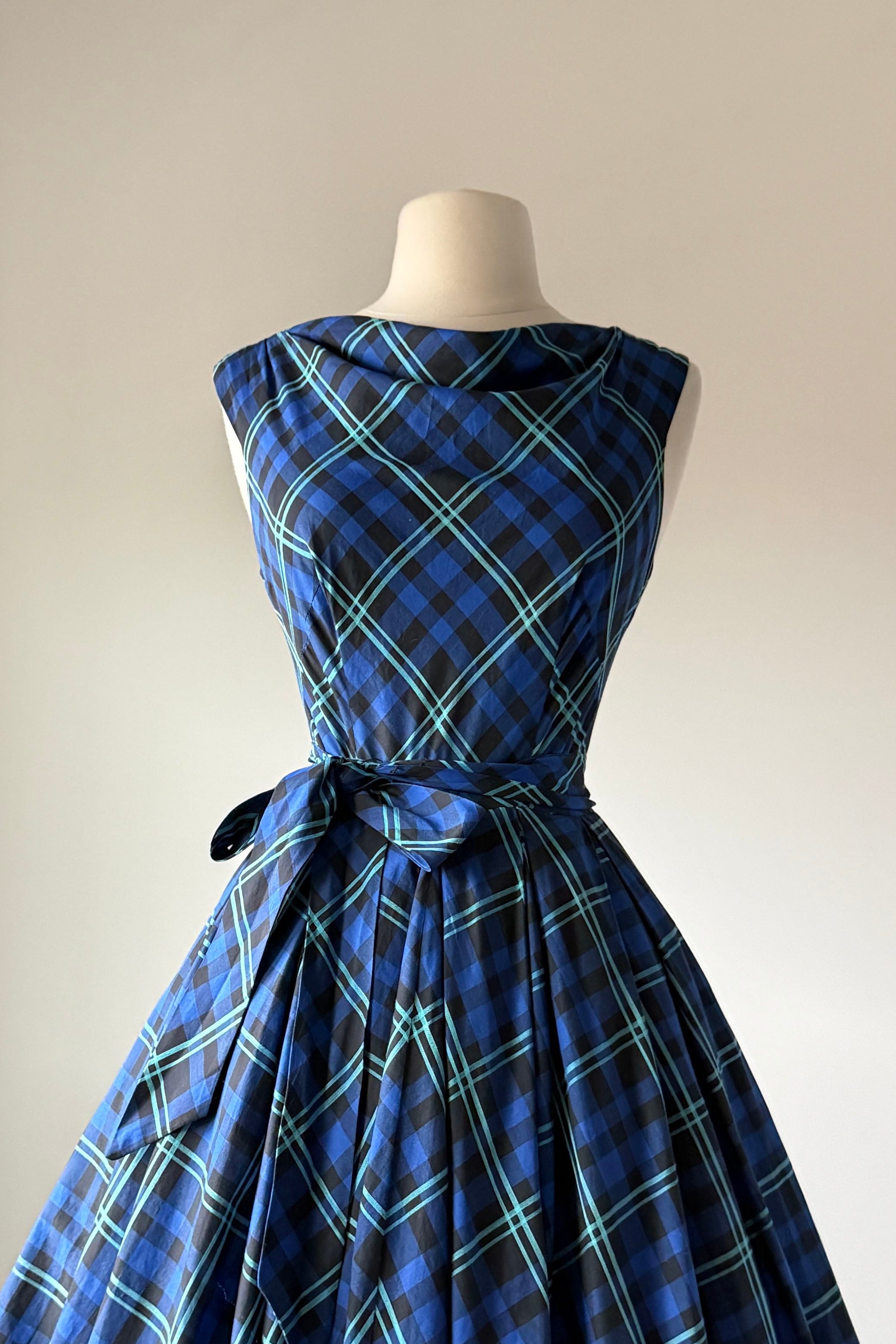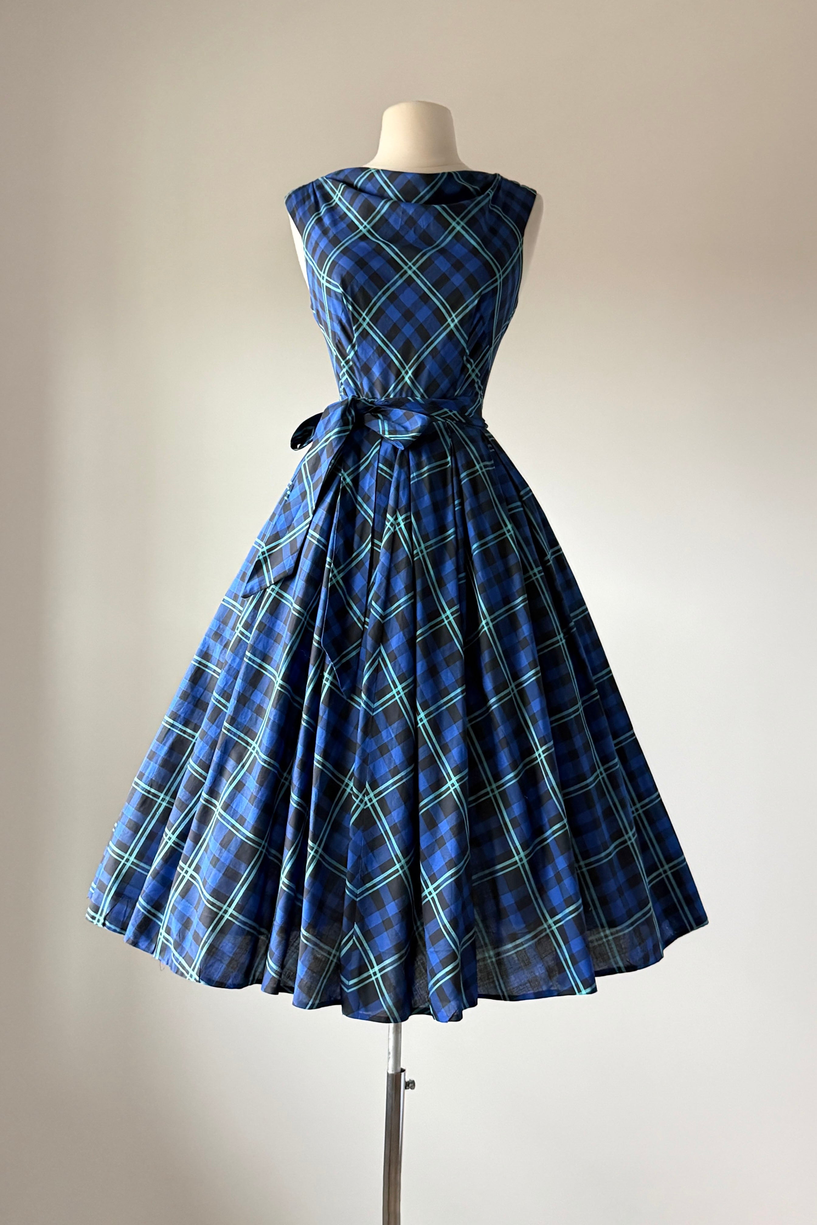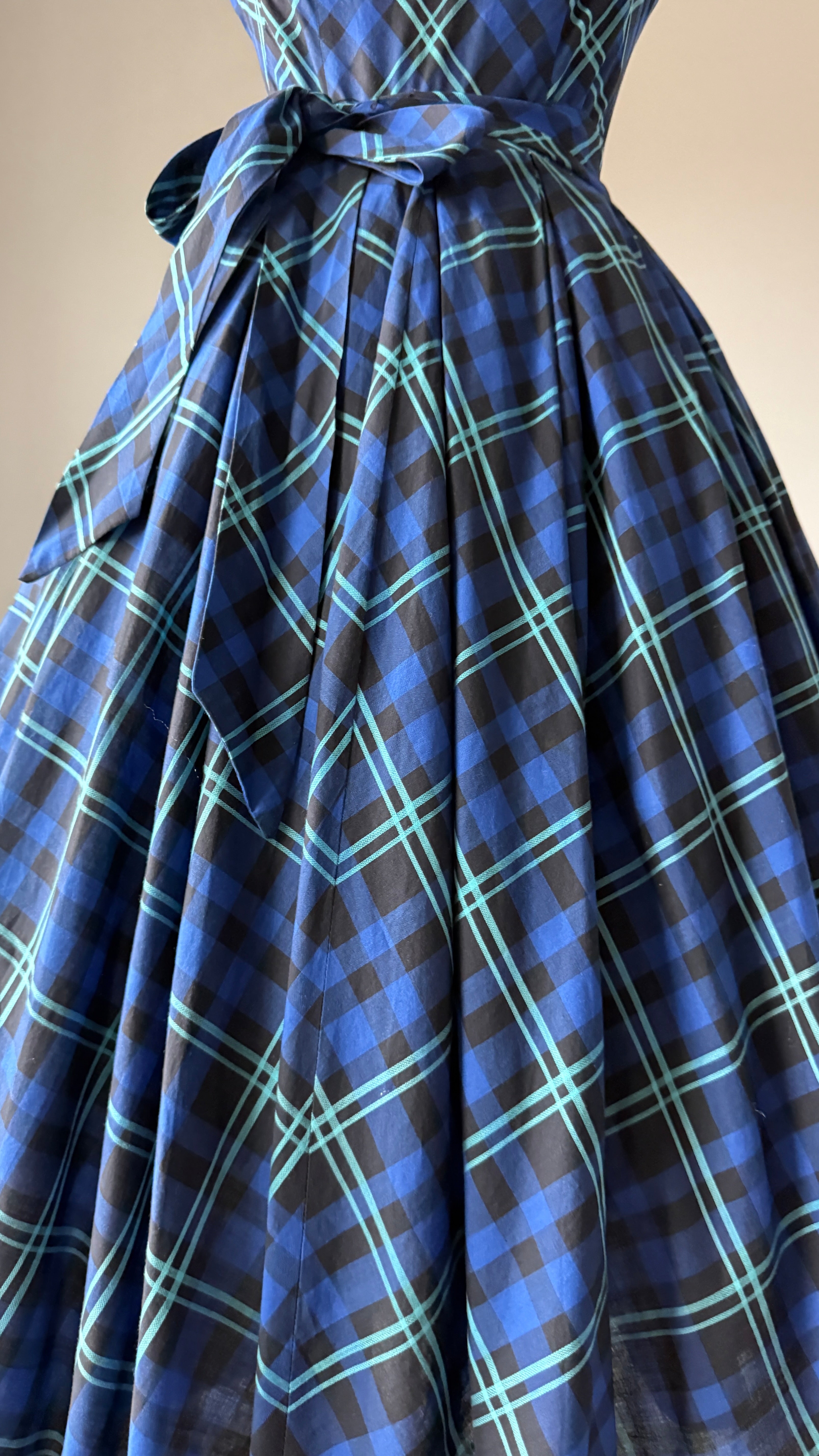 VINTAGE DRESSVintage 1950s dress. Features blue plaid cotton, draped neckline with weight, metal back zipper, matching tie belt. By Tailored Junior.Excellent condition. Freshly laundered and ready to wear. Faint crease at hem where it's been let out to original length.XS/S. Length 43.5Bodice 15Bust 36Waist 26As with all vintage, please expect wear consistent with age. All sales are final. No order cancellations.0855 | 2608