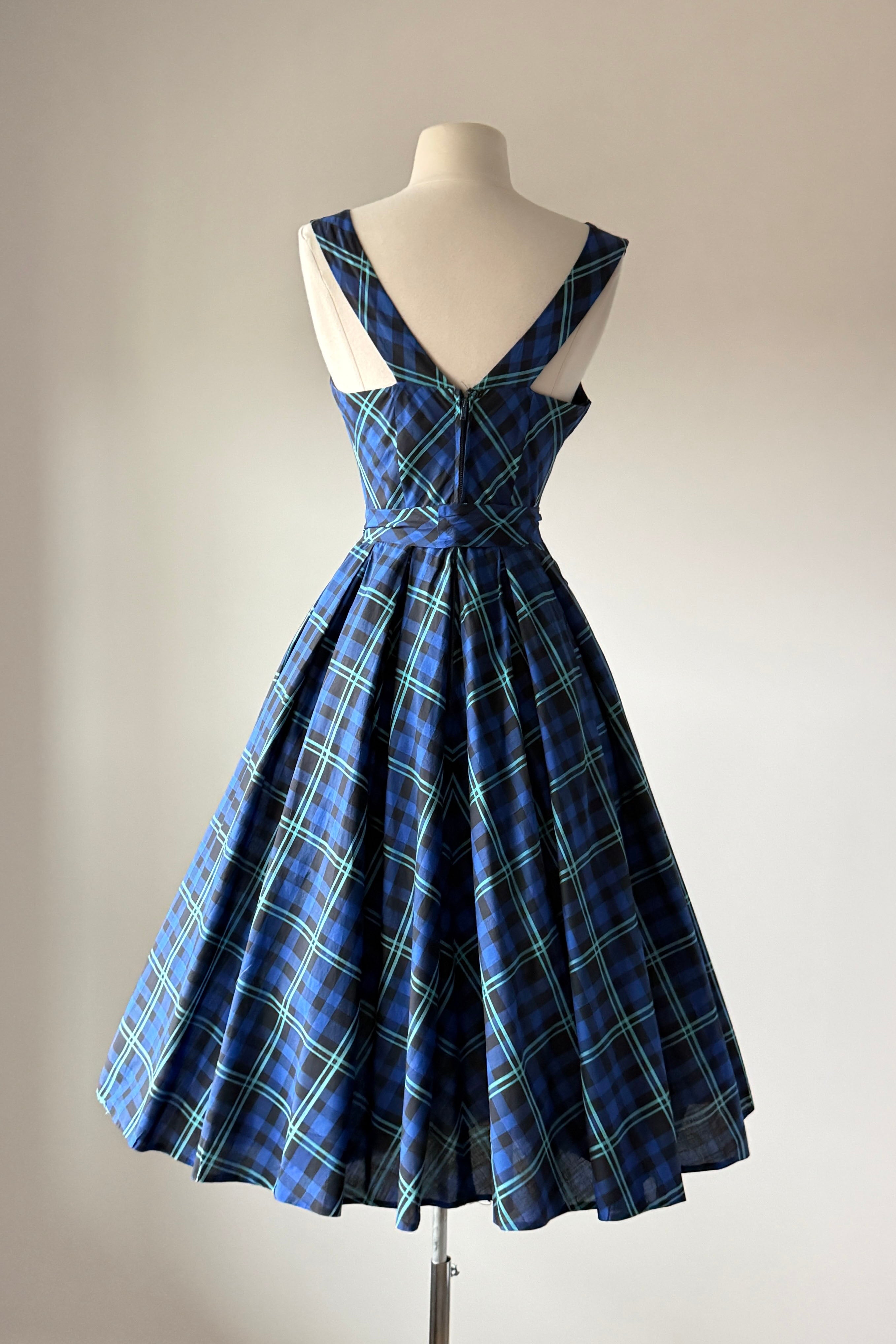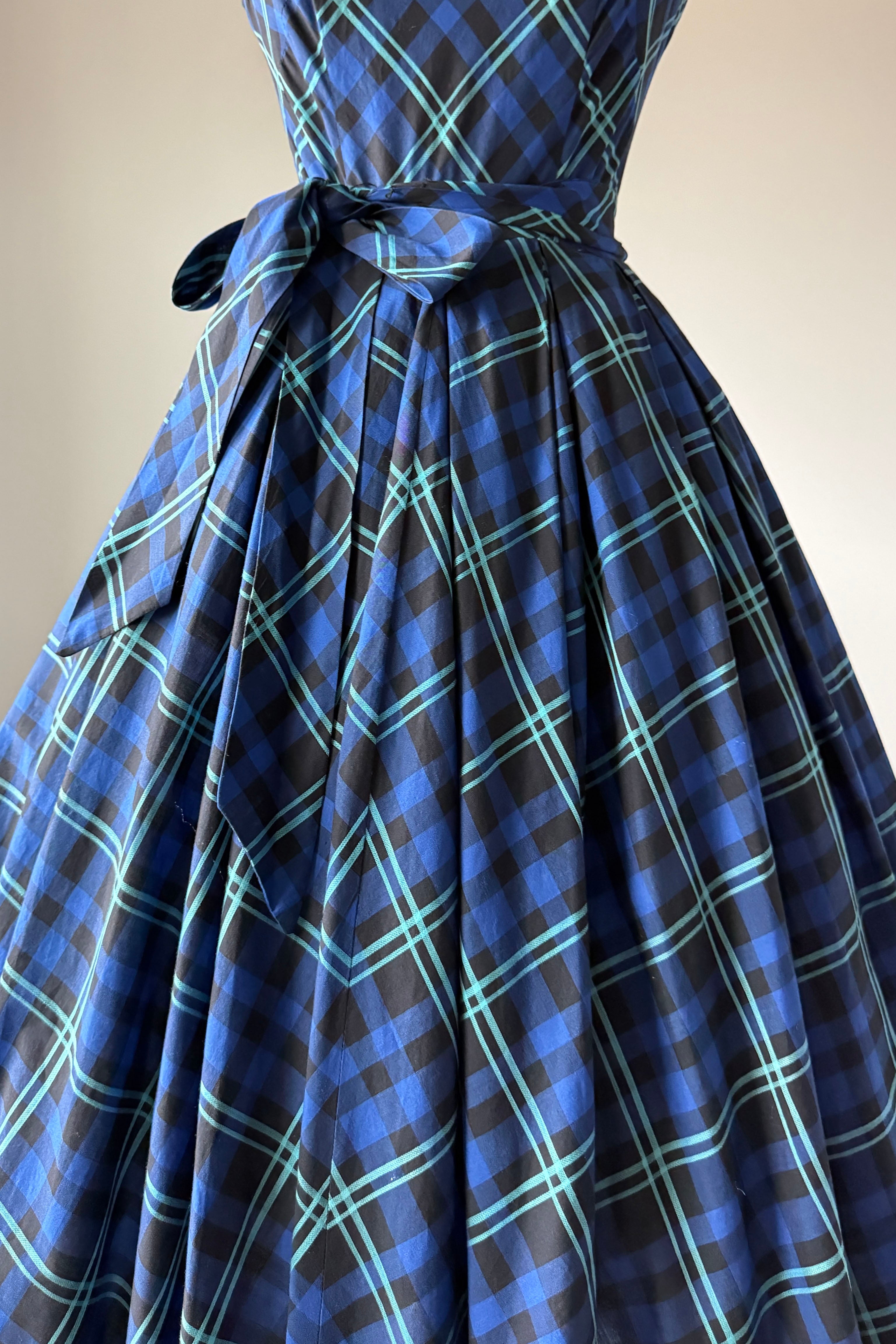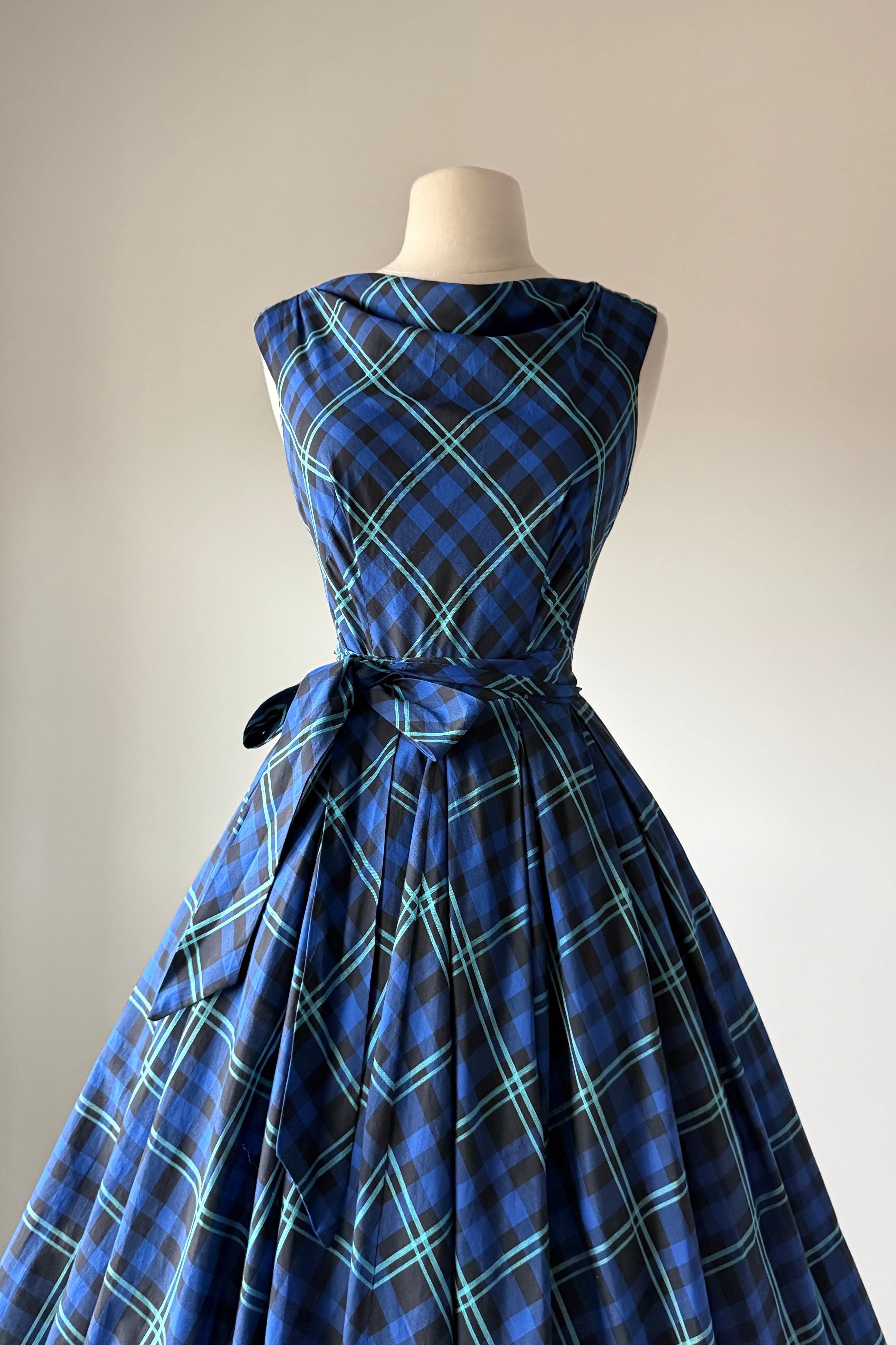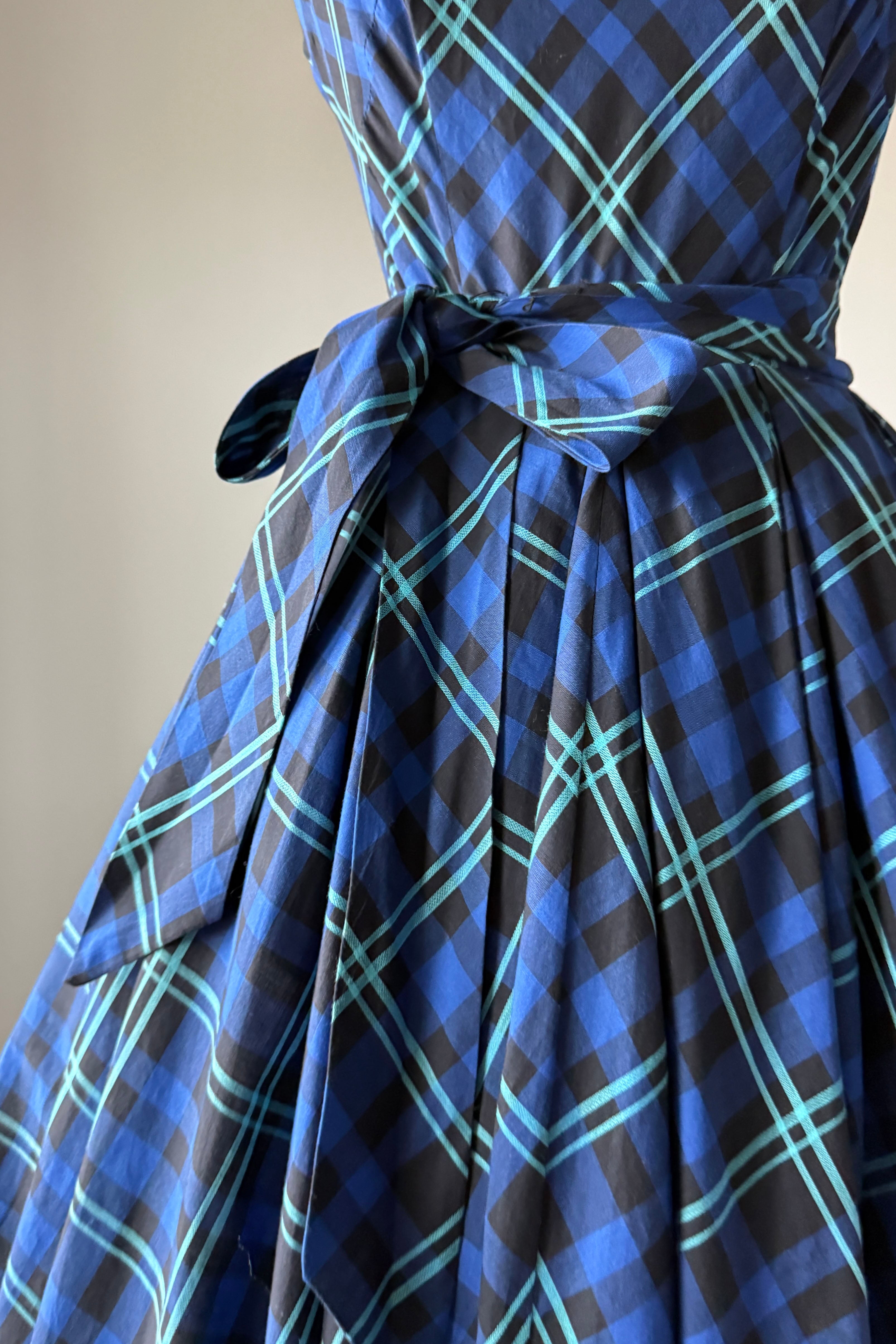 VINTAGE DRESSVintage 1950s dress. Features blue plaid cotton, draped neckline with weight, metal back zipper, matching tie belt. By Tailored Junior.Excellent condition. Freshly laundered and ready to wear. Faint crease at hem where it's been let out to original length.XS/S. Length 43.5Bodice 15Bust 36Waist 26As with all vintage, please expect wear consistent with age. All sales are final. No order cancellations.0855 | 2608