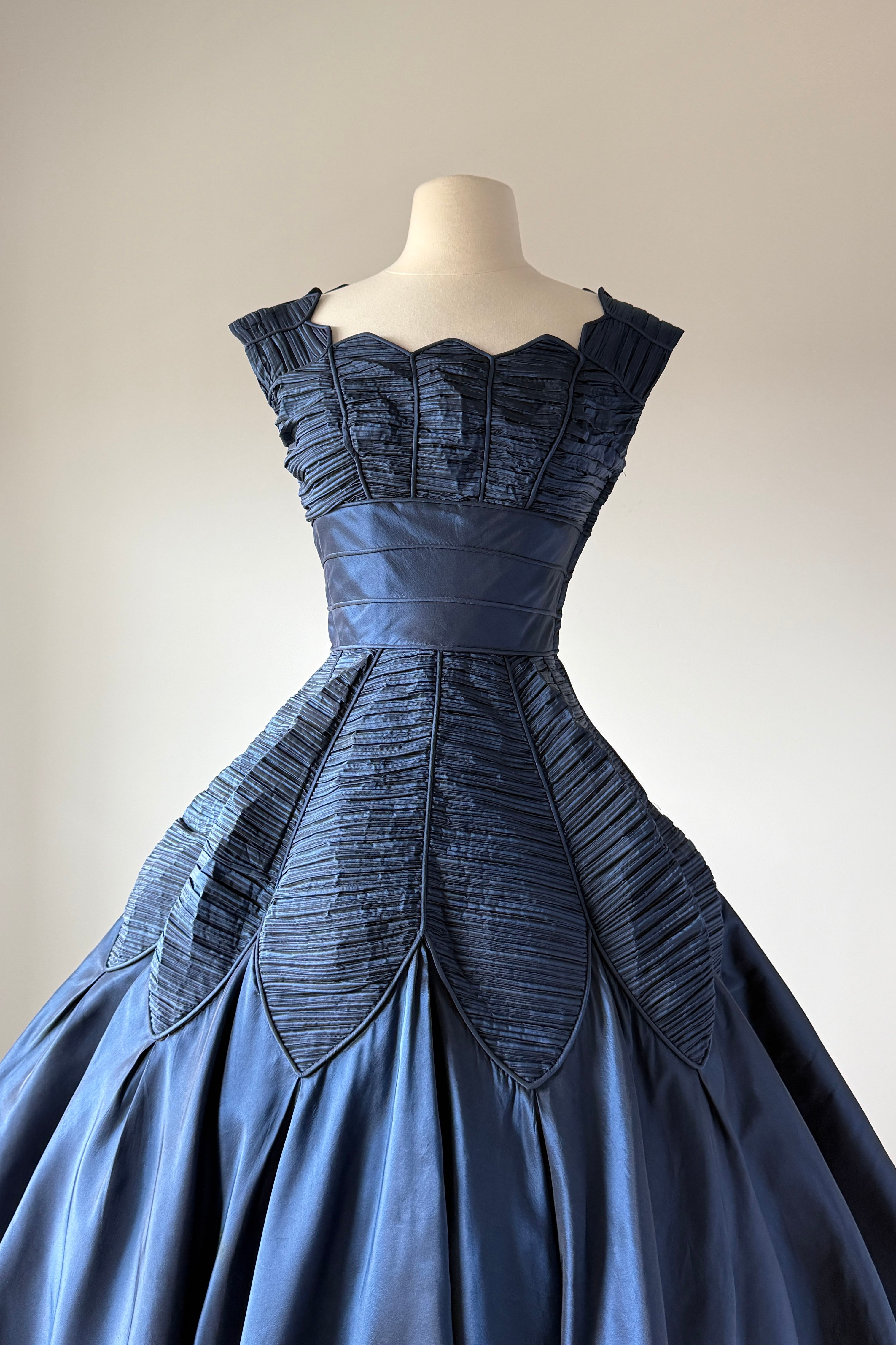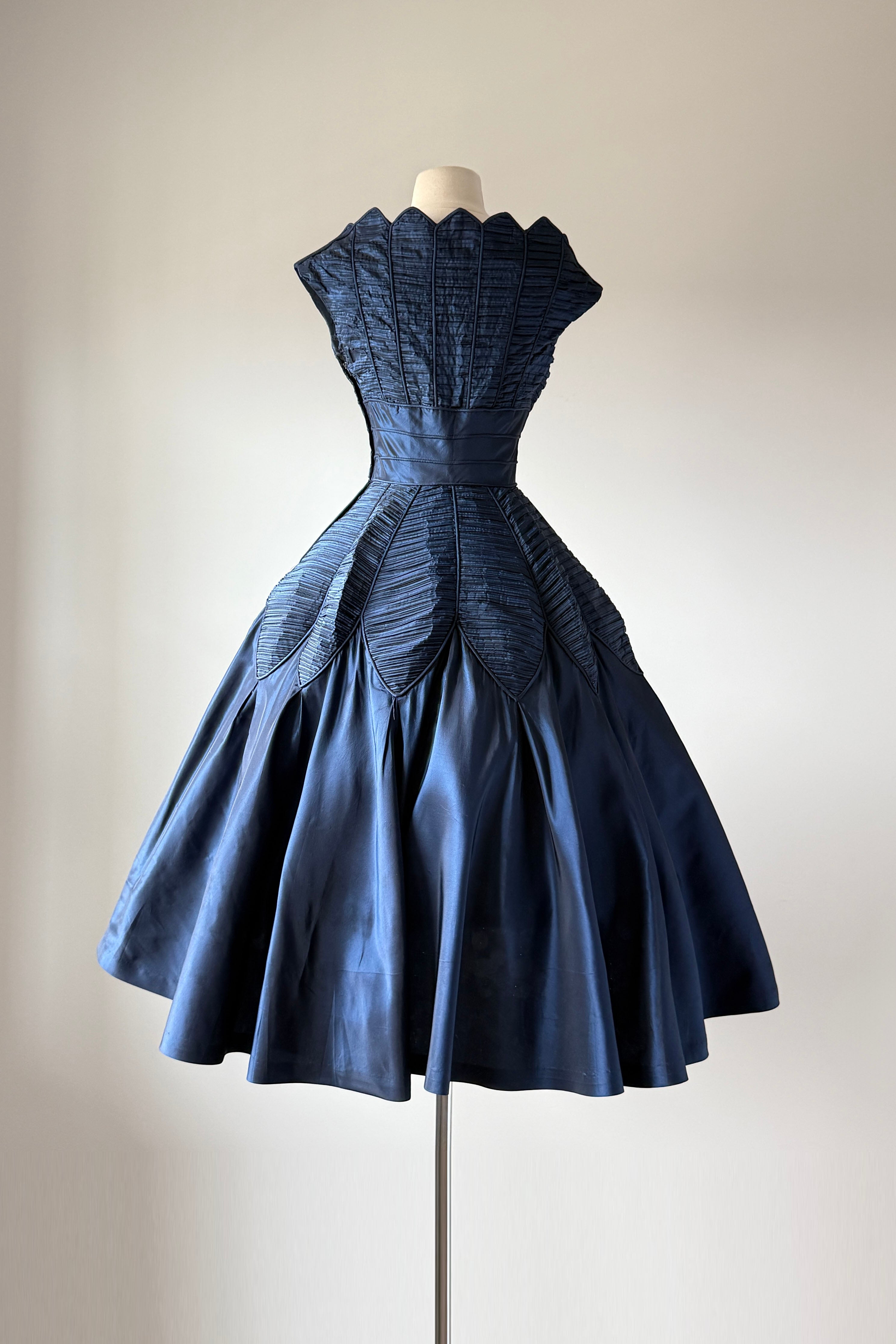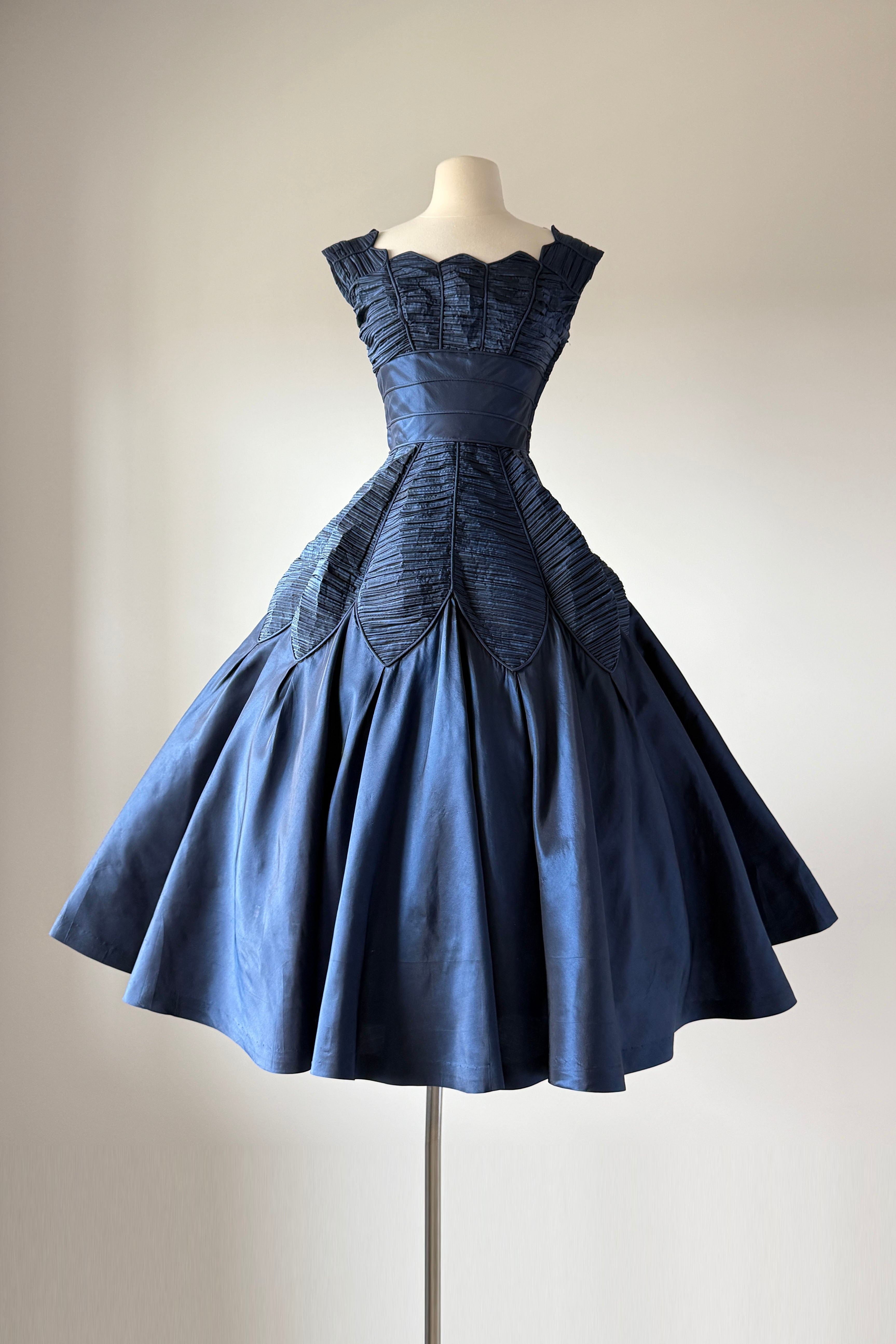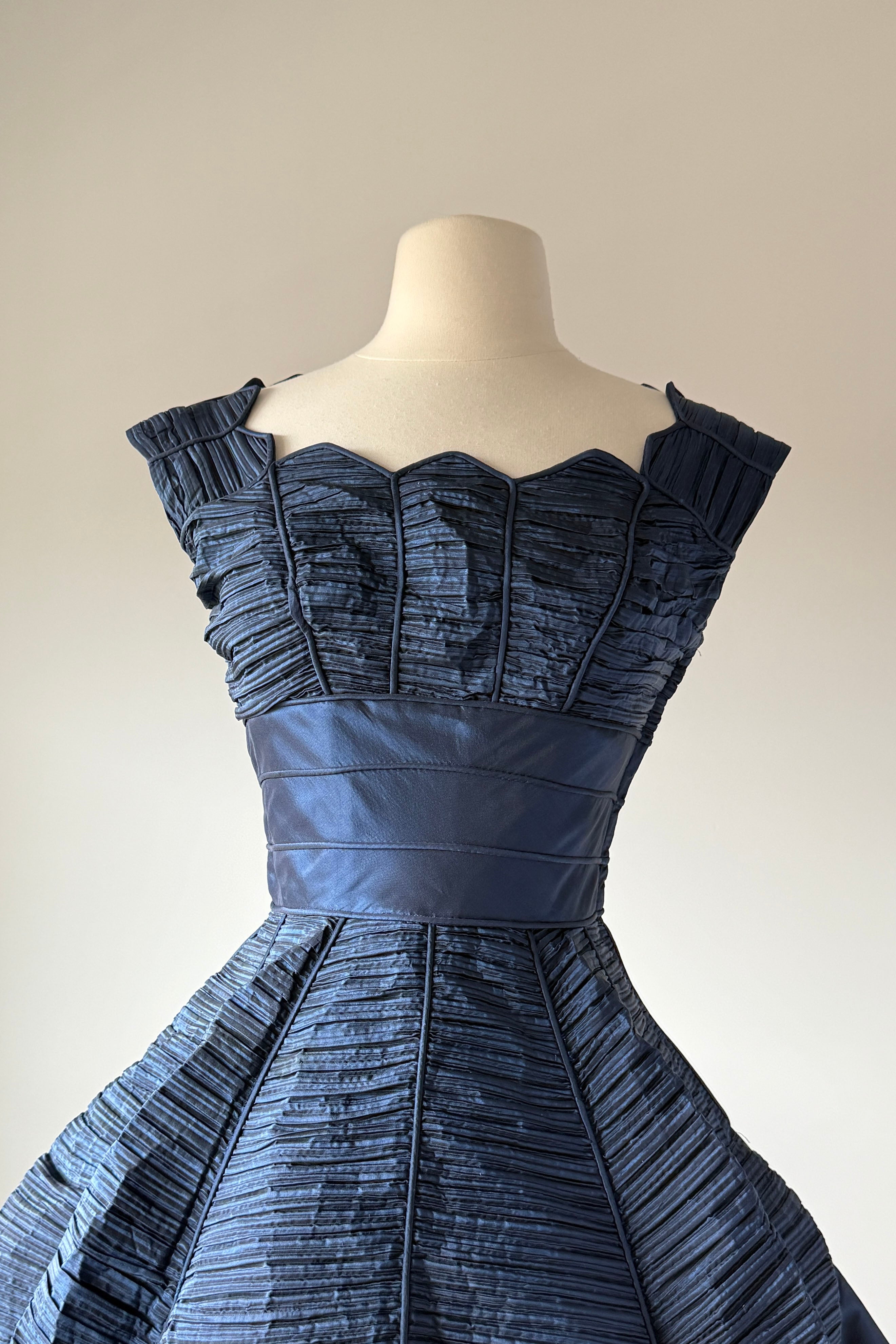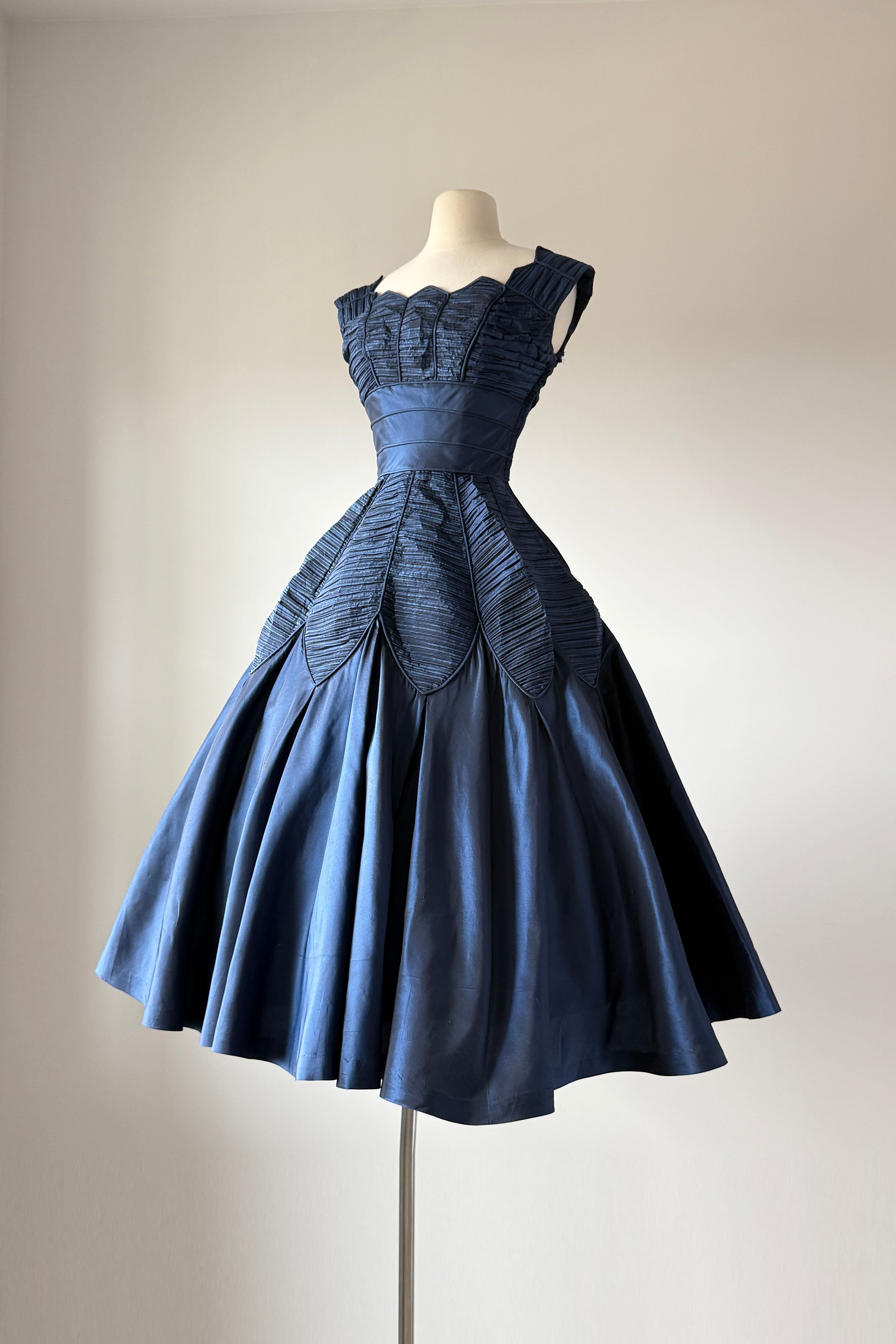 VINTAGE DRESSVintage 1950s dress. Features iridescent midnight blue silk with full skirt, pleated insert details at bodice + skirt, ruched waist, metal back zipper, acetate bodice lining.Great condition. One tiny hole at front skirt, some pinhead sized holes where skirt was let down to original length (only visible if held to light) and a few small inconspicuous spots. Presents beautifully.XS/S. Length 49Bodice 16Bust 36Waist 26As with all vintage, please expect wear consistent with age. All sales are final. No order cancellations.0863 | 2607