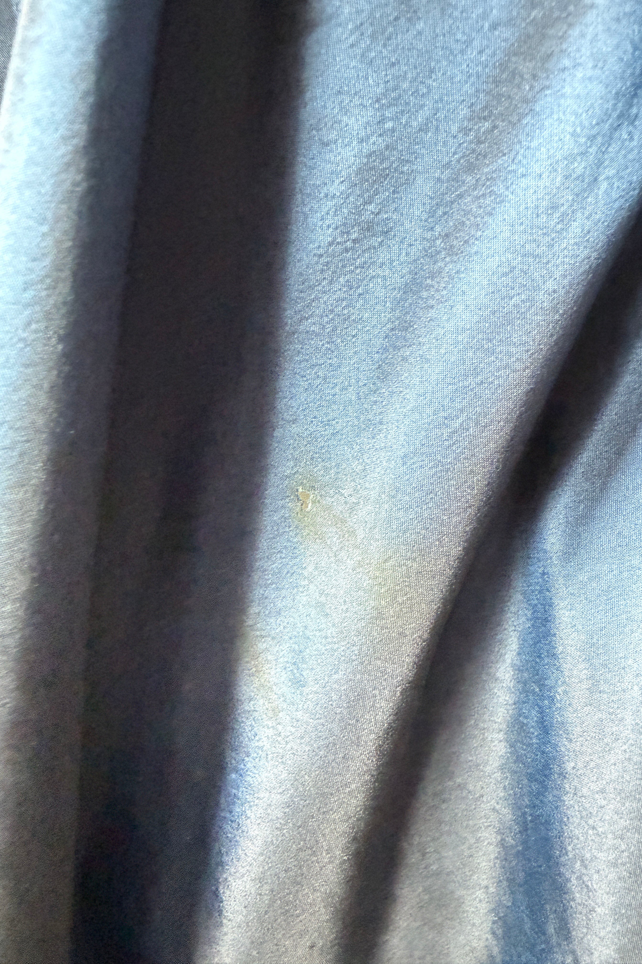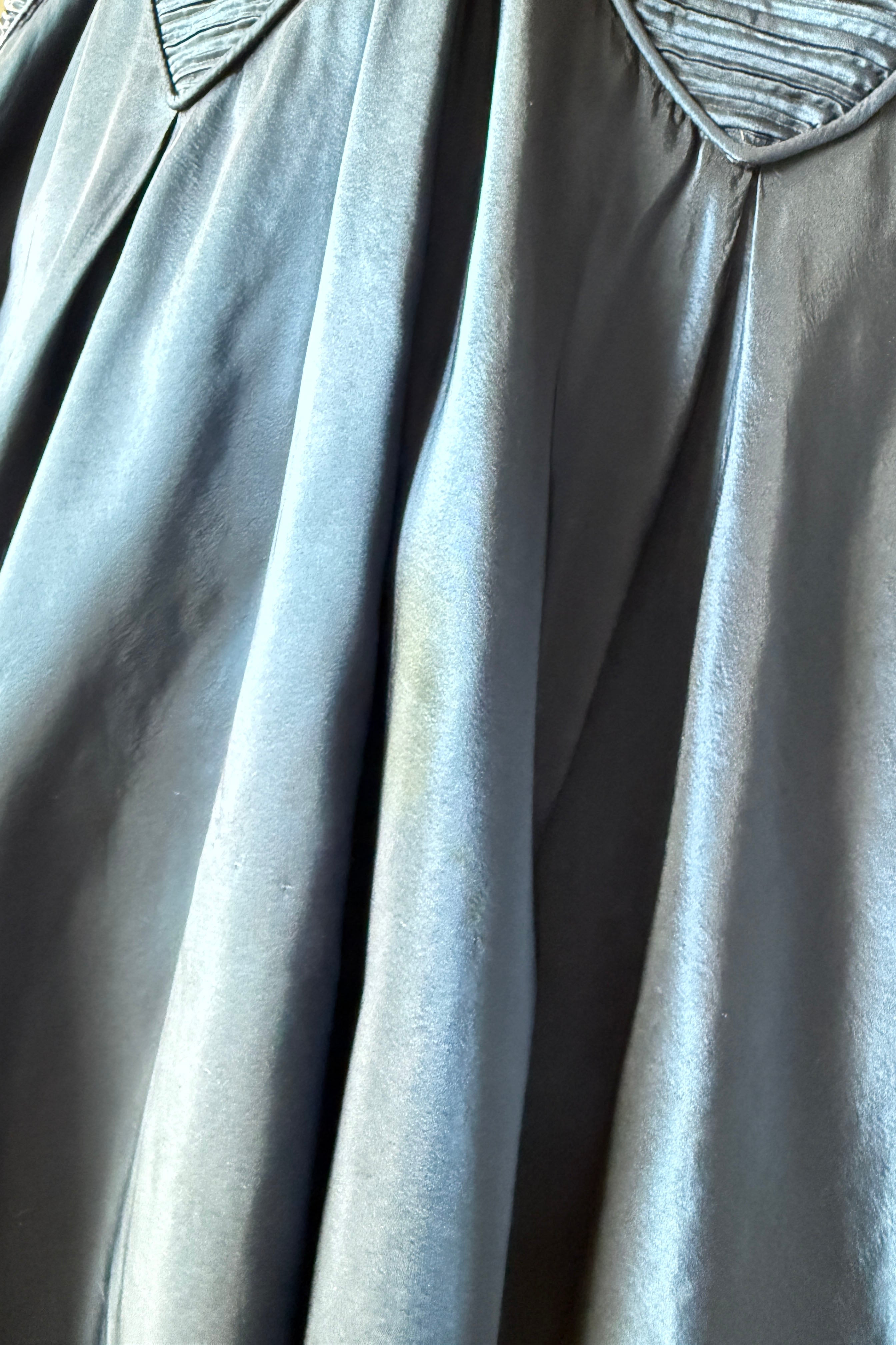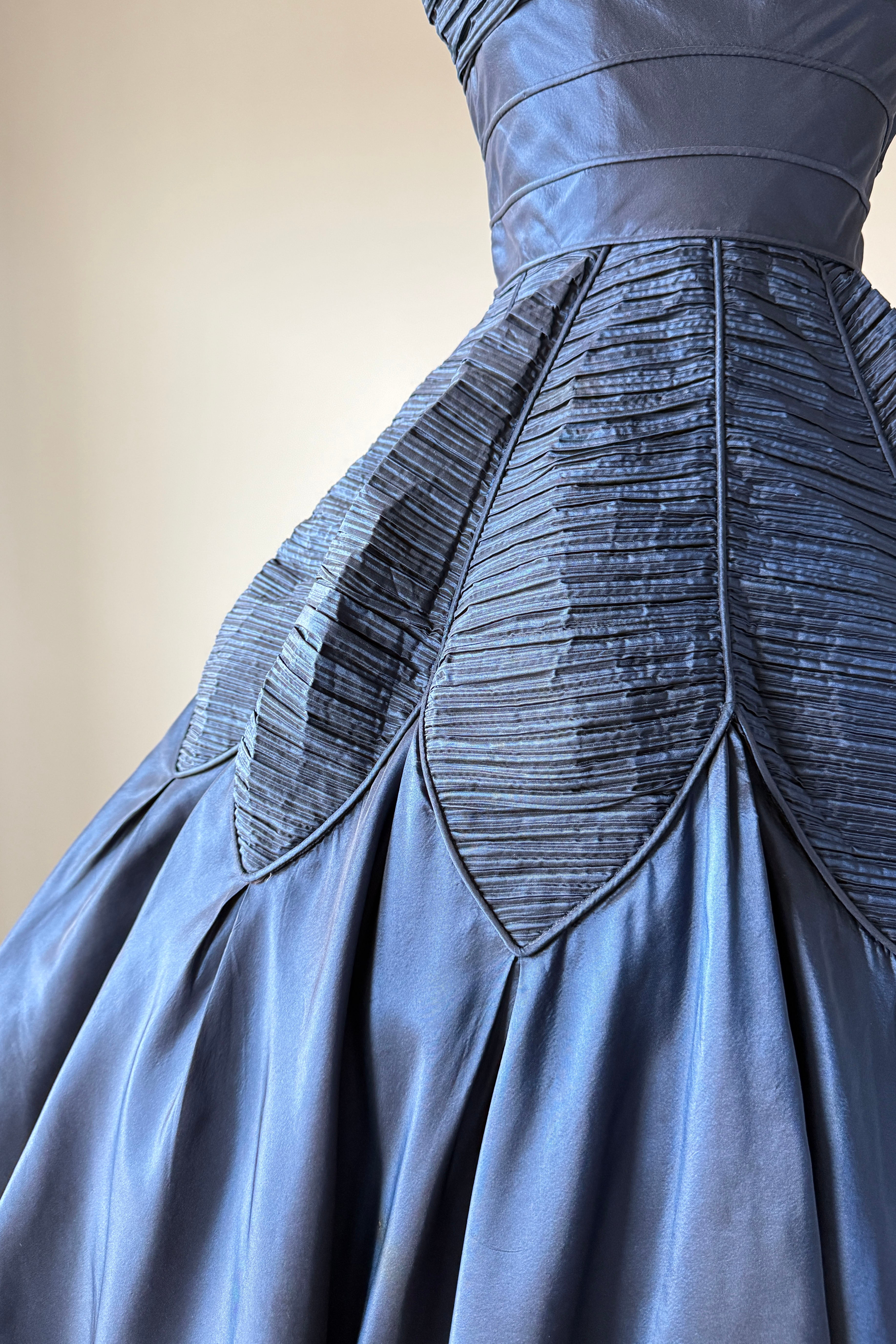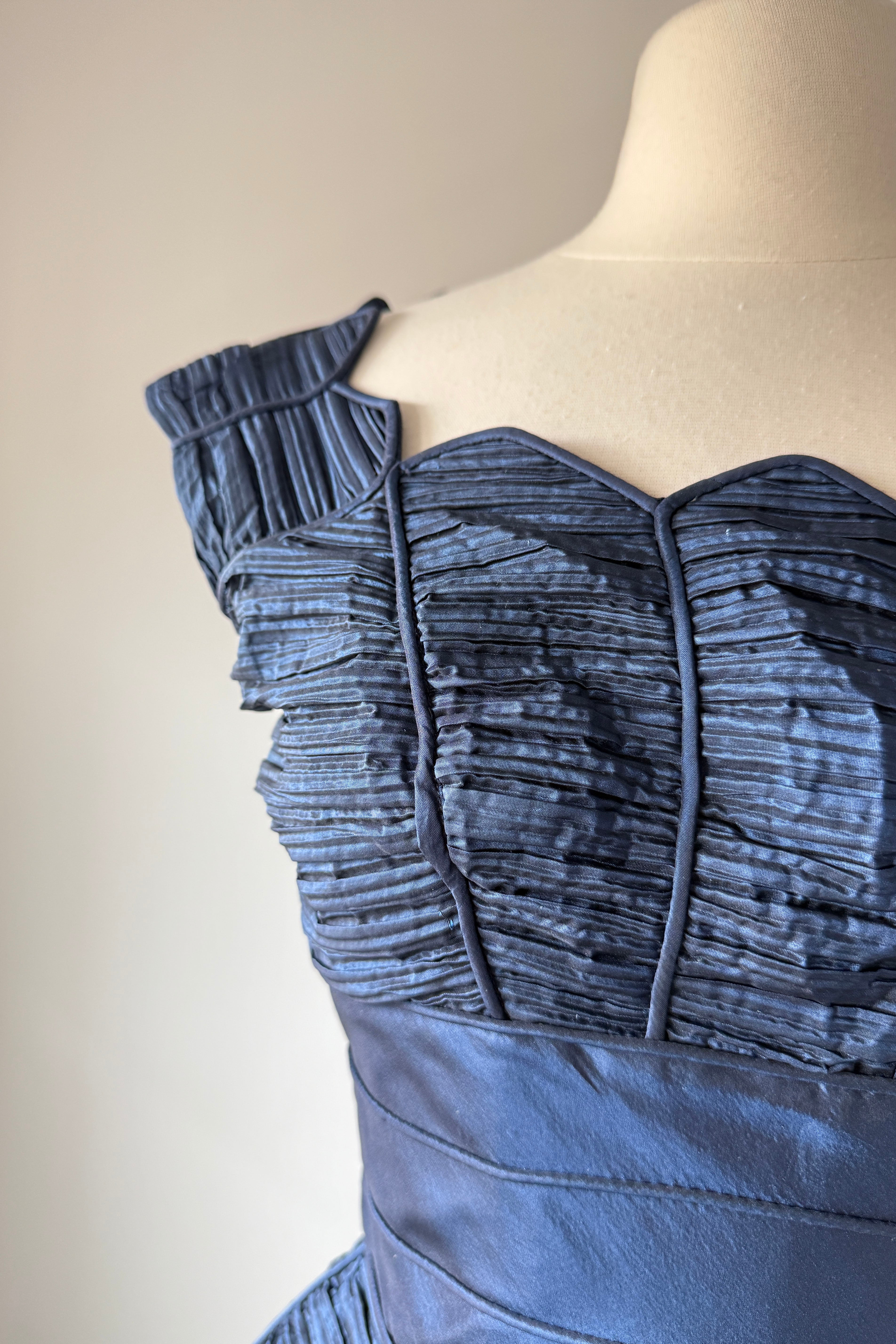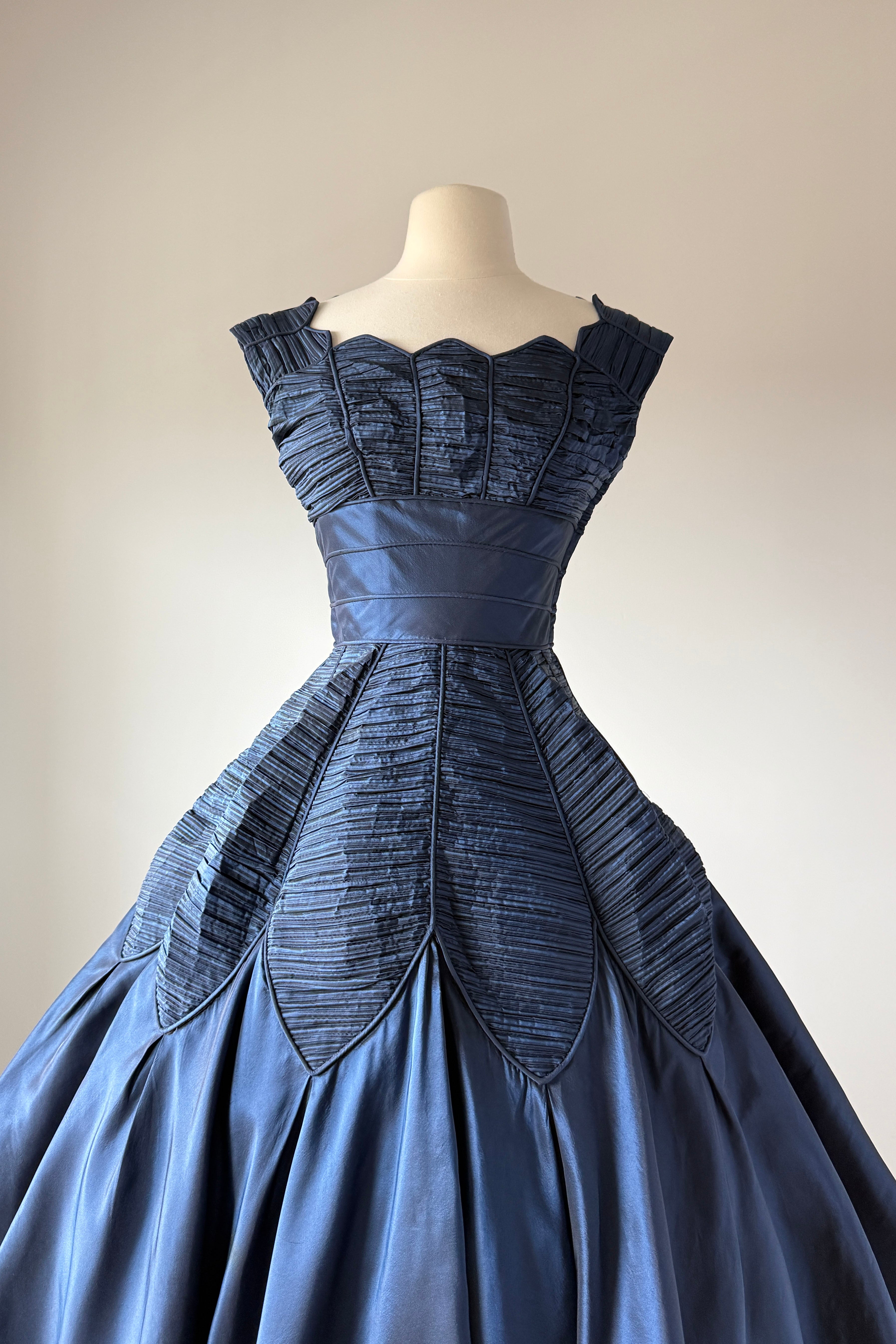 VINTAGE DRESSVintage 1950s dress. Features iridescent midnight blue silk with full skirt, pleated insert details at bodice + skirt, ruched waist, metal back zipper, acetate bodice lining.Great condition. One tiny hole at front skirt, some pinhead sized holes where skirt was let down to original length (only visible if held to light) and a few small inconspicuous spots. Presents beautifully.XS/S. Length 49Bodice 16Bust 36Waist 26As with all vintage, please expect wear consistent with age. All sales are final. No order cancellations.0863 | 2607