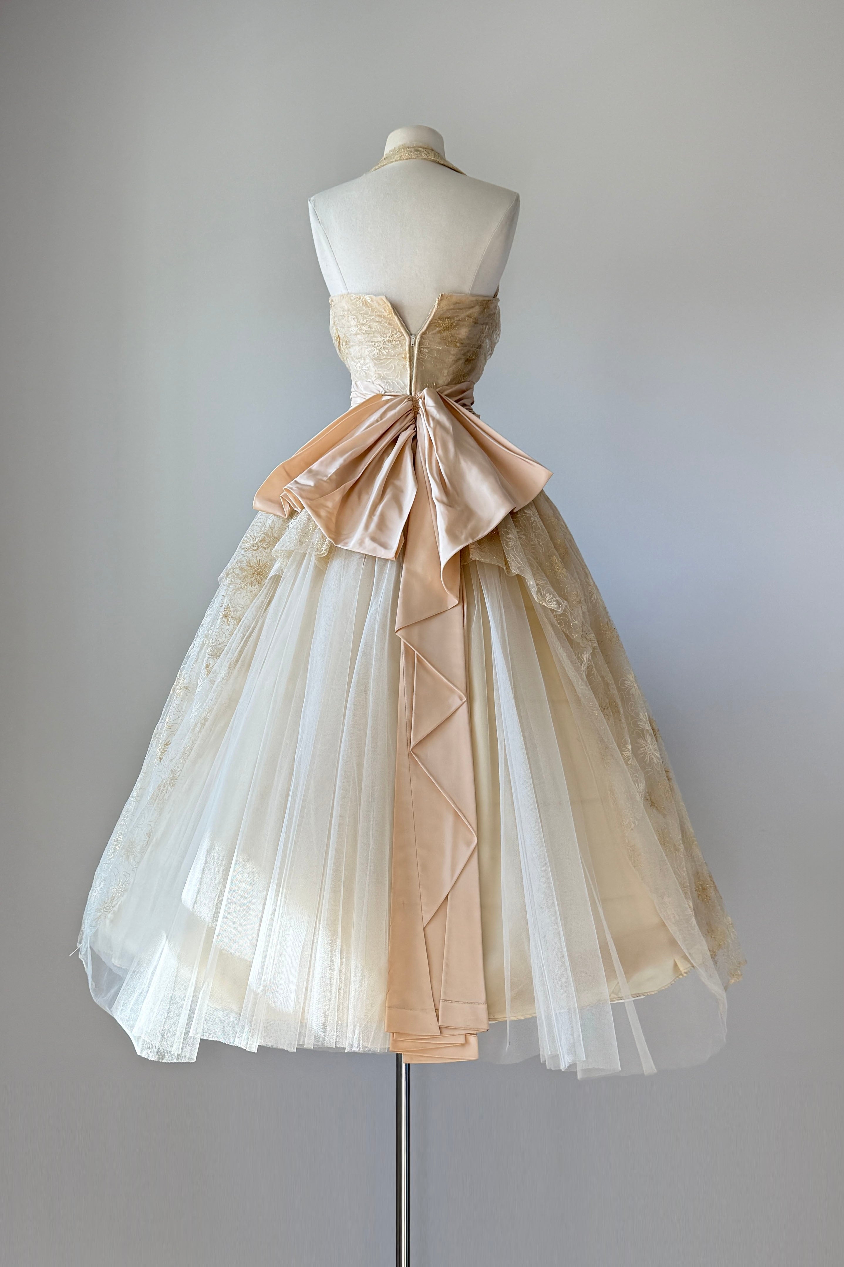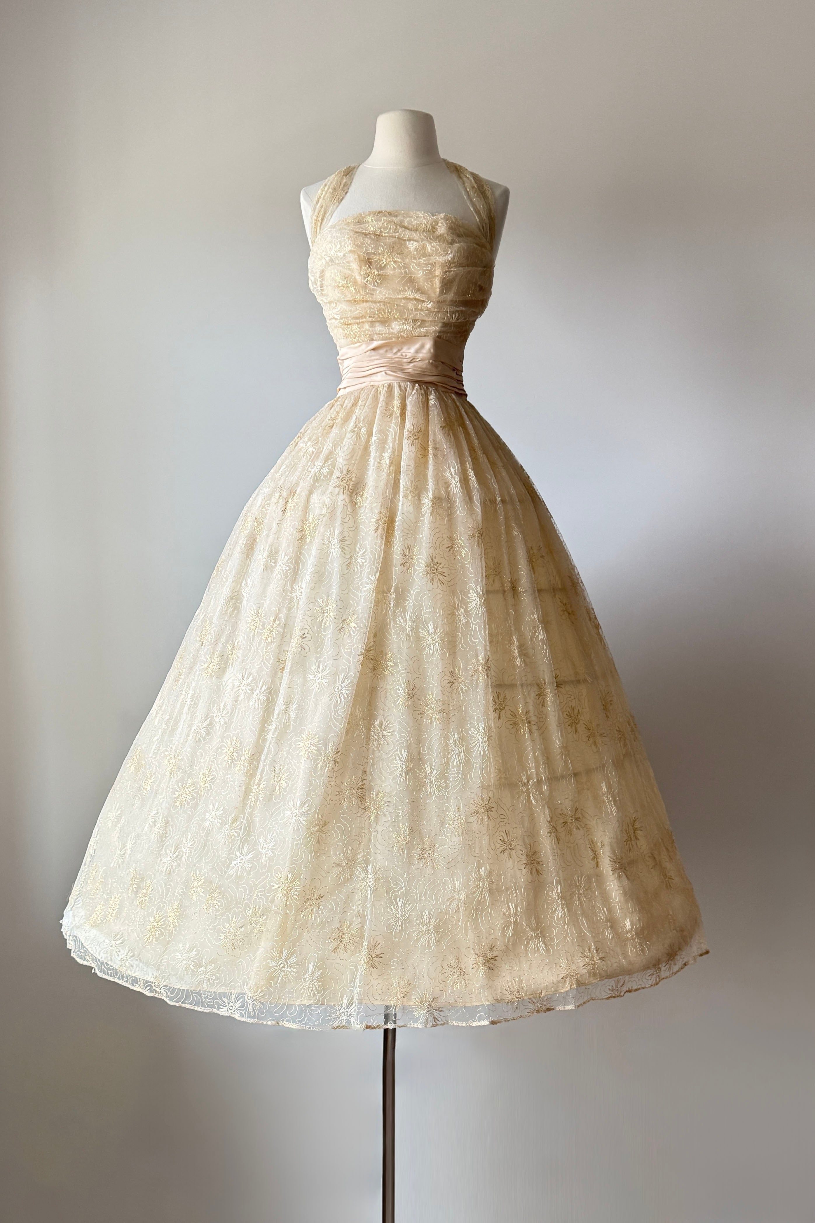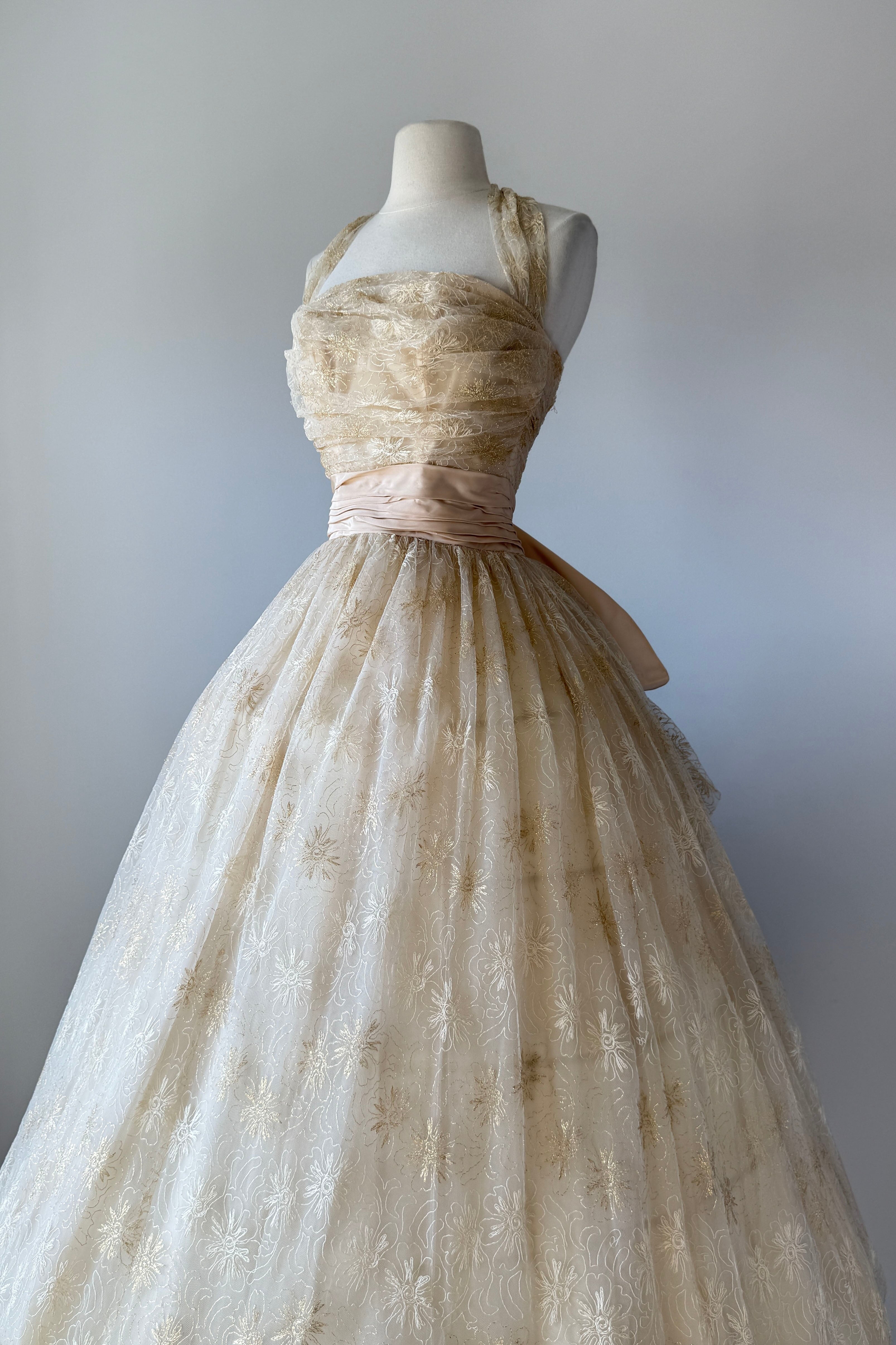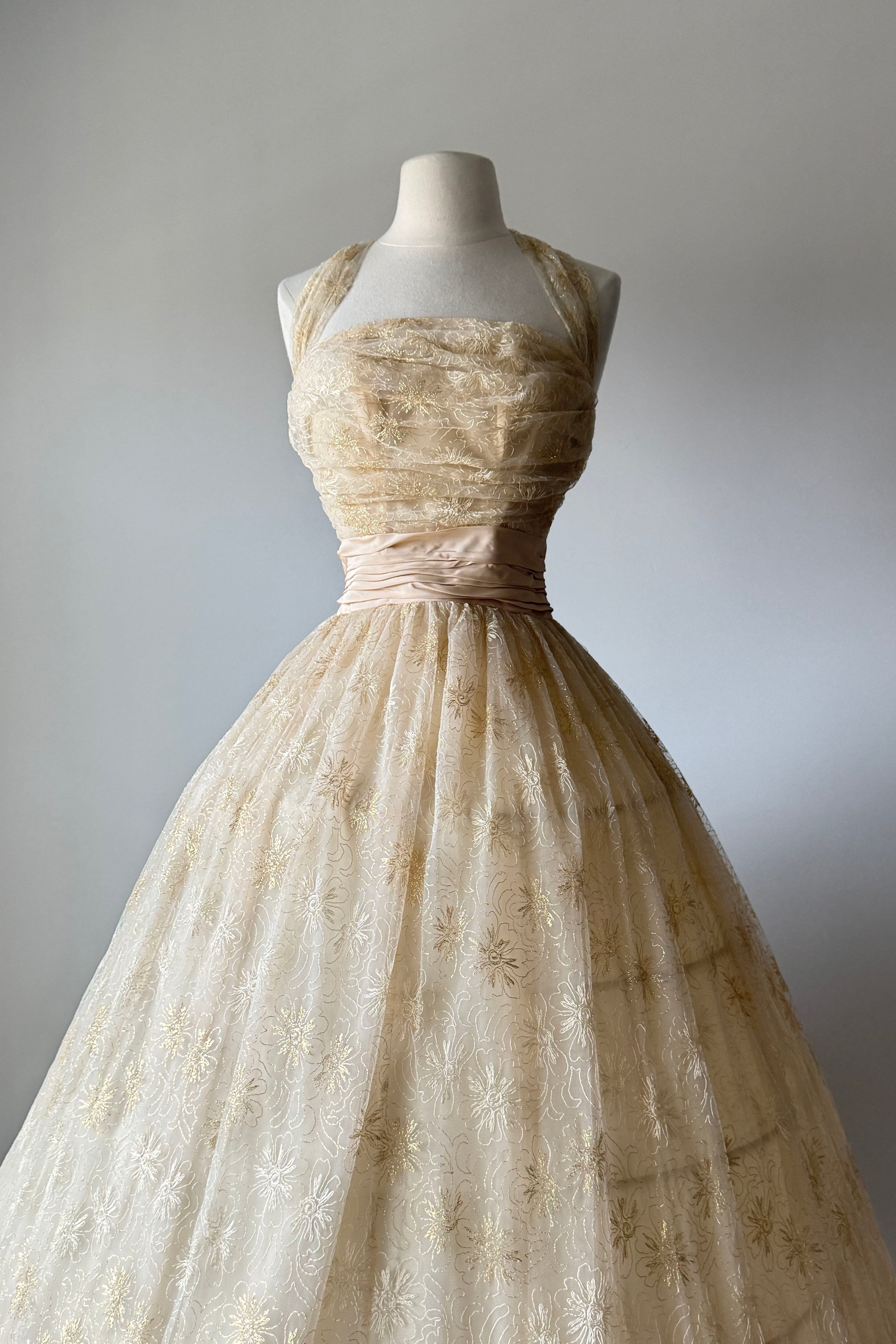 VINTAGE DRESSVintage 1950s dress. Features metallic gold floral embroidery on tulle, acetate lining, halter bodice with stays, additional tulle lining layer, cascading back bow, metal side zipper. From Edith's Country Shop in Wayzata, MN.Great condition. A few tiny holes in tulle and some light smudges on acetate. Presents beautifully.XS/S. Length 62Bodice 17Bust 32Waist 25-26Bodice allowance 2As with all vintage, please expect wear consistent with age. All sales are final. No order cancellations.0821 | 2608