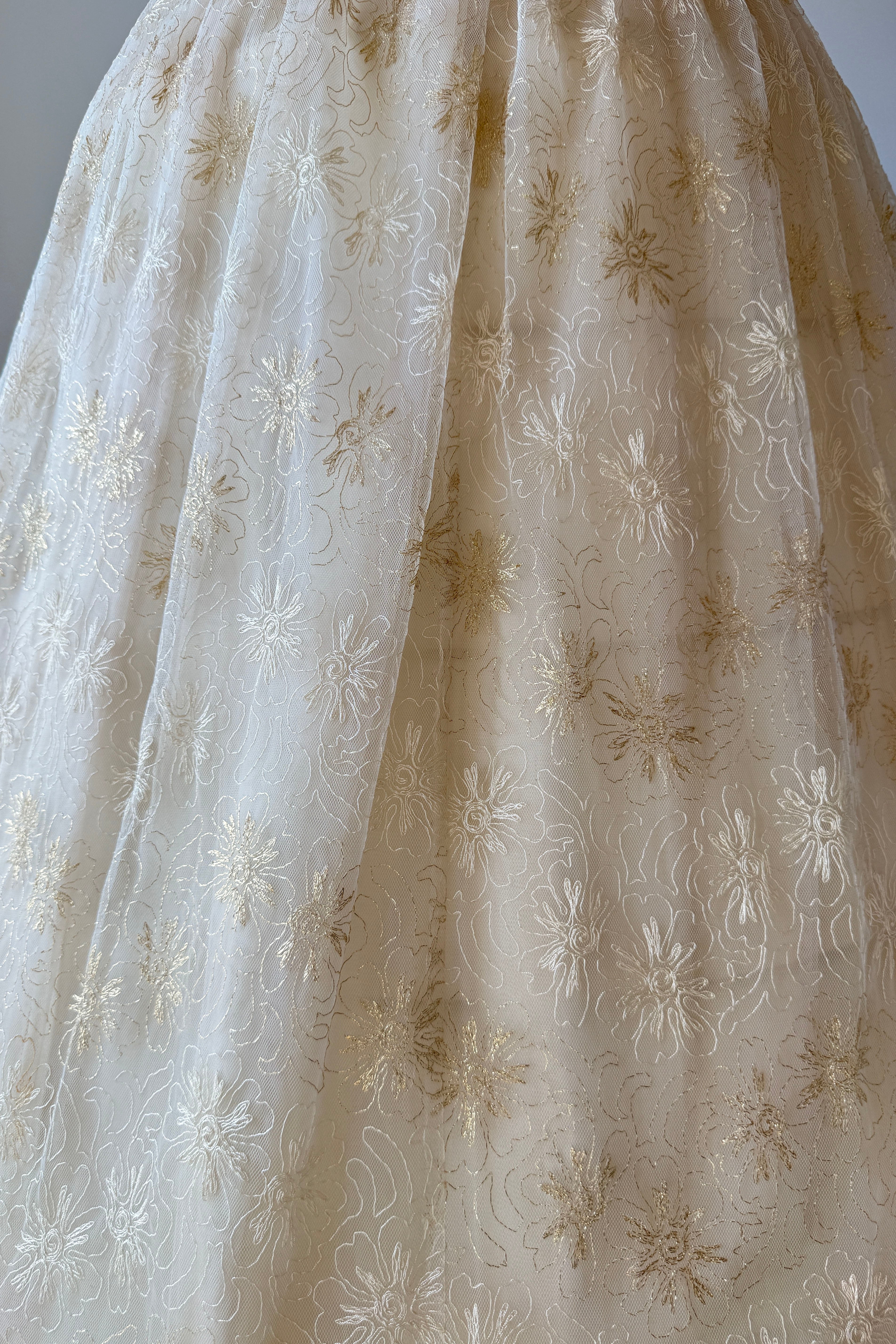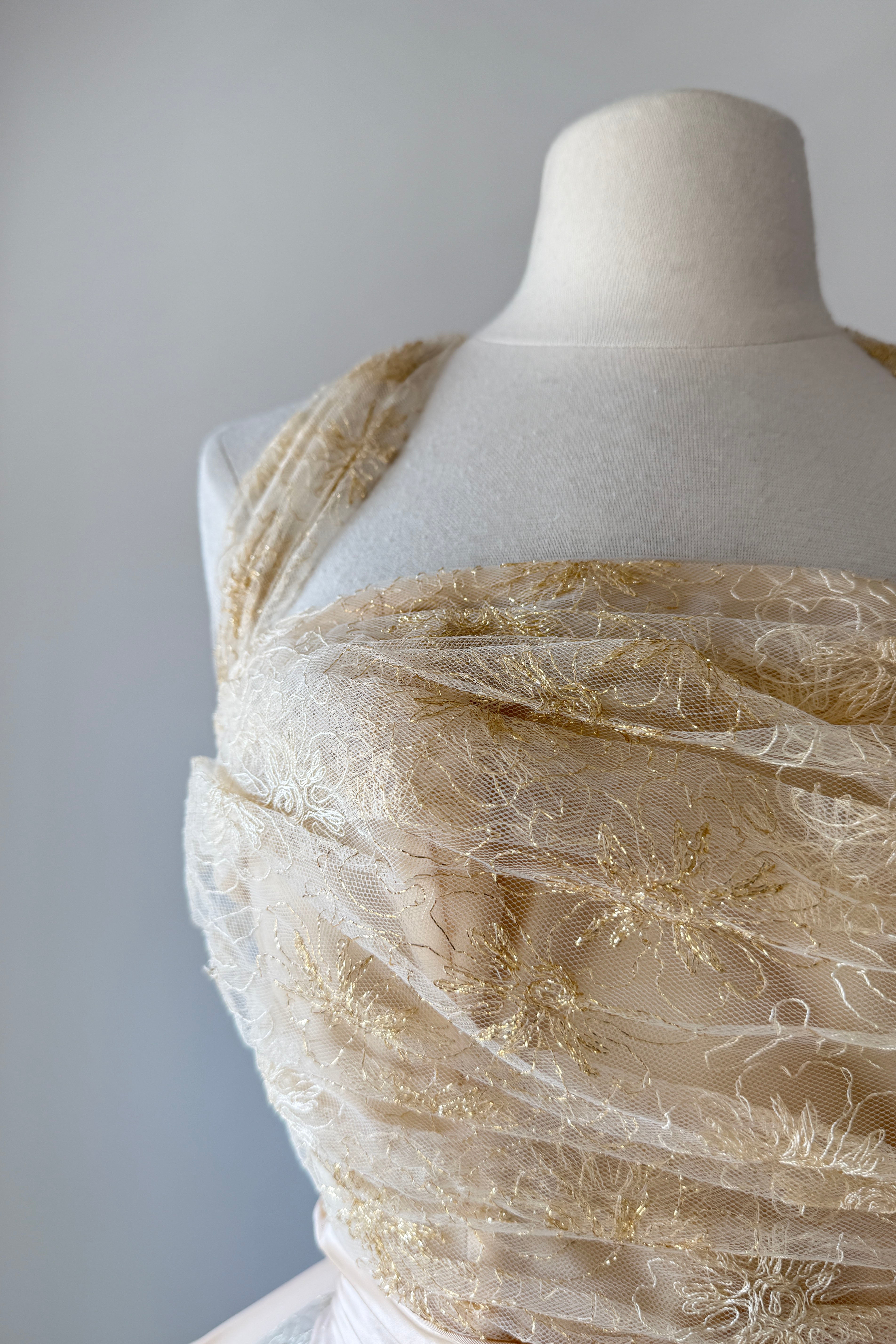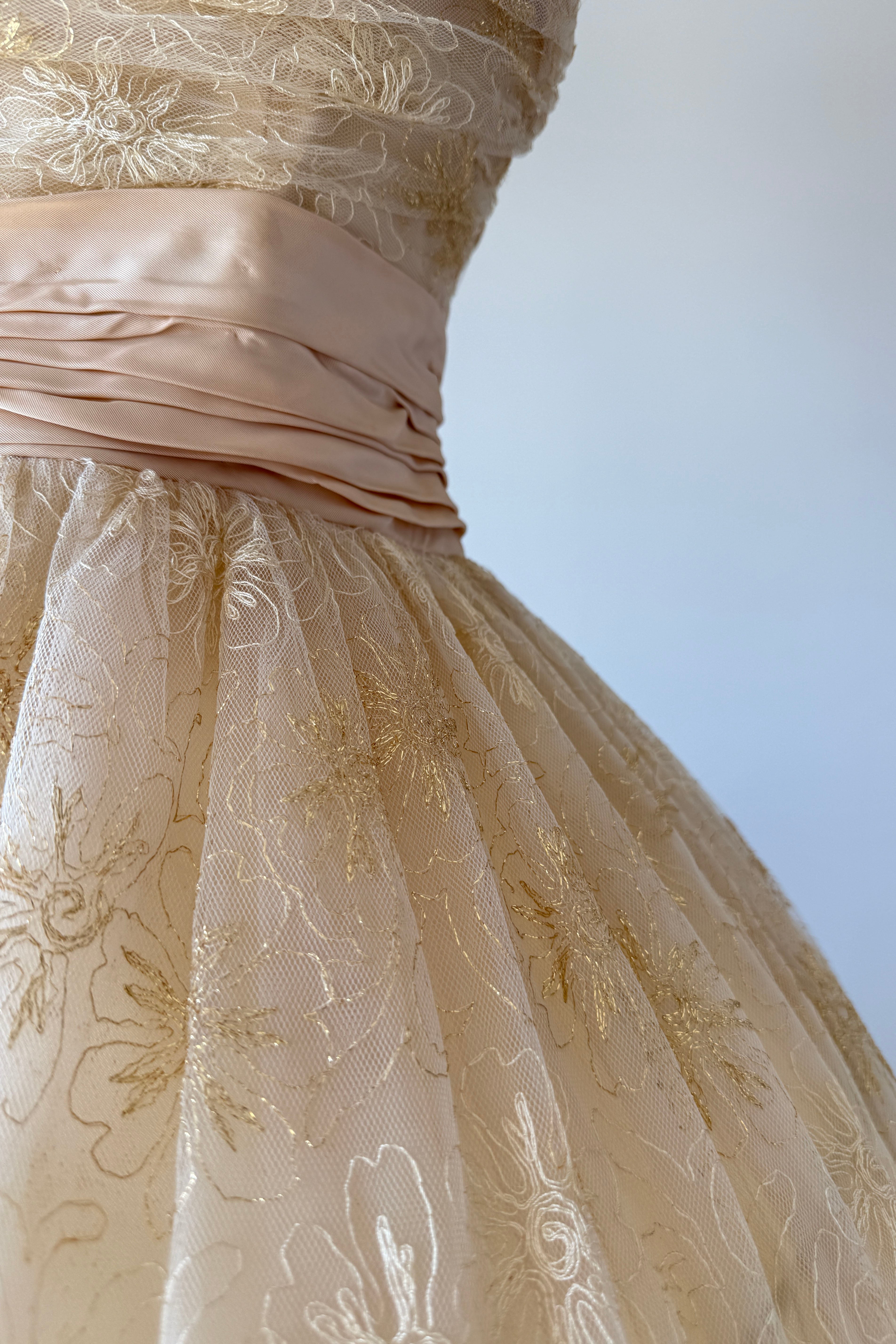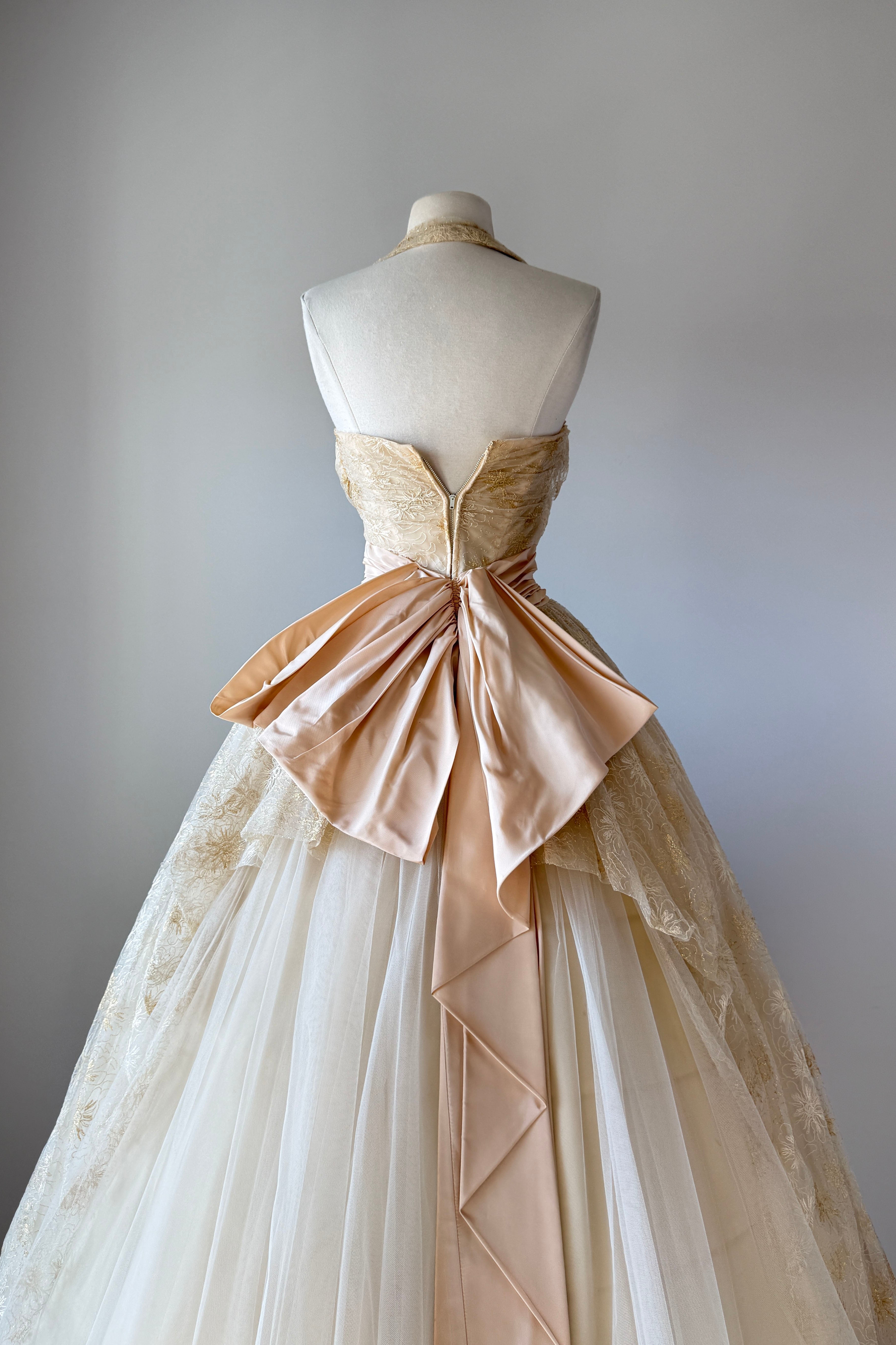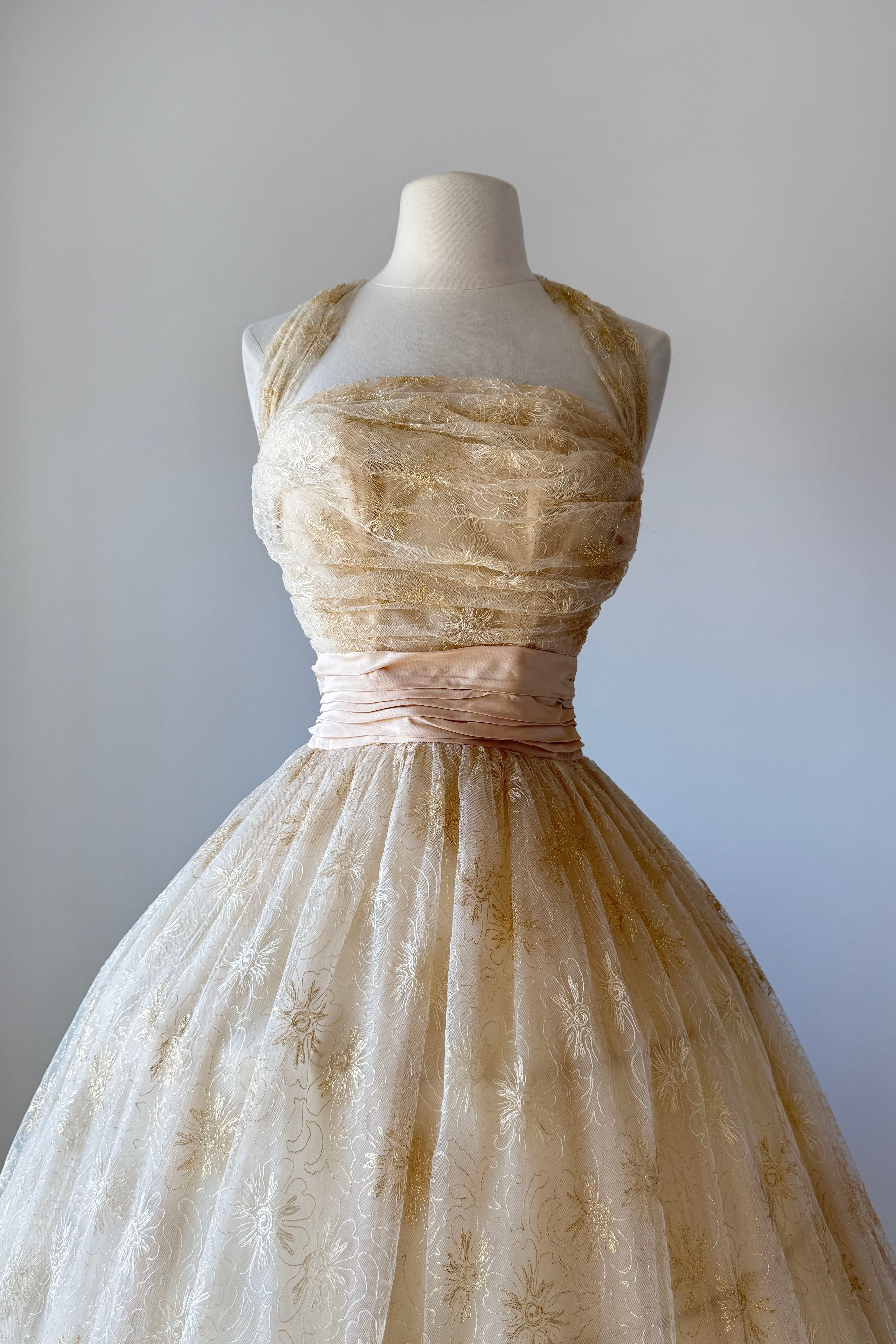 VINTAGE DRESSVintage 1950s dress. Features metallic gold floral embroidery on tulle, acetate lining, halter bodice with stays, additional tulle lining layer, cascading back bow, metal side zipper. From Edith's Country Shop in Wayzata, MN.Great condition. A few tiny holes in tulle and some light smudges on acetate. Presents beautifully.XS/S. Length 62Bodice 17Bust 32Waist 25-26Bodice allowance 2As with all vintage, please expect wear consistent with age. All sales are final. No order cancellations.0821 | 2608