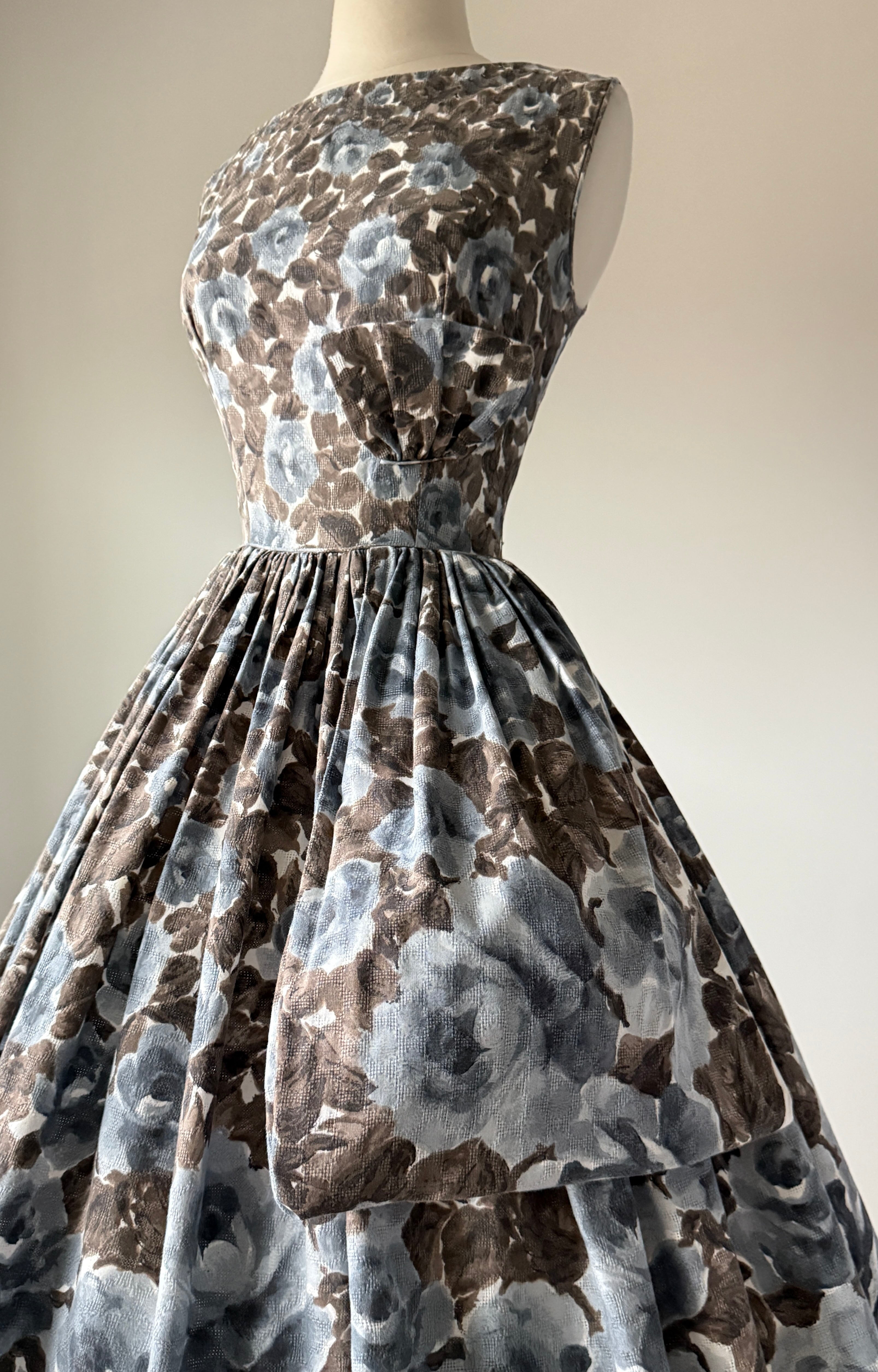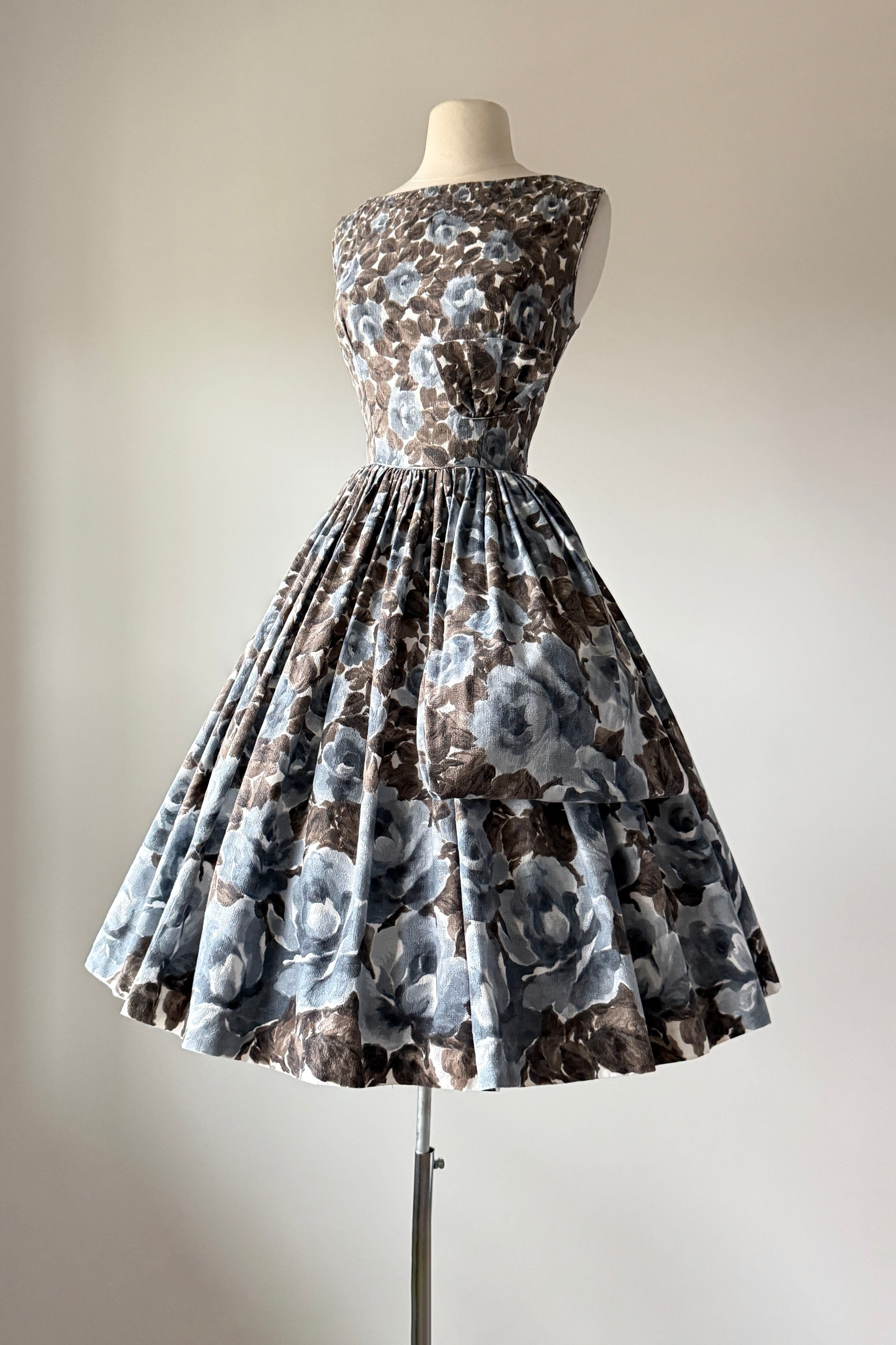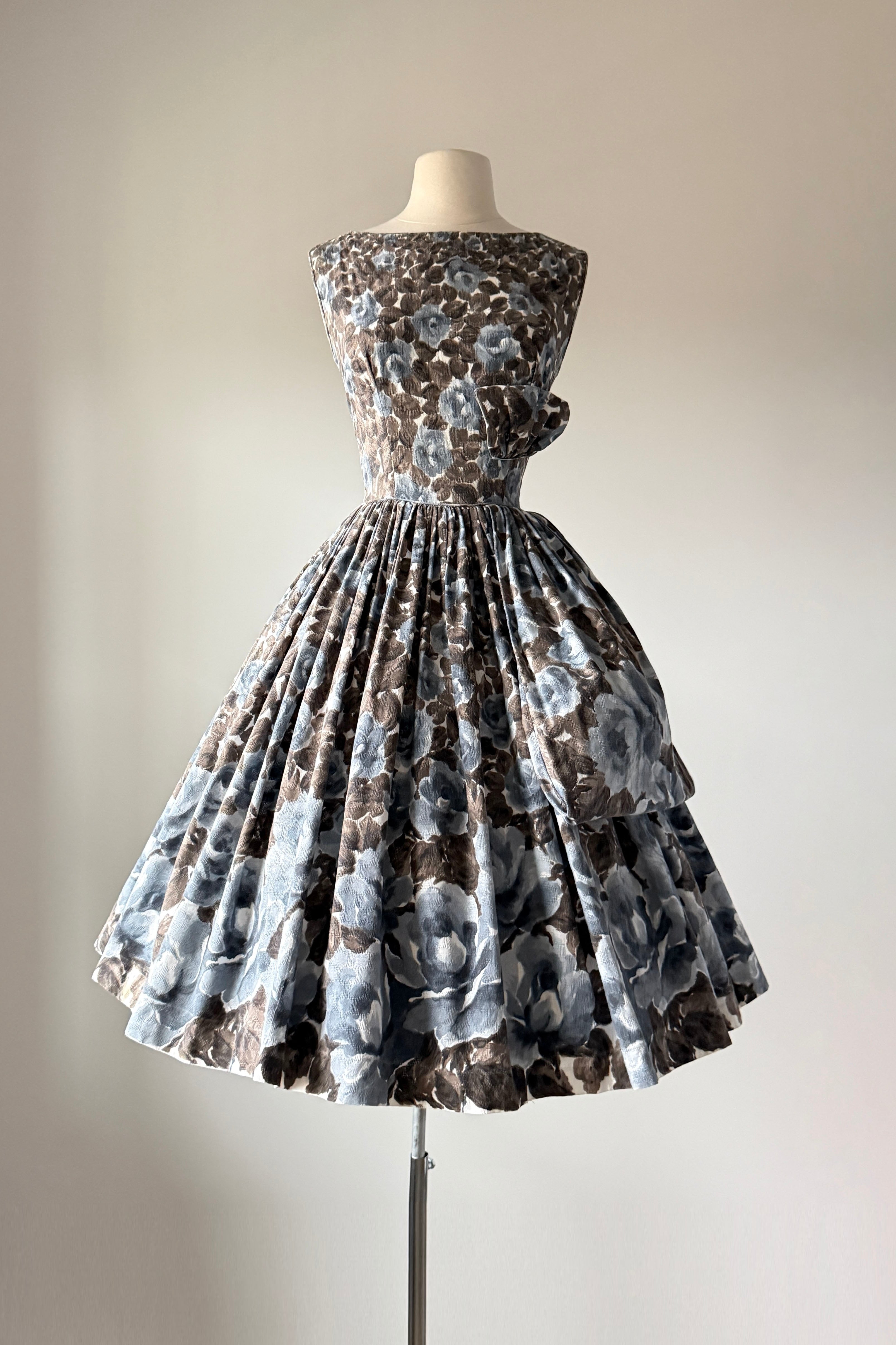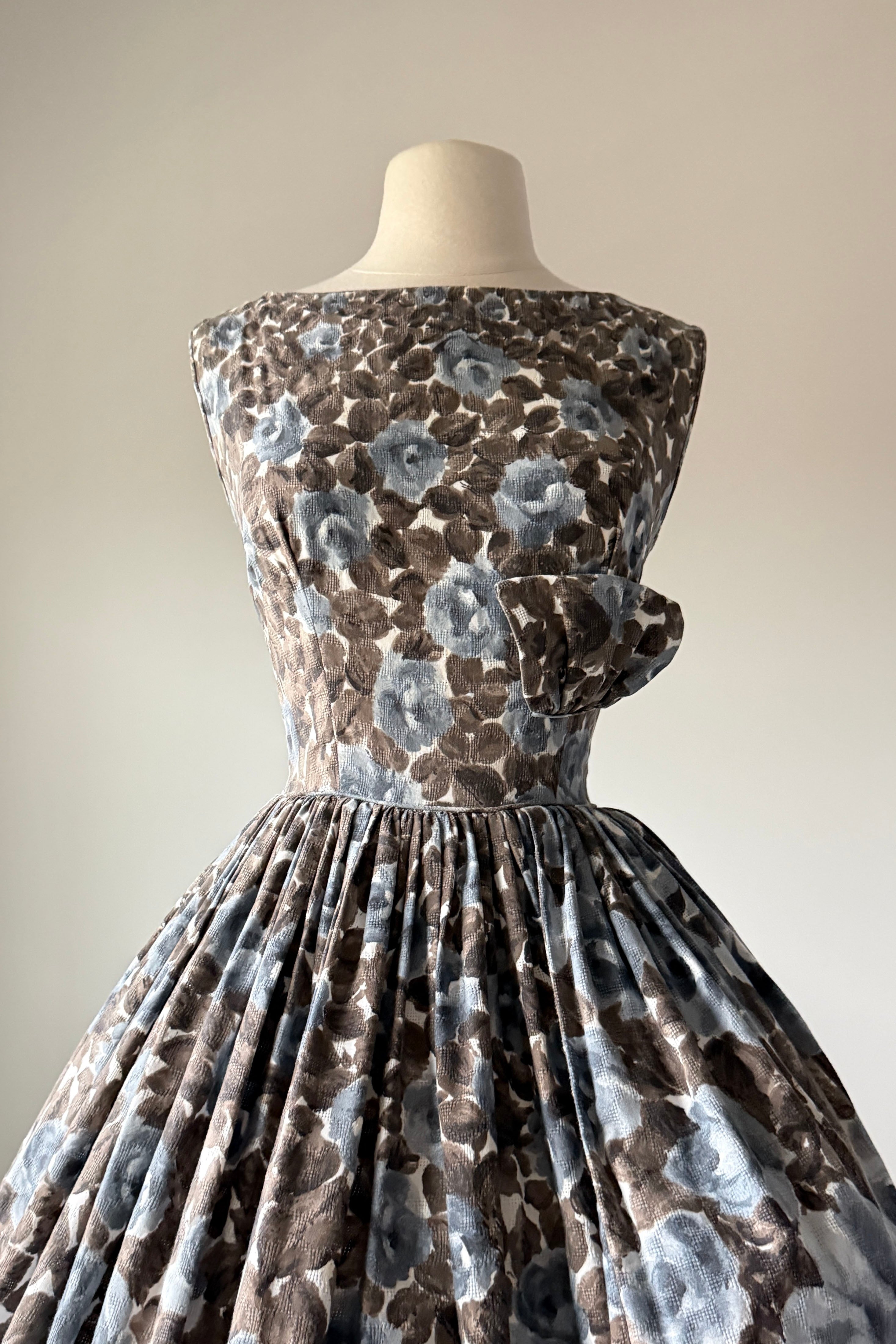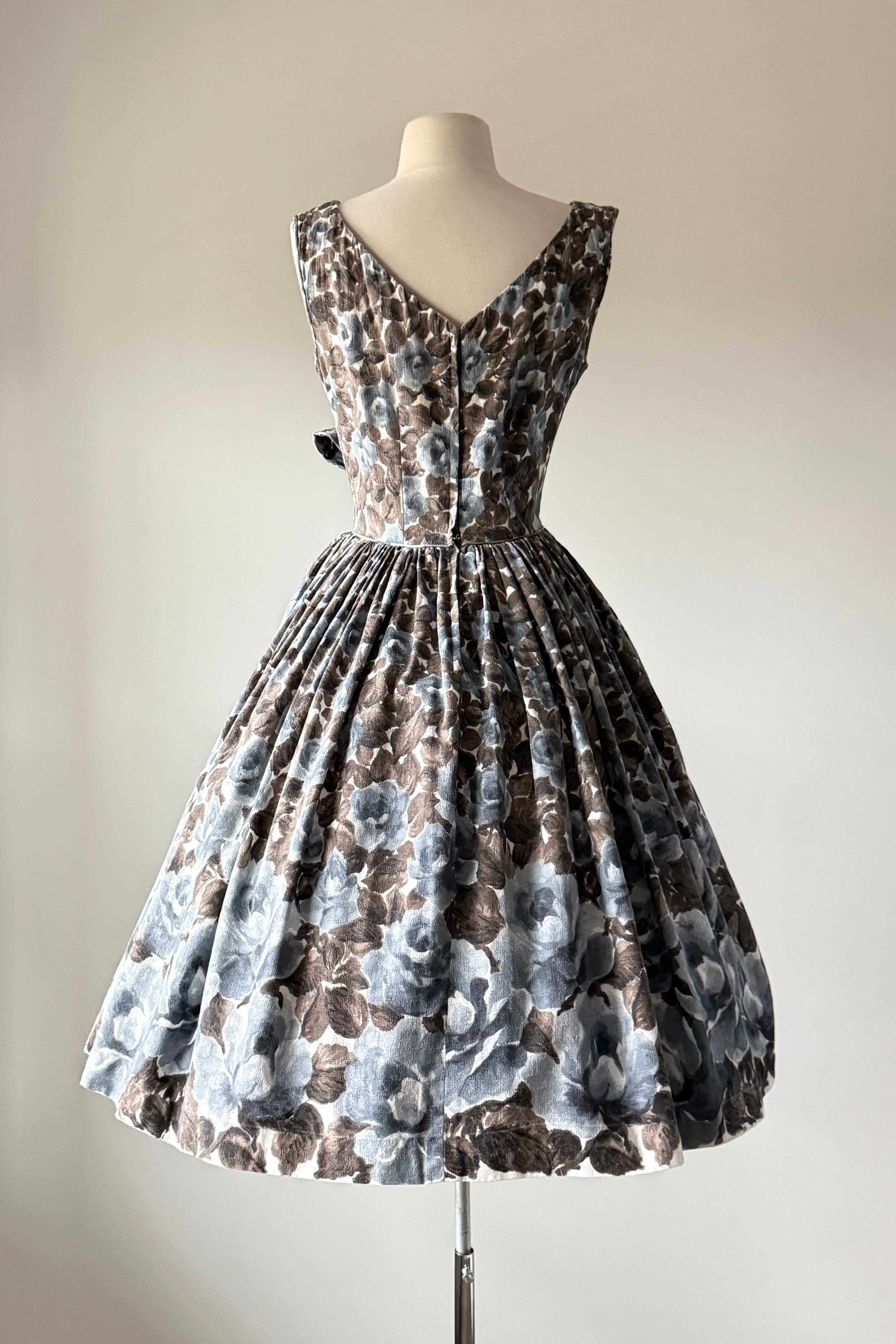 VINTAGE DRESSVintage 1950s dress. Features heavy gray and blue floral print cotton, vertical bow at left waist, attached lining with matching print, metal back zipper. From Richard Shops.Excellent condition. Small spot at front hem and faint crease at hem where it's been let out to original length. Freshly laundered and ready to wear.XS/S. Length 41Bodice 16Bust 36Waist 26As with all vintage, please expect wear consistent with age. All sales are final. No order cancellations.0844 | 2608