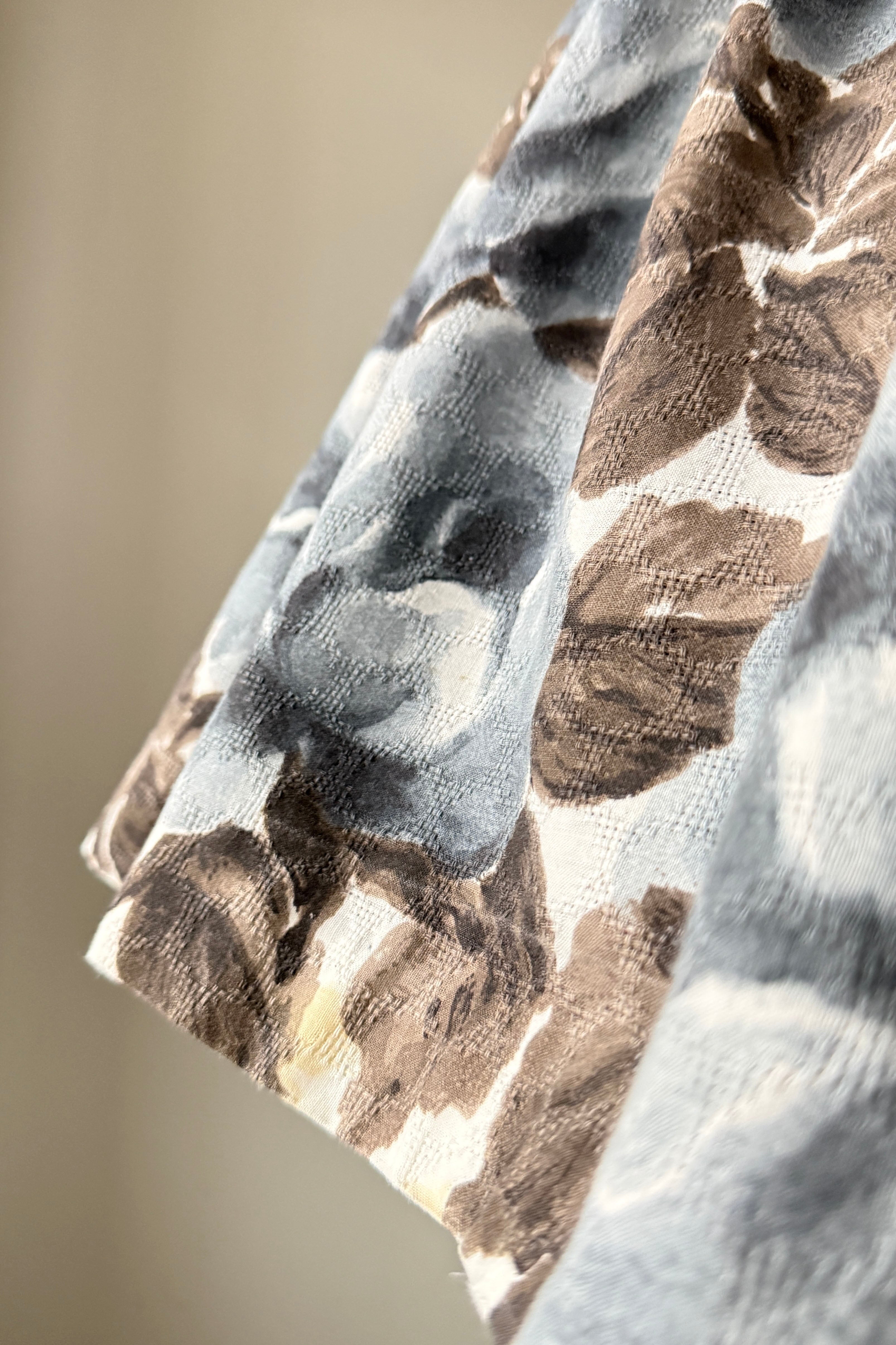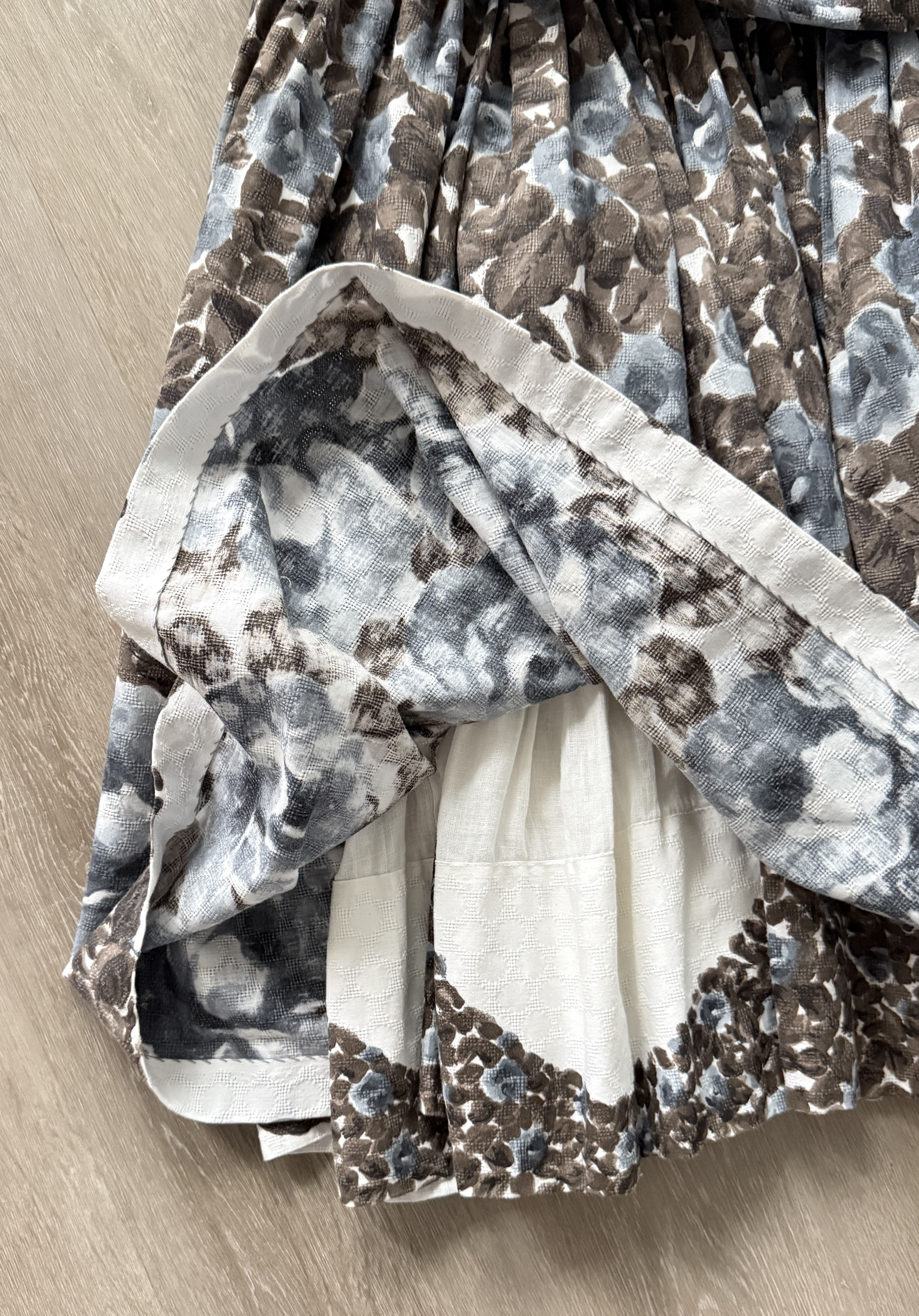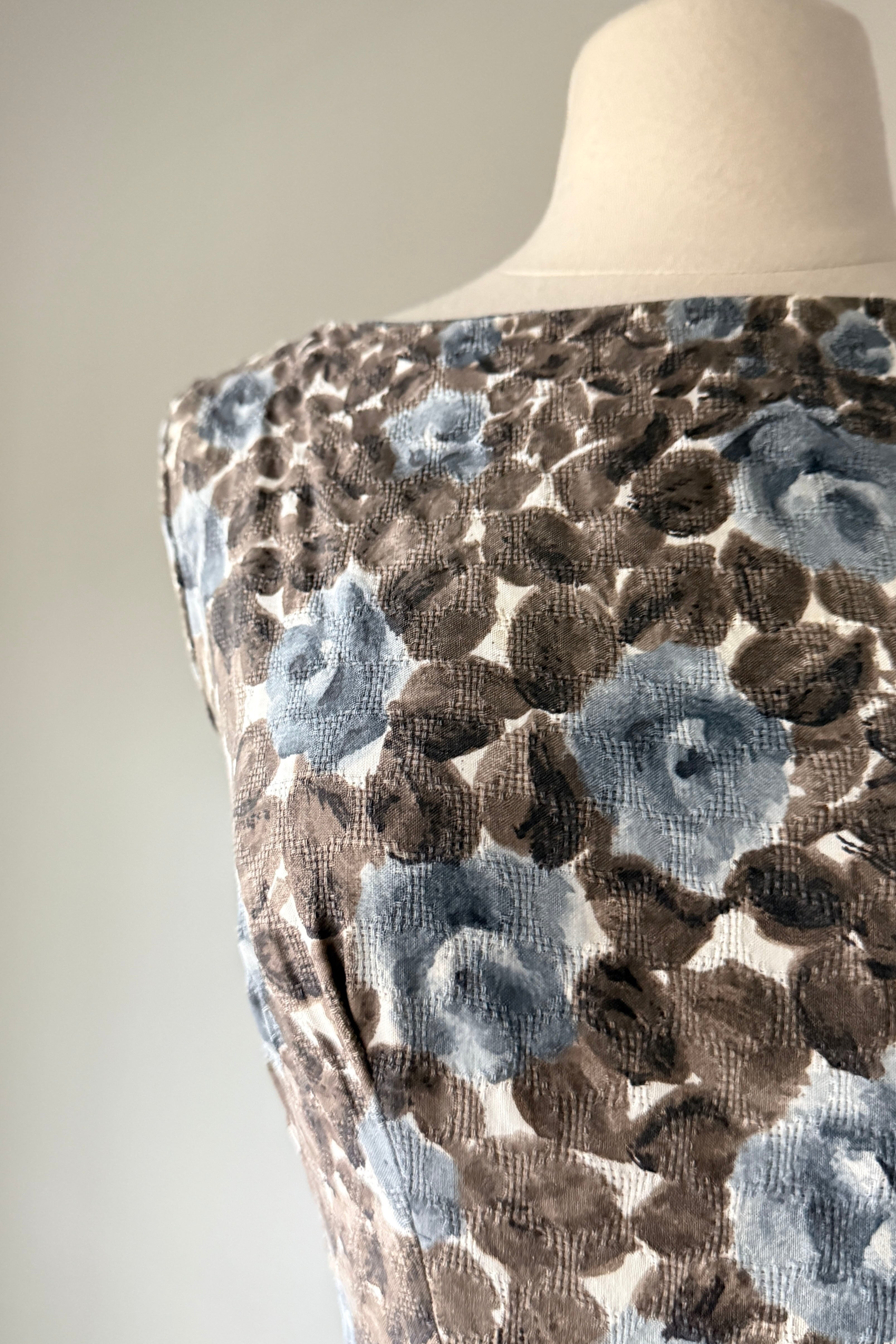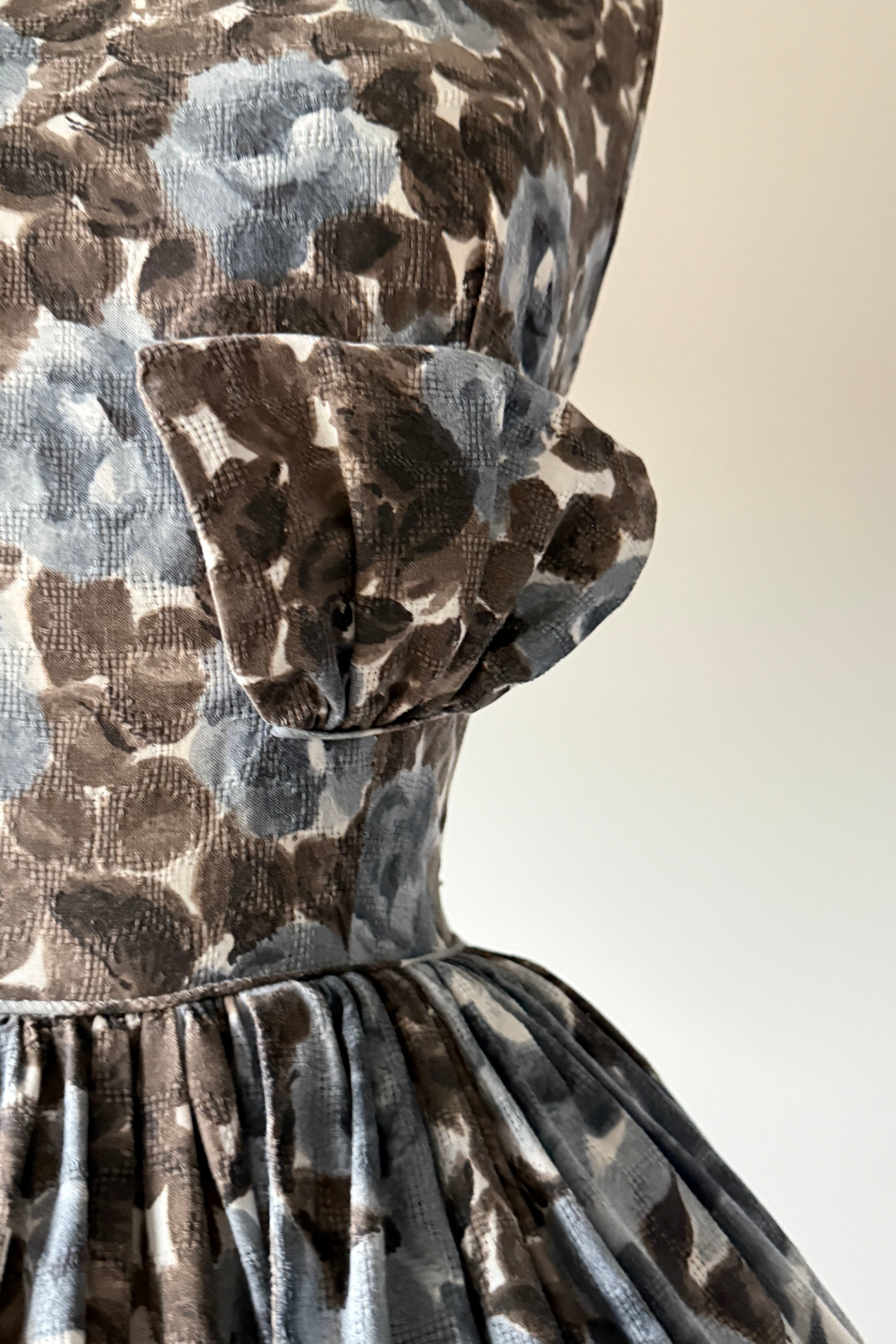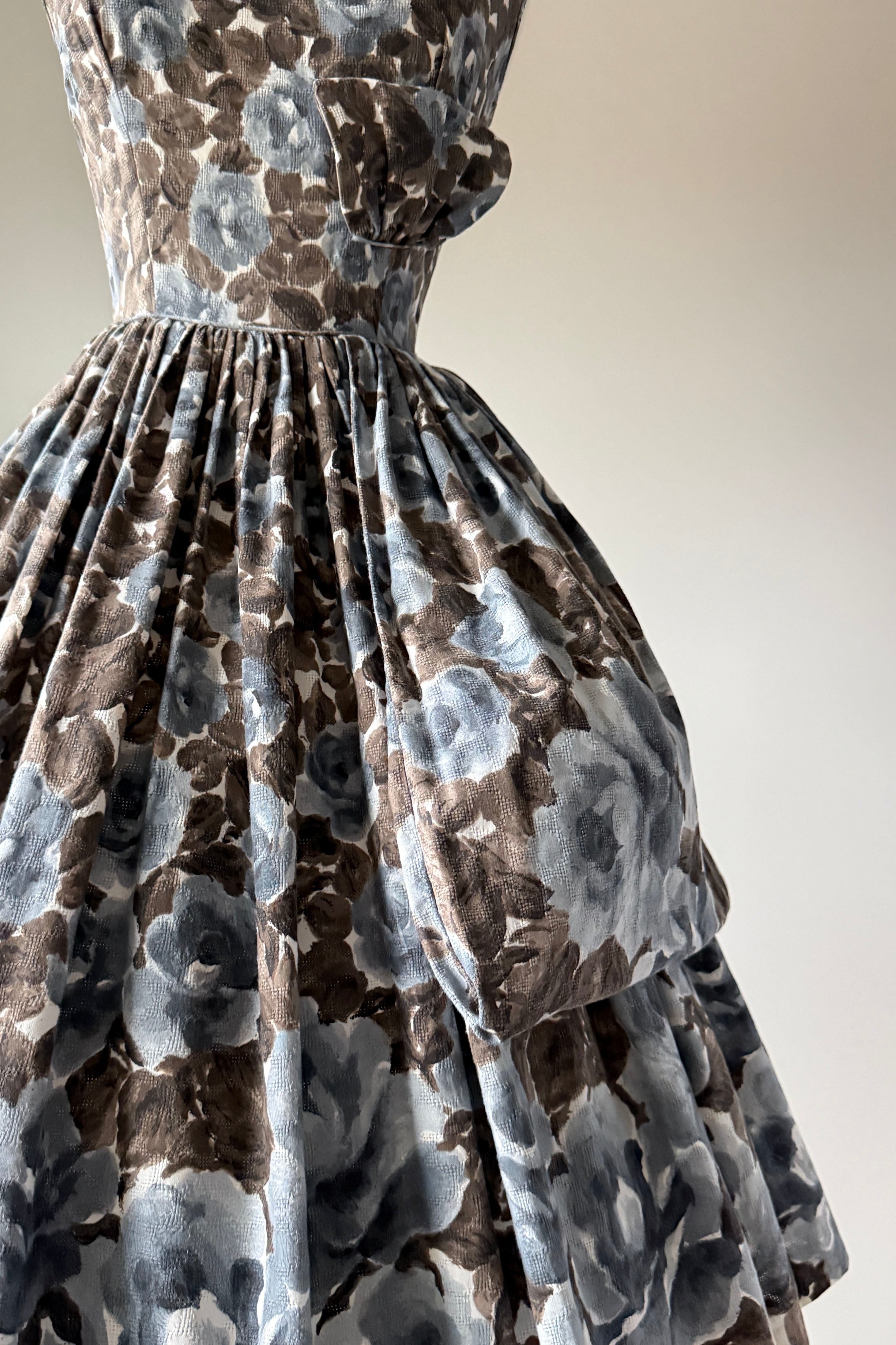 VINTAGE DRESSVintage 1950s dress. Features heavy gray and blue floral print cotton, vertical bow at left waist, attached lining with matching print, metal back zipper. From Richard Shops.Excellent condition. Small spot at front hem and faint crease at hem where it's been let out to original length. Freshly laundered and ready to wear.XS/S. Length 41Bodice 16Bust 36Waist 26As with all vintage, please expect wear consistent with age. All sales are final. No order cancellations.0844 | 2608