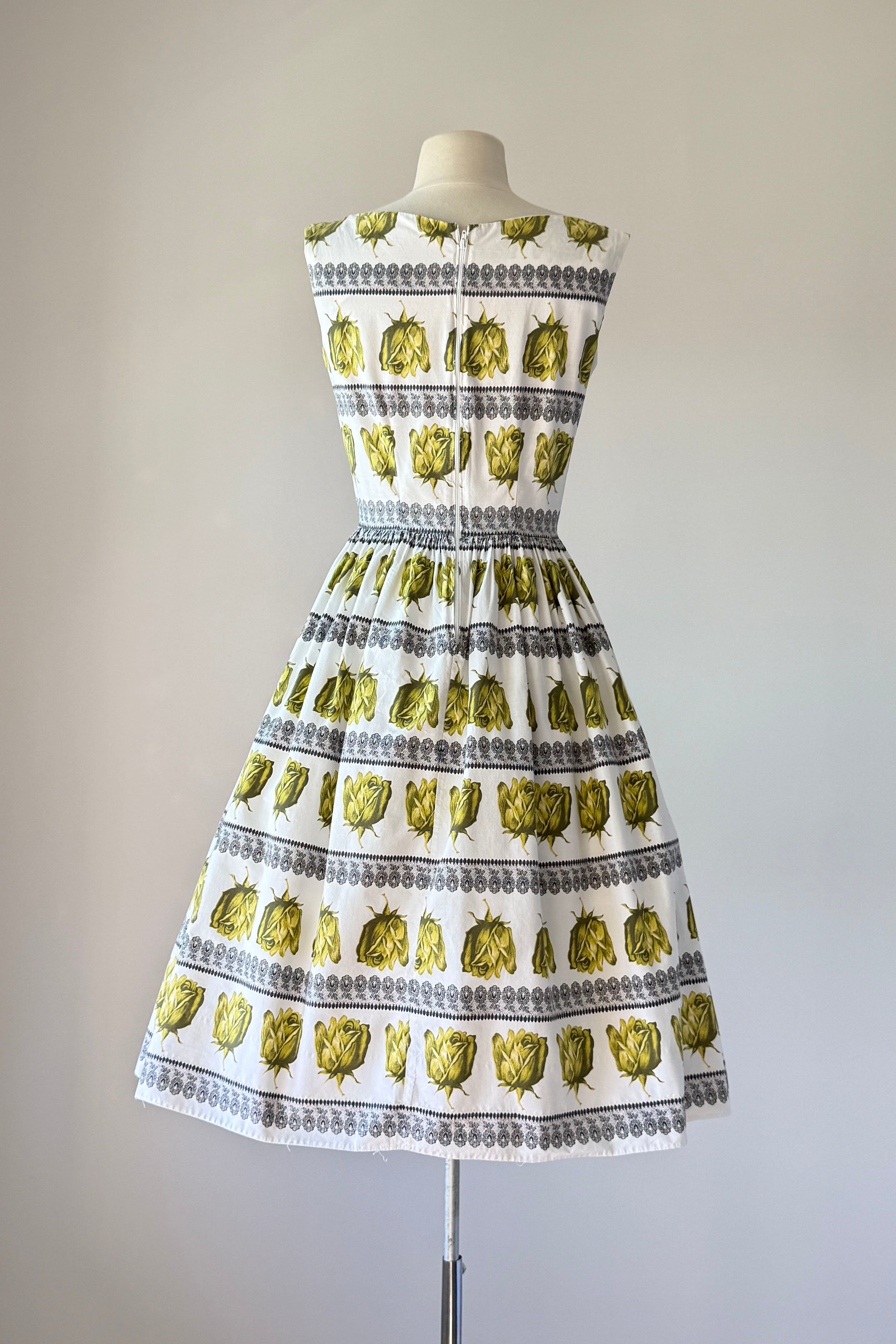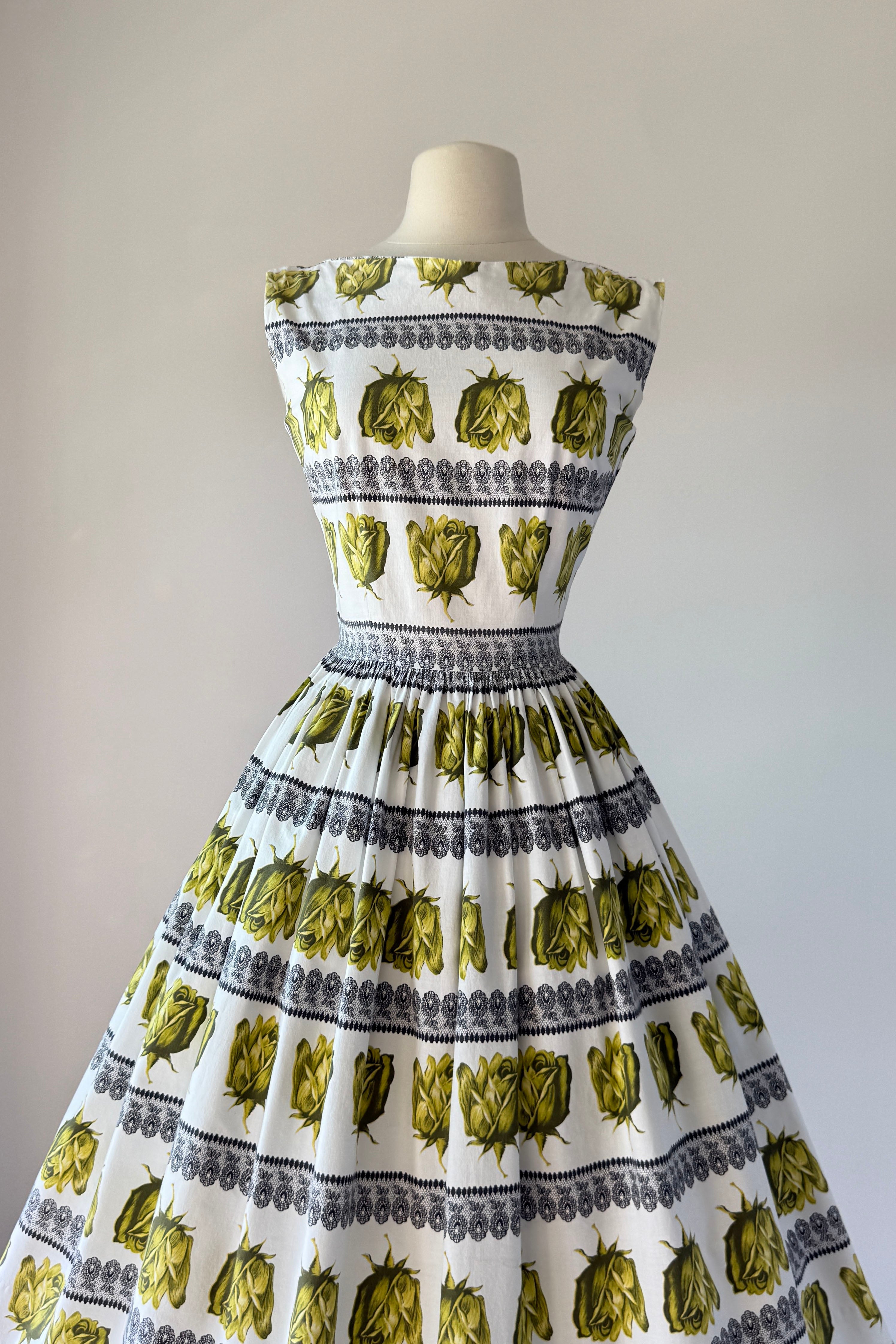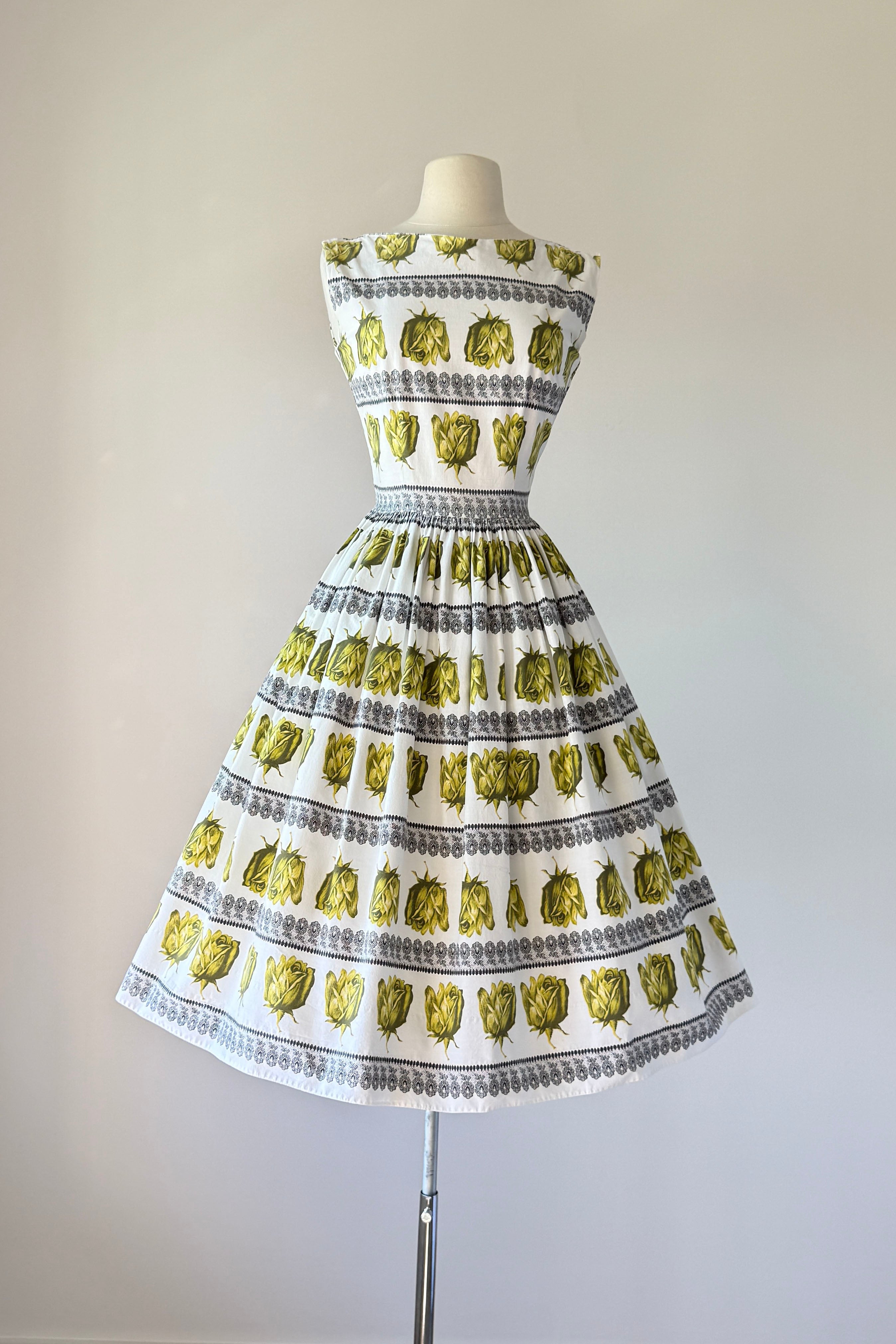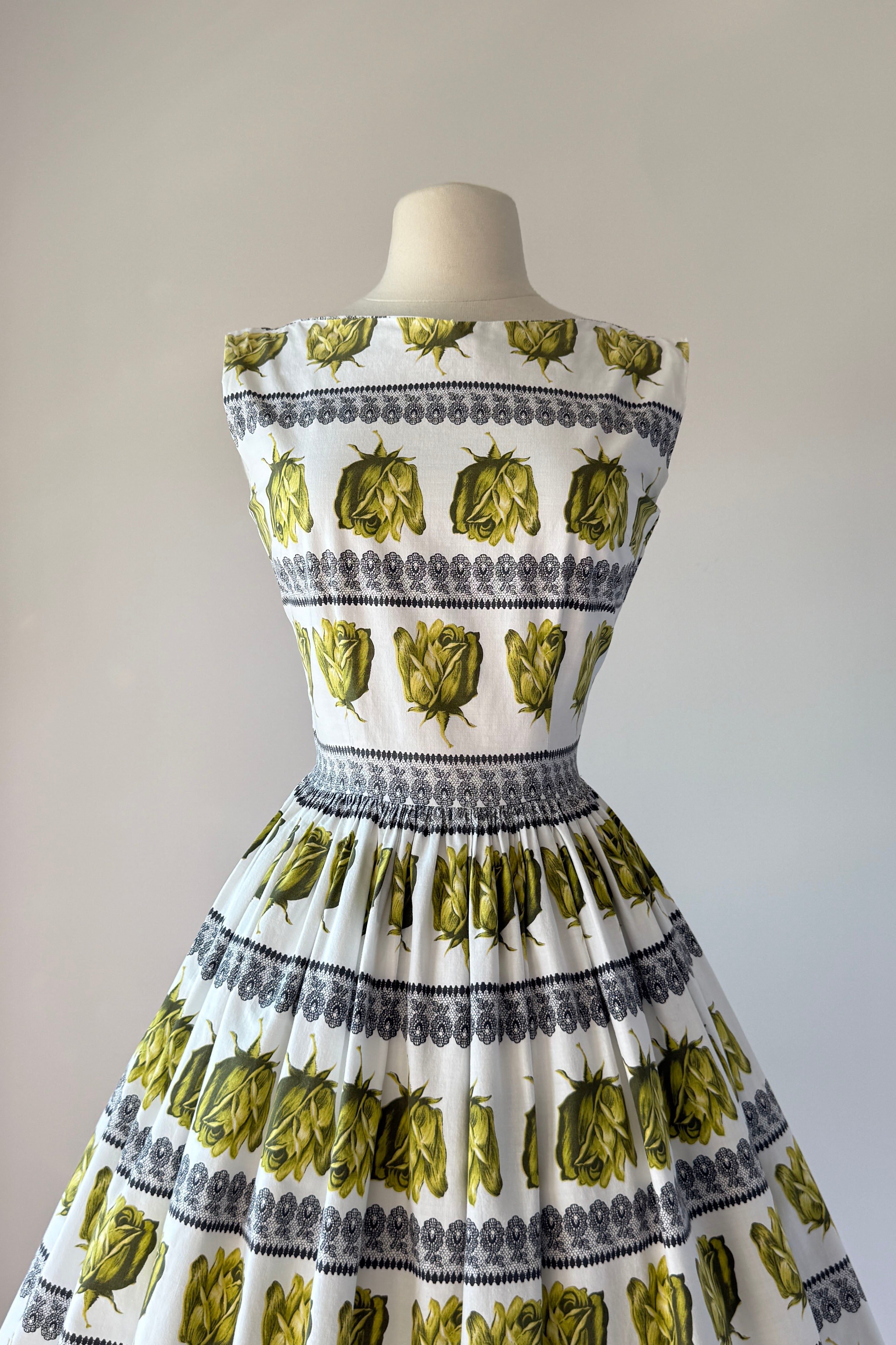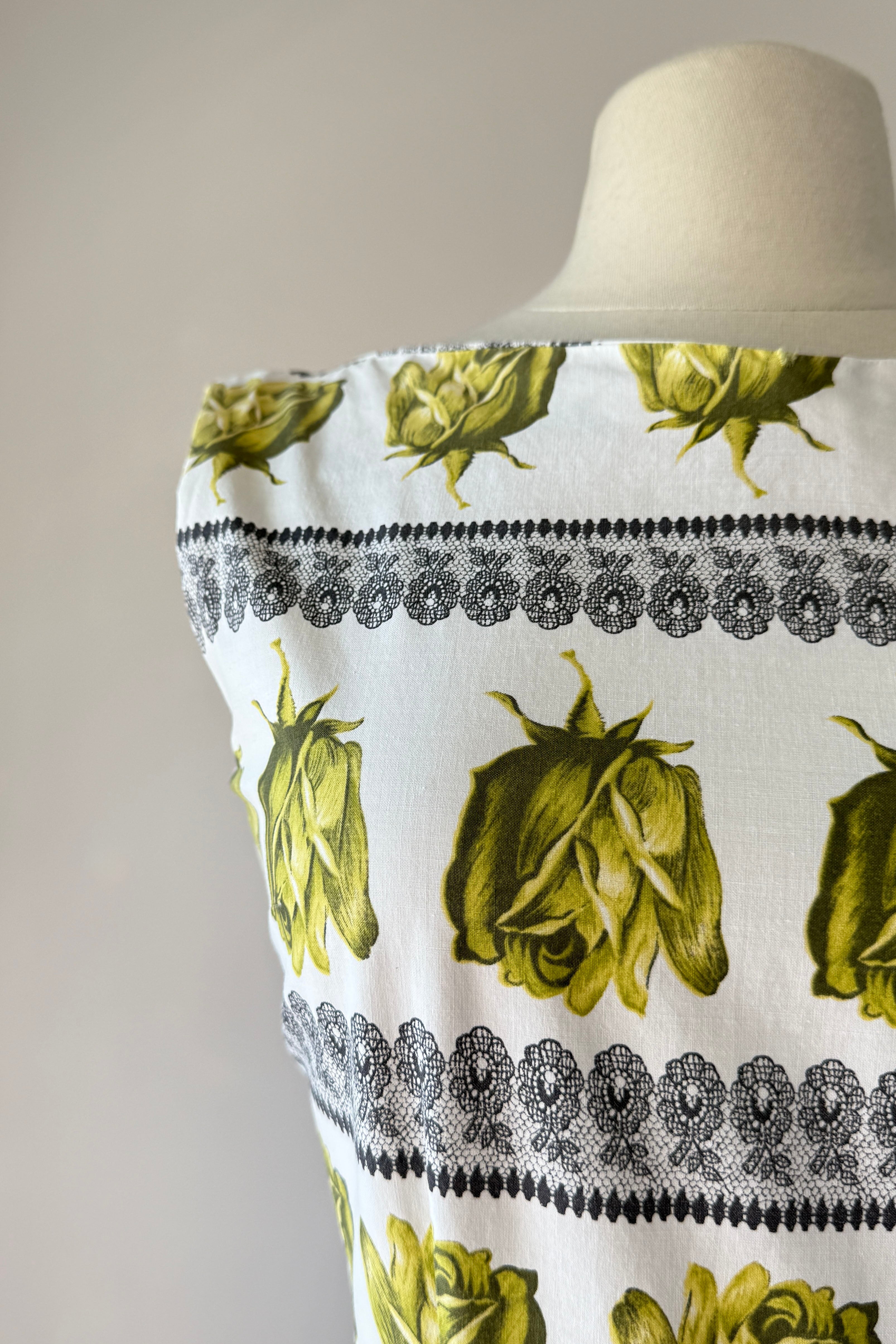 VINTAGE DRESSVintage 1950s dress. Features green rose and black lace print. Back zipper. Cotton.Great condition. One tiny repair at front center neckline. XS/S. Length 42Bodice 15.5Bust 36Waist 25As with all vintage, please expect wear consistent with age. All sales are final. No order cancellations.0846 | 2609
