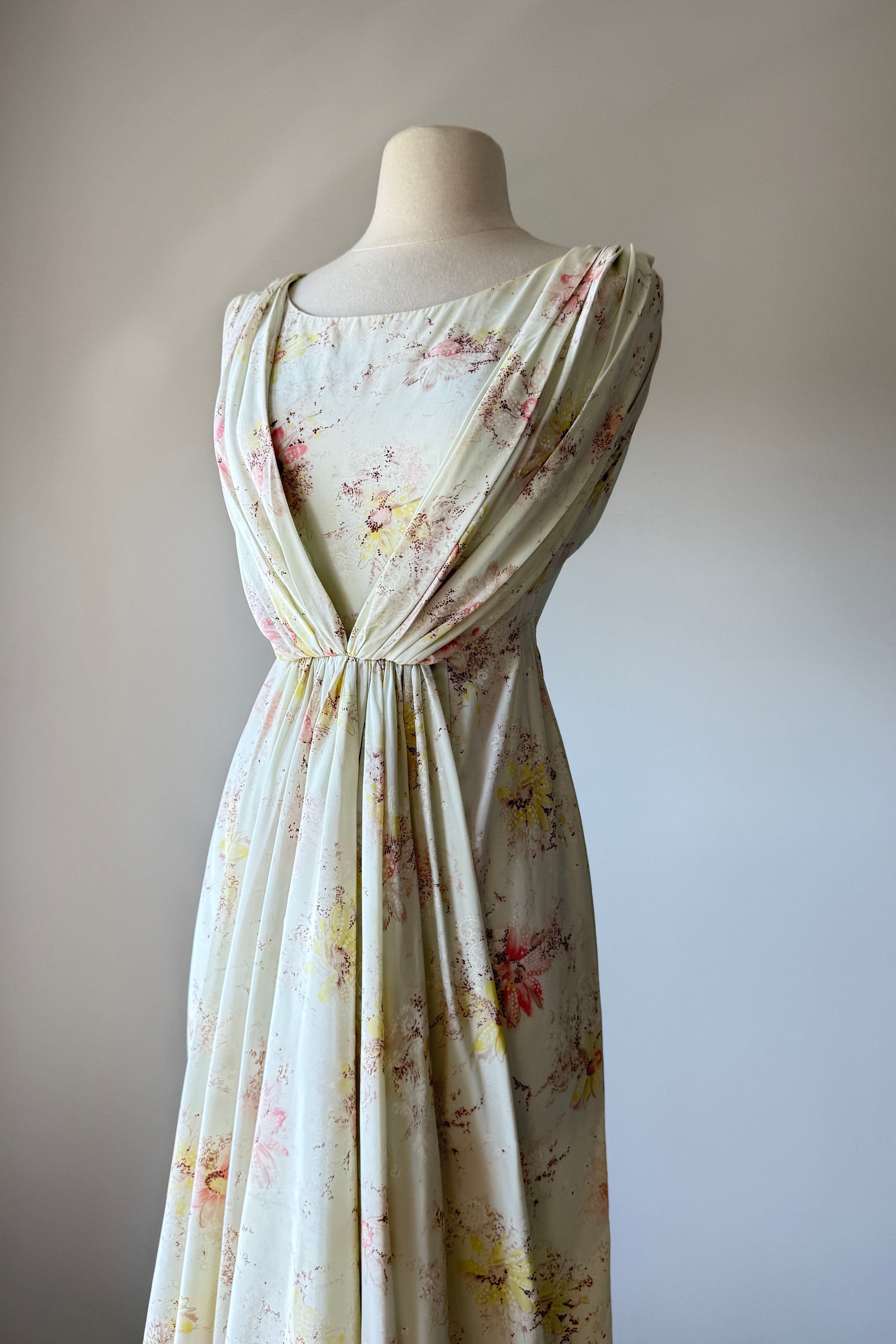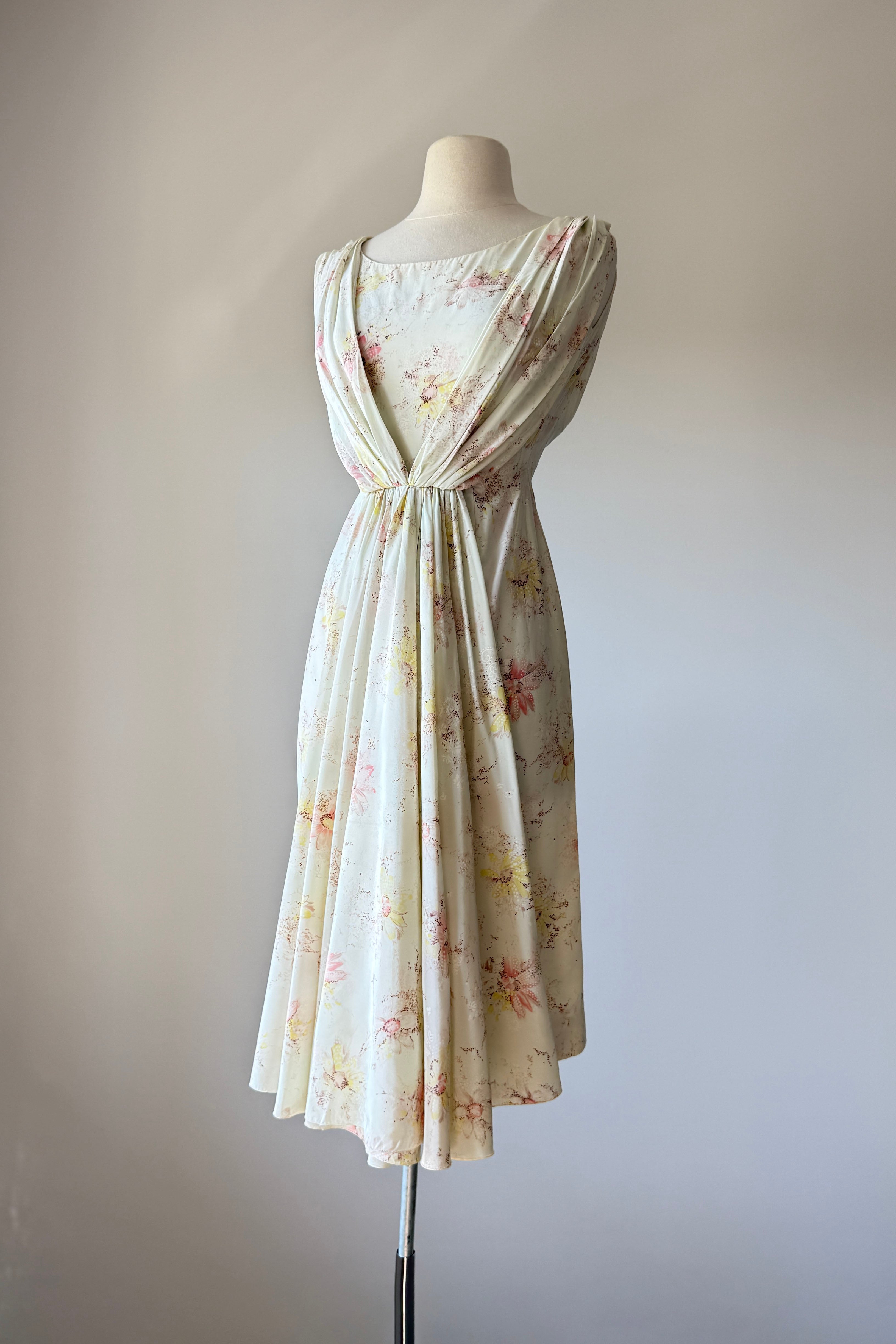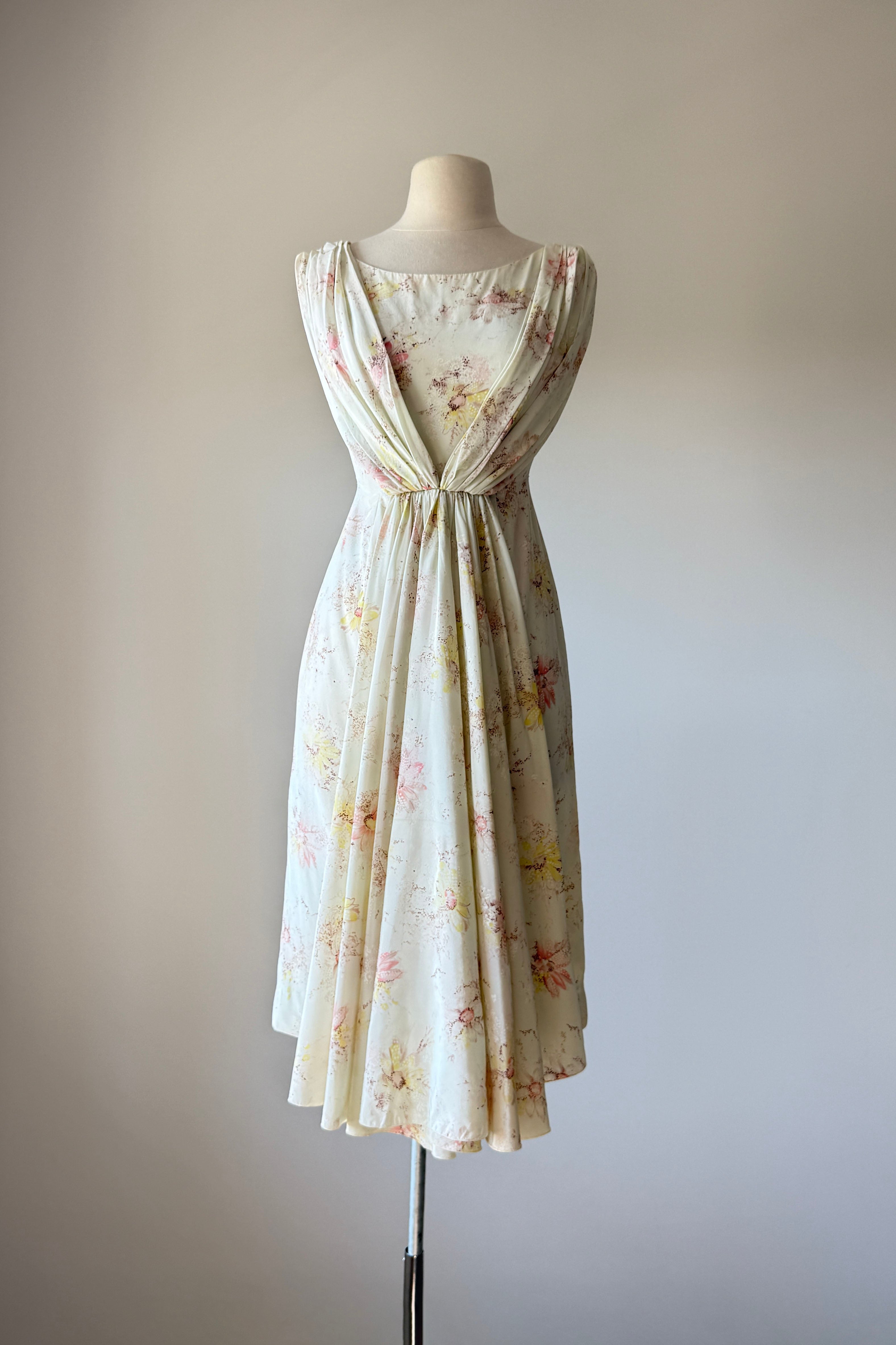 VINTAGE DRESS Vintage 1950s dress. Features ivory delicate floral print, cowl draped neck in back with cascading waterfall in front, metal back zipper. Silky acetate fully backed in cotton. By Rose Vale Creations. Excellent condition. Fits like XS.Length 39Bodice 14Bust 34Waist 22Hip 34As with all vintage, please expect wear consistent with age. All sales are final. No order cancellations.0978 | 2615