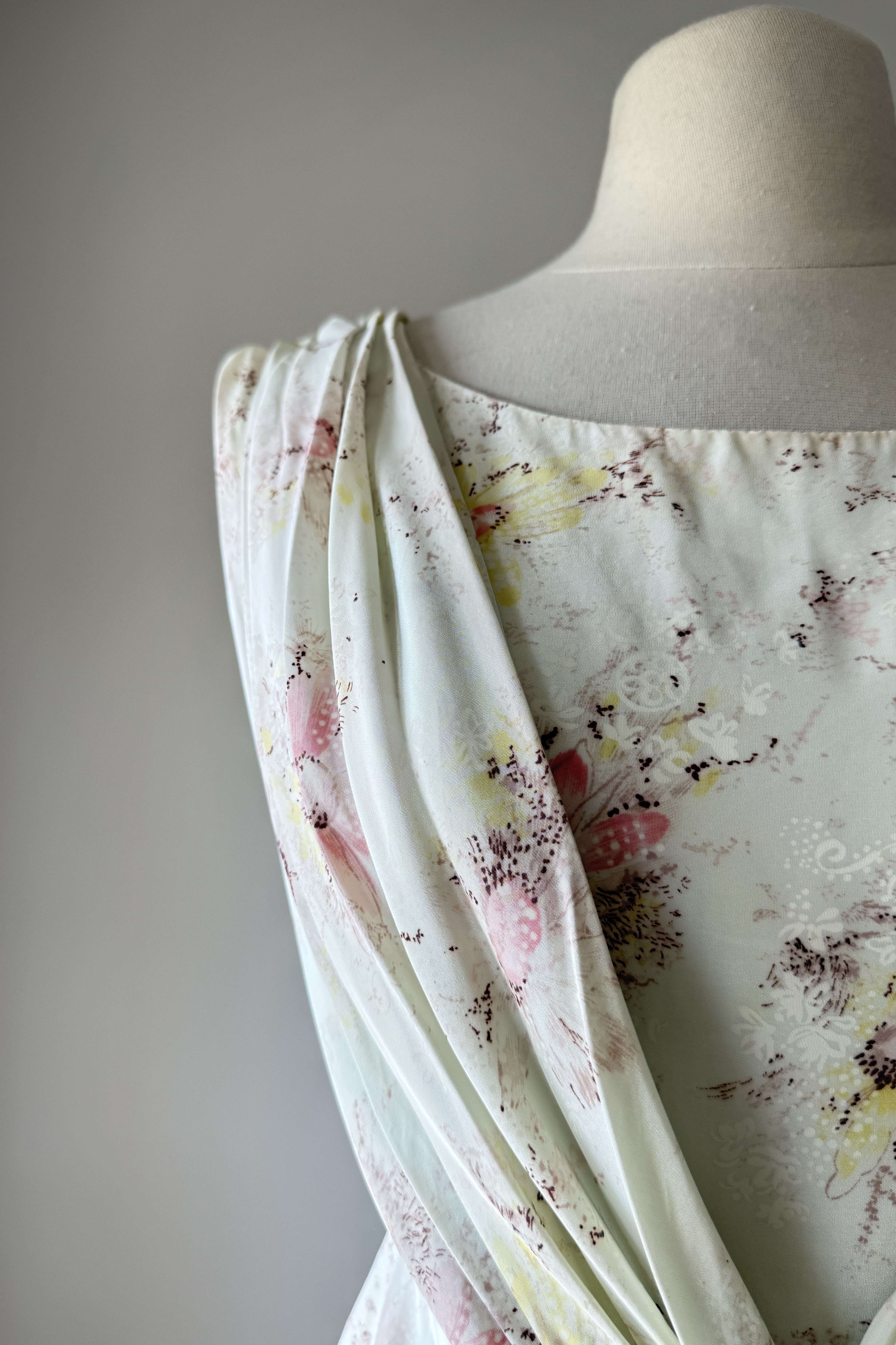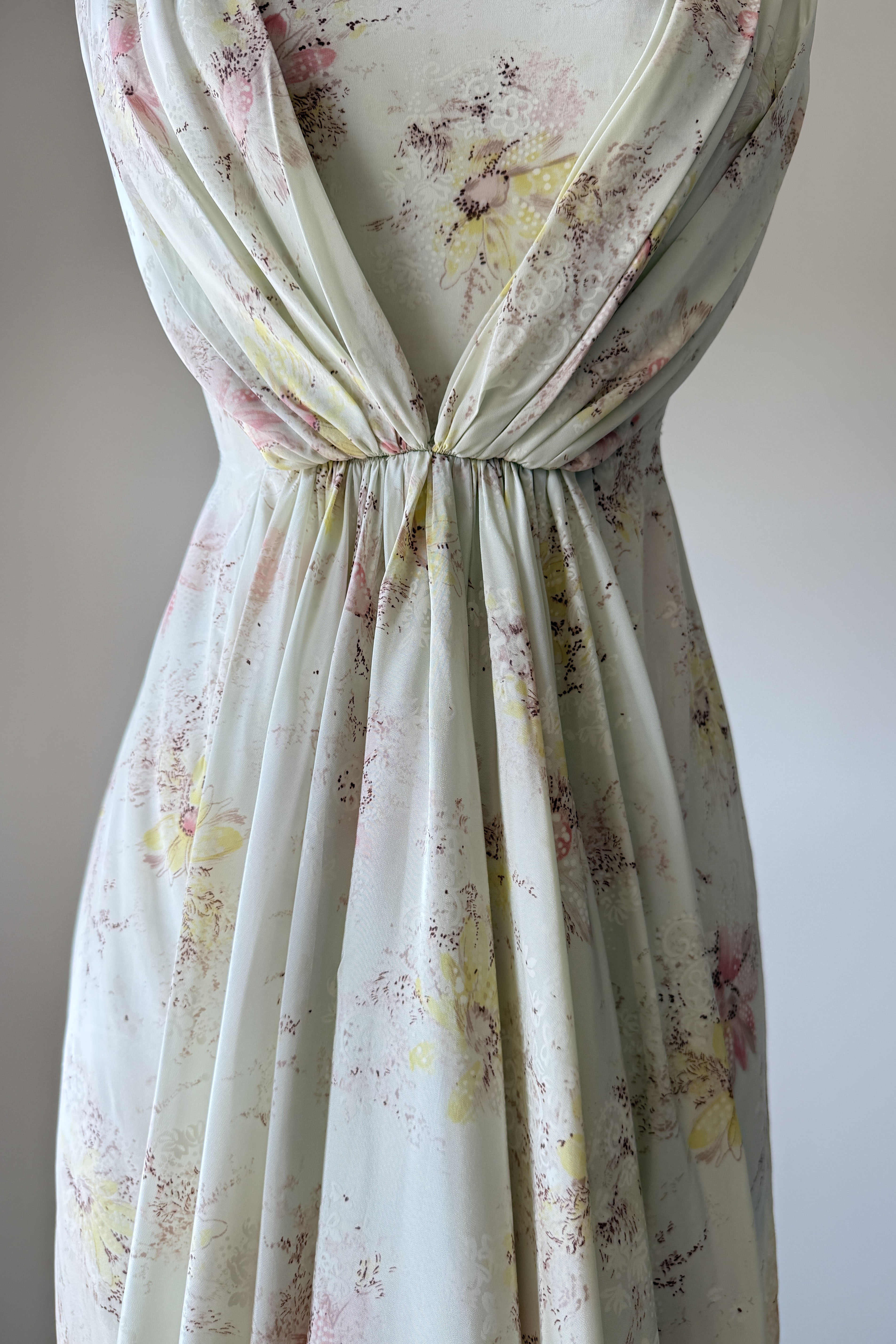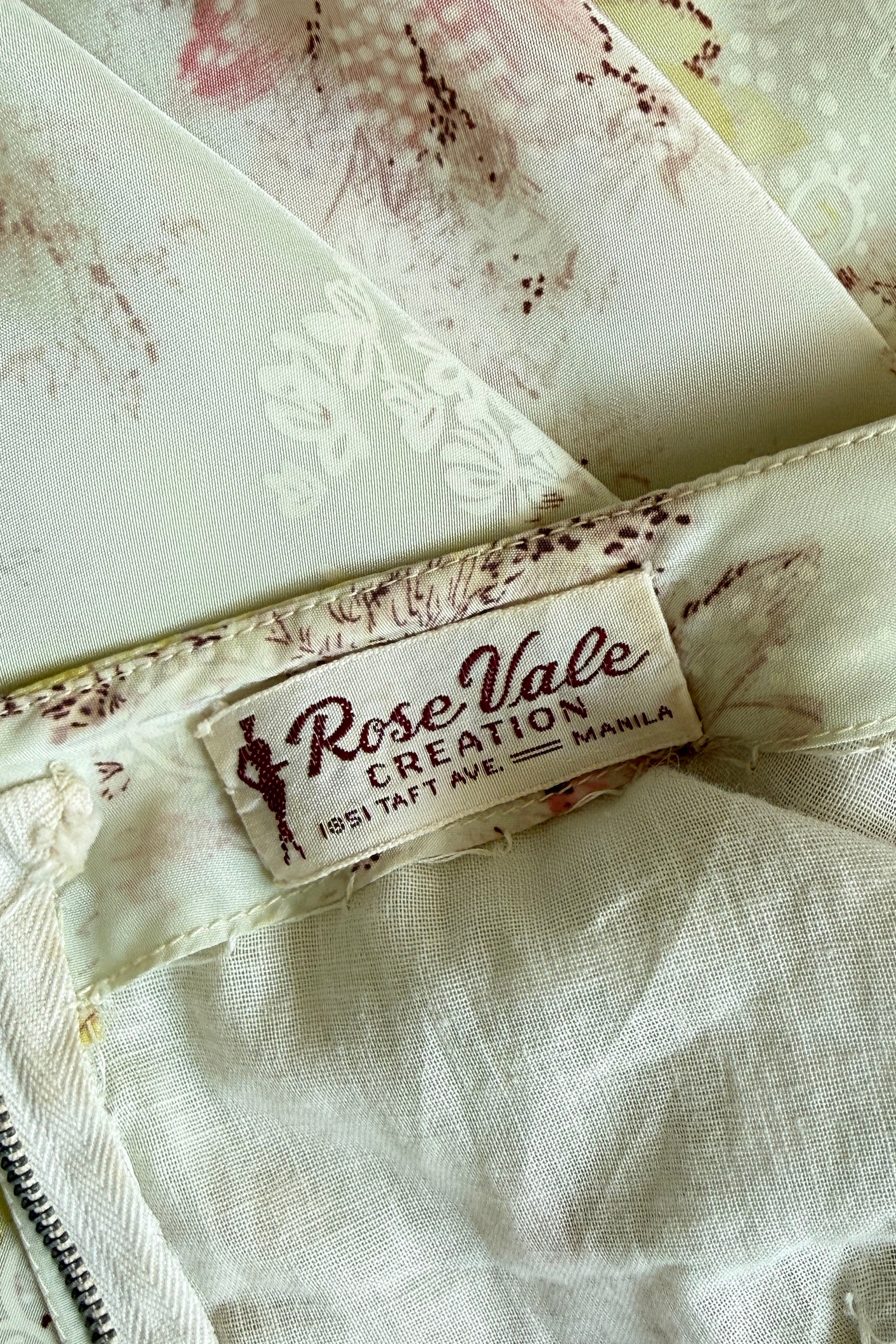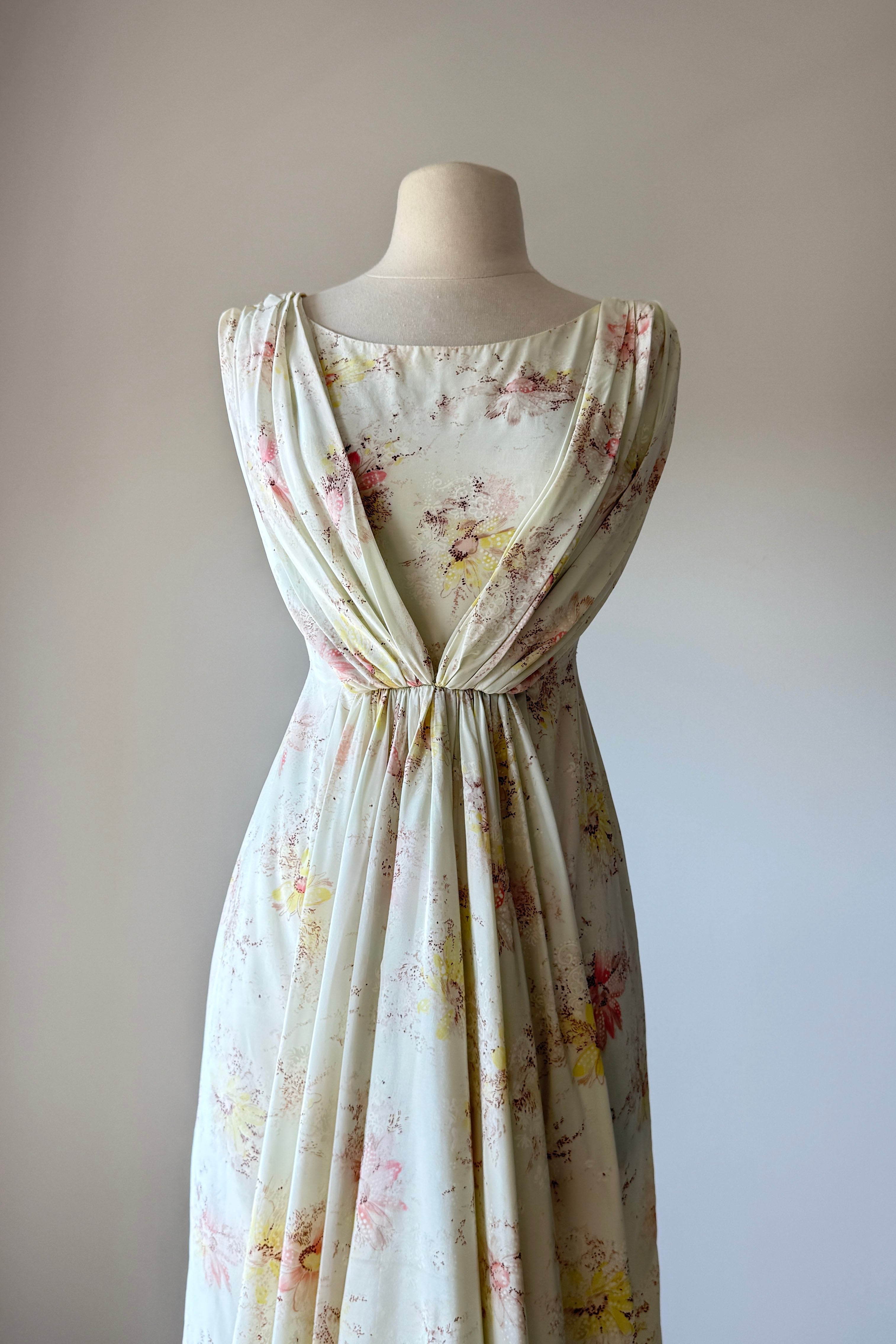 VINTAGE DRESS Vintage 1950s dress. Features ivory delicate floral print, cowl draped neck in back with cascading waterfall in front, metal back zipper. Silky acetate fully backed in cotton. By Rose Vale Creations. Excellent condition. Fits like XS.Length 39Bodice 14Bust 34Waist 22Hip 34As with all vintage, please expect wear consistent with age. All sales are final. No order cancellations.0978 | 2615