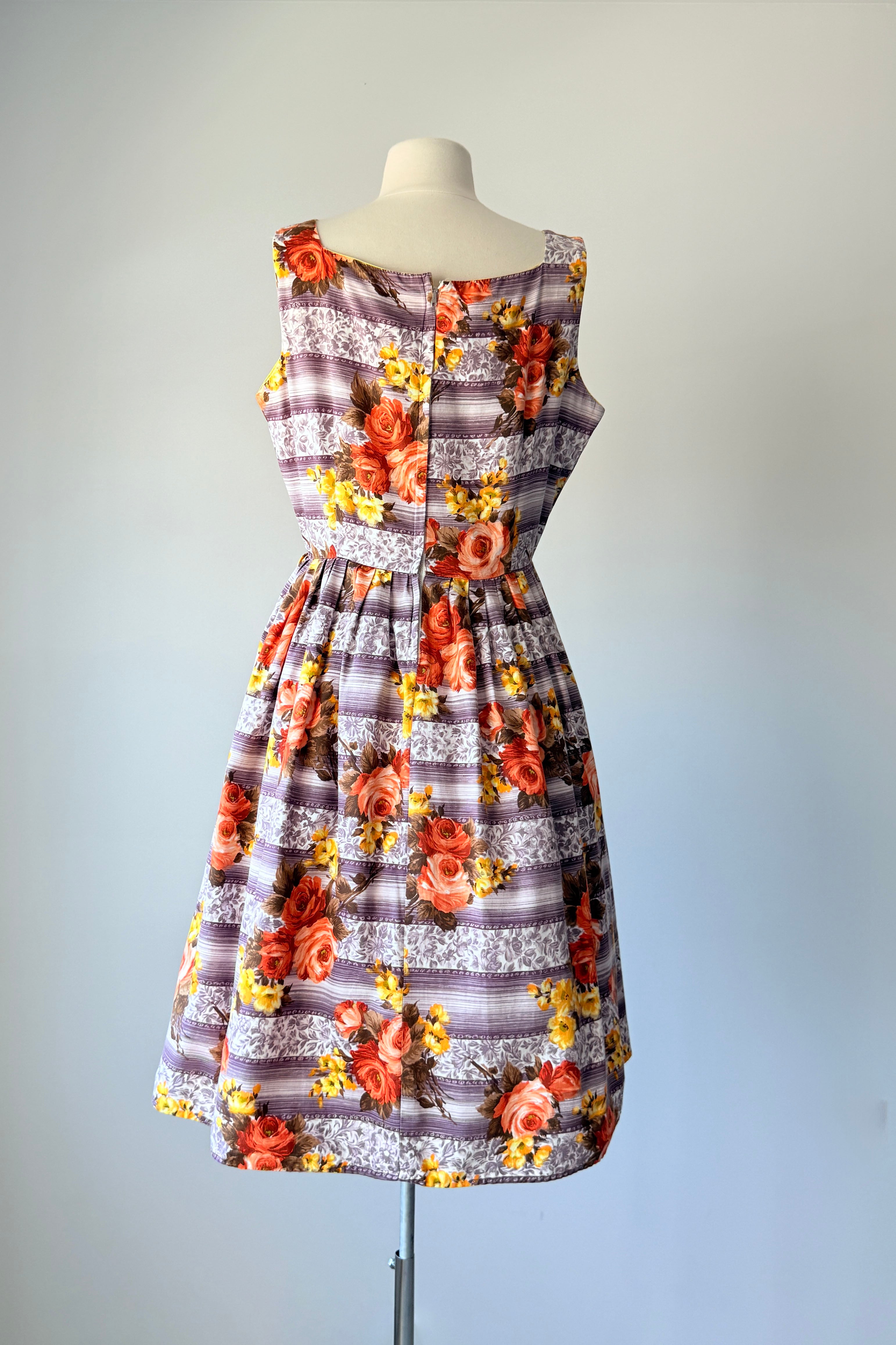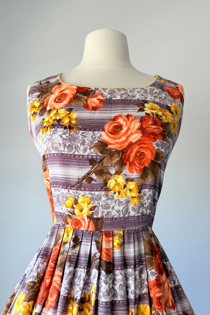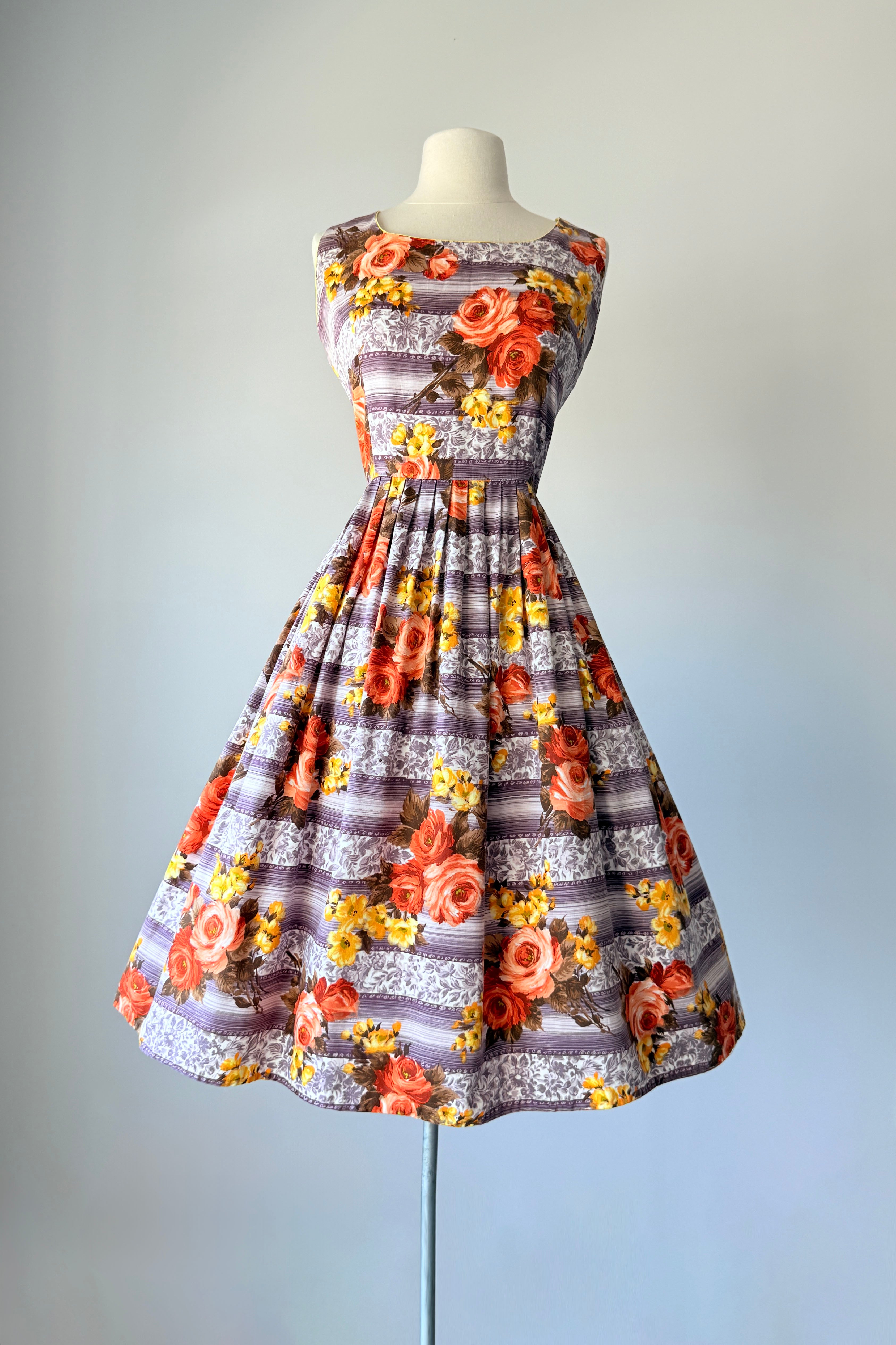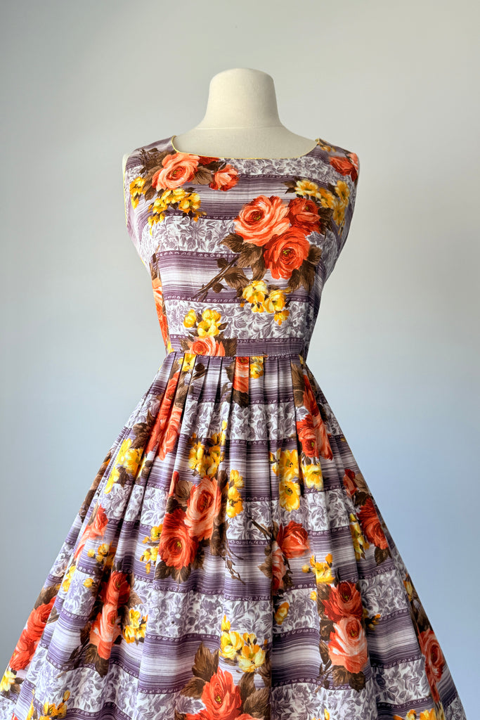 Pretty 1950s cotton dress features bouquets of coral and red roses mingled with yellow primroses, set against lavender-toned horizontal stripes and floral jacquard-inspired bands. Classic sleeveless bodice, pleated skirt.