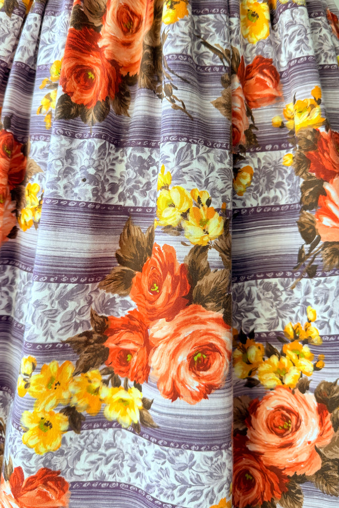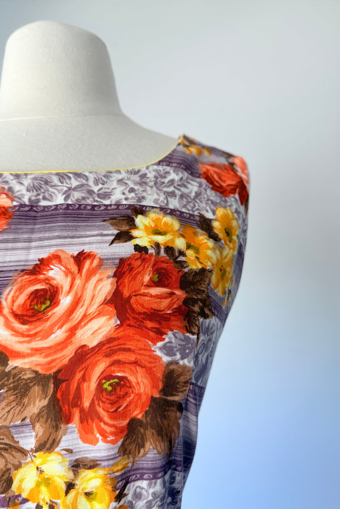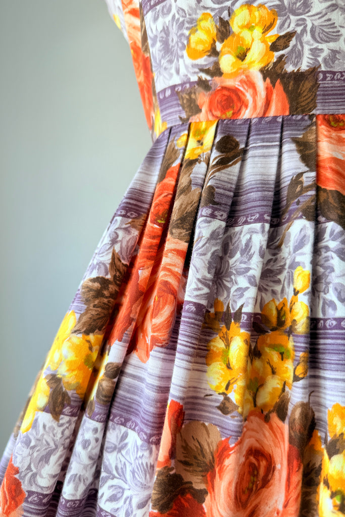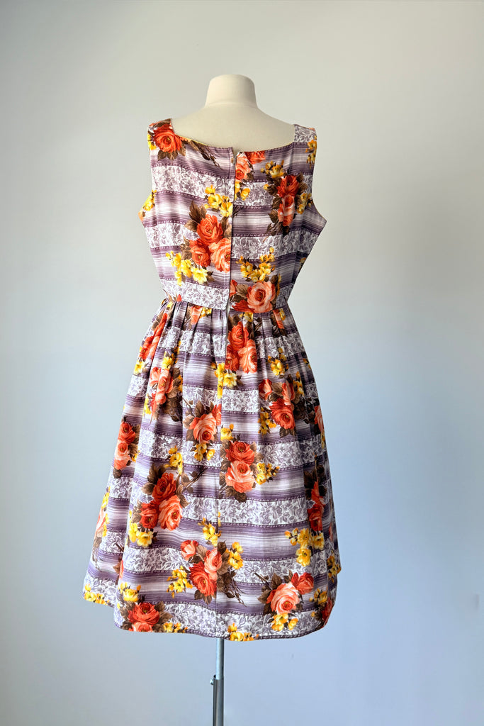 Pretty 1950s cotton dress features bouquets of coral and red roses mingled with yellow primroses, set against lavender-toned horizontal stripes and floral jacquard-inspired bands. Classic sleeveless bodice, pleated skirt.