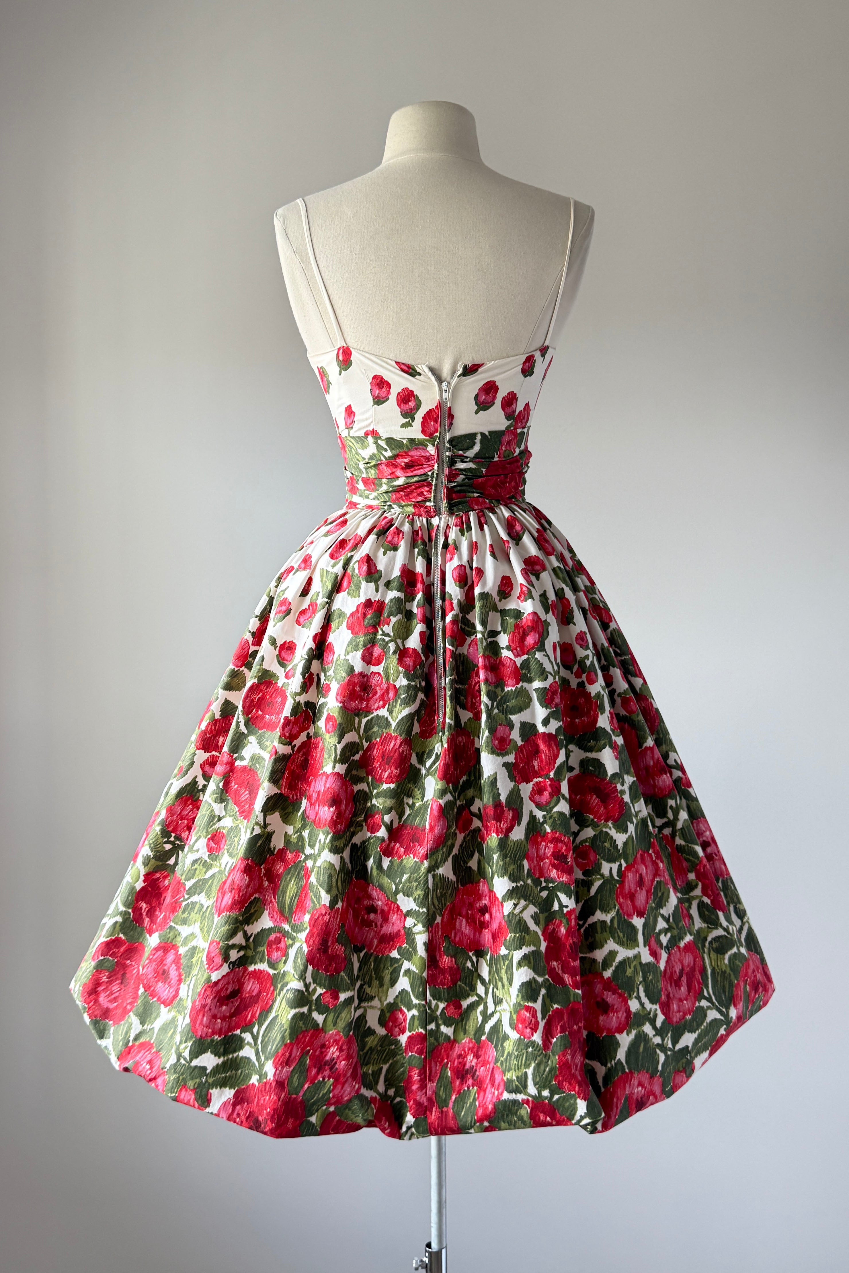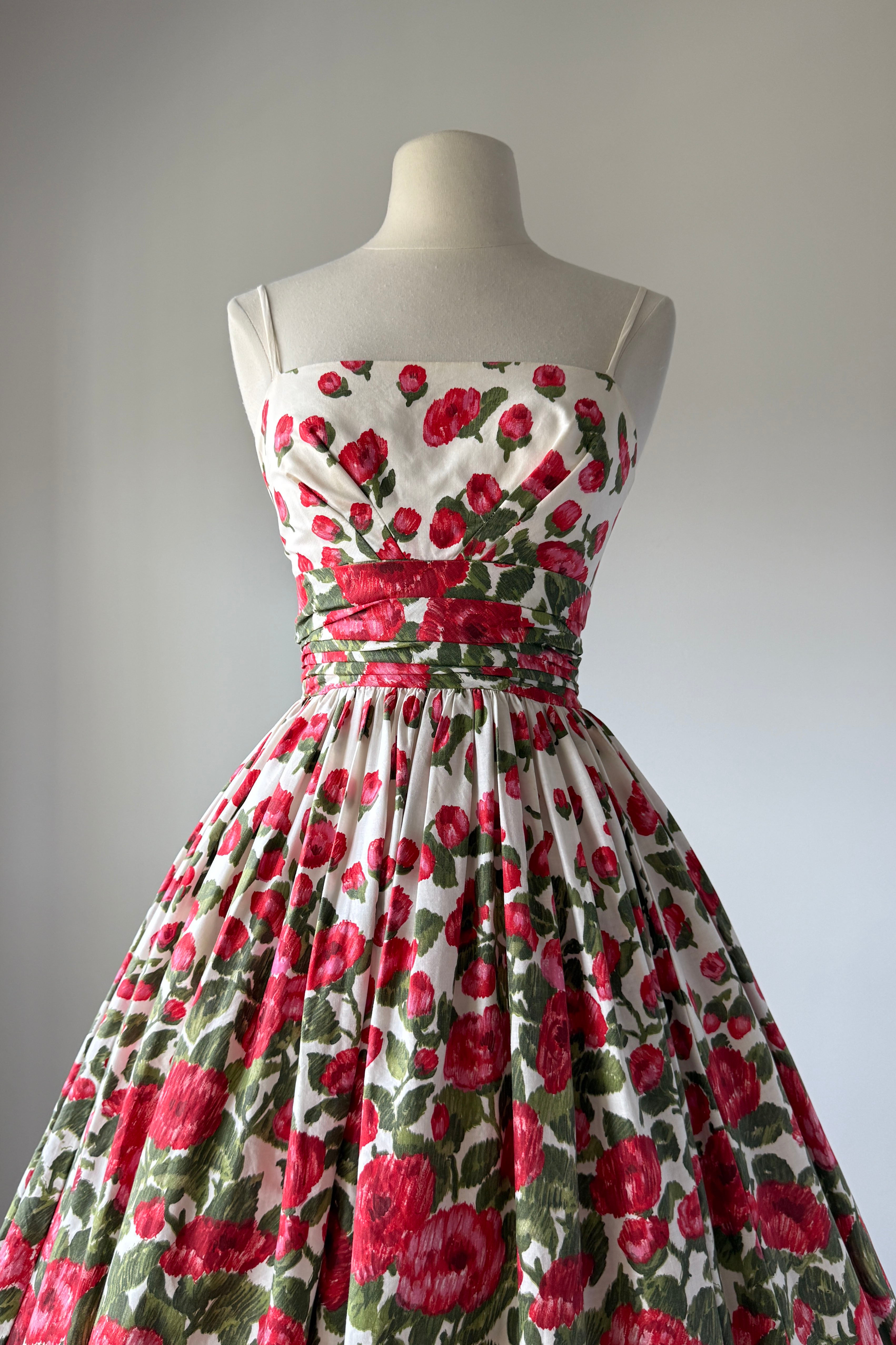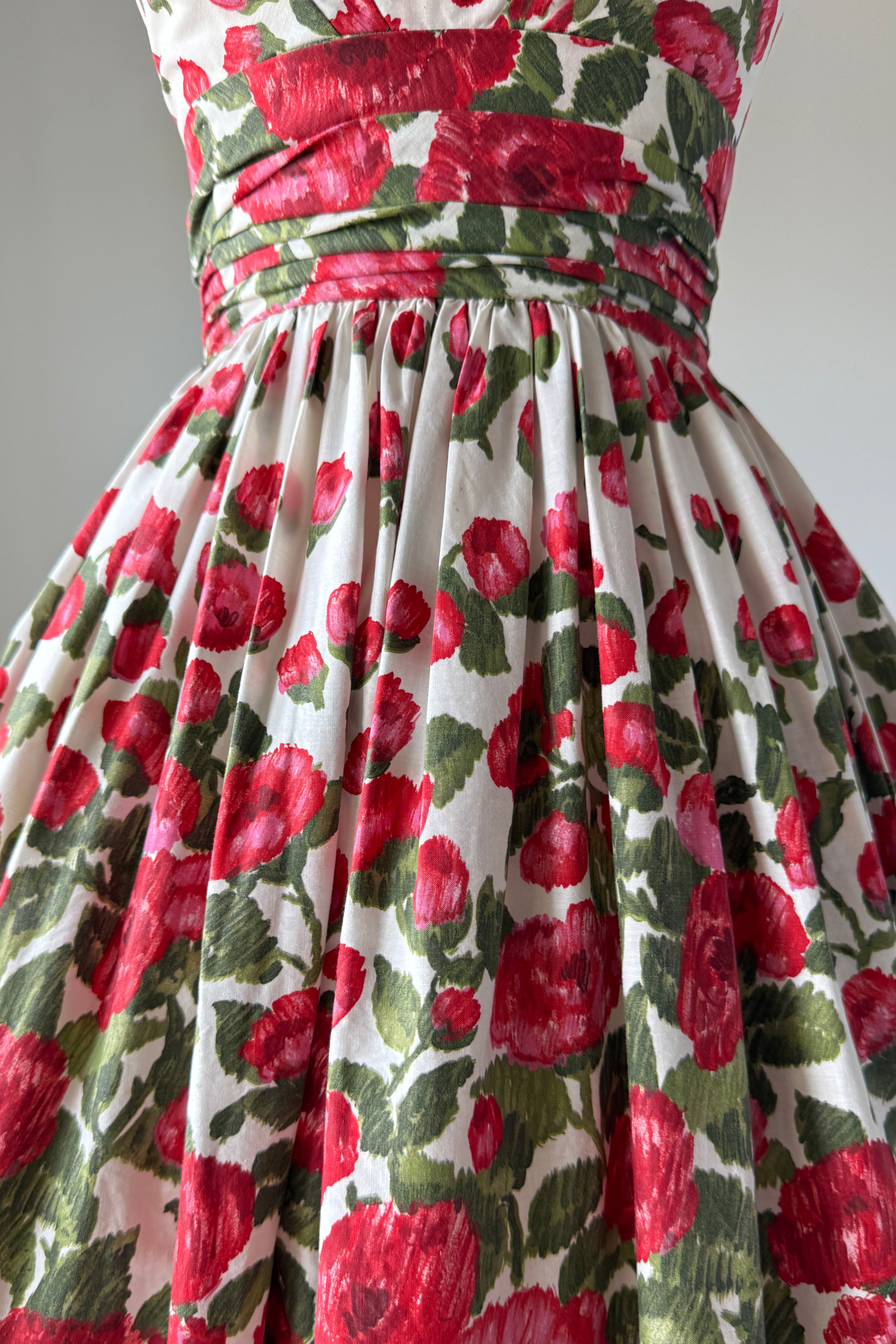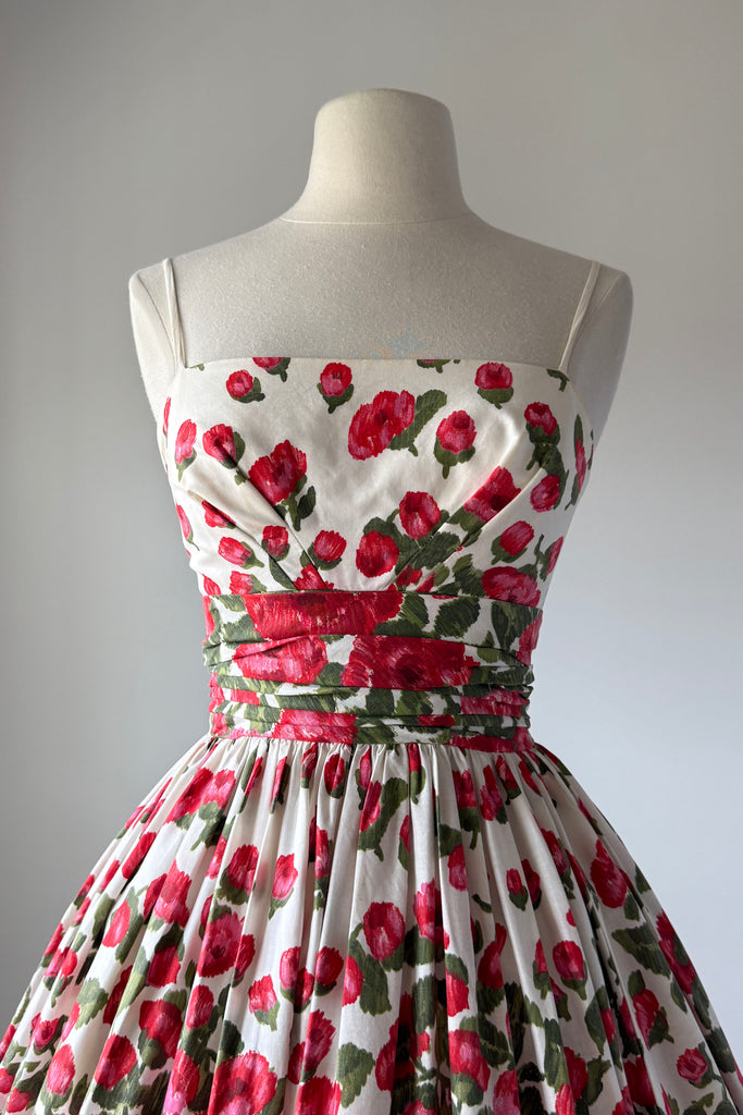 VINTAGE FLORAL PRINT DRESS1950s white cotton with red blooms, ruched waist, metal back zipper. Acetate + tulle lining. Bubble hem.Some minor yellowing inside bodice otherwise, excellent. Freshly laundered and ready to wear. Fits like XSLength 44Bodice 15.5Bust 32Waist 24As with all vintage, please expect wear consistent with age. All sales are final. No order cancellations.0731 | 2546