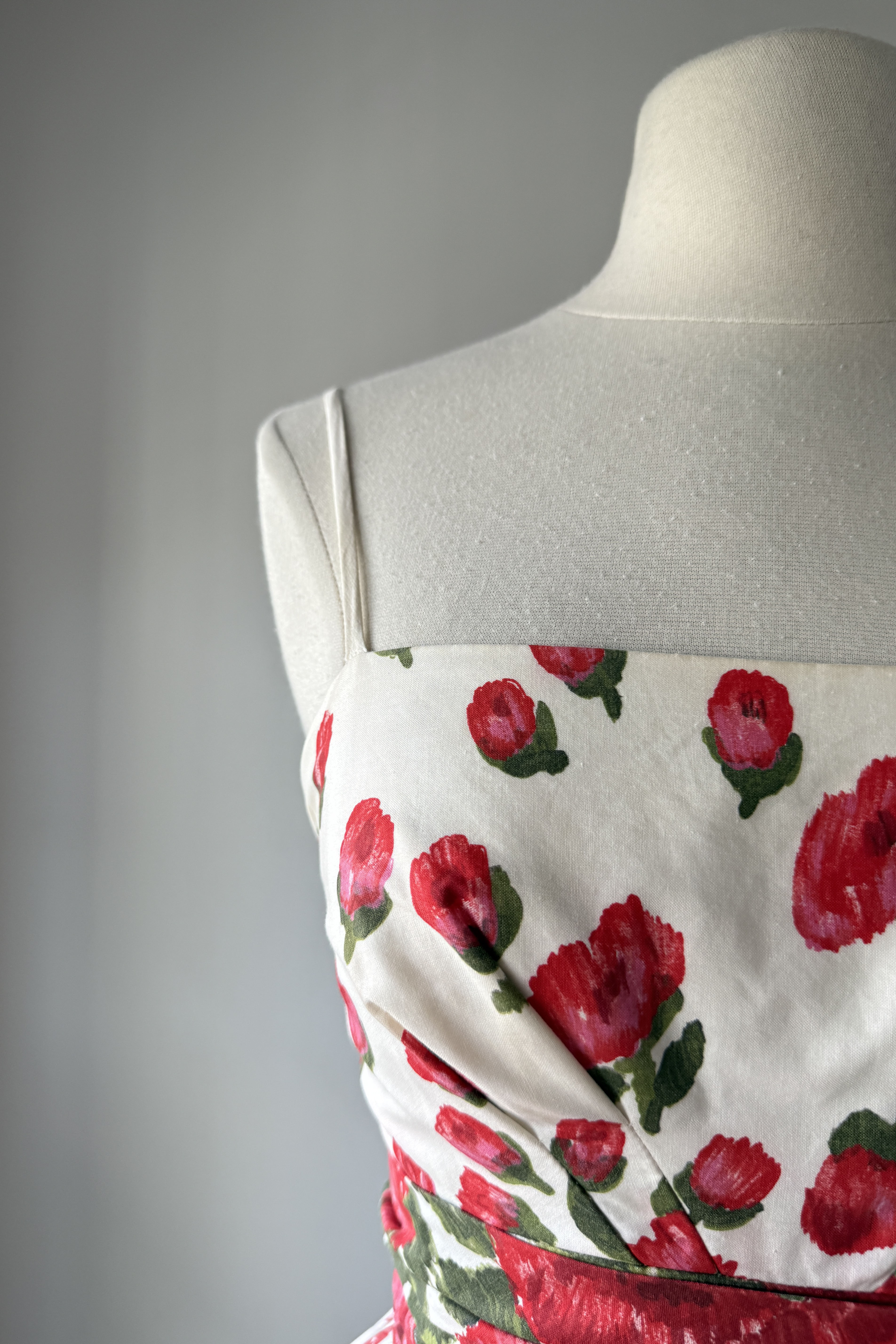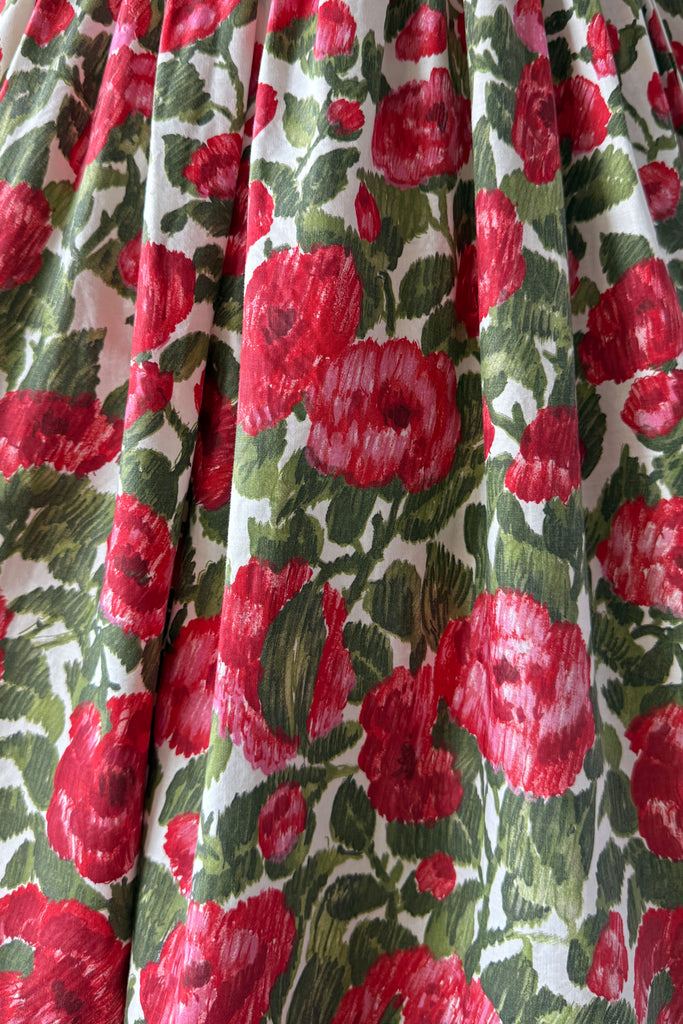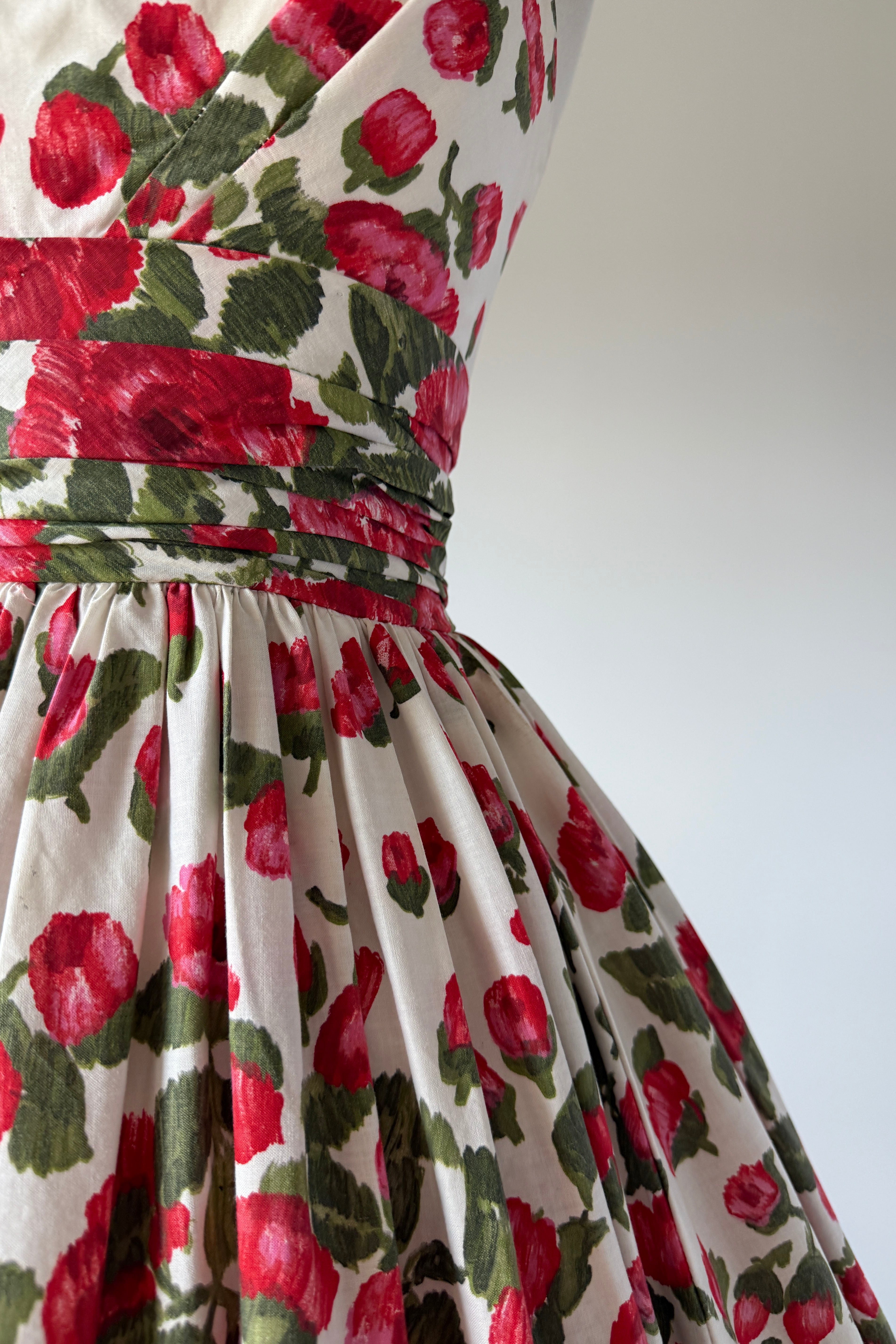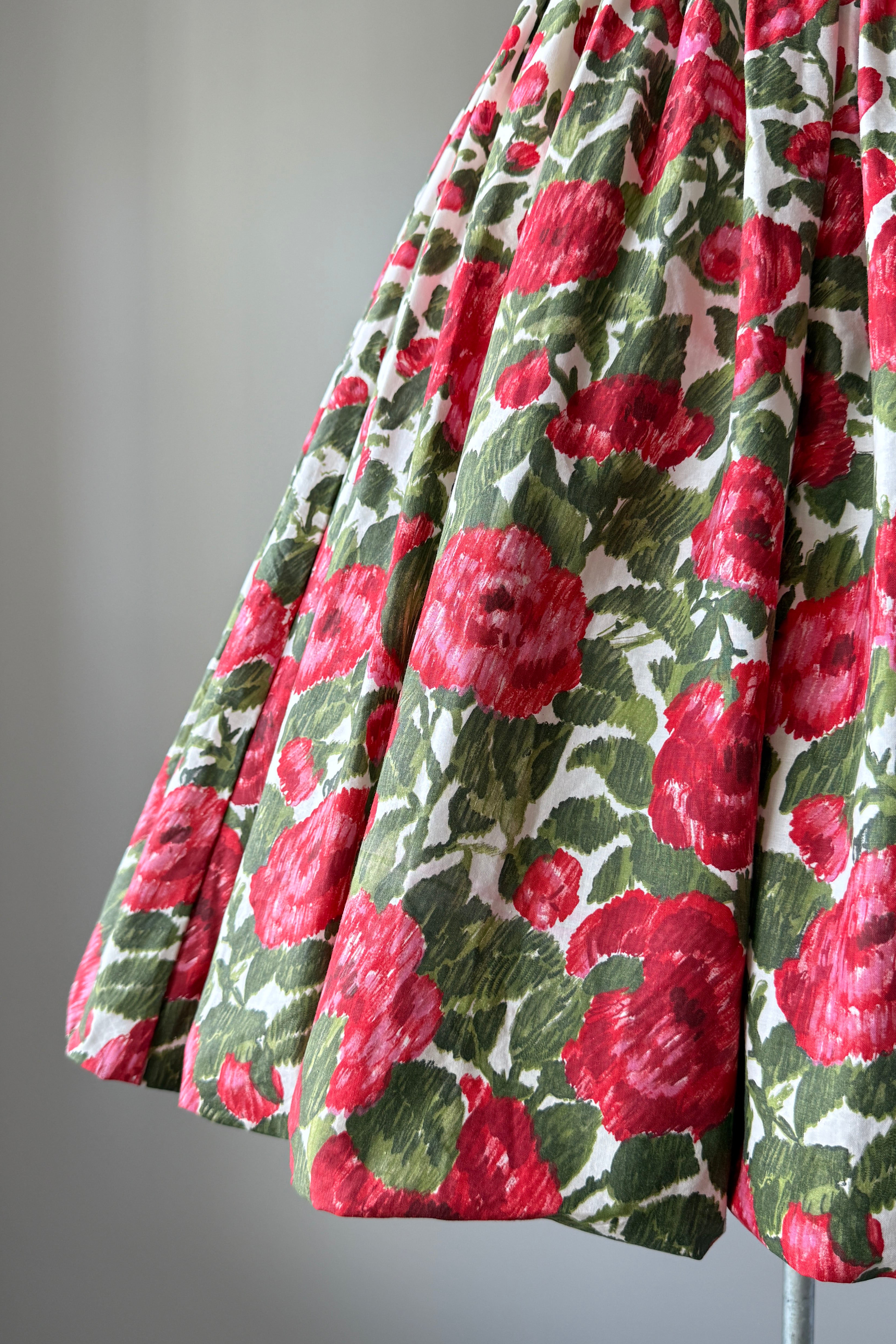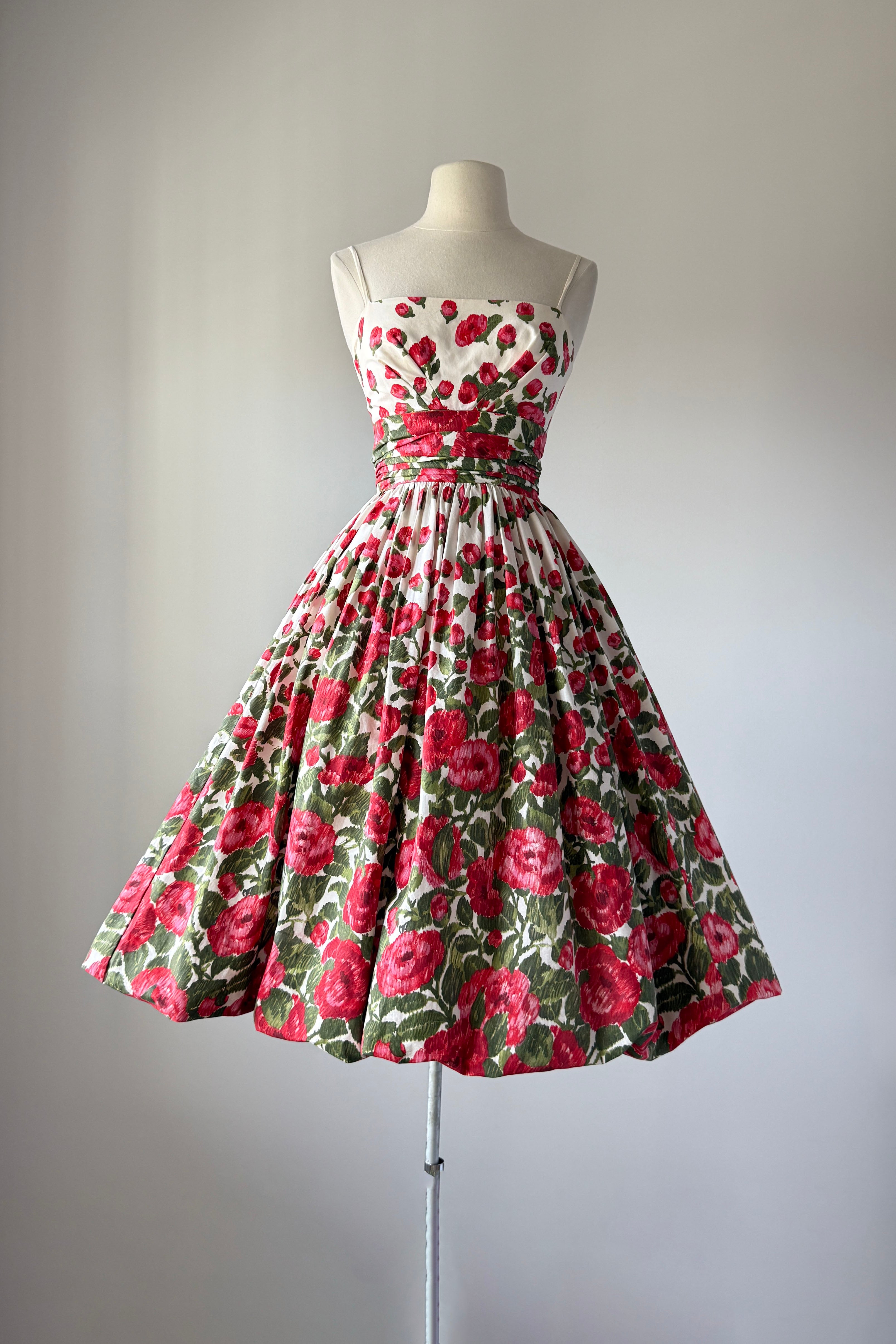 VINTAGE FLORAL PRINT DRESS1950s white cotton with red blooms, ruched waist, metal back zipper. Acetate + tulle lining. Bubble hem.Some minor yellowing inside bodice otherwise, excellent. Freshly laundered and ready to wear. Fits like XSLength 44Bodice 15.5Bust 32Waist 24As with all vintage, please expect wear consistent with age. All sales are final. No order cancellations.0731 | 2546