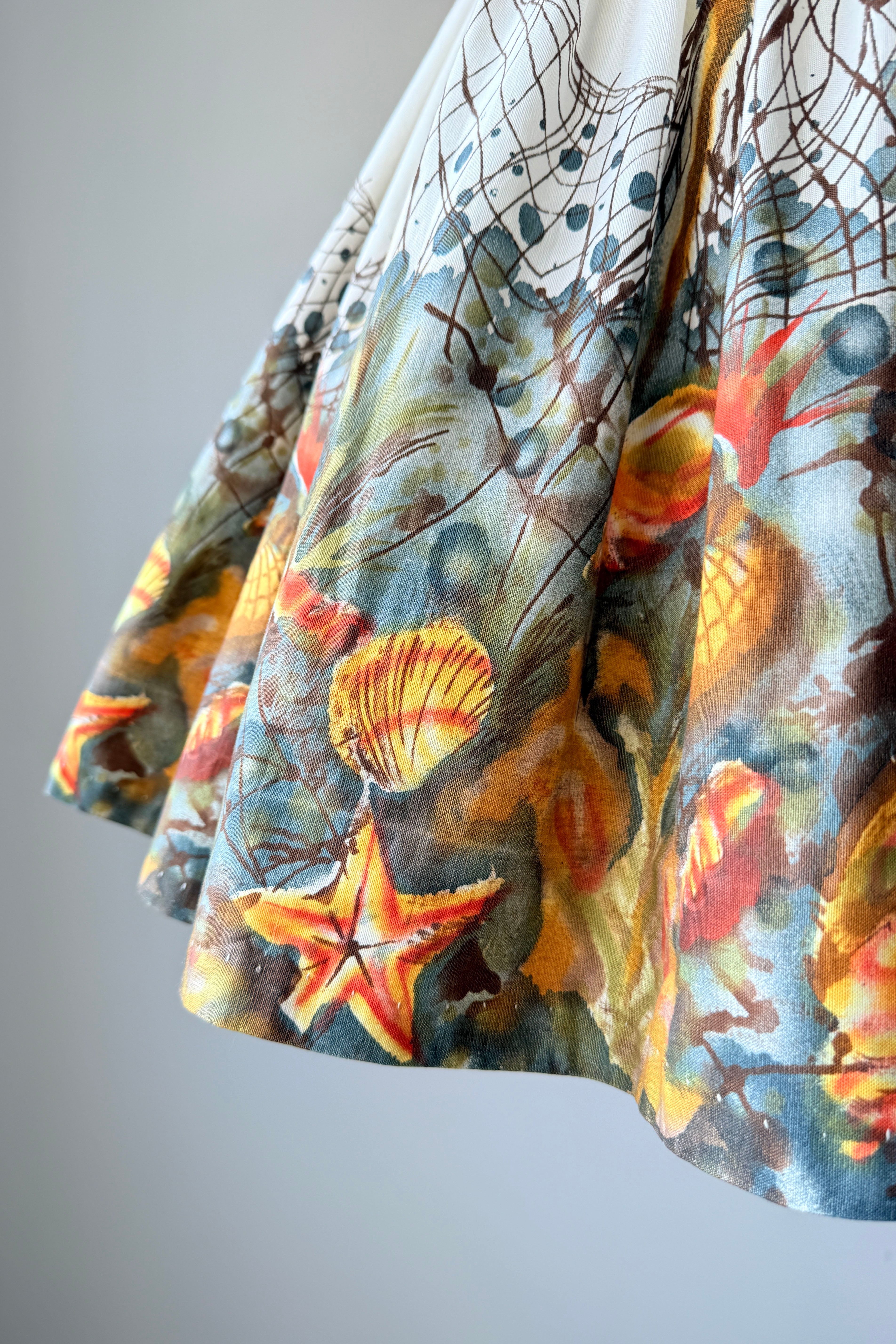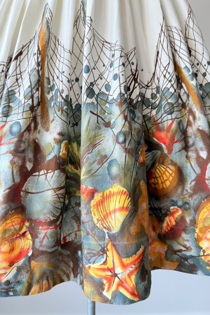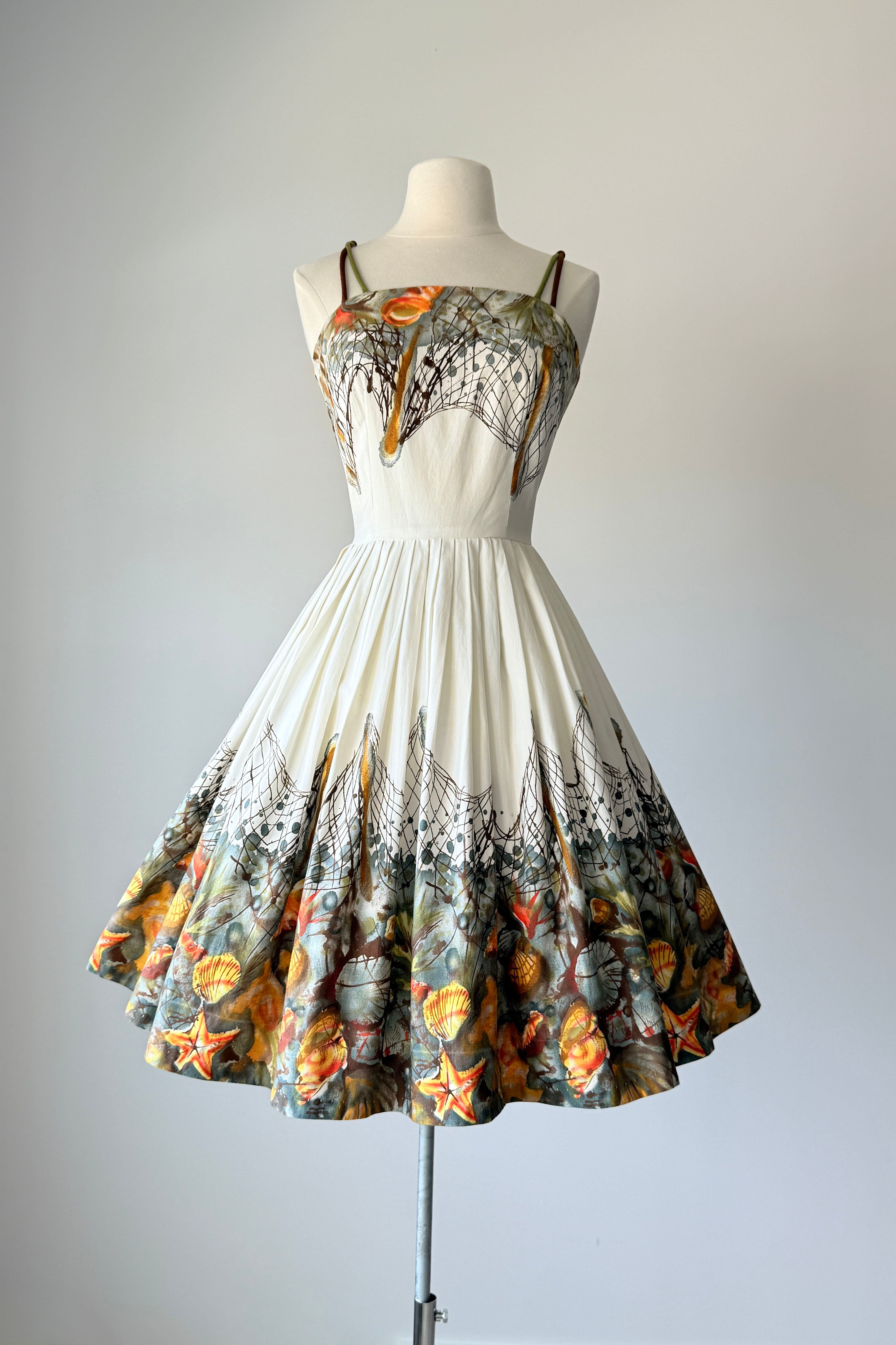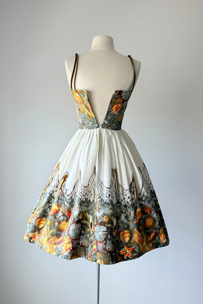 VINTAGE DRESS era: 1950sfabric: cottoncolor: ivory / seafoam / goldenrod / coral / brownfasteners: metal back zipperdesigner: n/a details:Rare and whimsical 1950s cotton sundress featuring an underwater-themed novelty print with sea life, coral, shells, and fishing nets in warm earthy tones and soft oceanic hues. Sweetheart neckline with double contrast straps in olive green and brown, fitted bodice with a dipped back, and full pleated skirt. Interior seams show 2” of extra bodice fabric that could allow for adjustment (see photo). condition:Very good. A faint fade line at hem where the dress was previously let down. Clean and freshly laundered. As with all vintage, please expect minor wear consistent with age. sizing:Best fits modern XXS (with room to let out) measurements (in inches):length: 38.5bodice: 15bust: 30waist: 23bodice seam allowance: 2" (can be let out for additional room at bust/waist) ref: 0460 | 2527