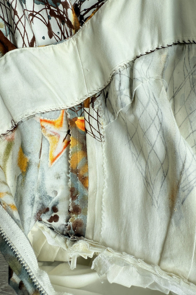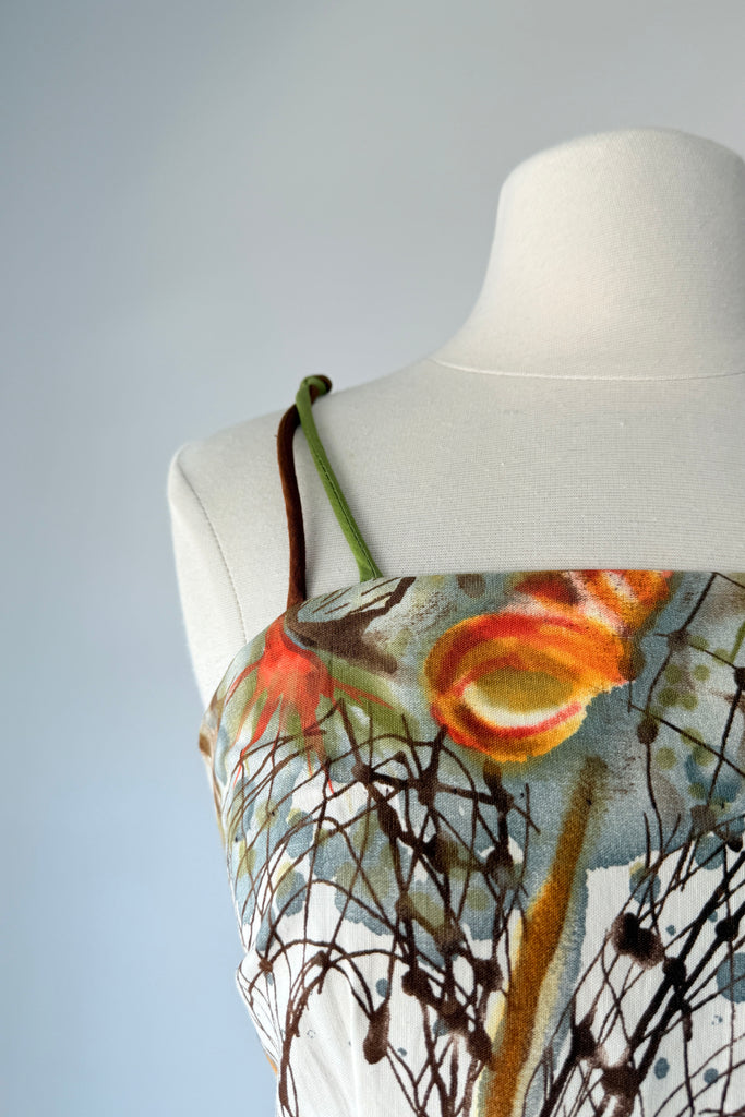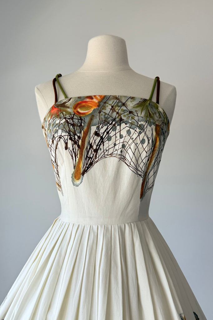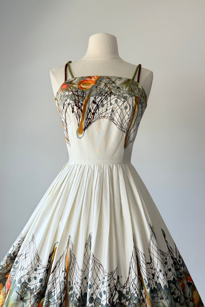 VINTAGE DRESS era: 1950sfabric: cottoncolor: ivory / seafoam / goldenrod / coral / brownfasteners: metal back zipperdesigner: n/a details:Rare and whimsical 1950s cotton sundress featuring an underwater-themed novelty print with sea life, coral, shells, and fishing nets in warm earthy tones and soft oceanic hues. Sweetheart neckline with double contrast straps in olive green and brown, fitted bodice with a dipped back, and full pleated skirt. Interior seams show 2” of extra bodice fabric that could allow for adjustment (see photo). condition:Very good. A faint fade line at hem where the dress was previously let down. Clean and freshly laundered. As with all vintage, please expect minor wear consistent with age. sizing:Best fits modern XXS (with room to let out) measurements (in inches):length: 38.5bodice: 15bust: 30waist: 23bodice seam allowance: 2" (can be let out for additional room at bust/waist) ref: 0460 | 2527