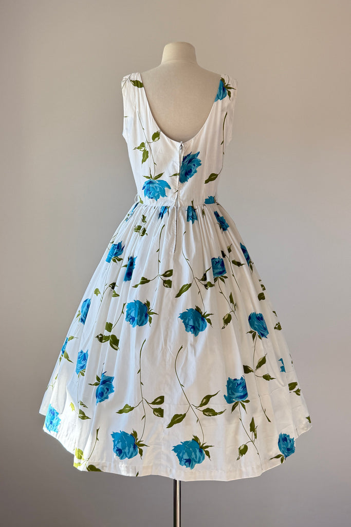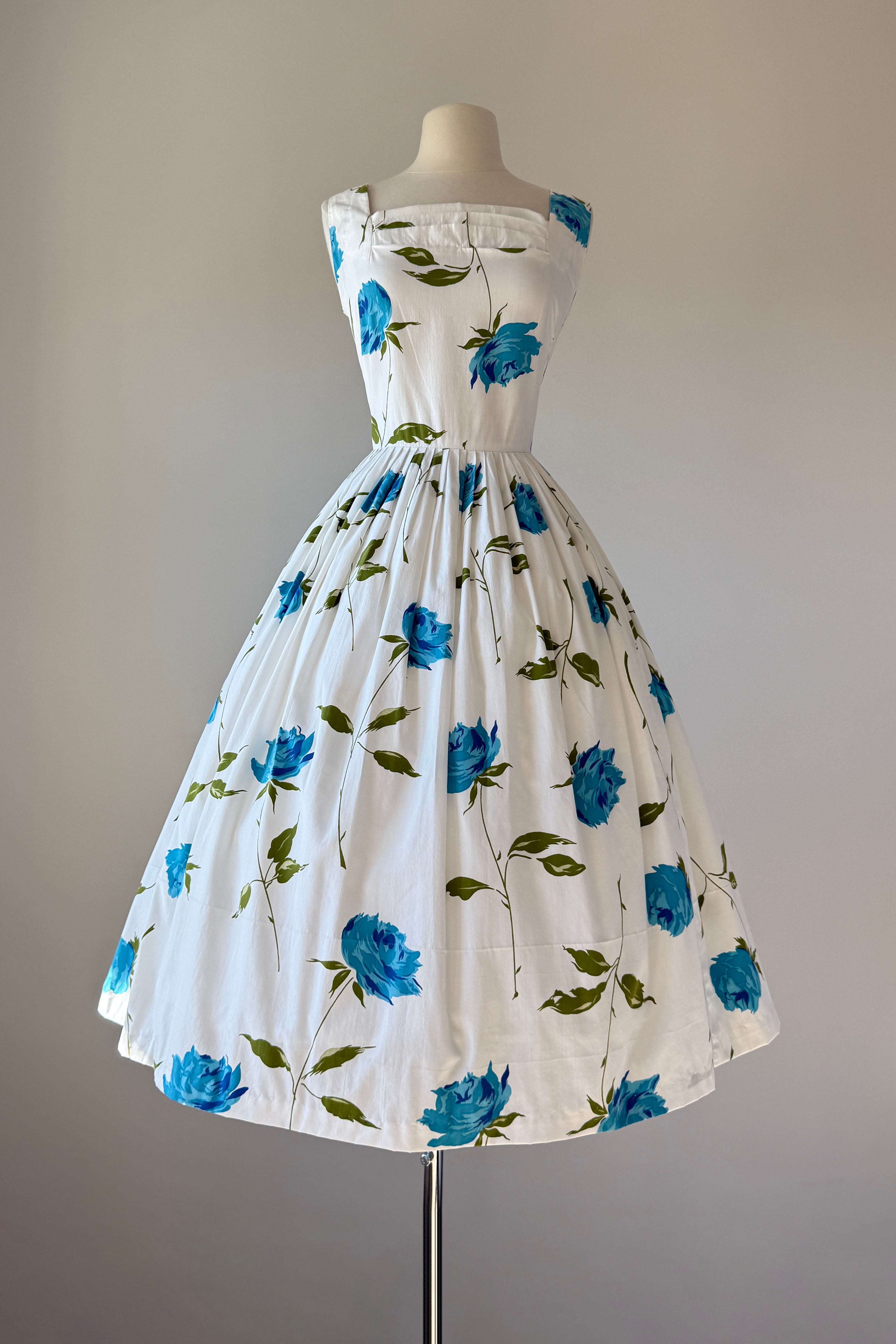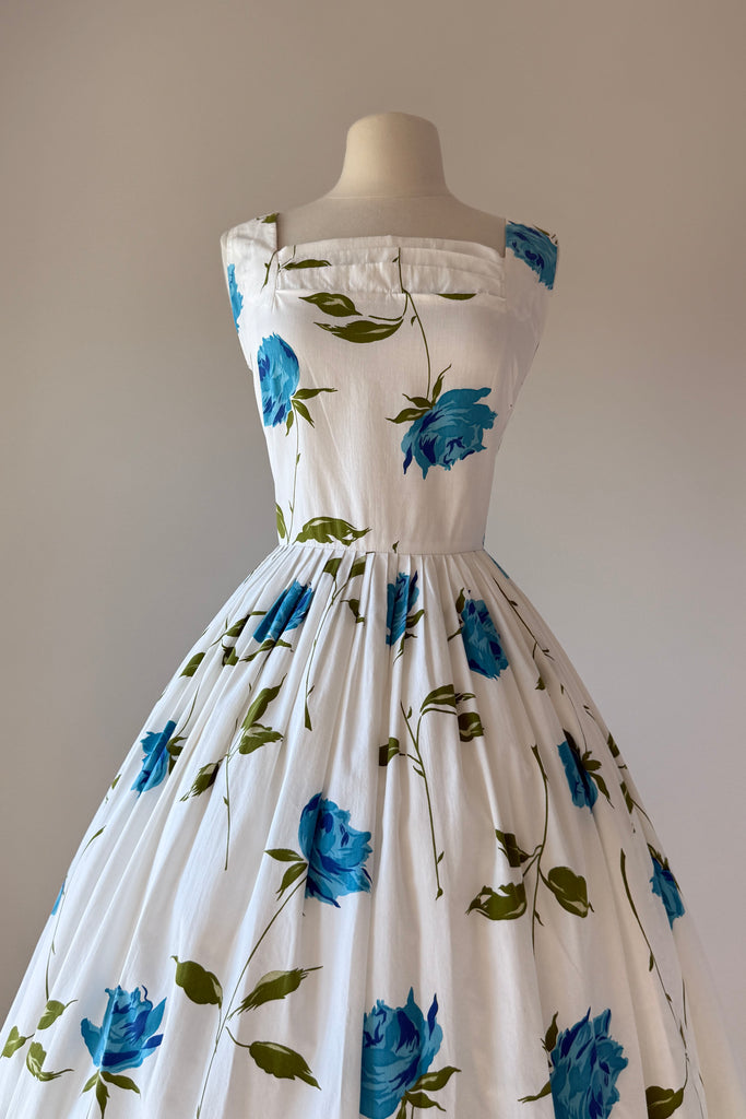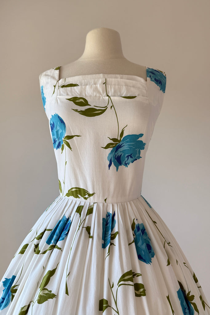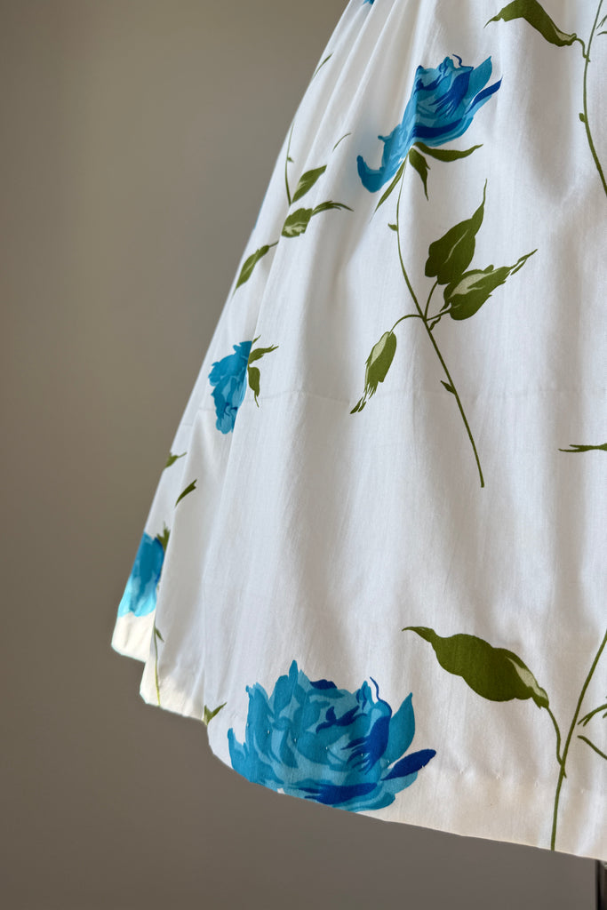 1950s cotton dress by Jerry Gilden for Spectator, featuring a blue rose print on crisp white cotton. The bodice has a squared neckline with subtle pleat detail, balanced by a full gathered skirt that falls beautifully from the fitted waist. Finished with a metal side zipper and 1" hem allowance; faint crease at hem where it’s been previously let out. Excellent condition. Best fits MEDIUMlength: 47"shoulder: 16.5"bust: 38"waist: 28" Ref 0661 | 2541