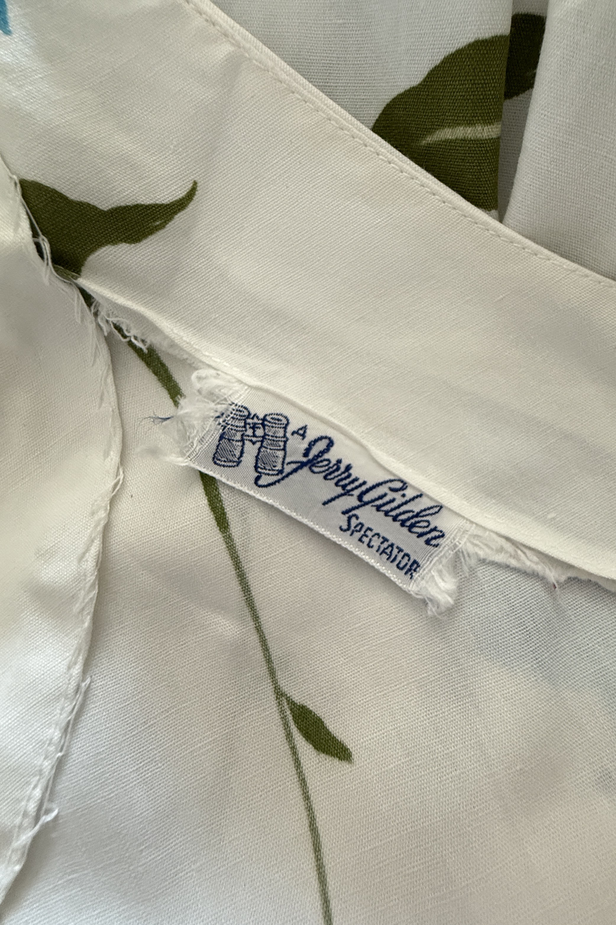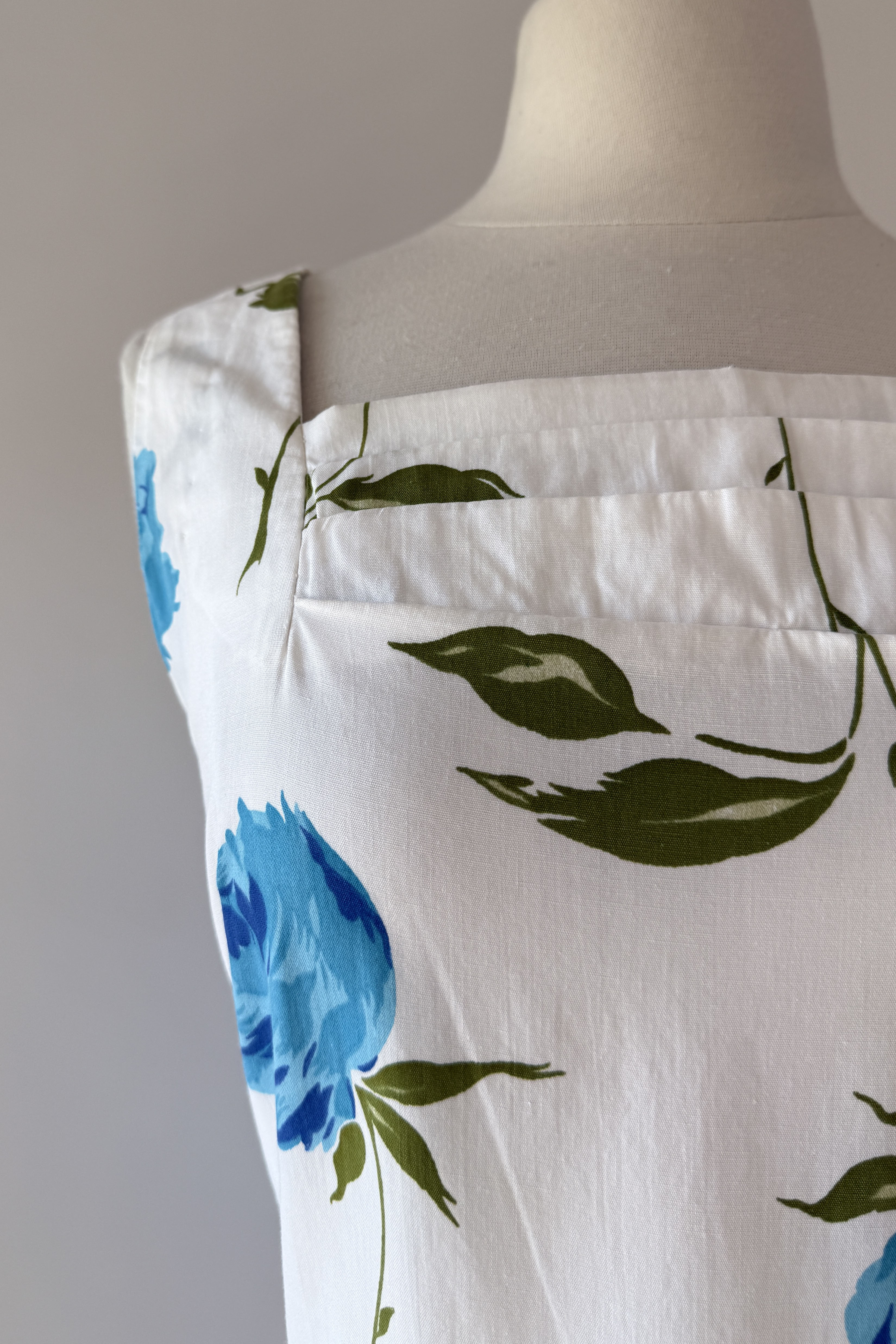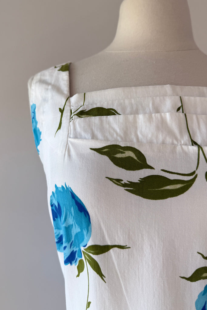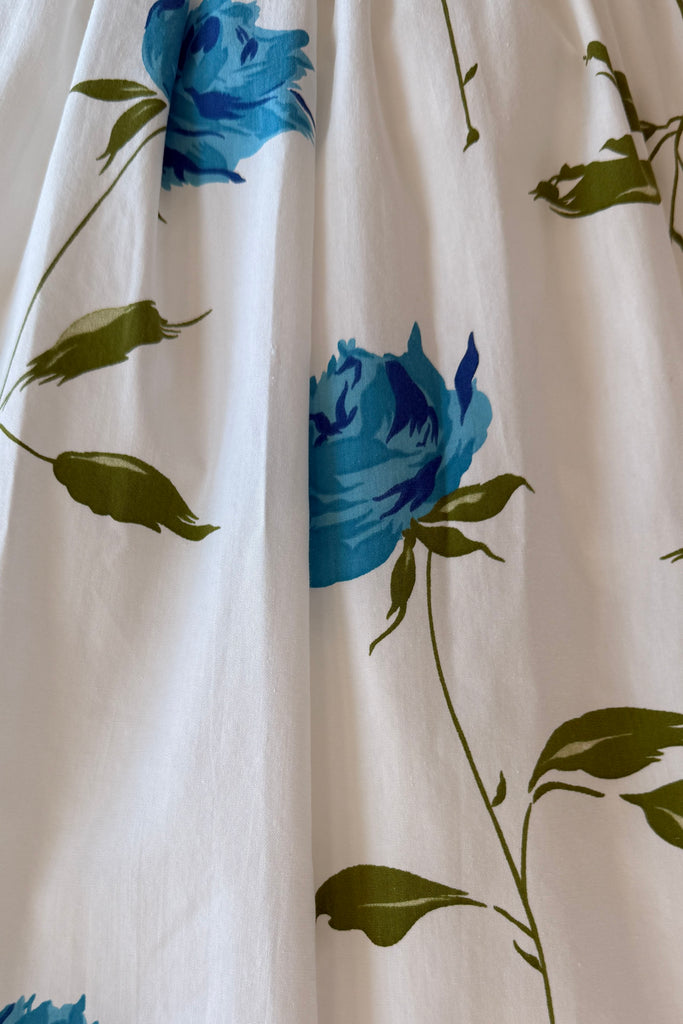 1950s cotton dress by Jerry Gilden for Spectator, featuring a blue rose print on crisp white cotton. The bodice has a squared neckline with subtle pleat detail, balanced by a full gathered skirt that falls beautifully from the fitted waist. Finished with a metal side zipper and 1" hem allowance; faint crease at hem where it’s been previously let out. Excellent condition. Best fits MEDIUMlength: 47"shoulder: 16.5"bust: 38"waist: 28" Ref 0661 | 2541