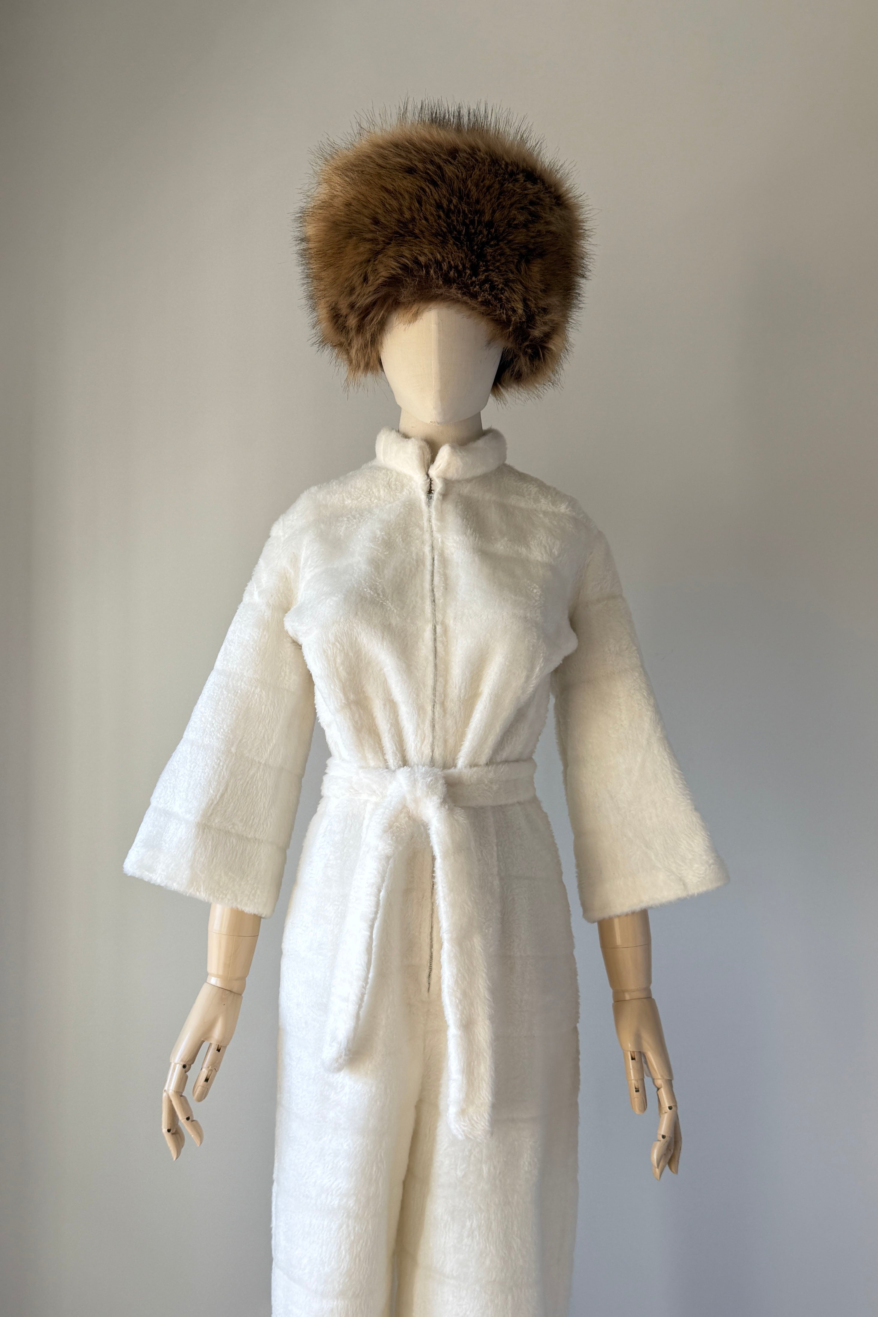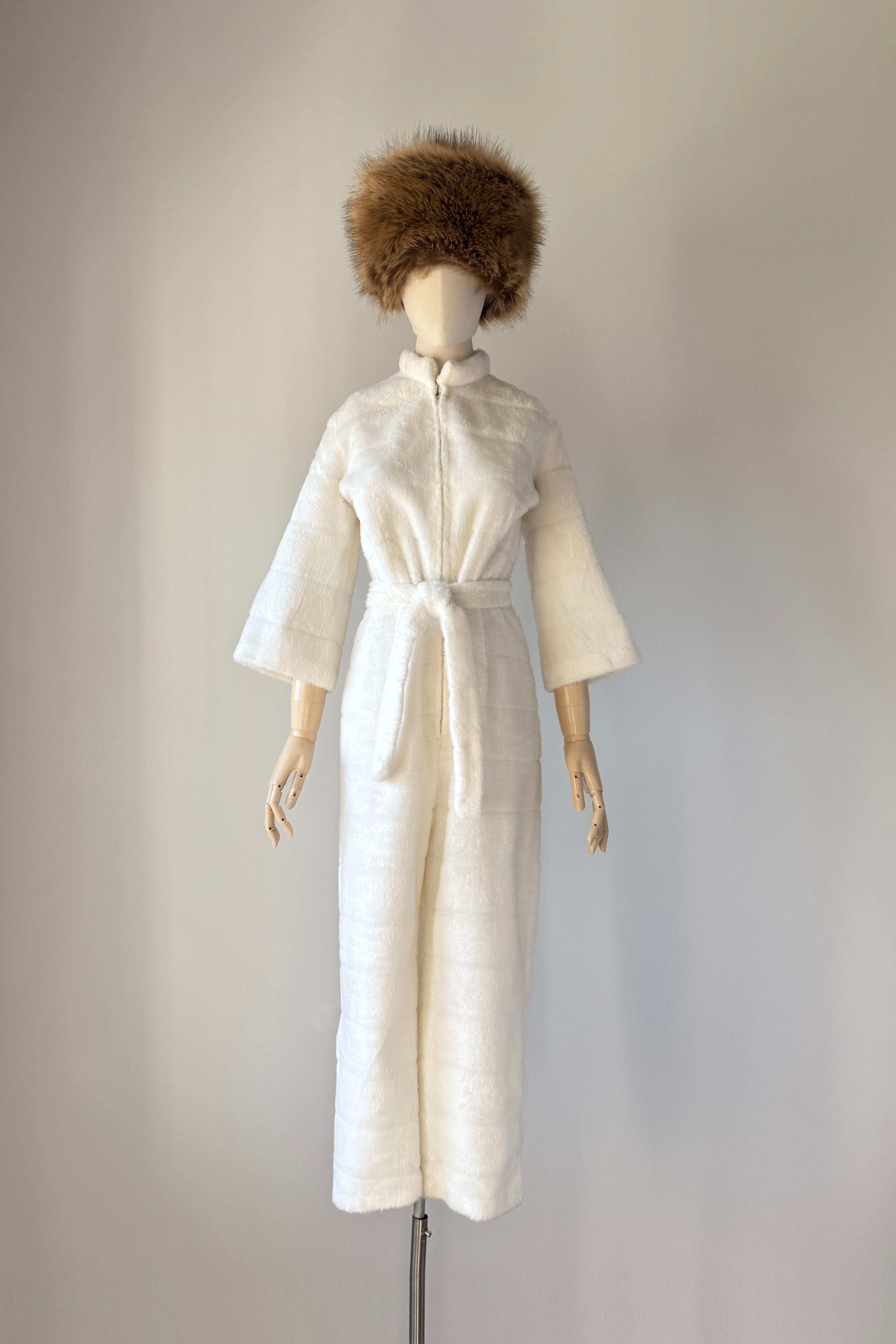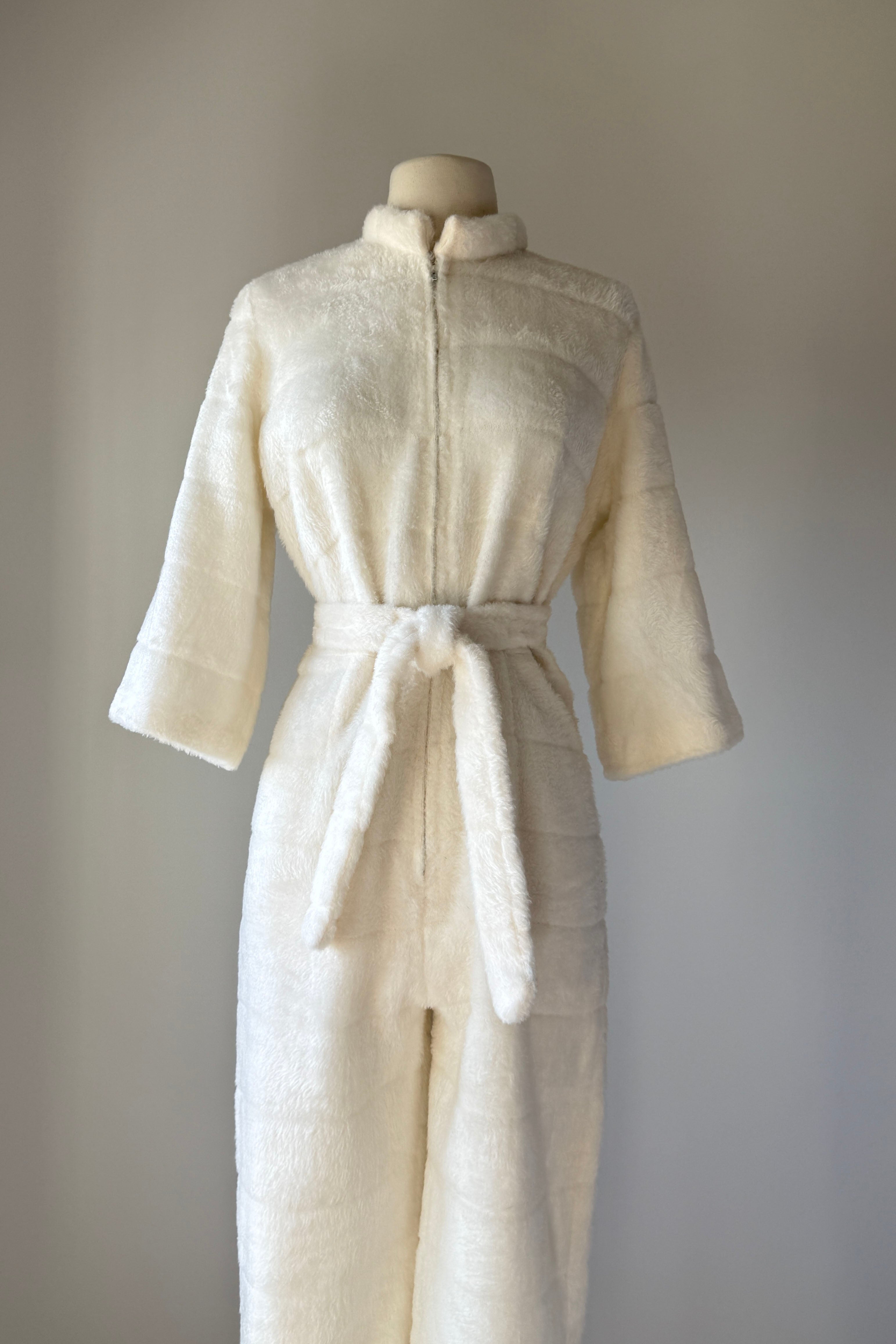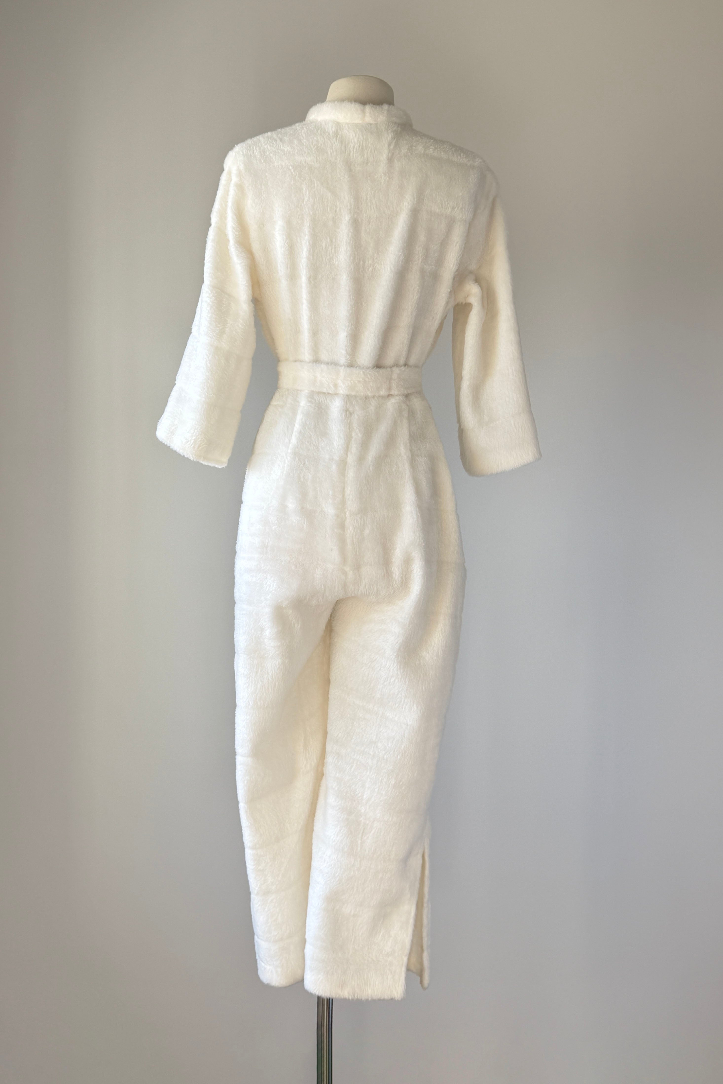 VINTAGE JUMPSUITThe cuddliest little snow bunny fleece loungewear jumpsuit by Frederick's of Hollywood's rare 1950's label. Slits at each side of ankle, detachable belt, cropped bell sleeves, metal front zipper.Excellent condition. Fits like MEDIUMLength 54Bodice 17Shoulder 17Sleeve 17Bust 40Waist 32Hip 40Rise 14Inseam 22As with all vintage, please expect wear consistent with age. All sales are final. No order cancellations.0735 | 2550