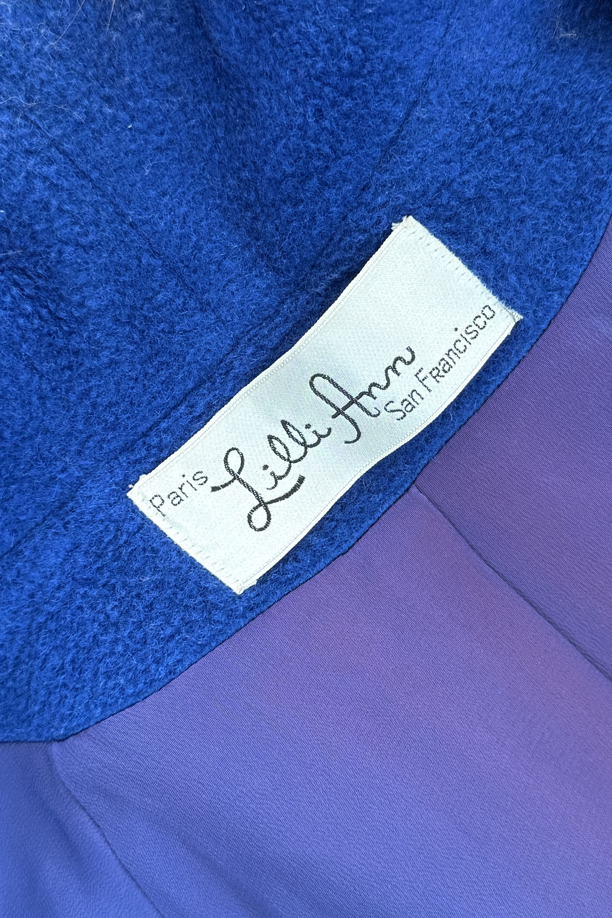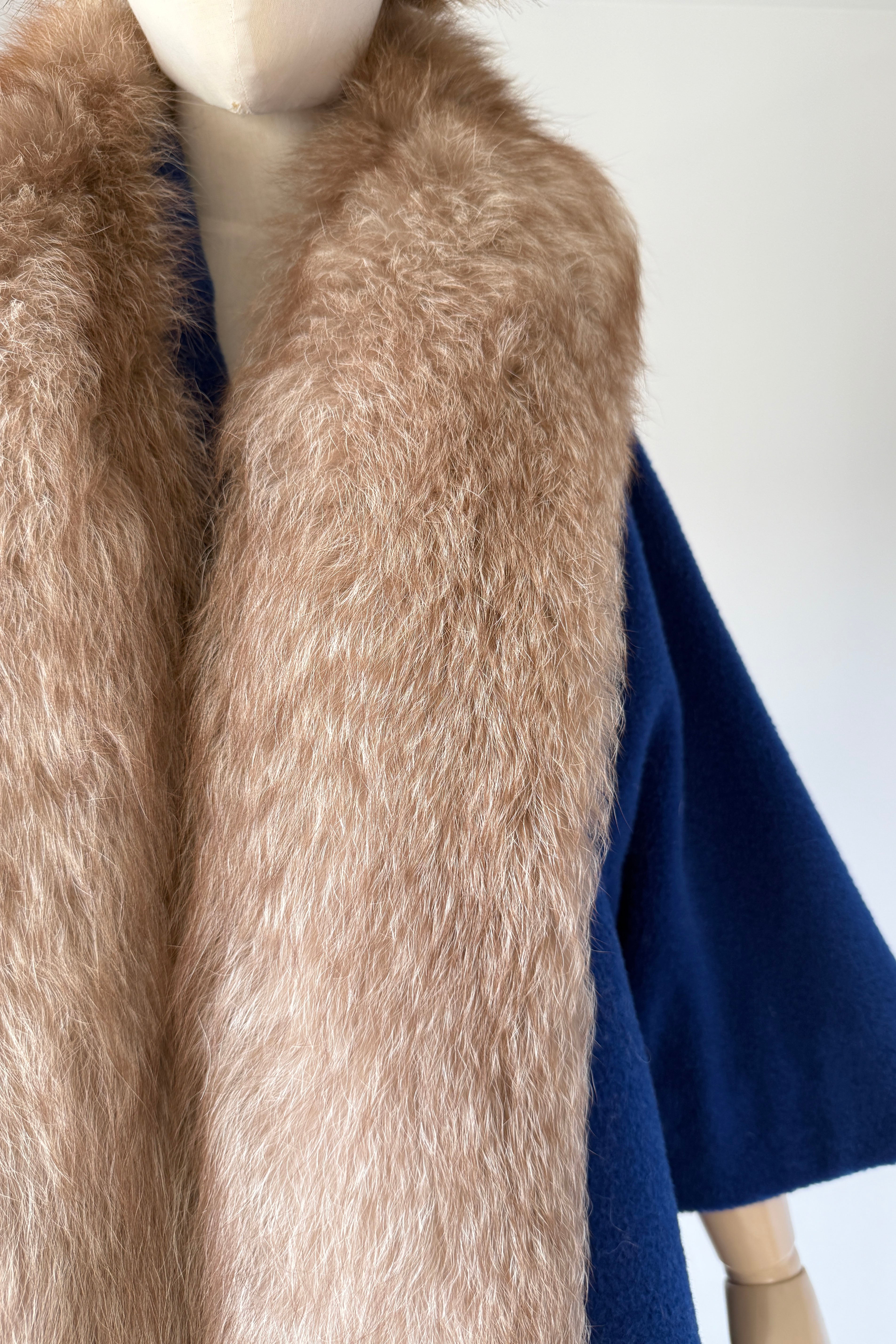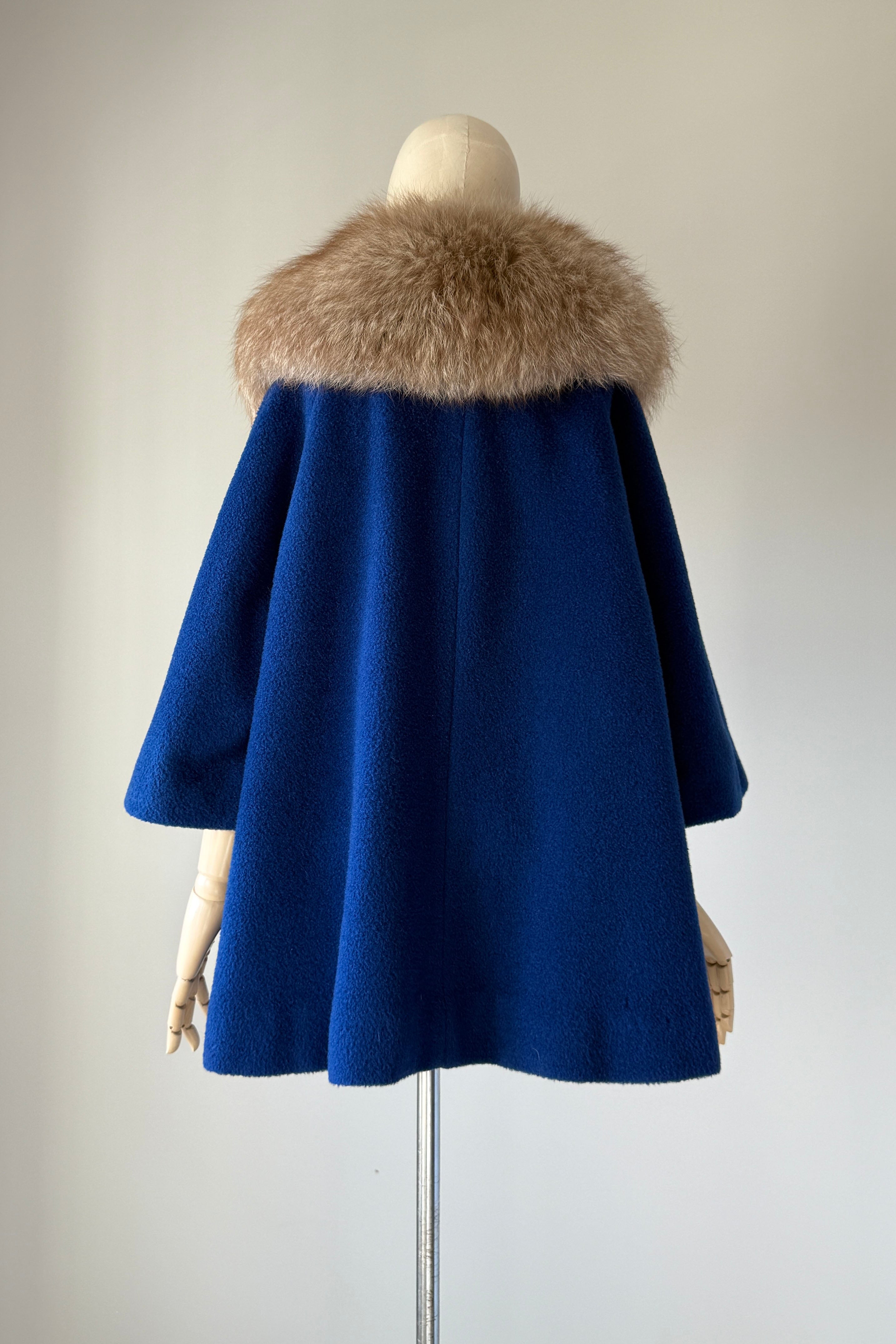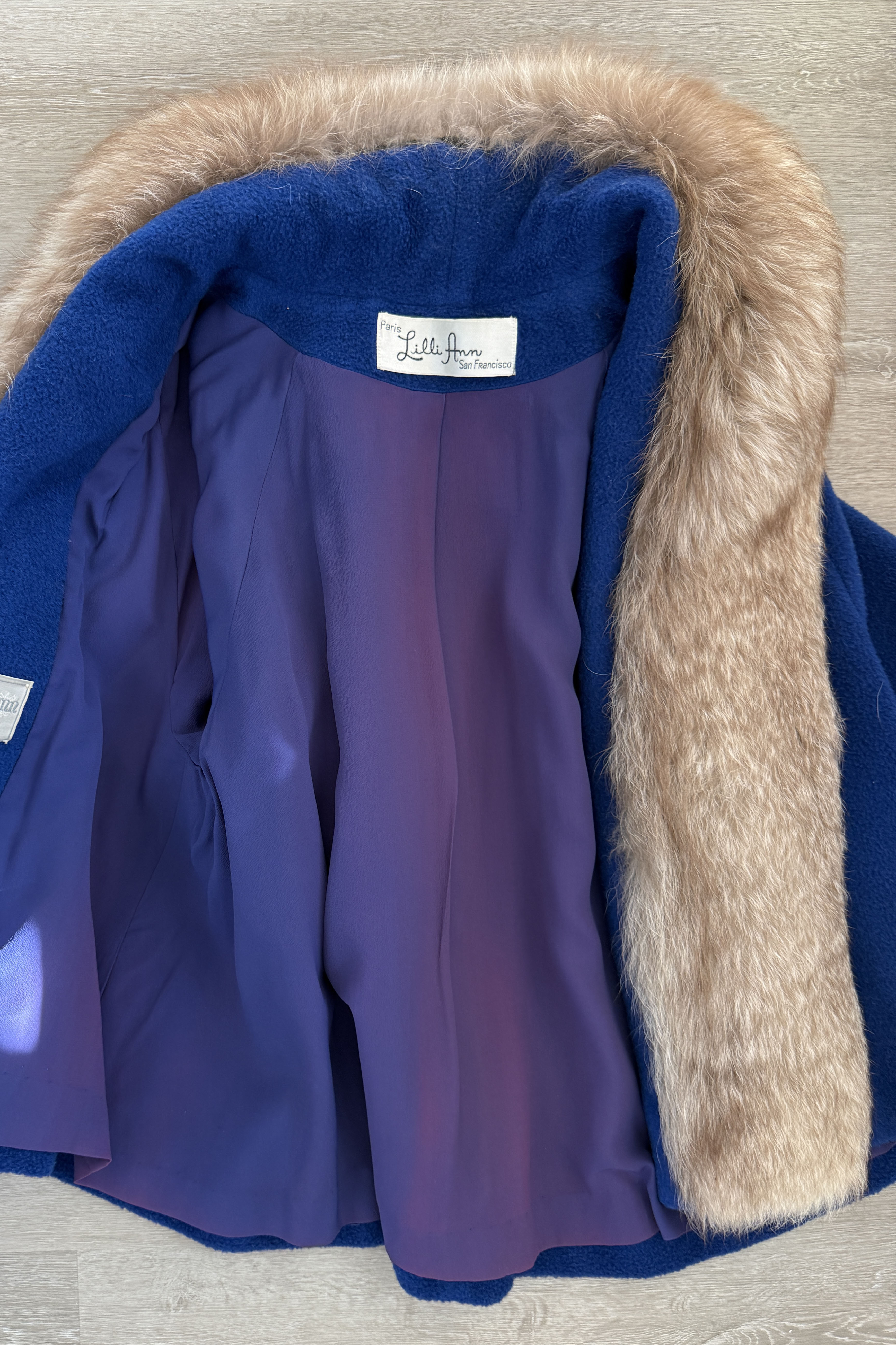 VINTAGE WOOL + FOX FUR COAT BY LILLI ANN1960s cobalt blue wool + fox fur trim coat by Lilli Ann. Rayon crepe lining, cropped sleeves, swingy open cut. Made with Forstmann Virgin Wool.Faint color variation on lining otherwise - excellent condition. Fits like S/M/LLength 27Shoulders 16Bust 54As with all vintage, please expect wear consistent with age. All sales are final. No order cancellations.0712 | 2548