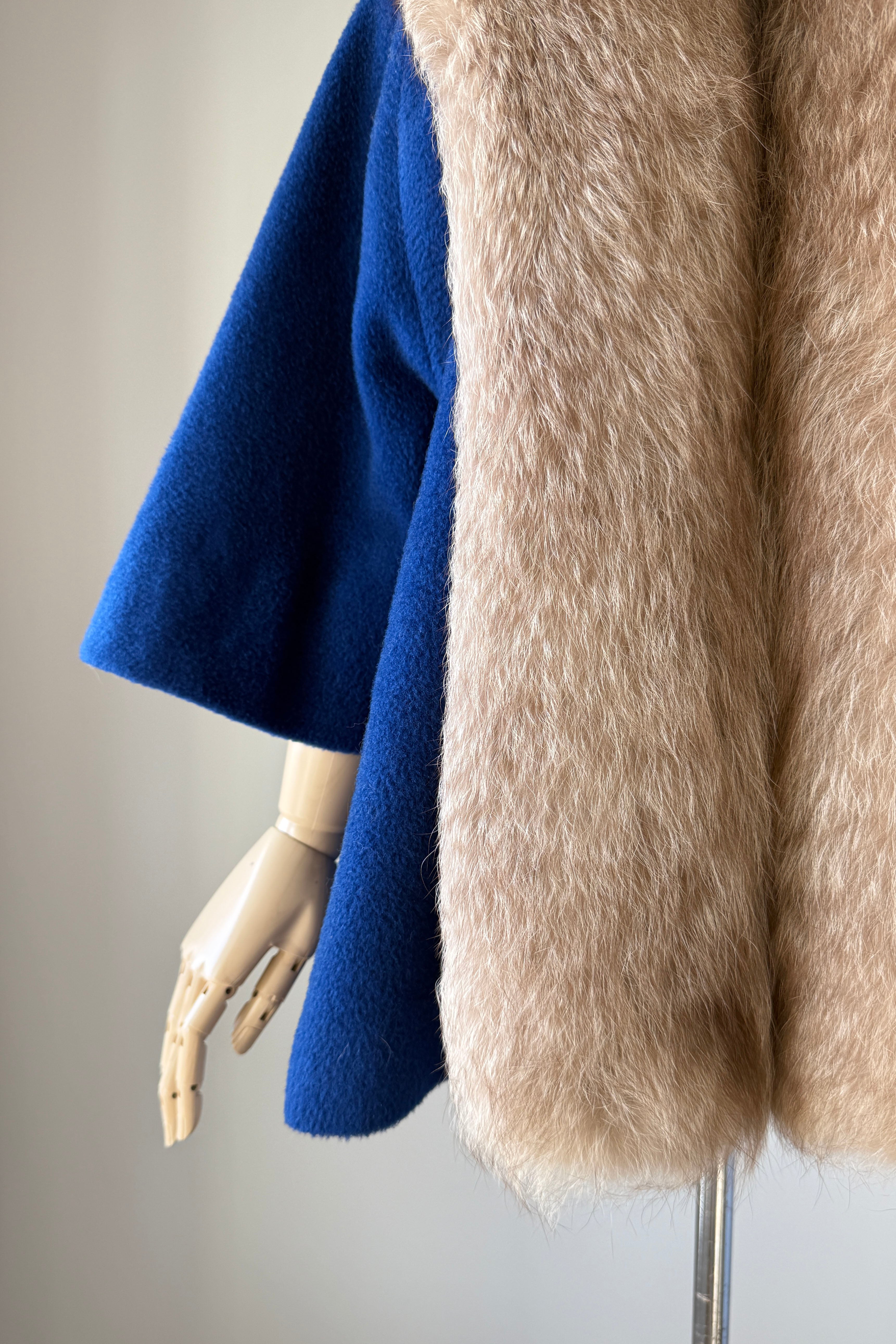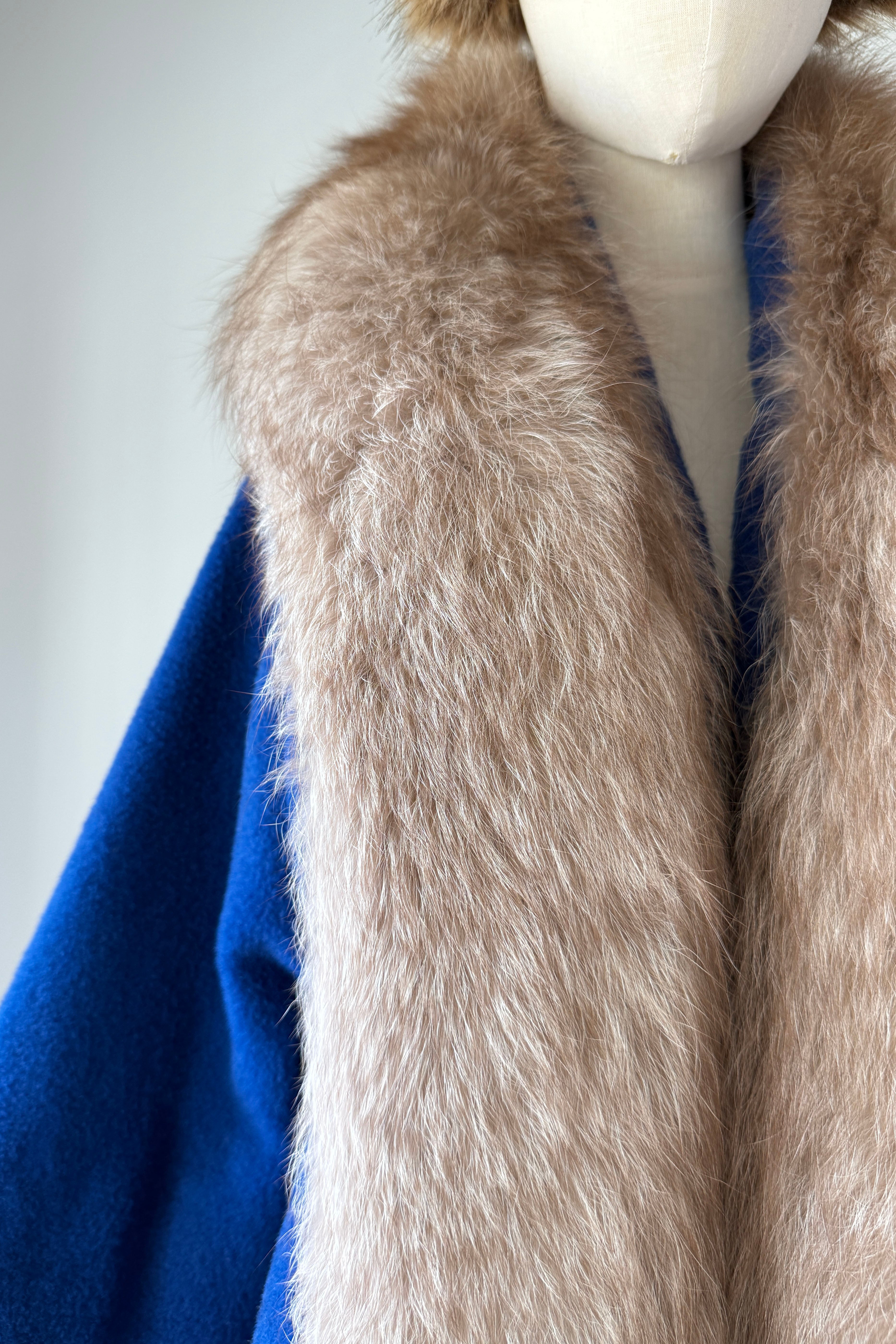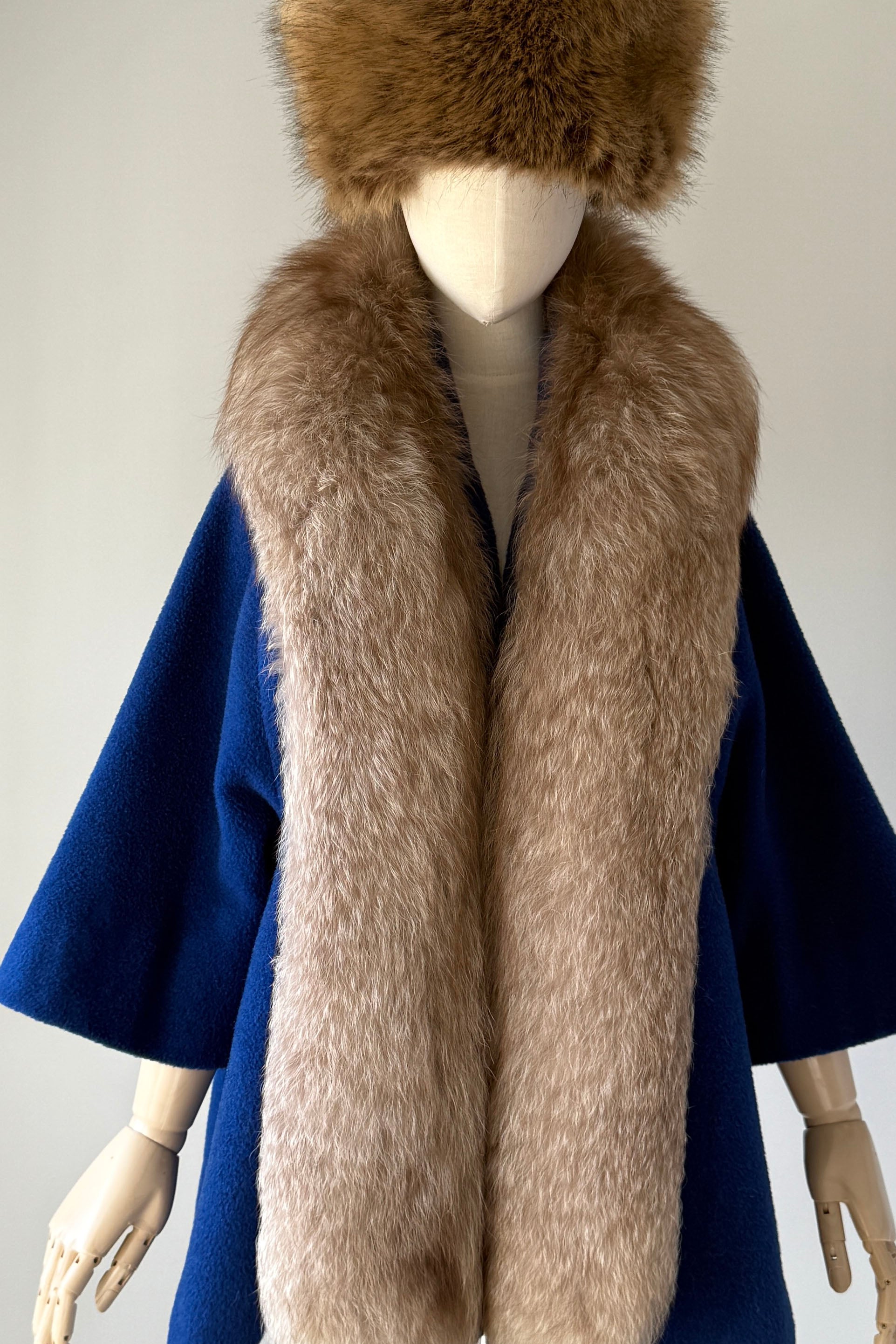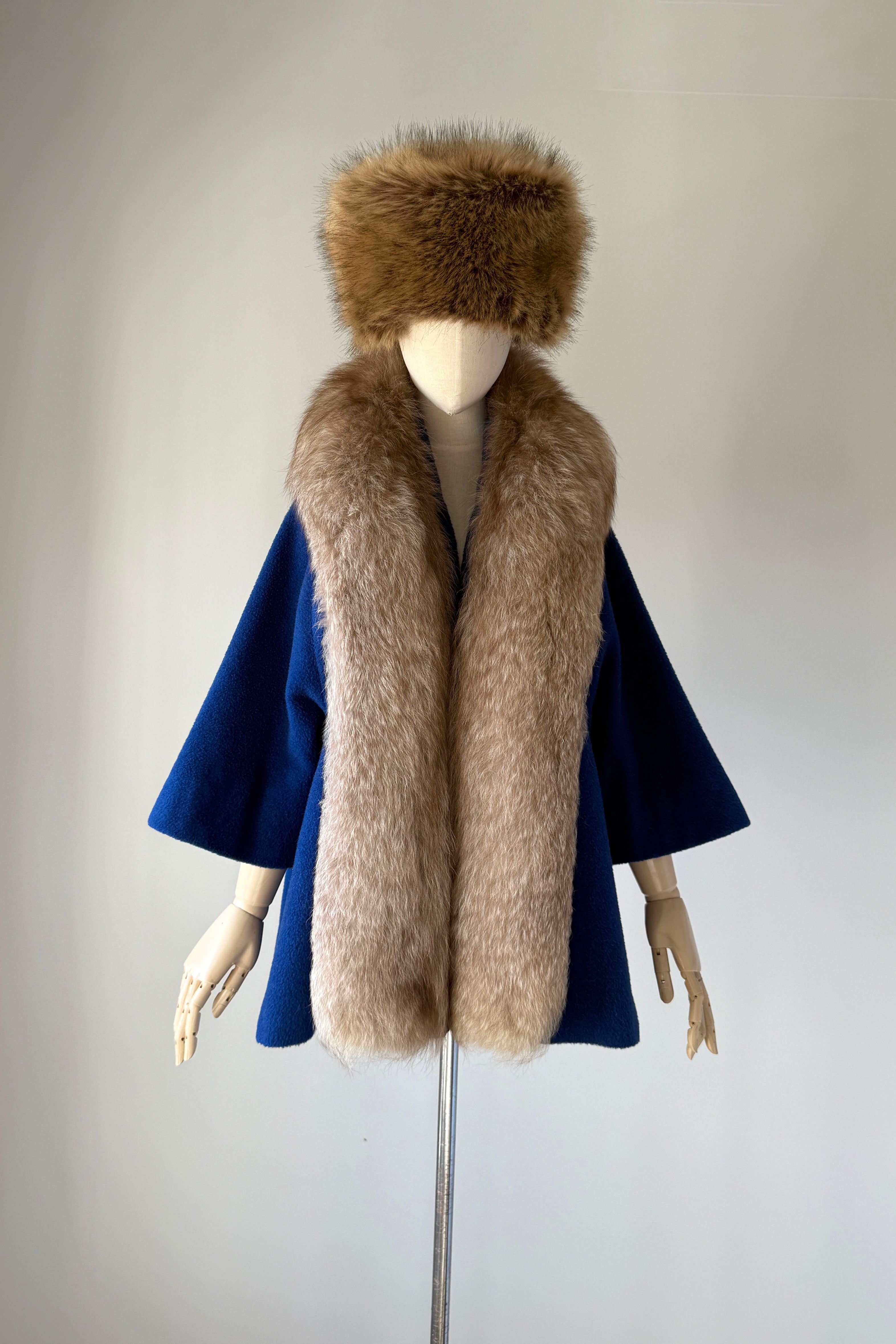 VINTAGE WOOL + FOX FUR COAT BY LILLI ANN1960s cobalt blue wool + fox fur trim coat by Lilli Ann. Rayon crepe lining, cropped sleeves, swingy open cut. Made with Forstmann Virgin Wool.Faint color variation on lining otherwise - excellent condition. Fits like S/M/LLength 27Shoulders 16Bust 54As with all vintage, please expect wear consistent with age. All sales are final. No order cancellations.0712 | 2548