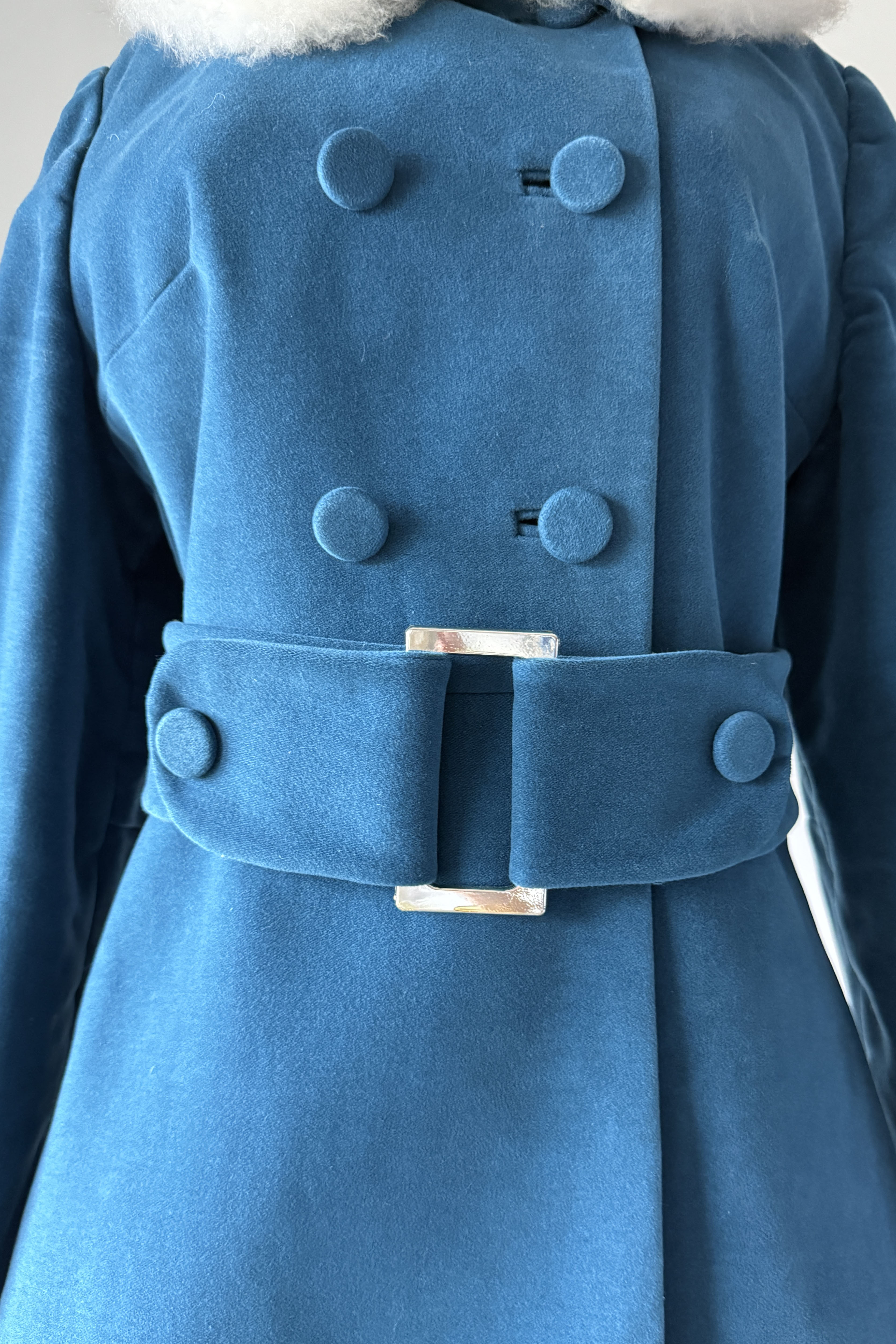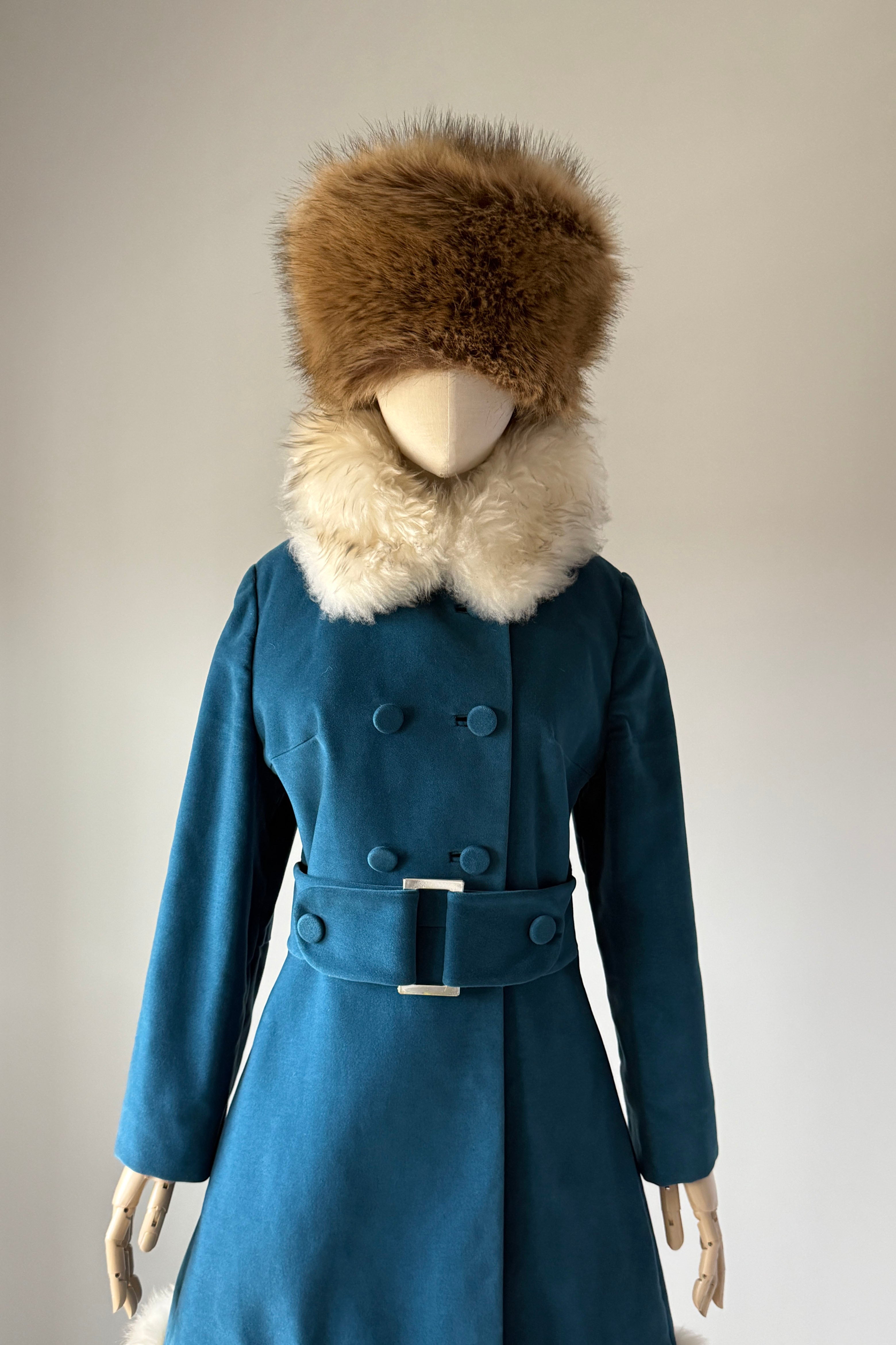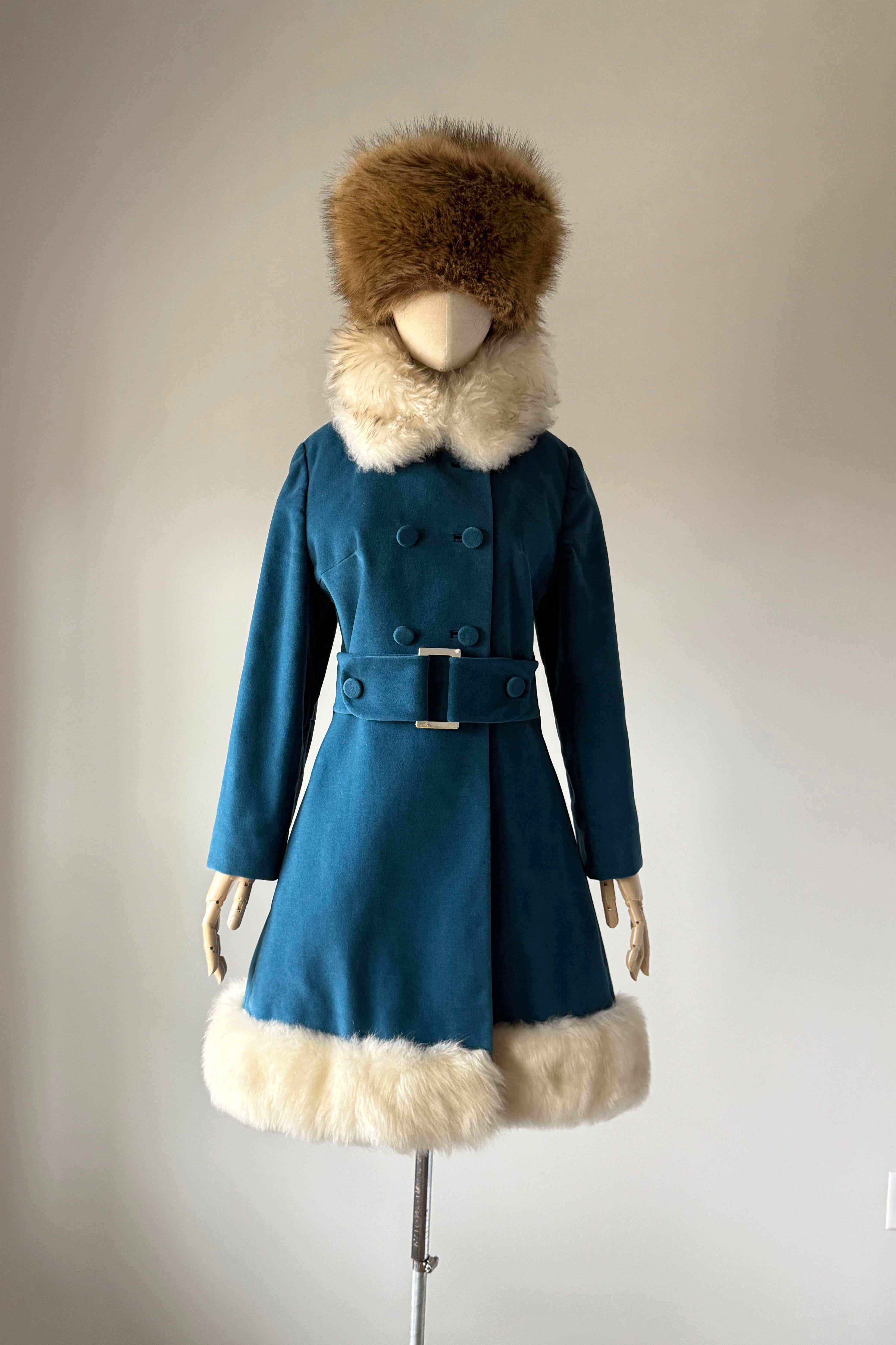 VINTAGE VELVETEEN COATDarling 1960s blue cotton velveteen/velour, faux fur, button closure, besom pockets. Snap closure belt with silver buckle. By Main Place.Excellent condition. Fits like S/MLength 36Bodice 16Shoulder 17Sleeve 22Bust 40Waist 34Hip 48As with all vintage, please expect wear consistent with age. All sales are final. No order cancellations.0728 | 2549