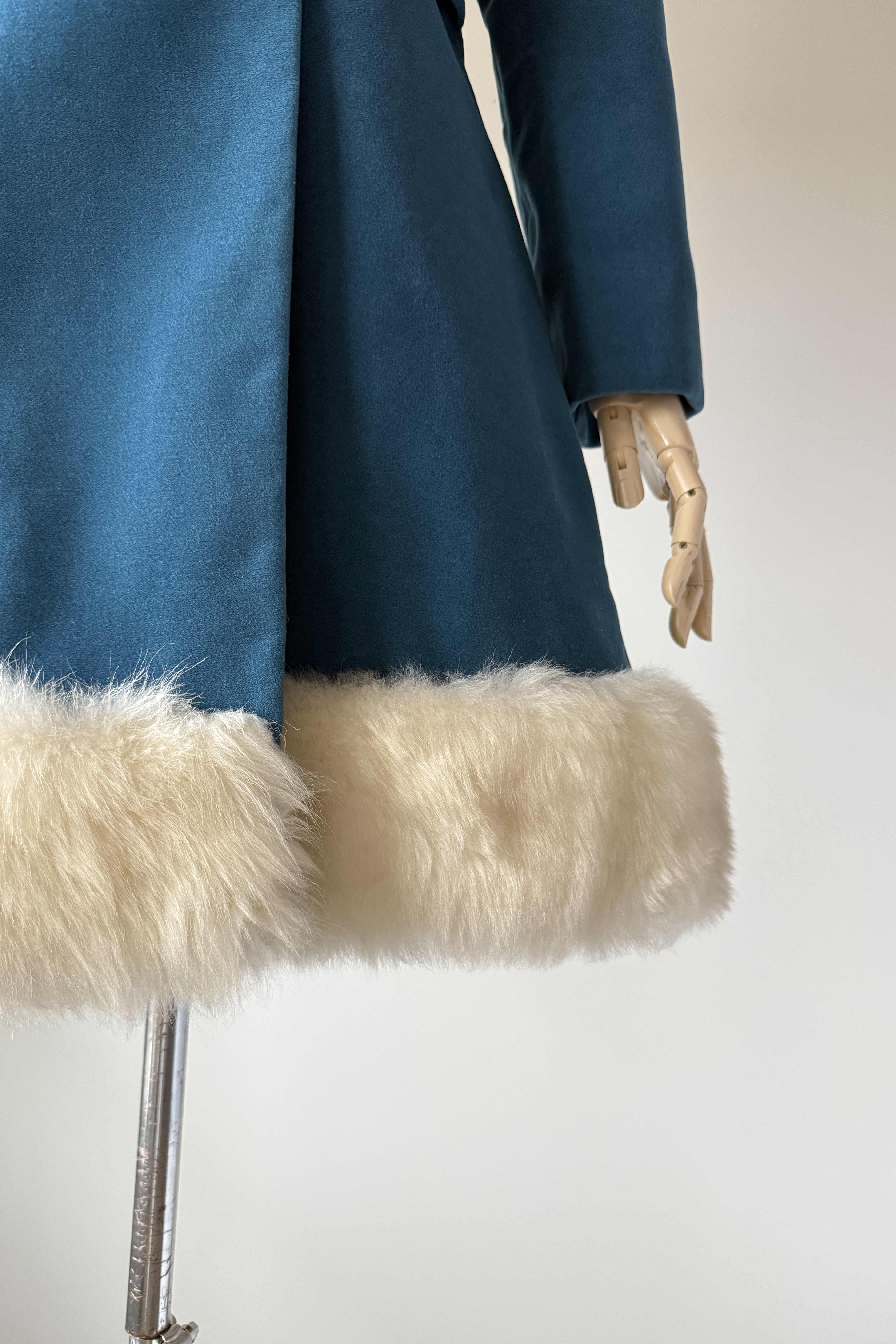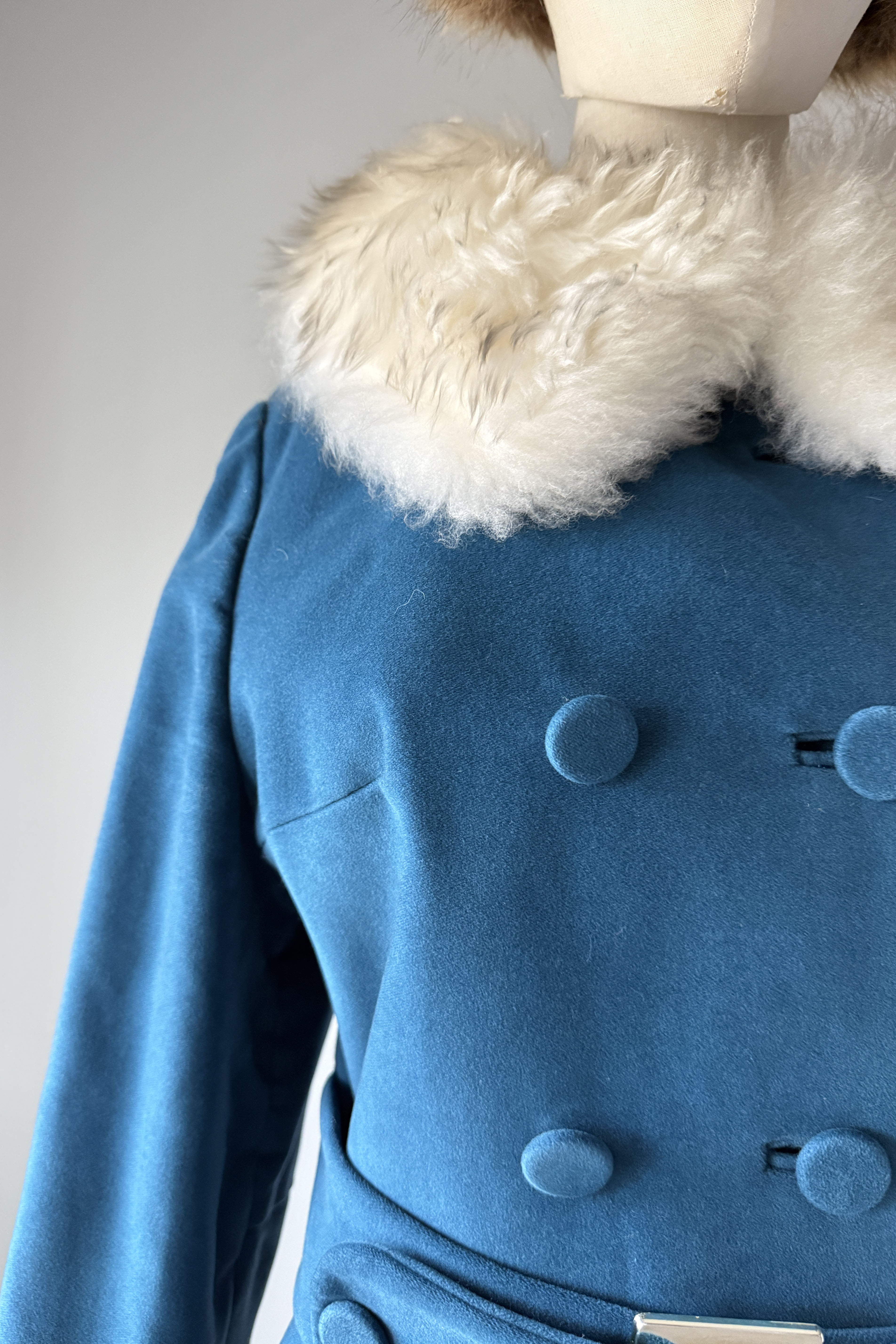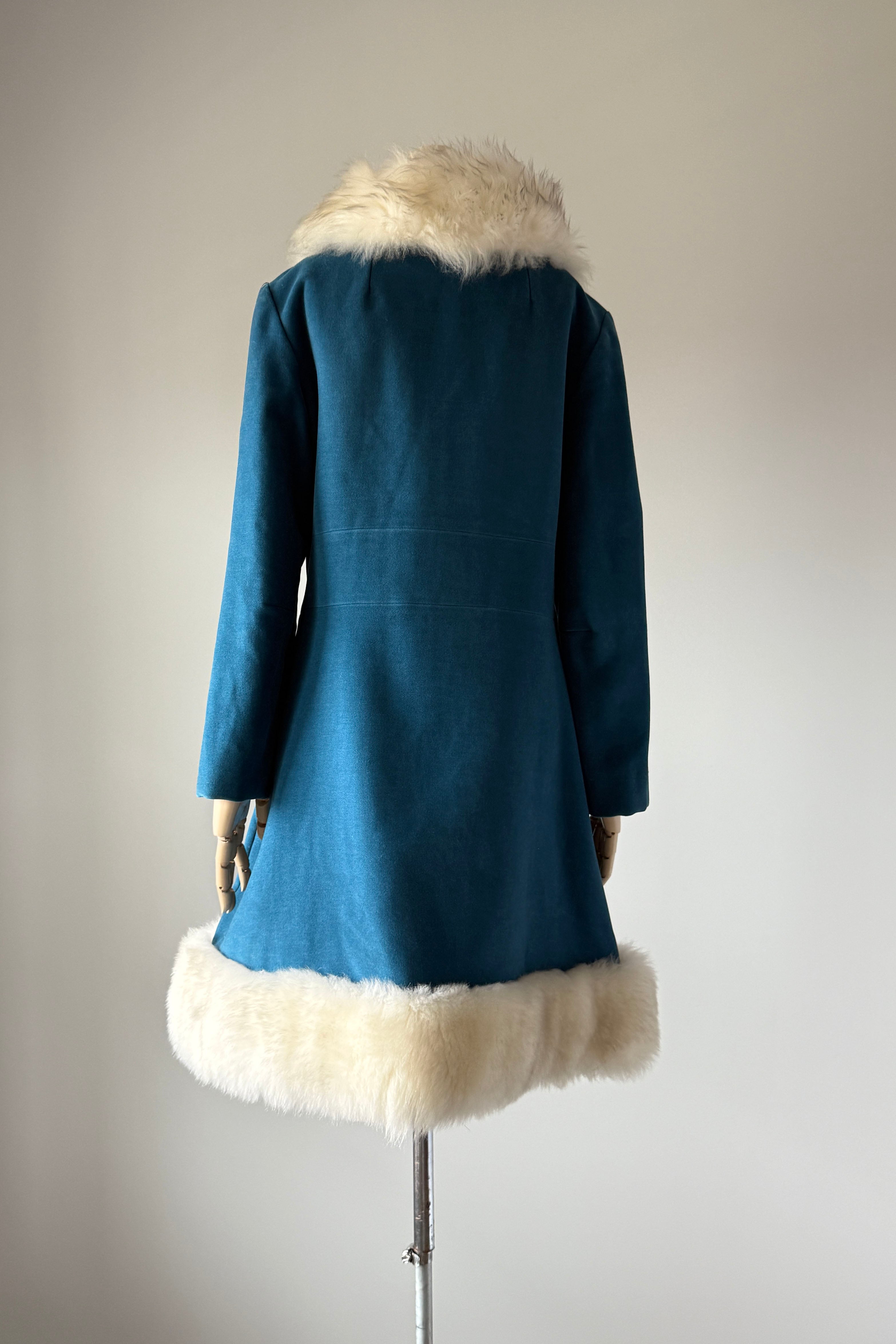 VINTAGE VELVETEEN COATDarling 1960s blue cotton velveteen/velour, faux fur, button closure, besom pockets. Snap closure belt with silver buckle. By Main Place.Excellent condition. Fits like S/MLength 36Bodice 16Shoulder 17Sleeve 22Bust 40Waist 34Hip 48As with all vintage, please expect wear consistent with age. All sales are final. No order cancellations.0728 | 2549