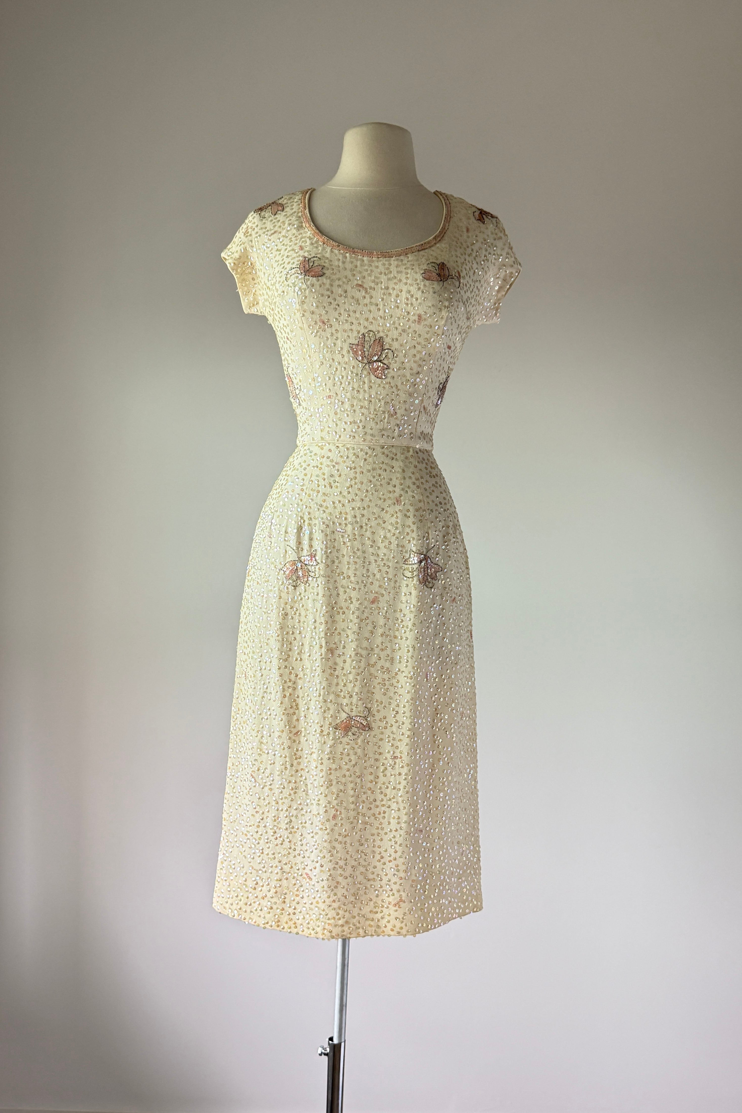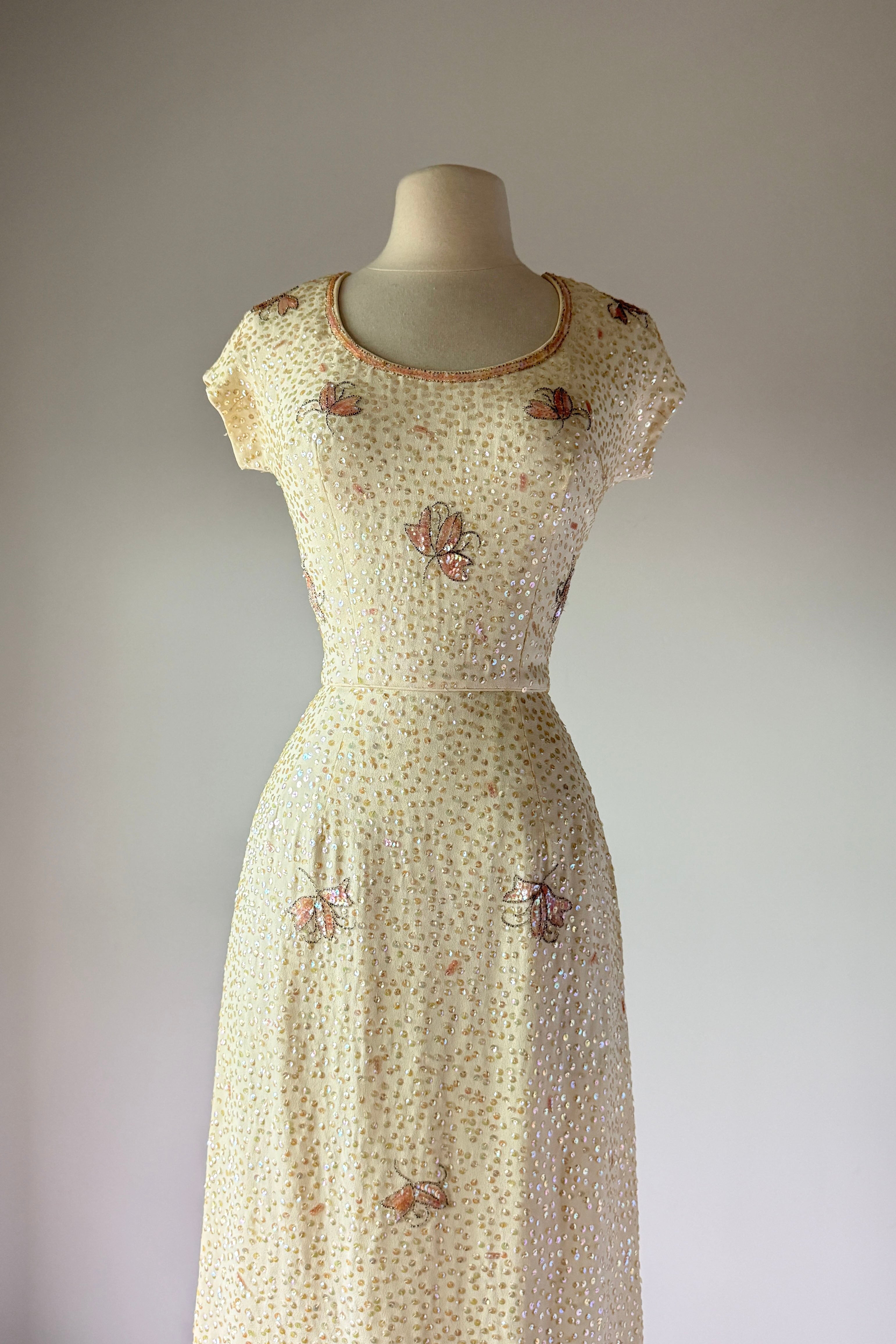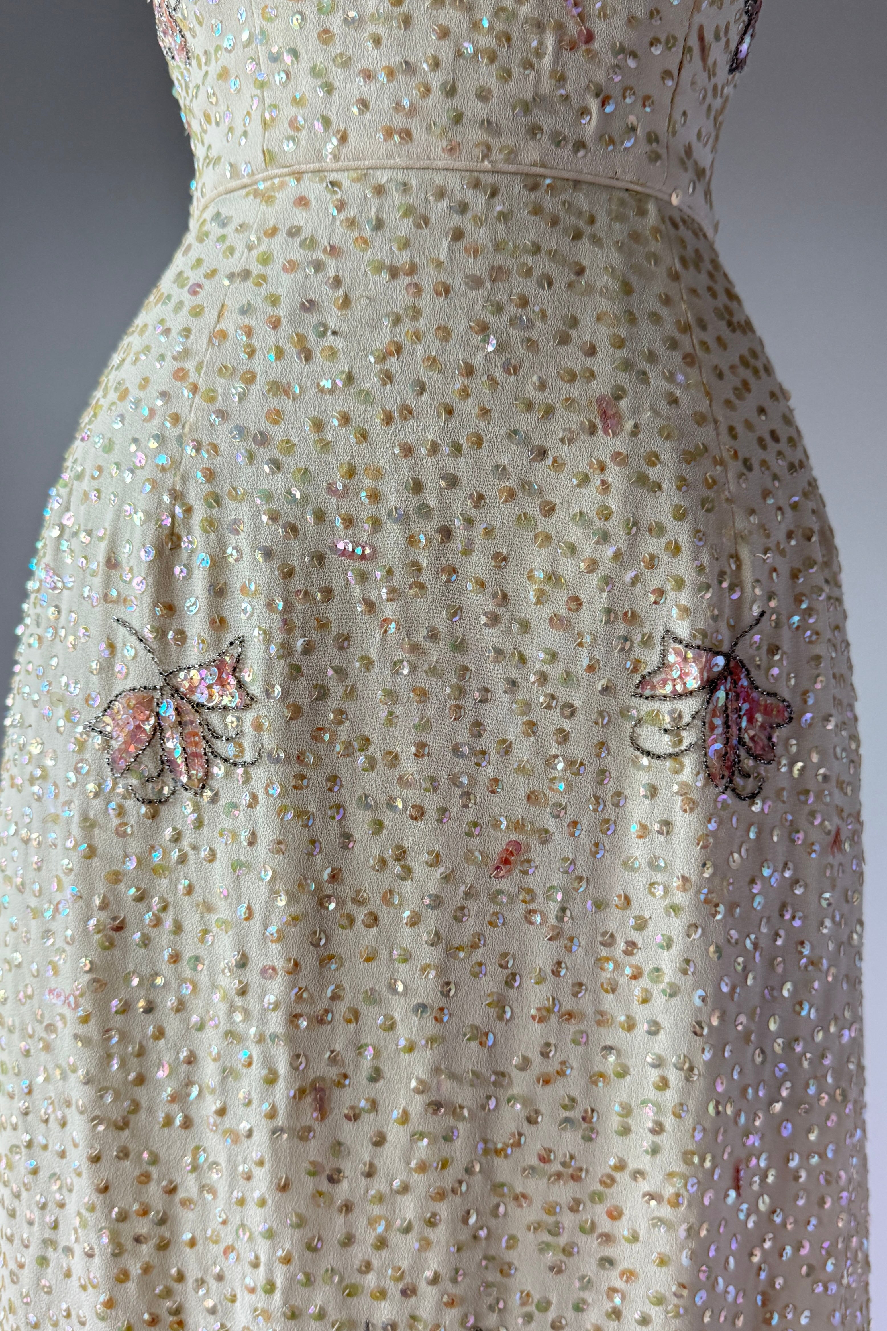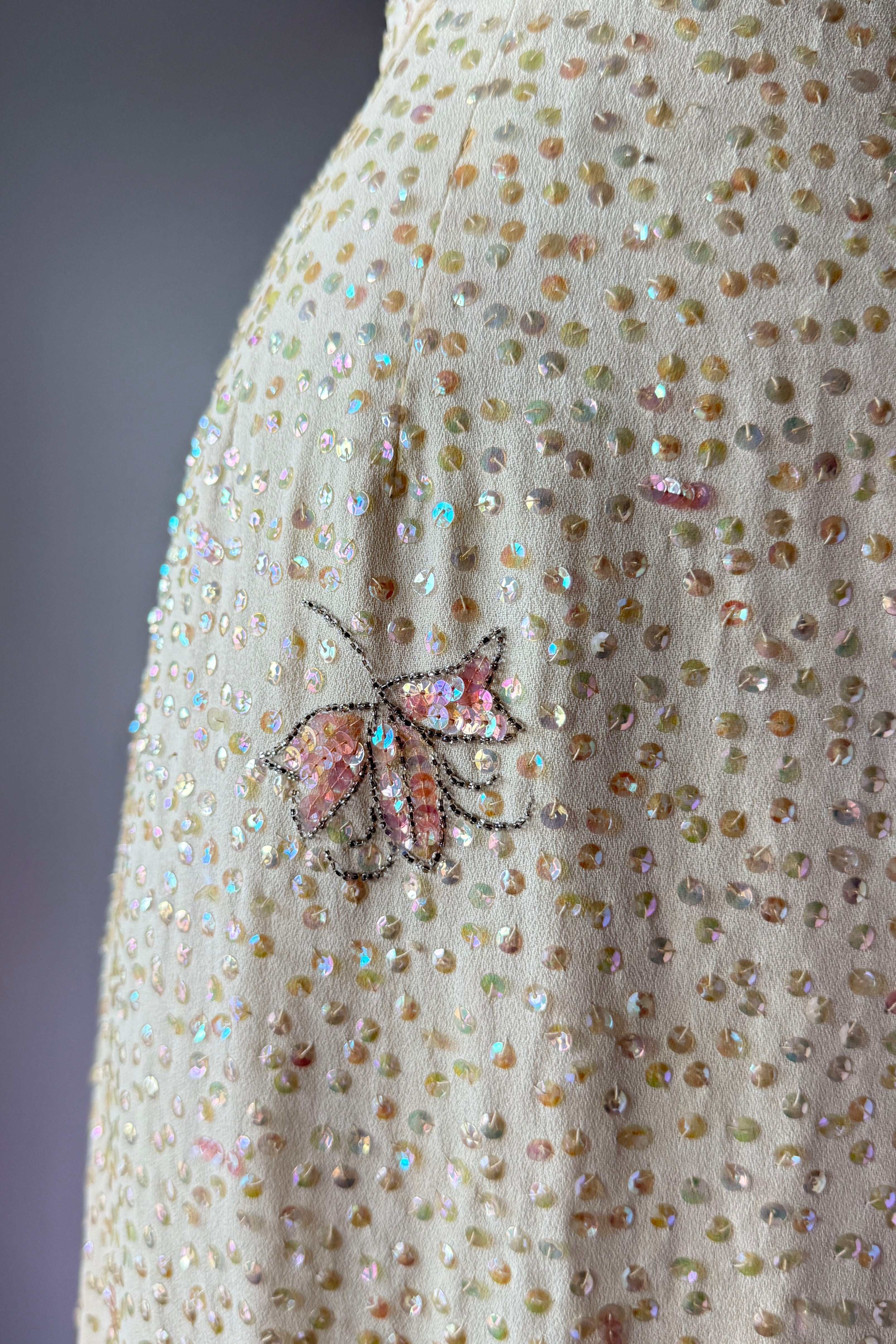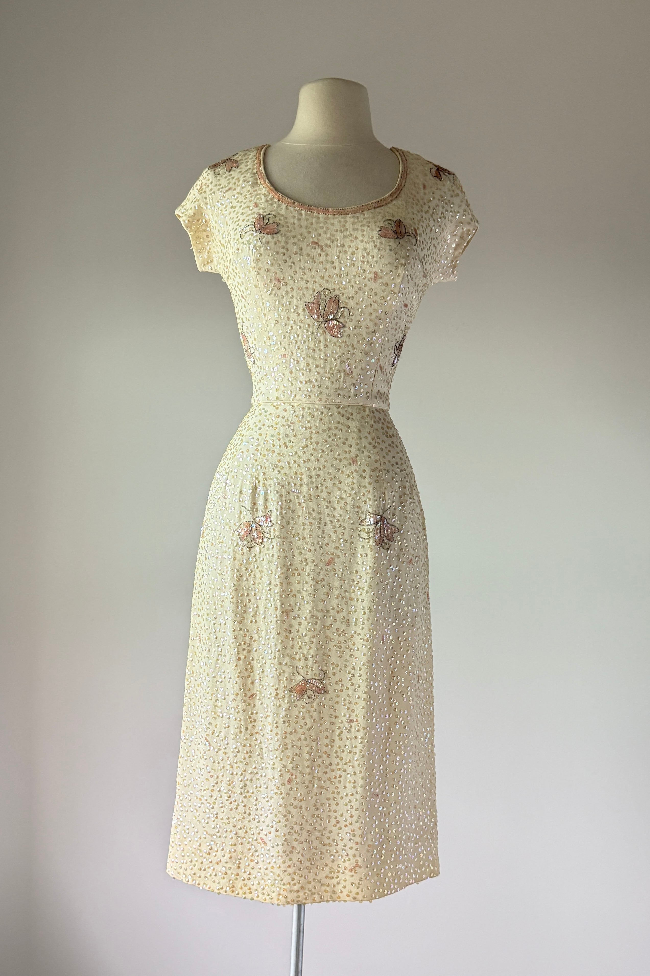 VINTAGE DRESS Gorgeous vintage 1960s dress. Features vanilla rayon crepe with iridescent sequins in singles and triples with floral pattern, acetate lining, metal back zipper. Excellent condition. Fits like XS/S. Marked "12".Length 43Bodice 17Bust 36Waist 26Hip 39As with all vintage, please expect wear consistent with age. All sales are final. No order cancellations.0942 | 2613