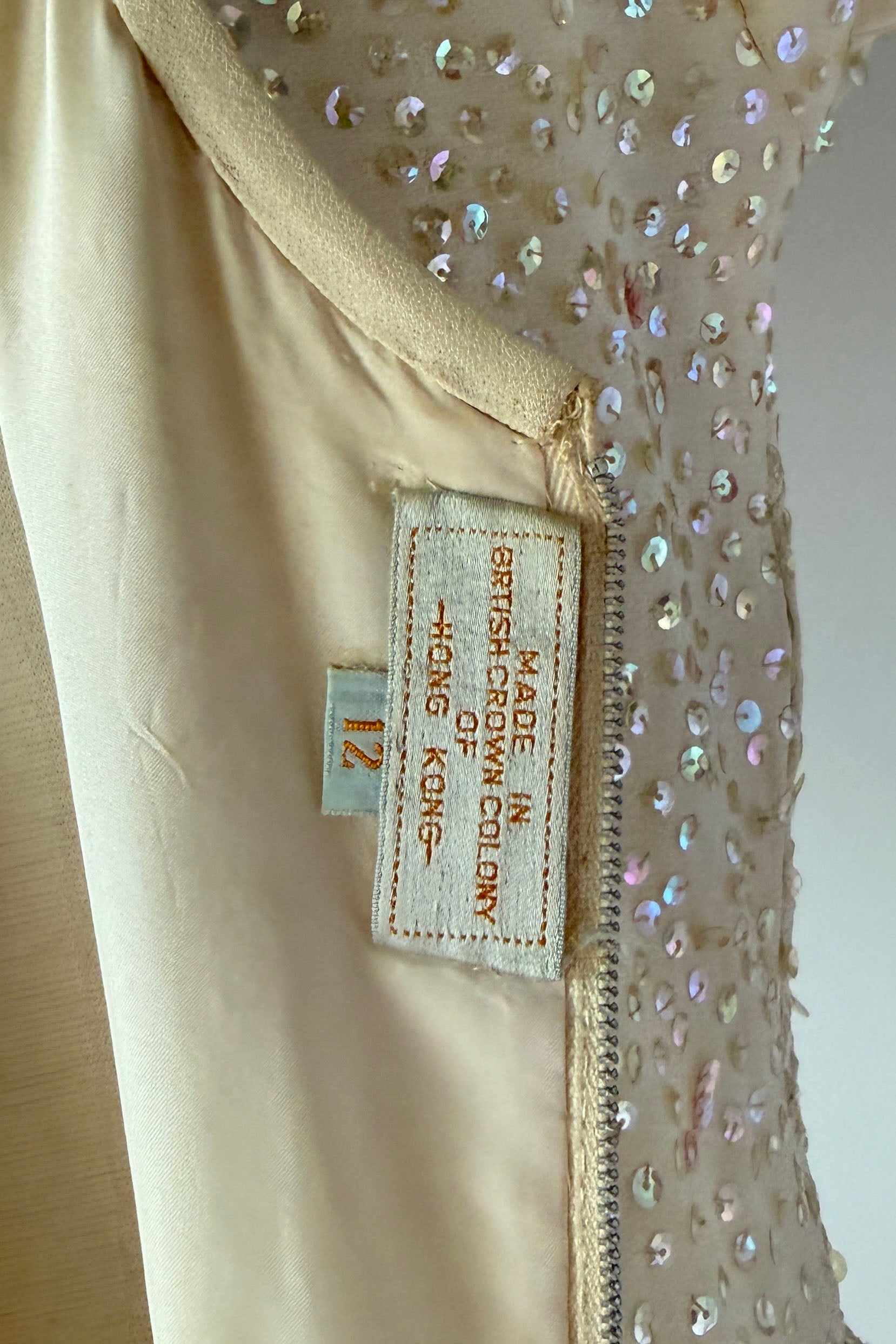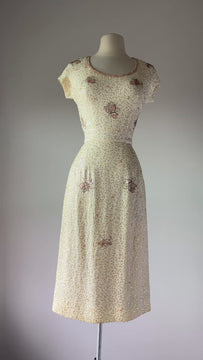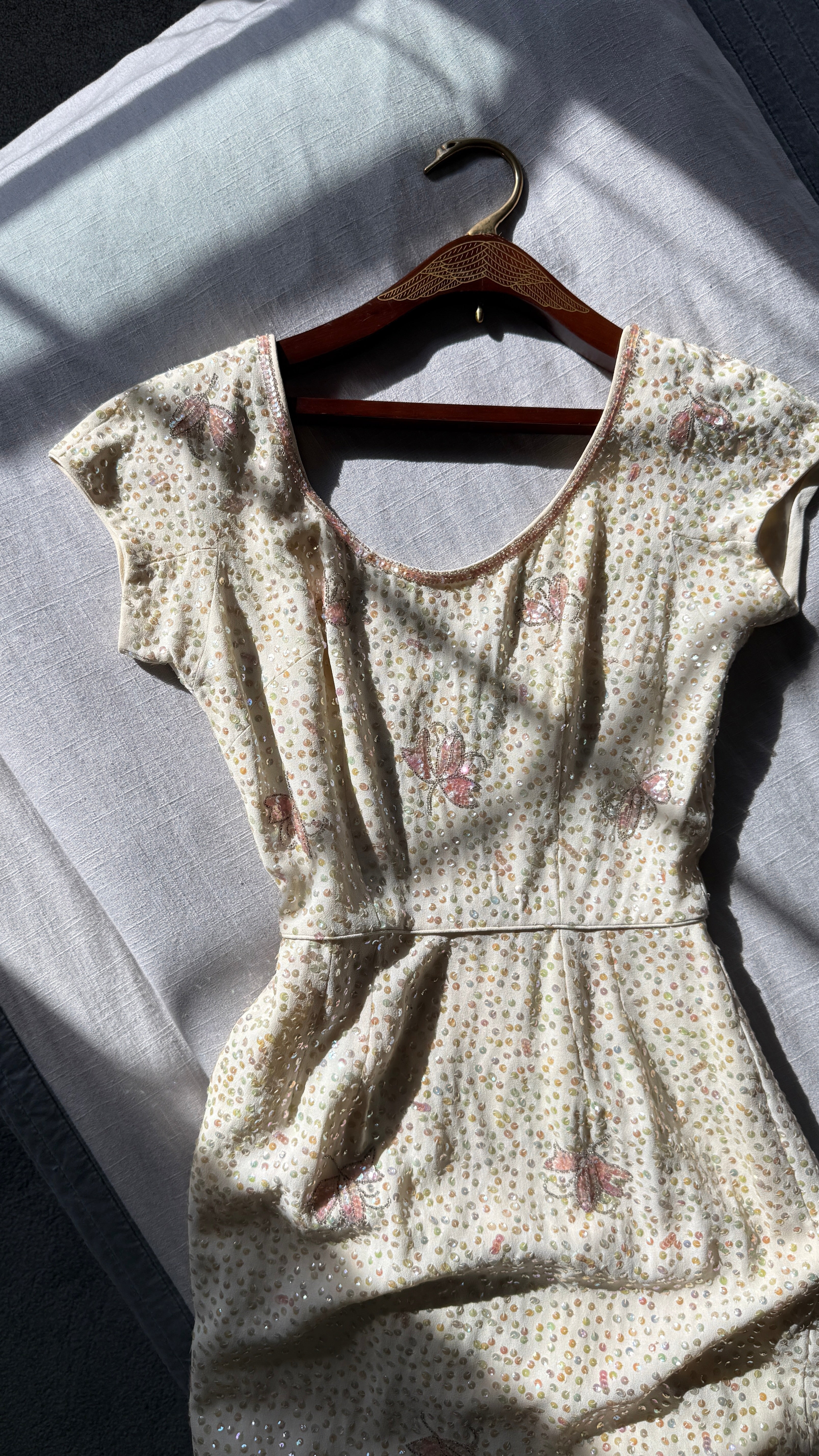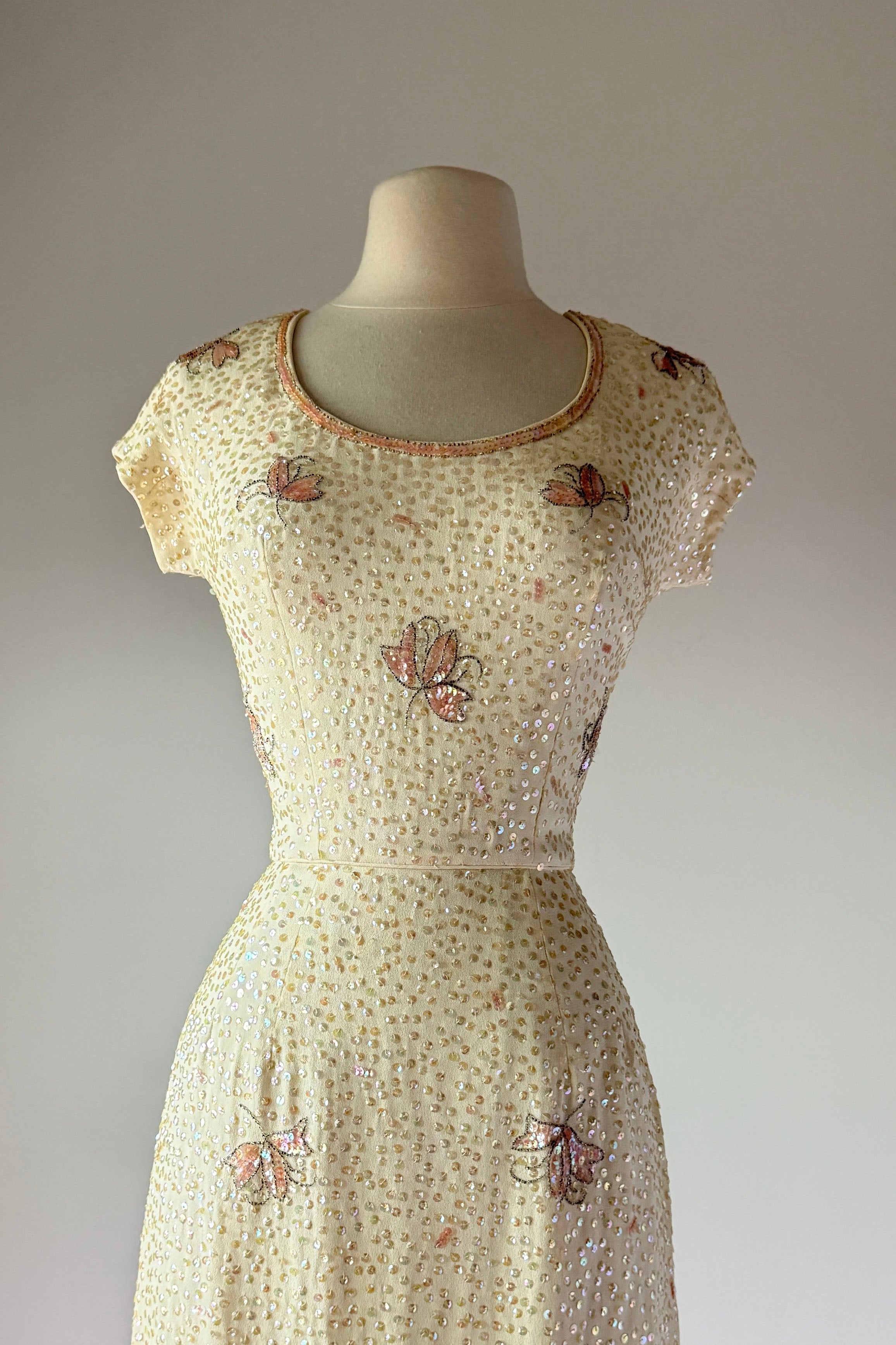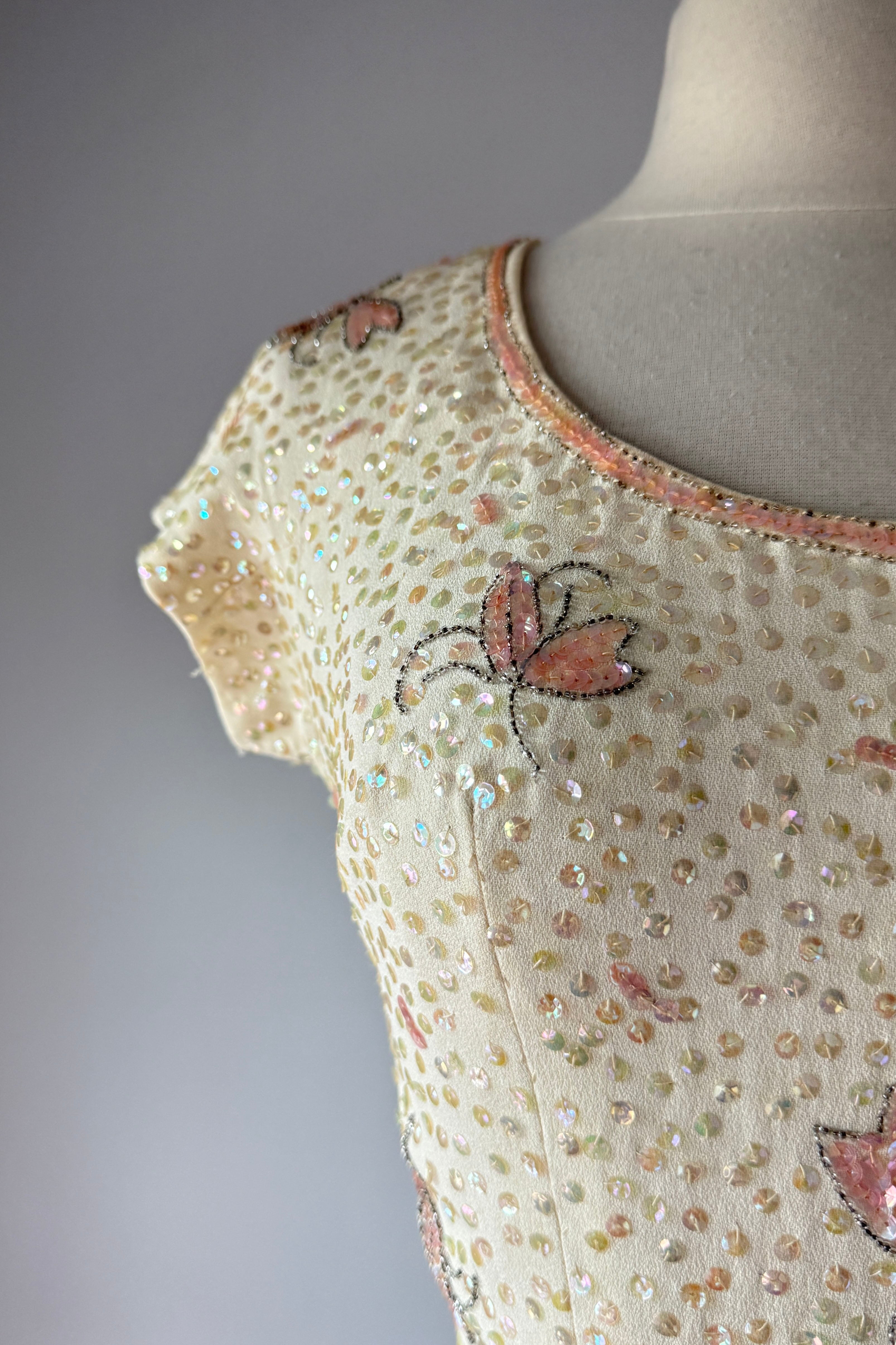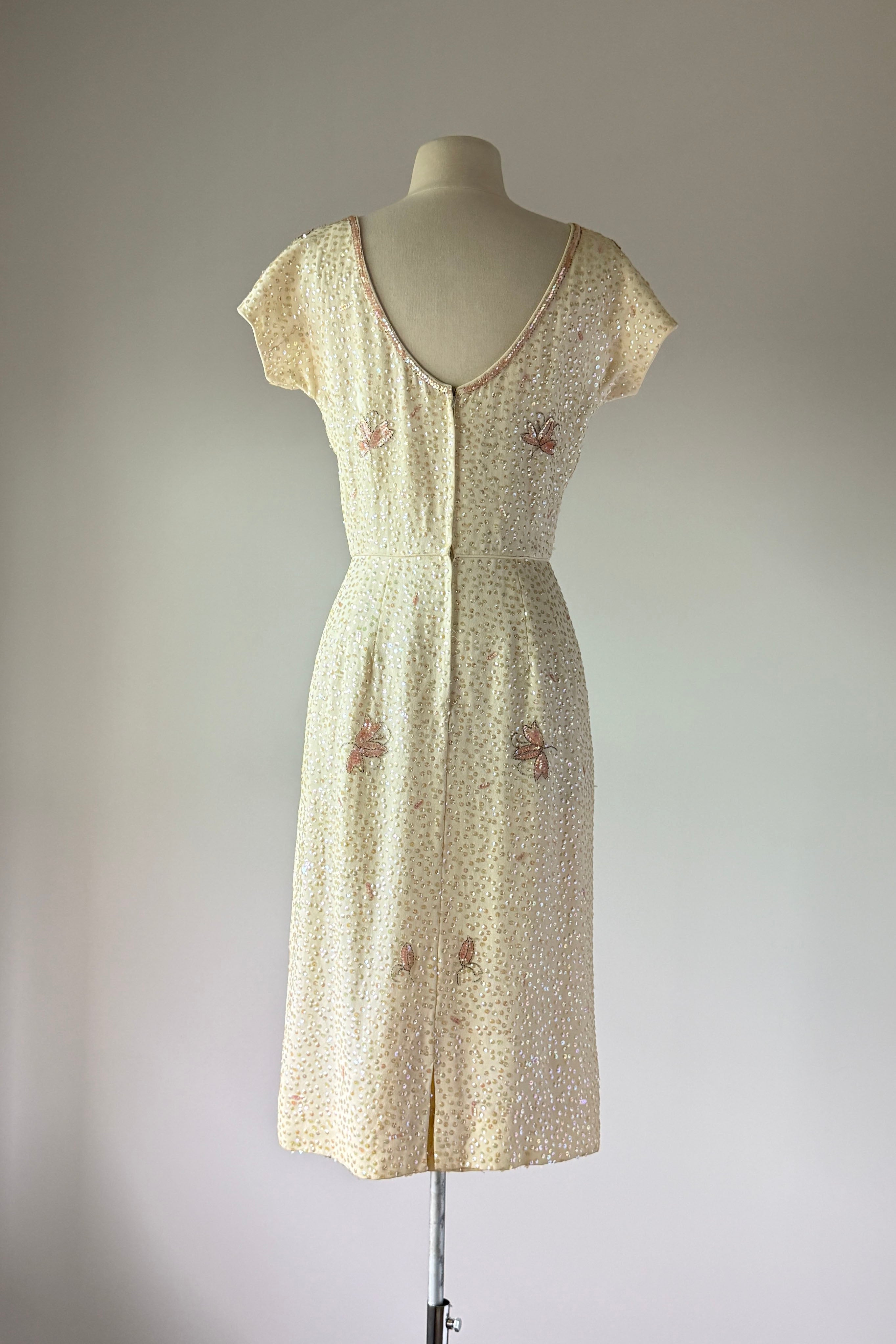 VINTAGE DRESS Gorgeous vintage 1960s dress. Features vanilla rayon crepe with iridescent sequins in singles and triples with floral pattern, acetate lining, metal back zipper. Excellent condition. Fits like XS/S. Marked "12".Length 43Bodice 17Bust 36Waist 26Hip 39As with all vintage, please expect wear consistent with age. All sales are final. No order cancellations.0942 | 2613
