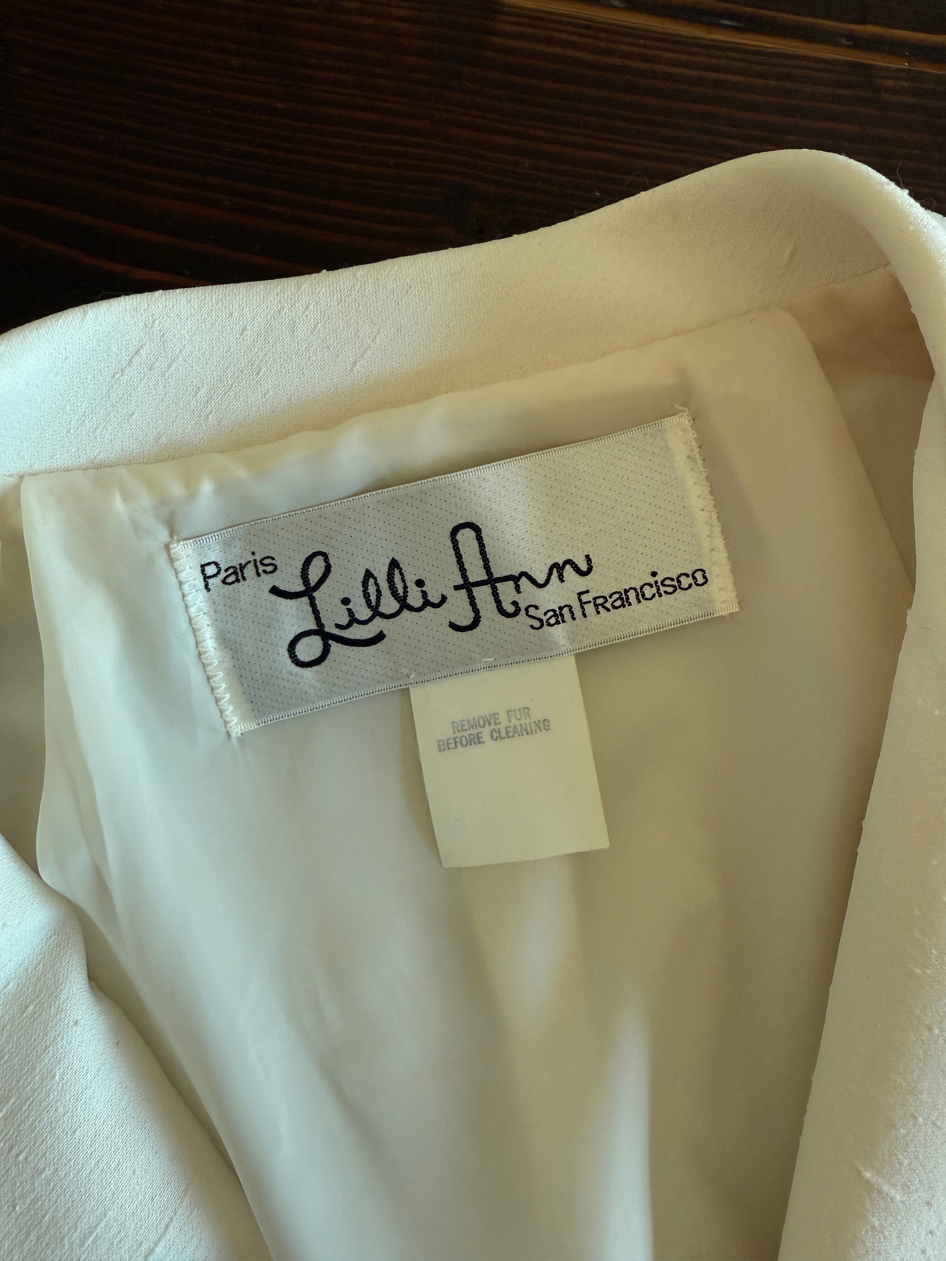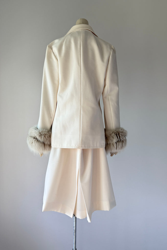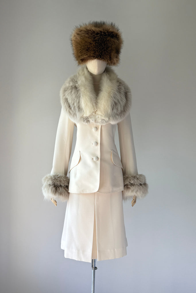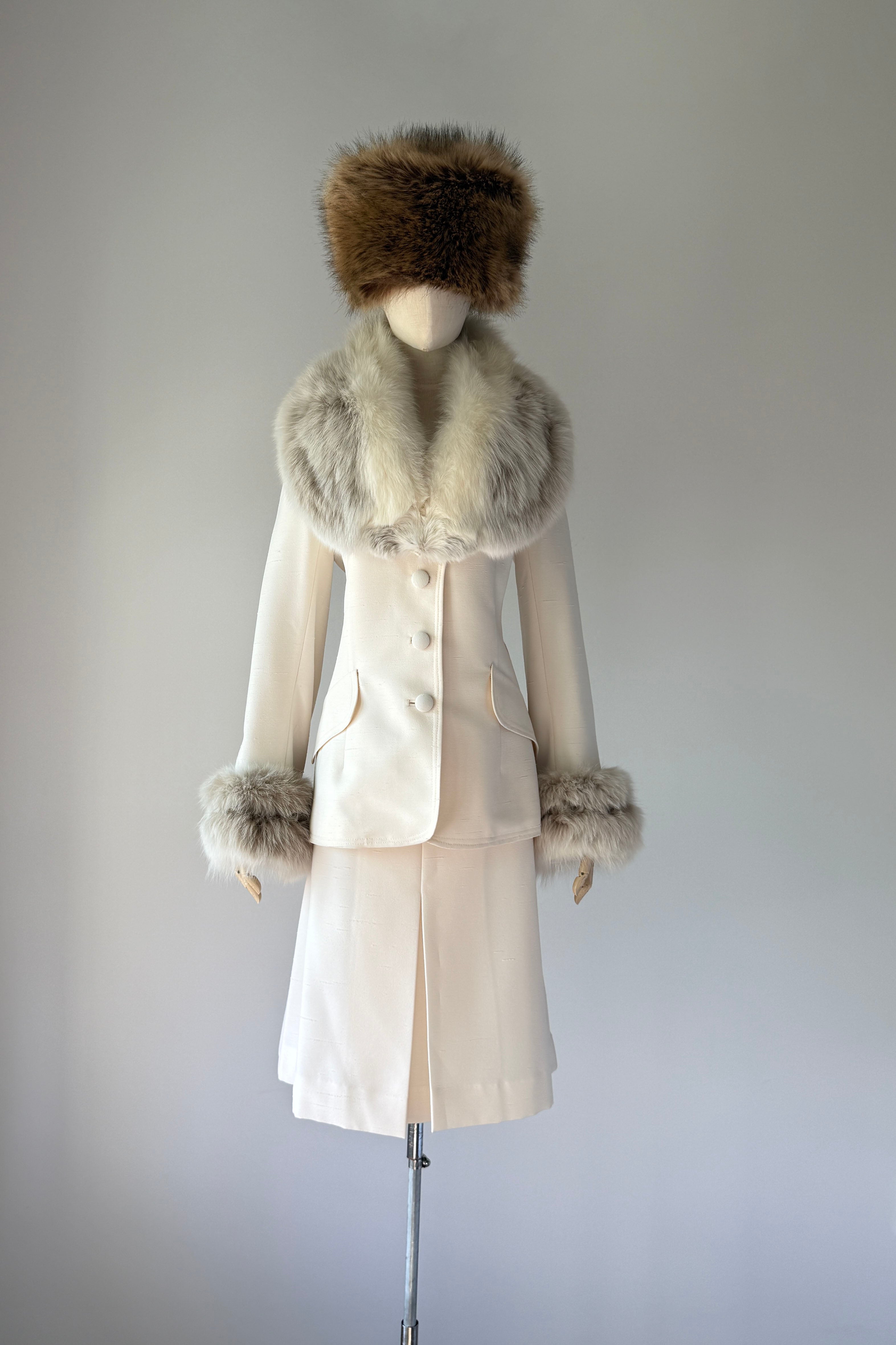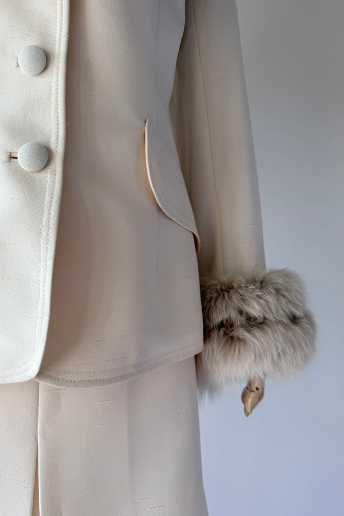 VINTAGE LILLI ANN SUIT1960s off white wool blend, acetate lined. Fox cuffs and optional fox collar (is not attached). Skirt zips at side, jacket buttons in front. Dead stock with original store tags inside skirt. Excellent condition. Fits like XLSKIRTlength 27waist 34hips 45JACKETlength 27shoulders 16.5sleeves 23bust 40-42 ref: 0641 | 2542
