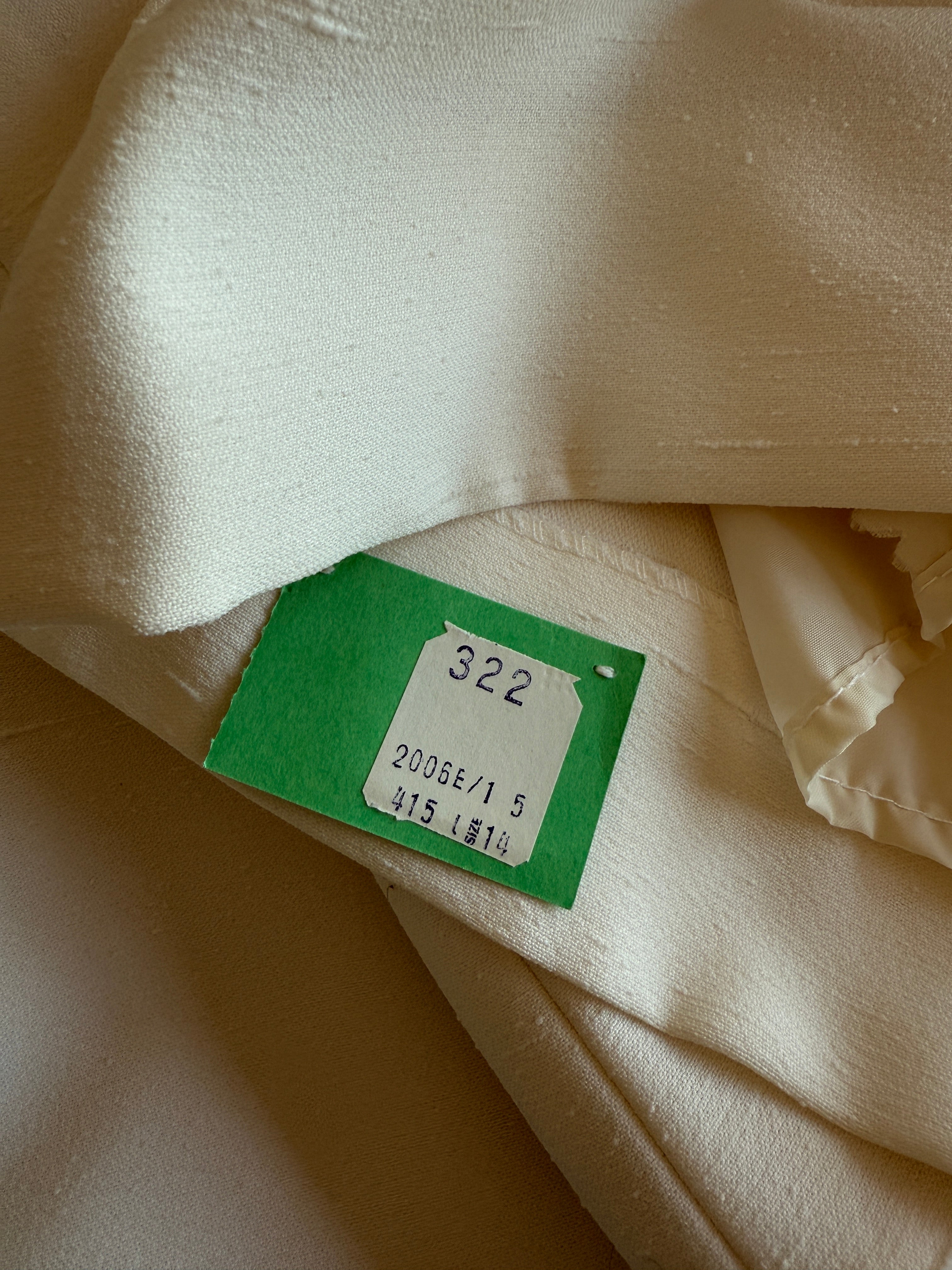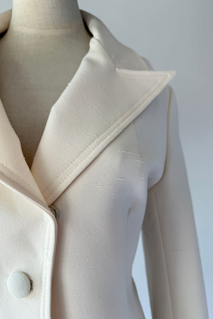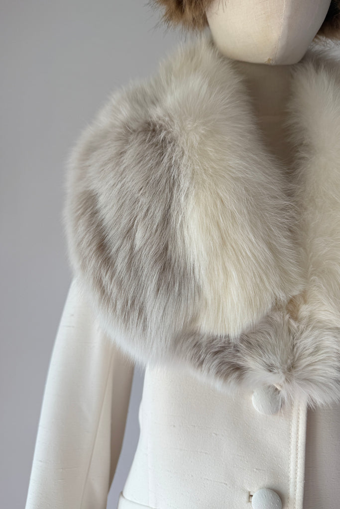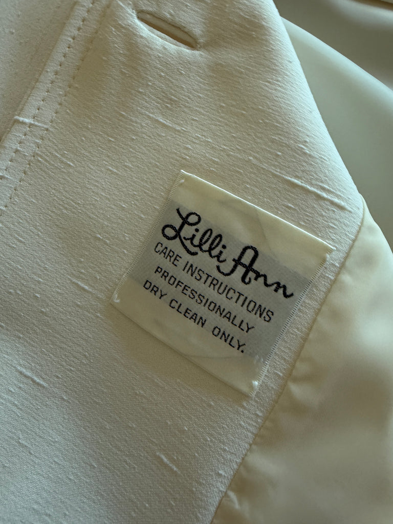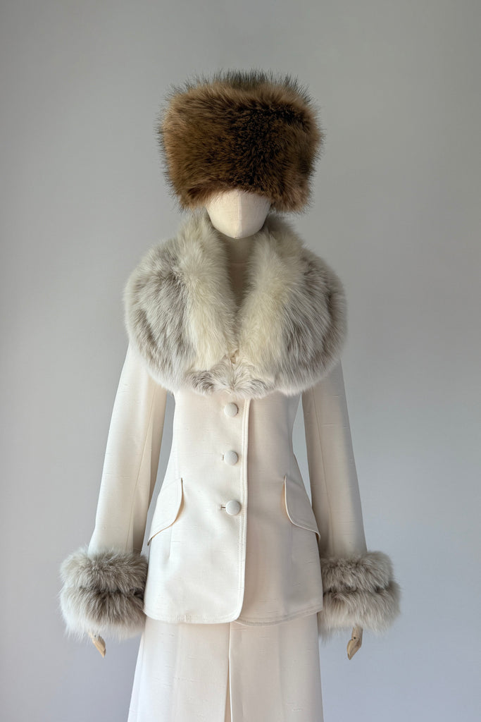 VINTAGE LILLI ANN SUIT1960s off white wool blend, acetate lined. Fox cuffs and optional fox collar (is not attached). Skirt zips at side, jacket buttons in front. Dead stock with original store tags inside skirt. Excellent condition. Fits like XLSKIRTlength 27waist 34hips 45JACKETlength 27shoulders 16.5sleeves 23bust 40-42 ref: 0641 | 2542