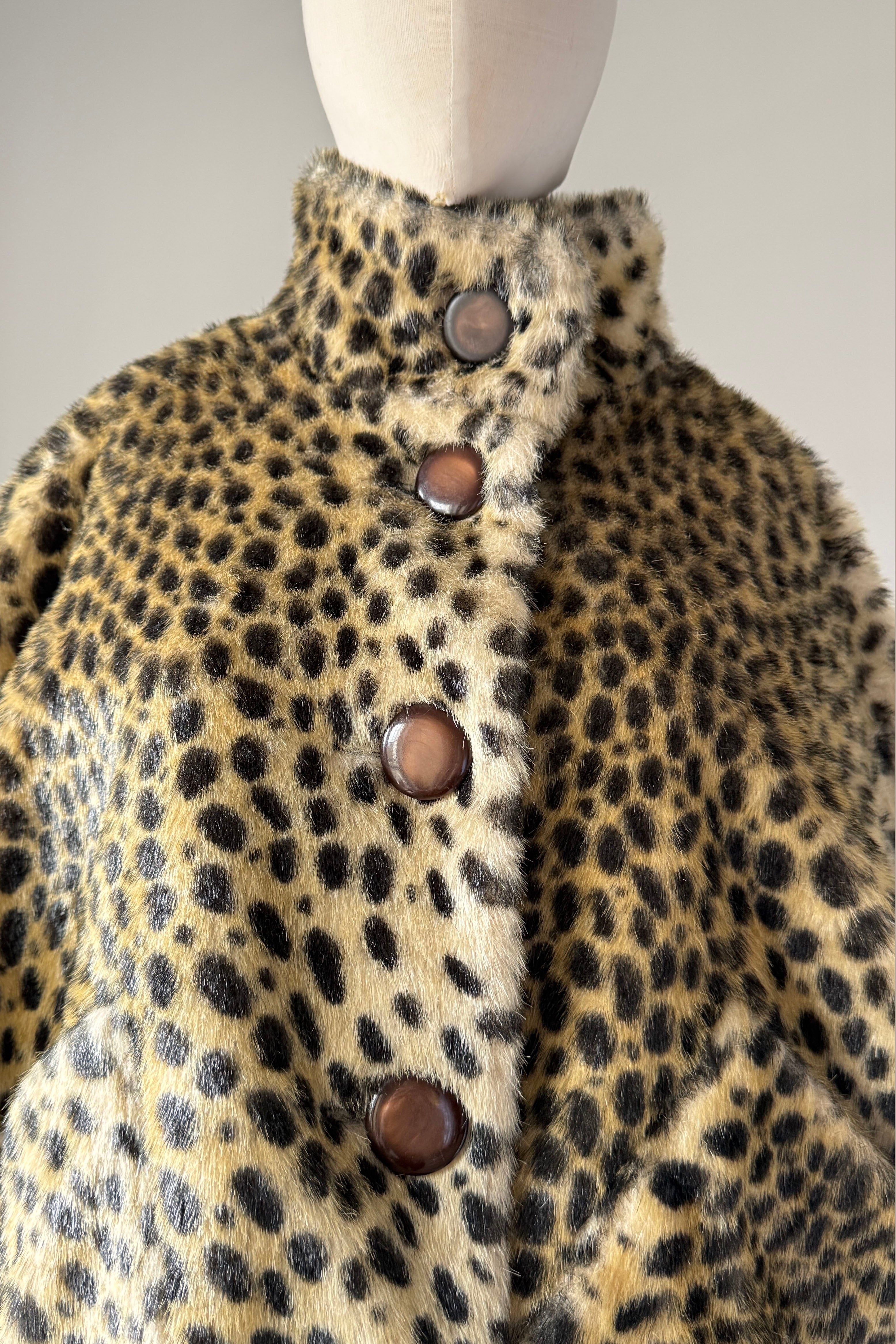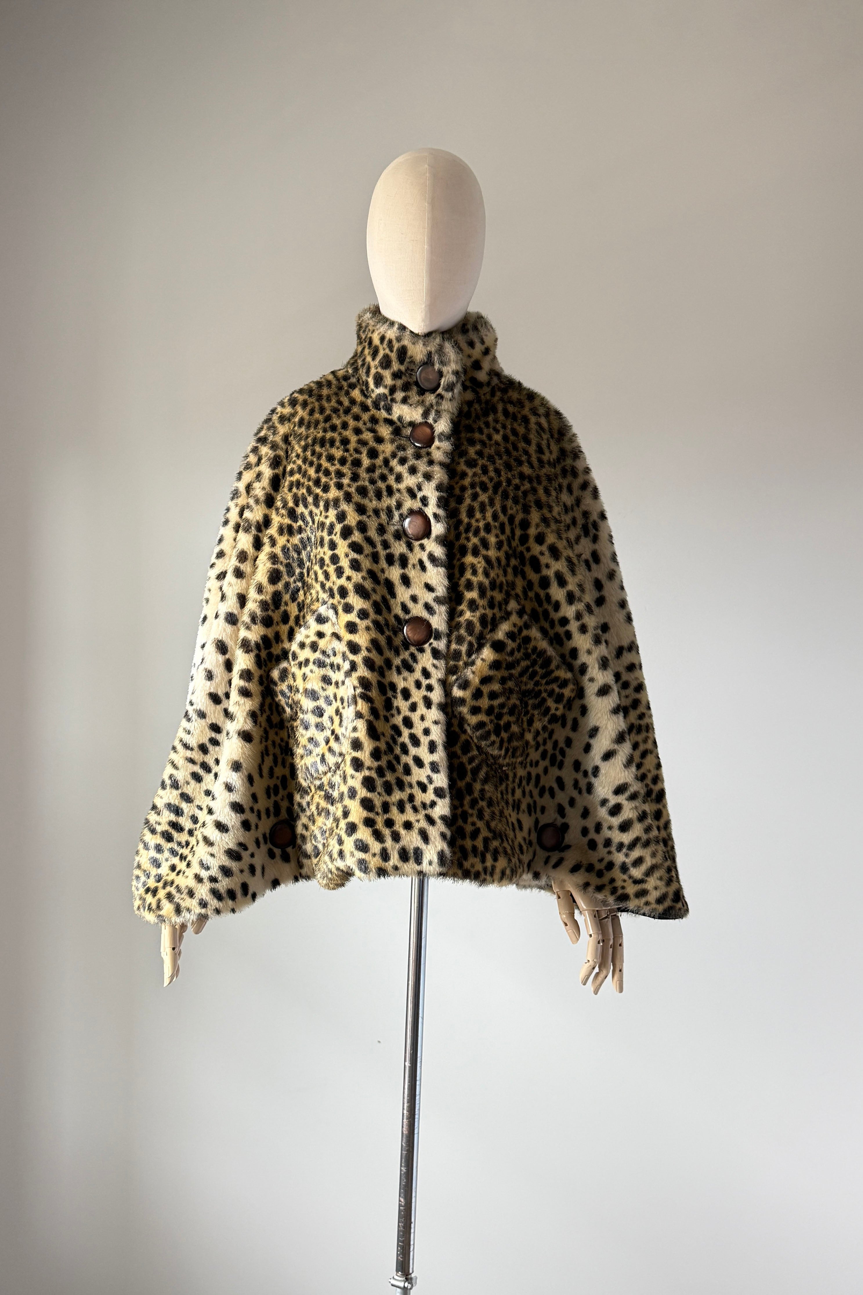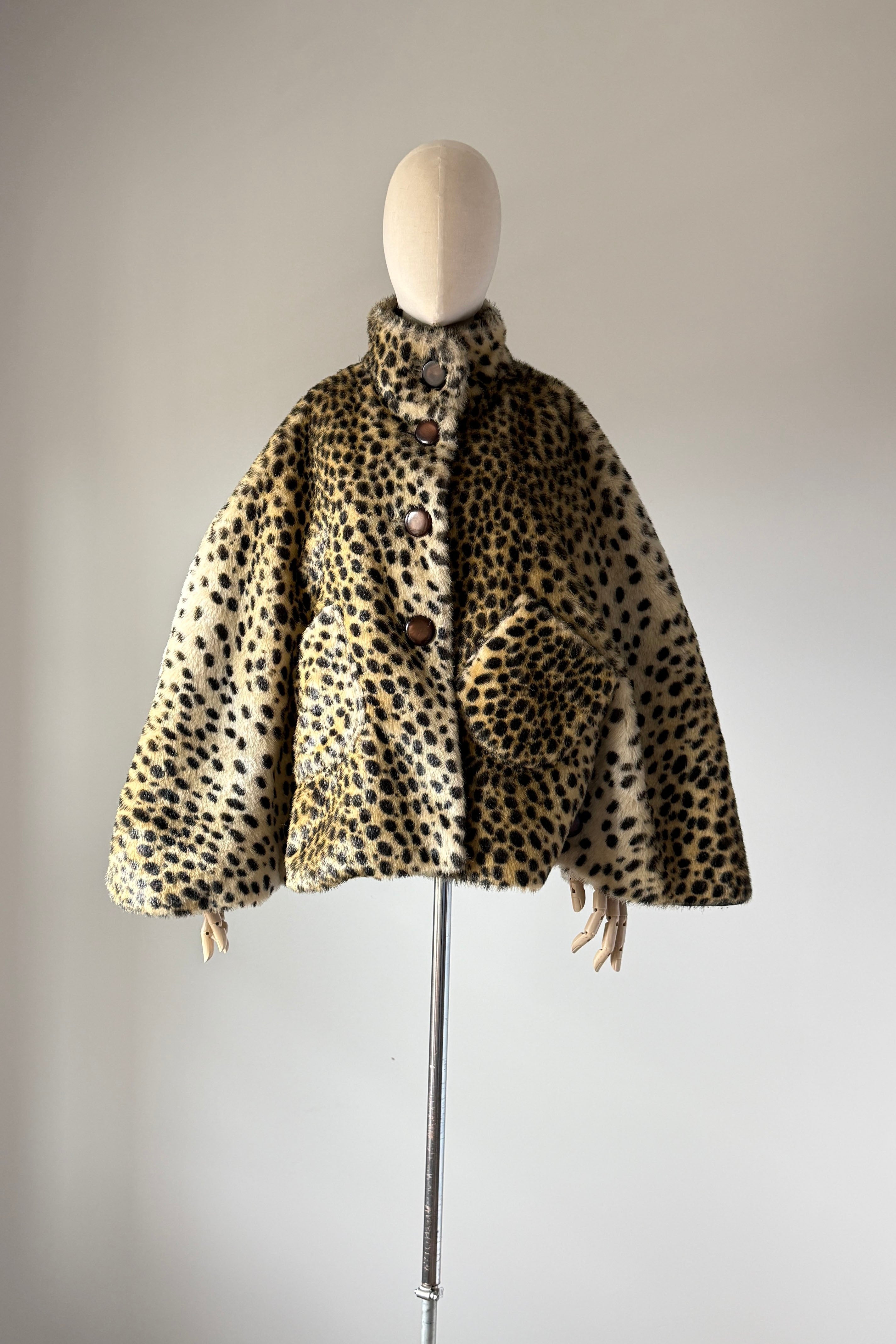 VINTAGE CAPEVintage 1960s cape. Features leopard print faux fur, acetate lining, button closure with stand up collar, buttons at each side are functional.Excellent condition. OSFM. Length 23Shoulder 16As with all vintage, please expect wear consistent with age. All sales are final. No order cancellations.0870 | 2608