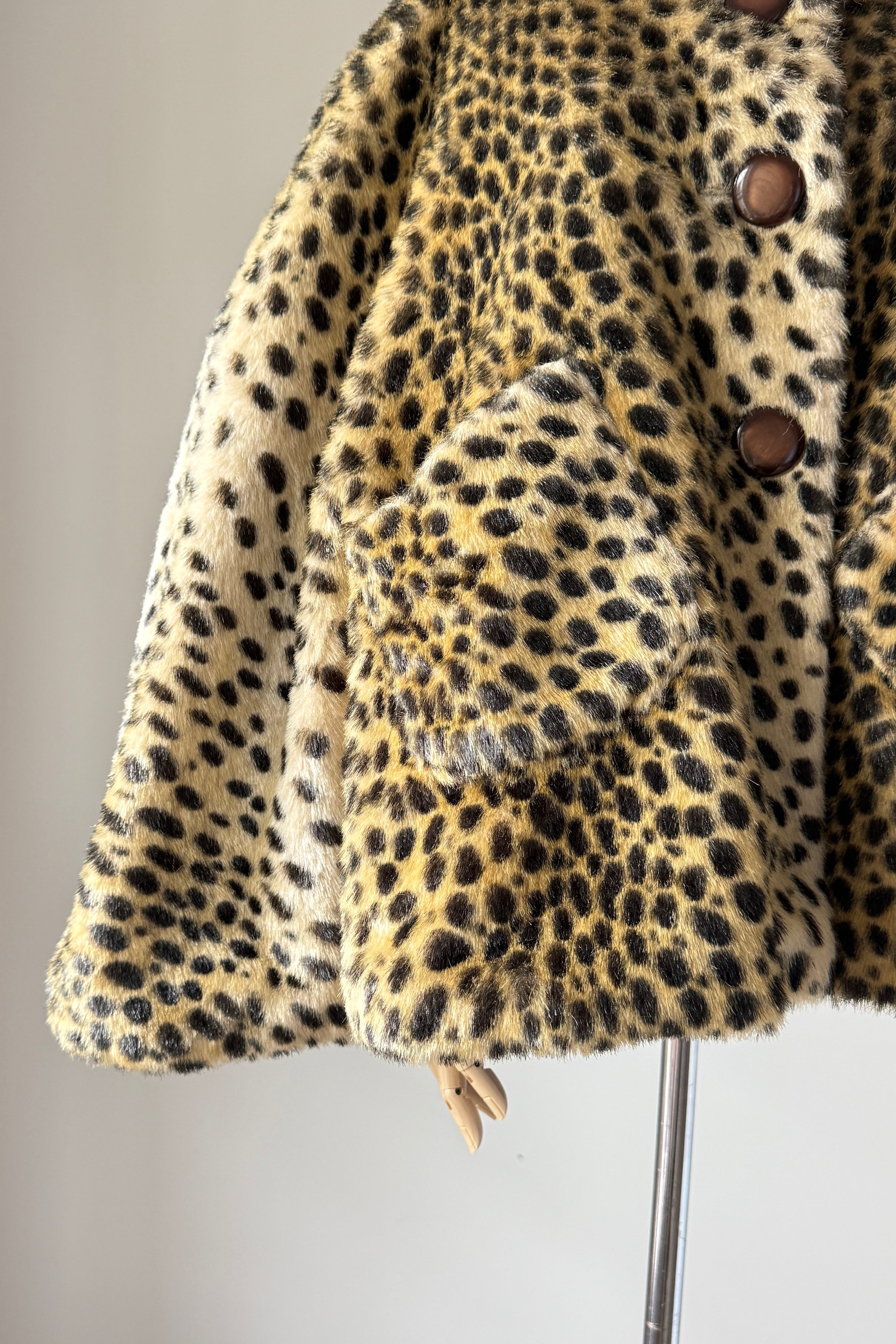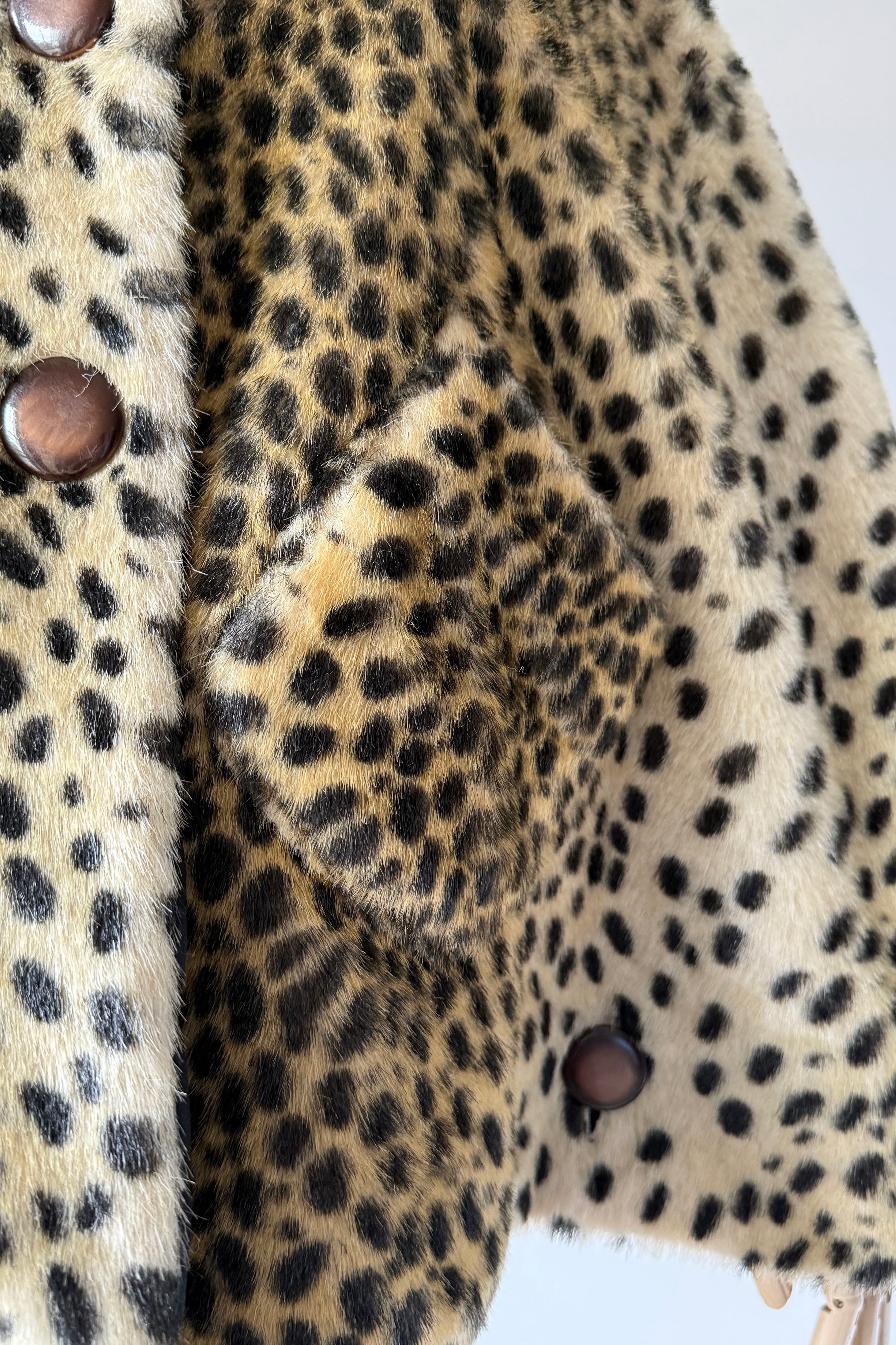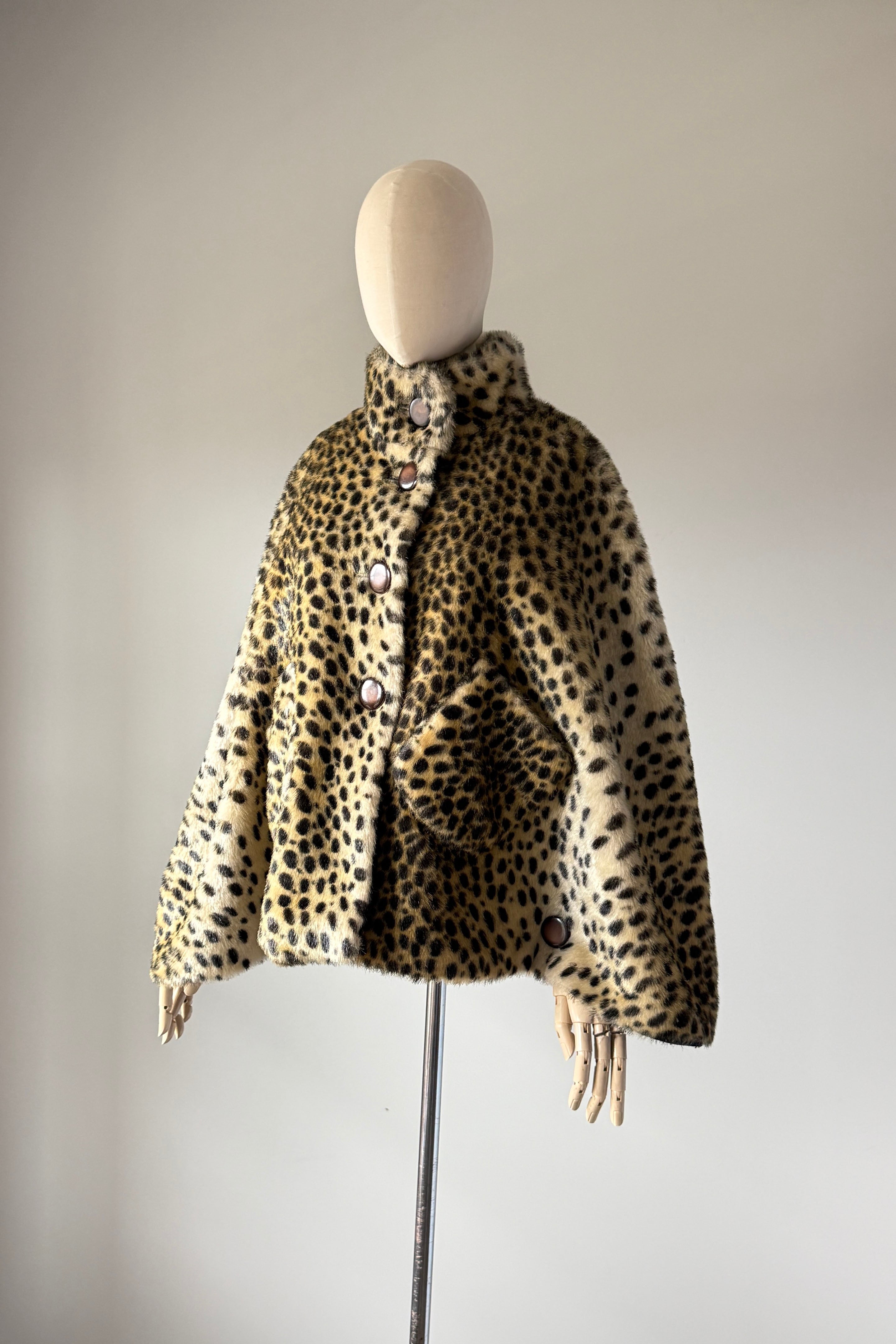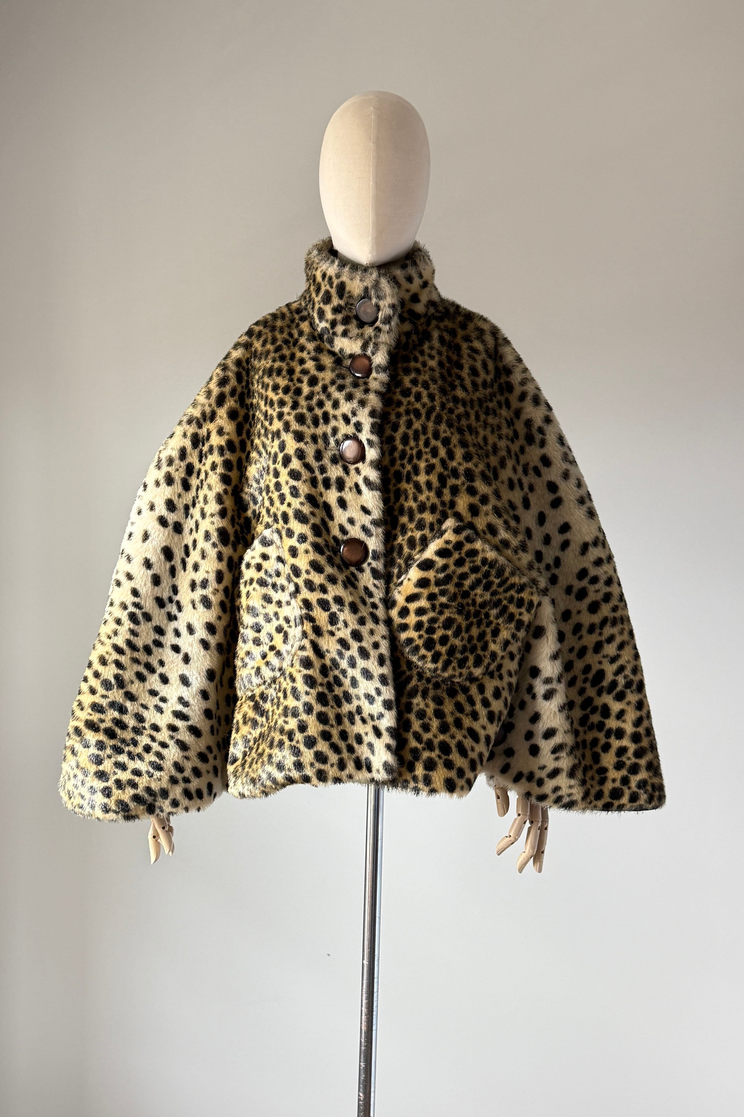 VINTAGE CAPEVintage 1960s cape. Features leopard print faux fur, acetate lining, button closure with stand up collar, buttons at each side are functional.Excellent condition. OSFM. Length 23Shoulder 16As with all vintage, please expect wear consistent with age. All sales are final. No order cancellations.0870 | 2608