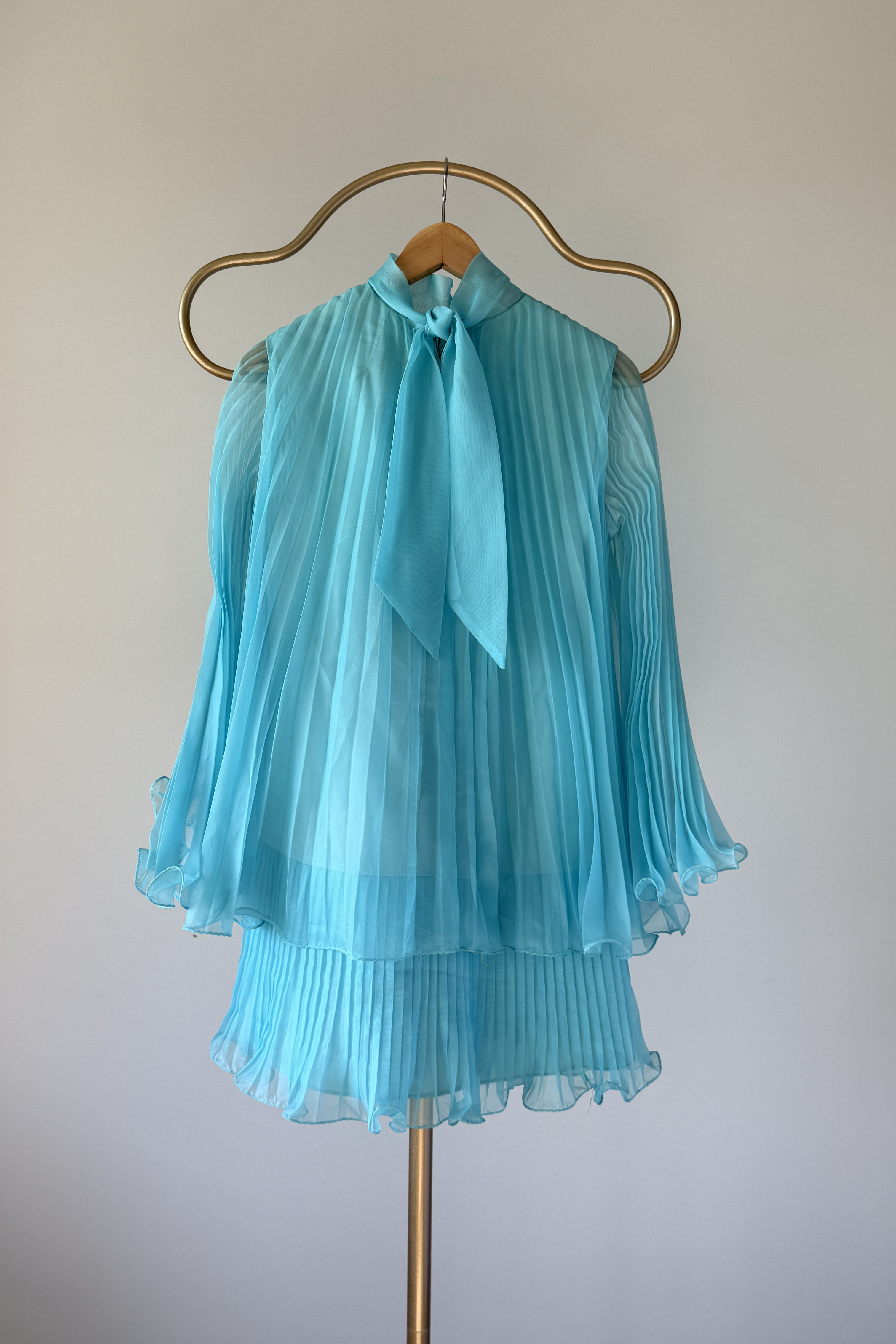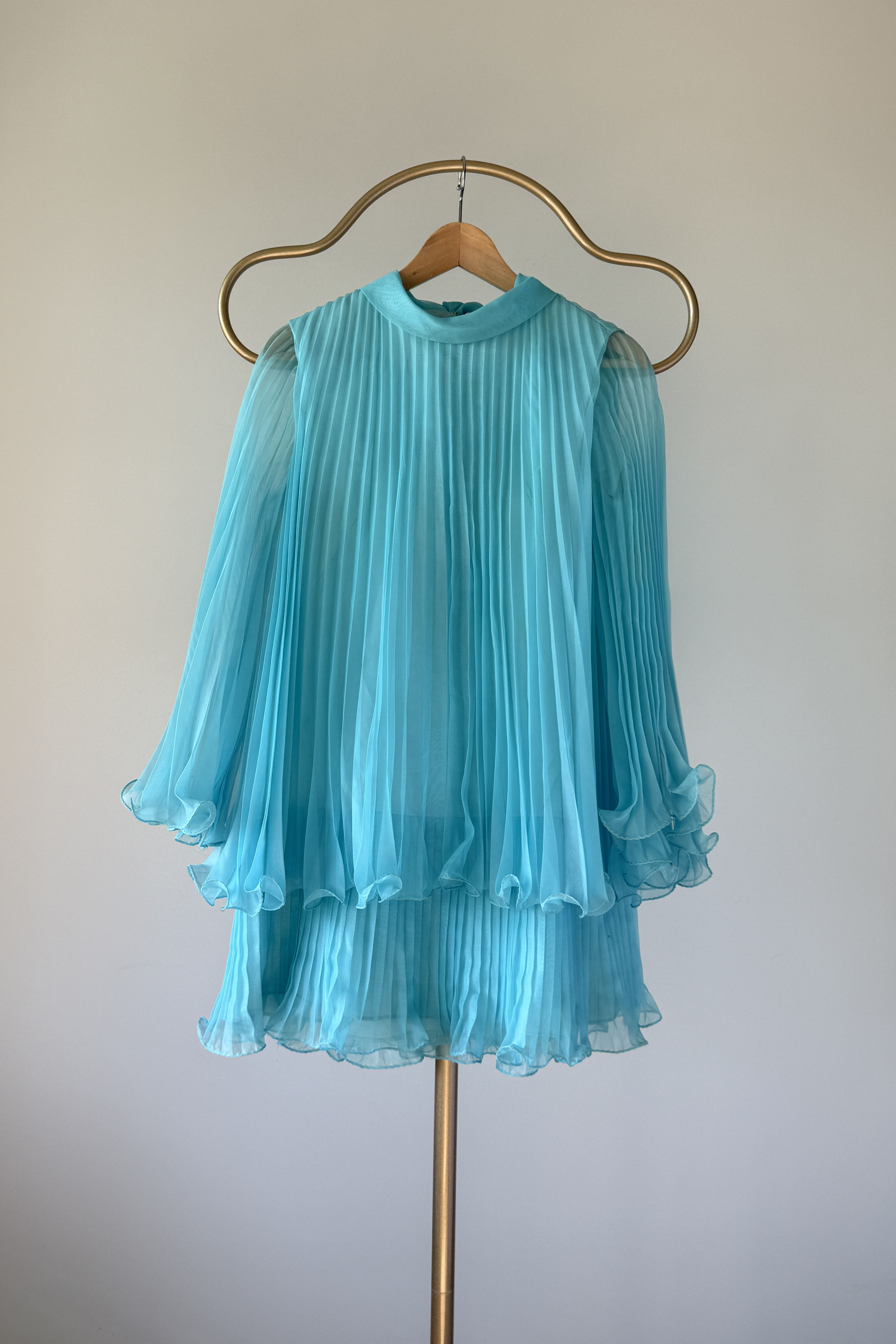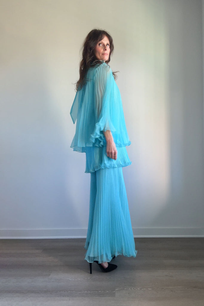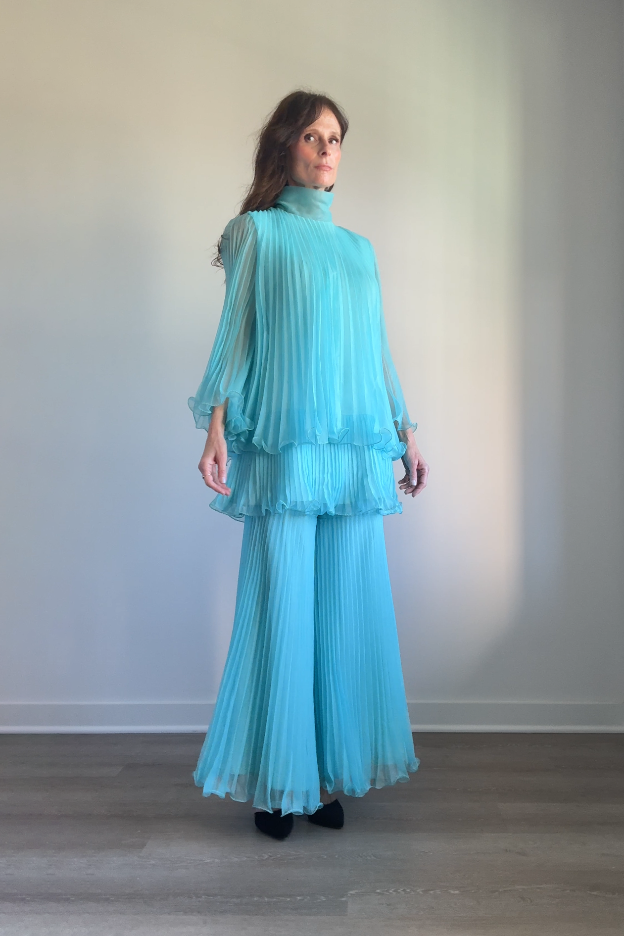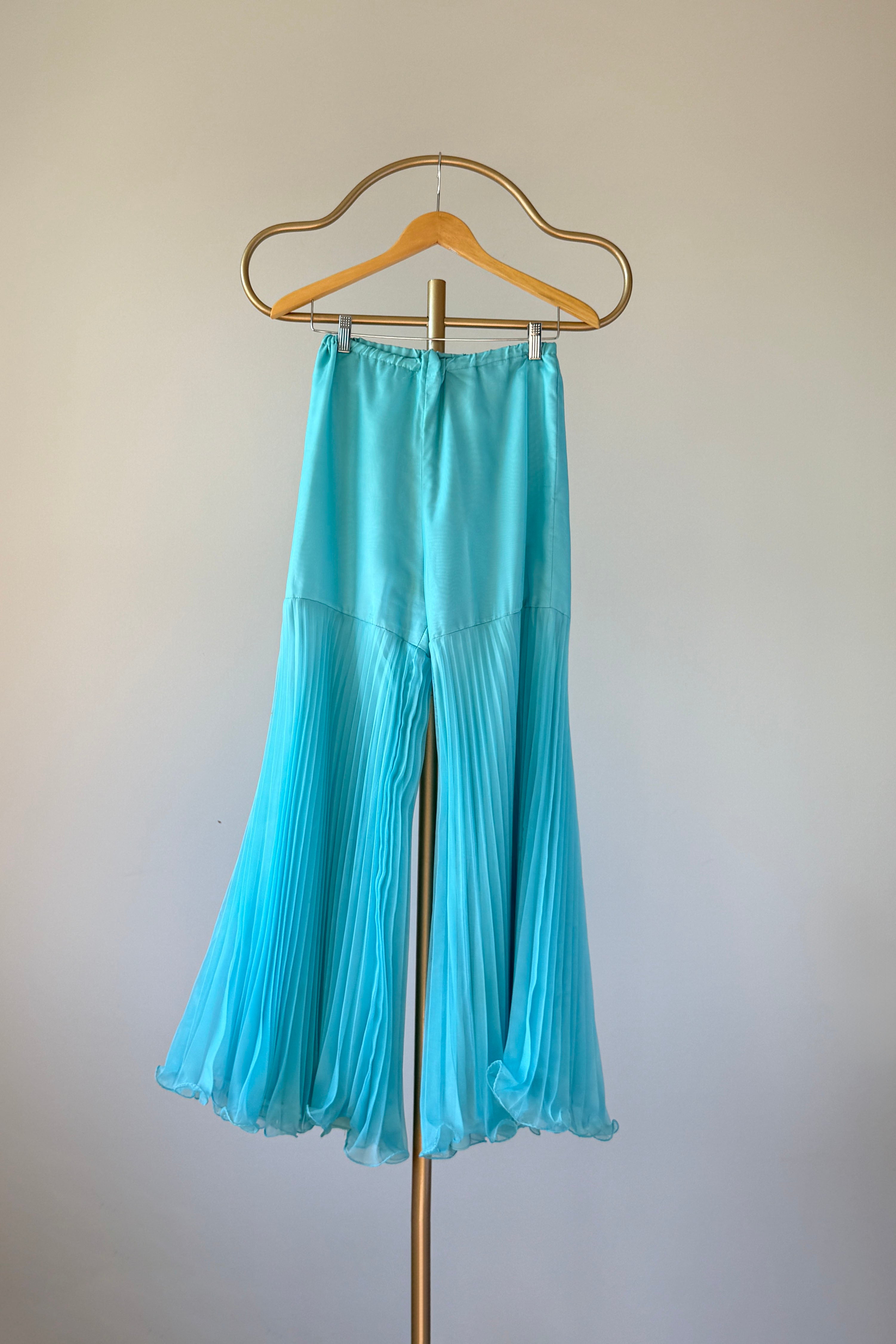 VINTAGE PANTSUIT era: 1960sfabric: chiffon lined in acetatecolor: sky bluefasteners: metal back zipper (top) details:Airy and ethereal pleated chiffon pant suit in a luminous sky blue. The top features a high neckline, sheer sleeves, and softly ruffled hem, paired with matching wide-leg pleated pants with an elastic waist. Pants and bodice are fully lined in acetate. There are faint underarm stains on the lining that are not visible when worn. condition:Excellent vintage condition with minor lining discoloration noted above. sizing:Best fits modern XS/S measurements (in inches):pantslength: 40rise: 14inseam: 26waist: 24–26hips: 40 toplength: 32bust: 36 ref: 0638 | 2542