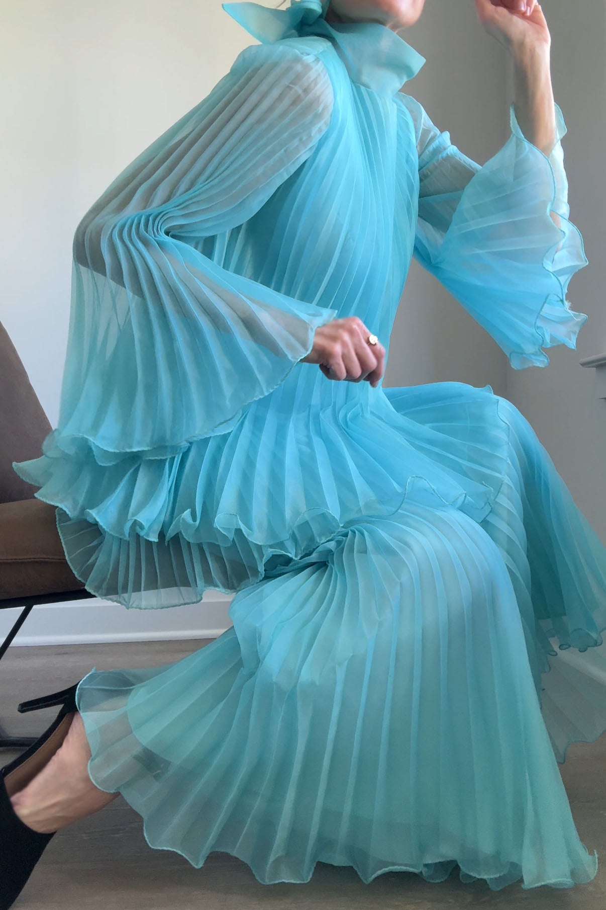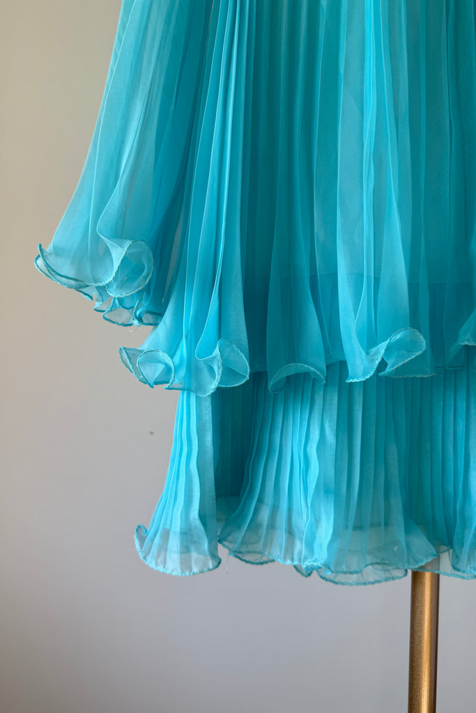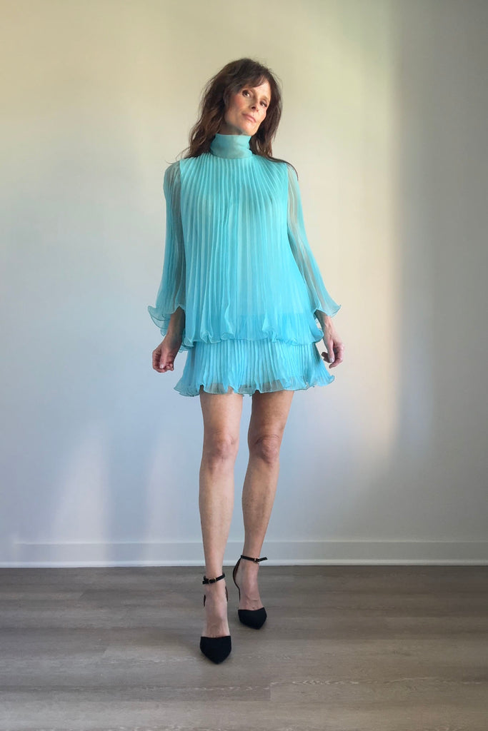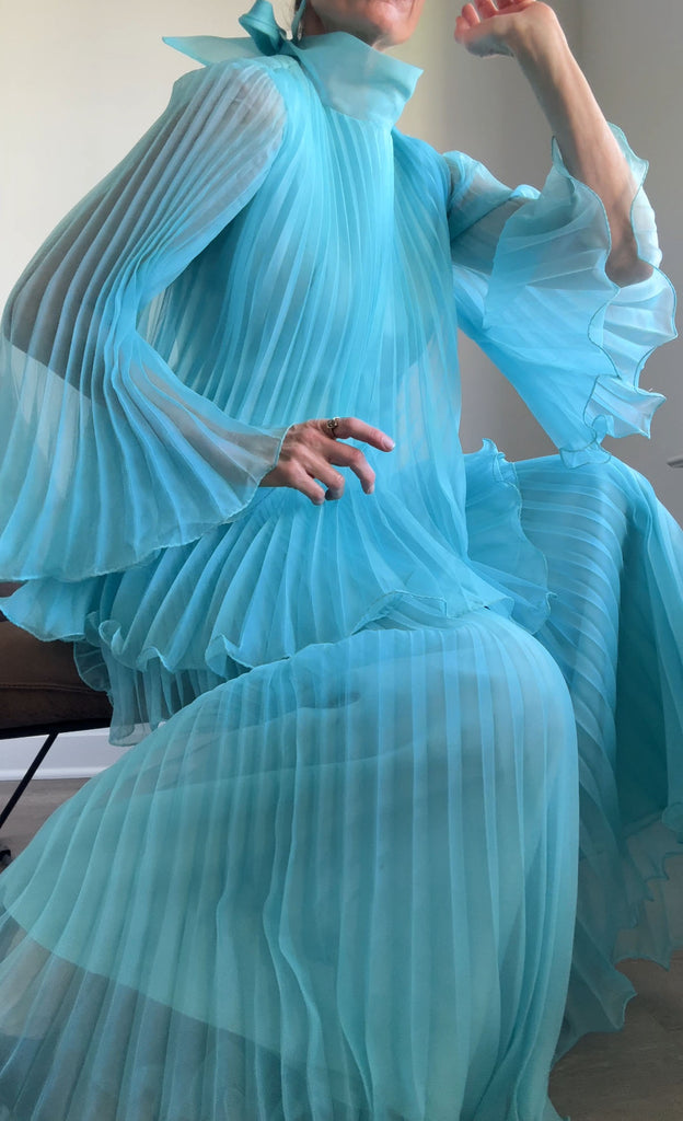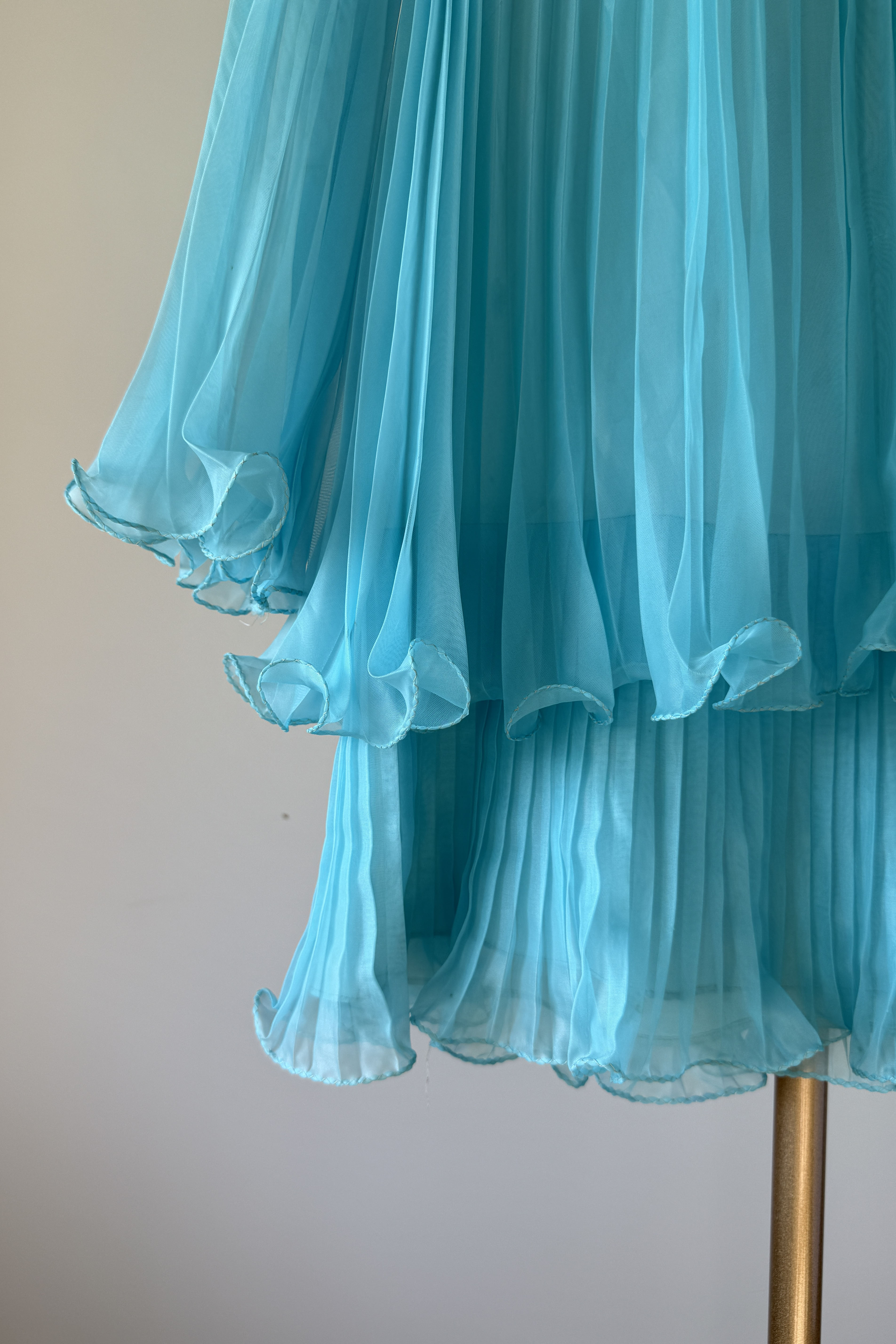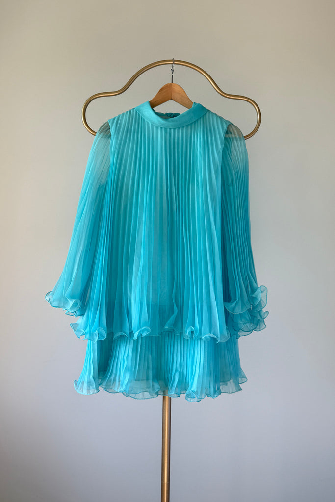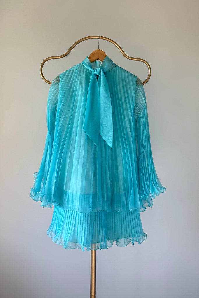 VINTAGE PANTSUIT era: 1960sfabric: chiffon lined in acetatecolor: sky bluefasteners: metal back zipper (top) details:Airy and ethereal pleated chiffon pant suit in a luminous sky blue. The top features a high neckline, sheer sleeves, and softly ruffled hem, paired with matching wide-leg pleated pants with an elastic waist. Pants and bodice are fully lined in acetate. There are faint underarm stains on the lining that are not visible when worn. condition:Excellent vintage condition with minor lining discoloration noted above. sizing:Best fits modern XS/S measurements (in inches):pantslength: 40rise: 14inseam: 26waist: 24–26hips: 40 toplength: 32bust: 36 ref: 0638 | 2542