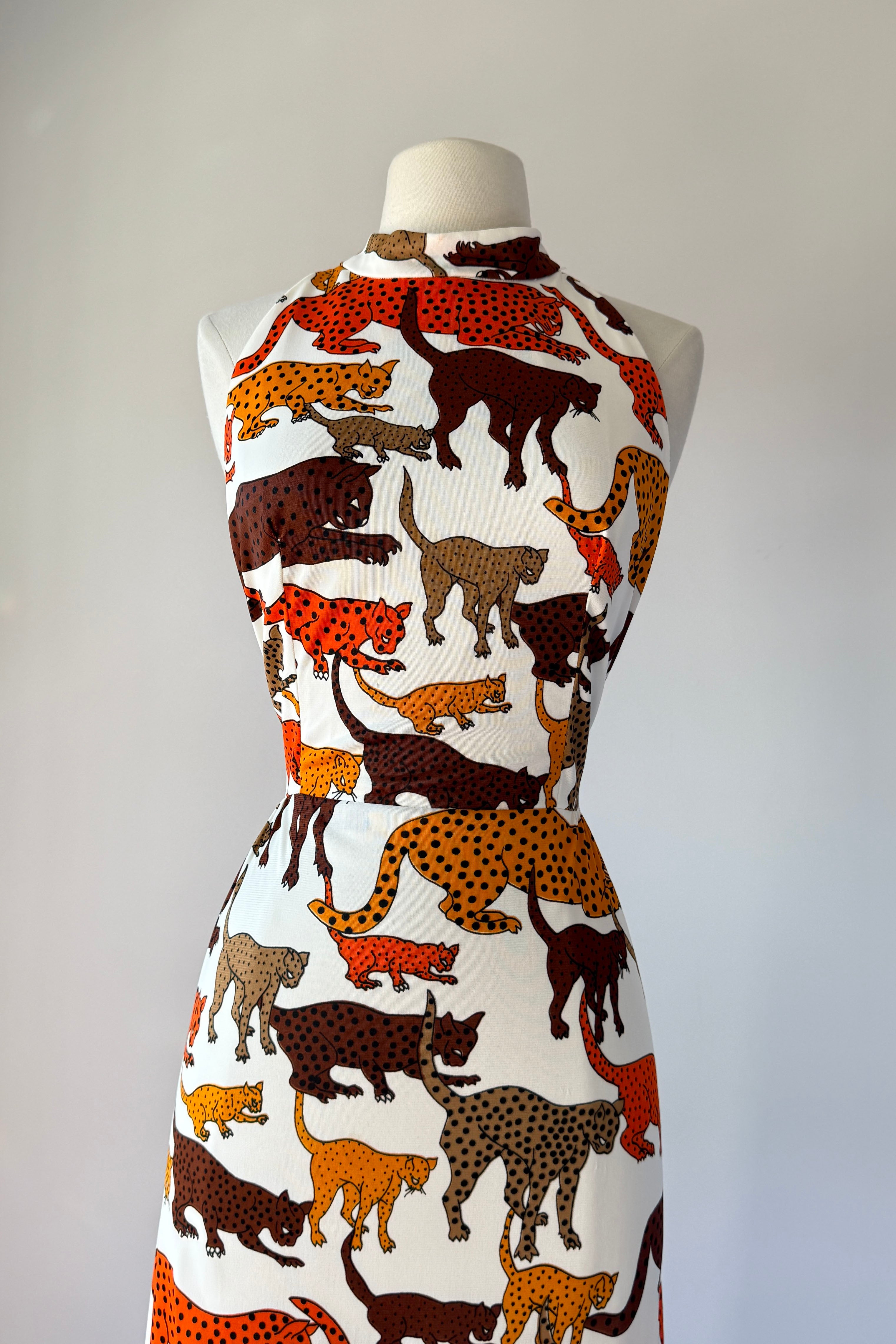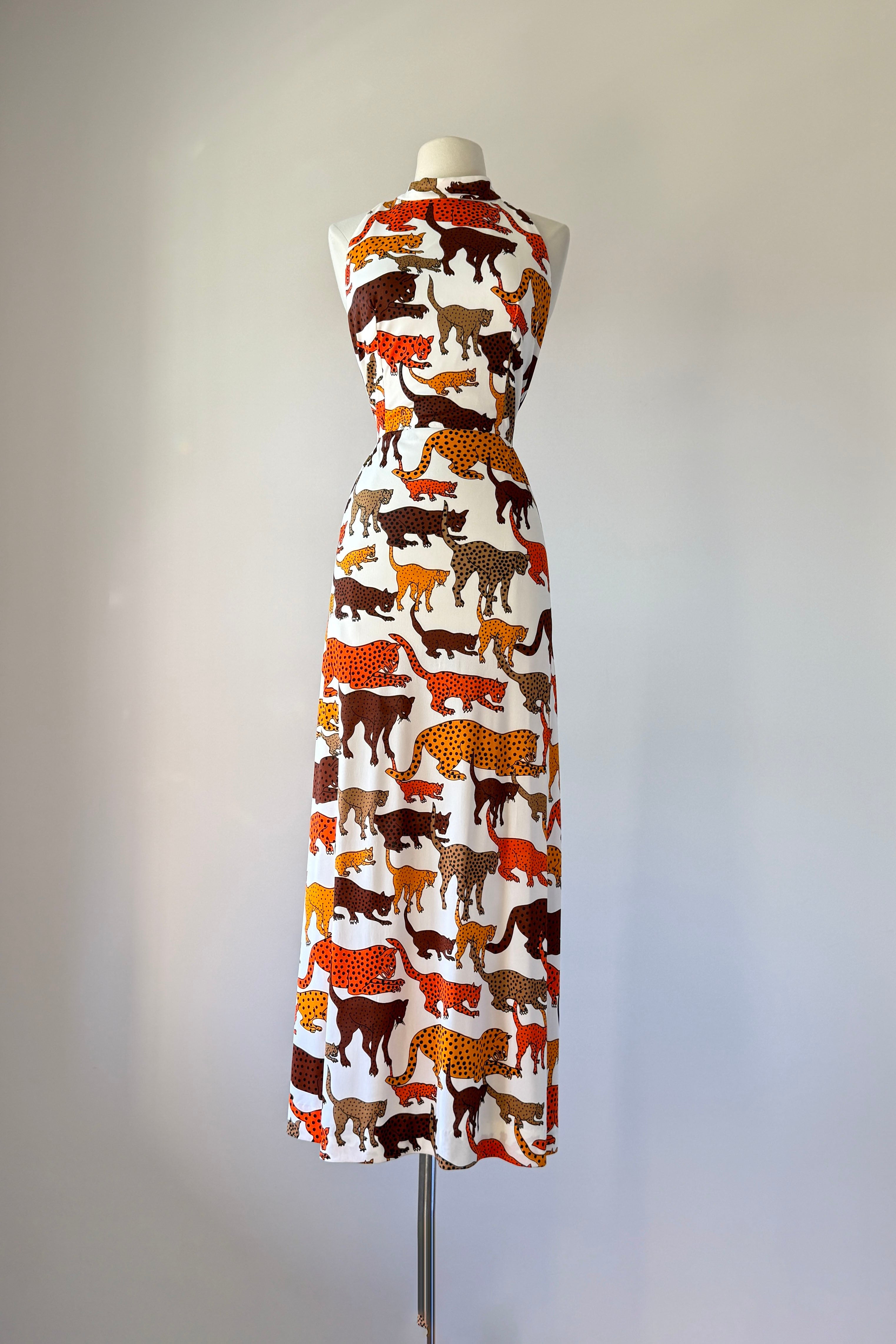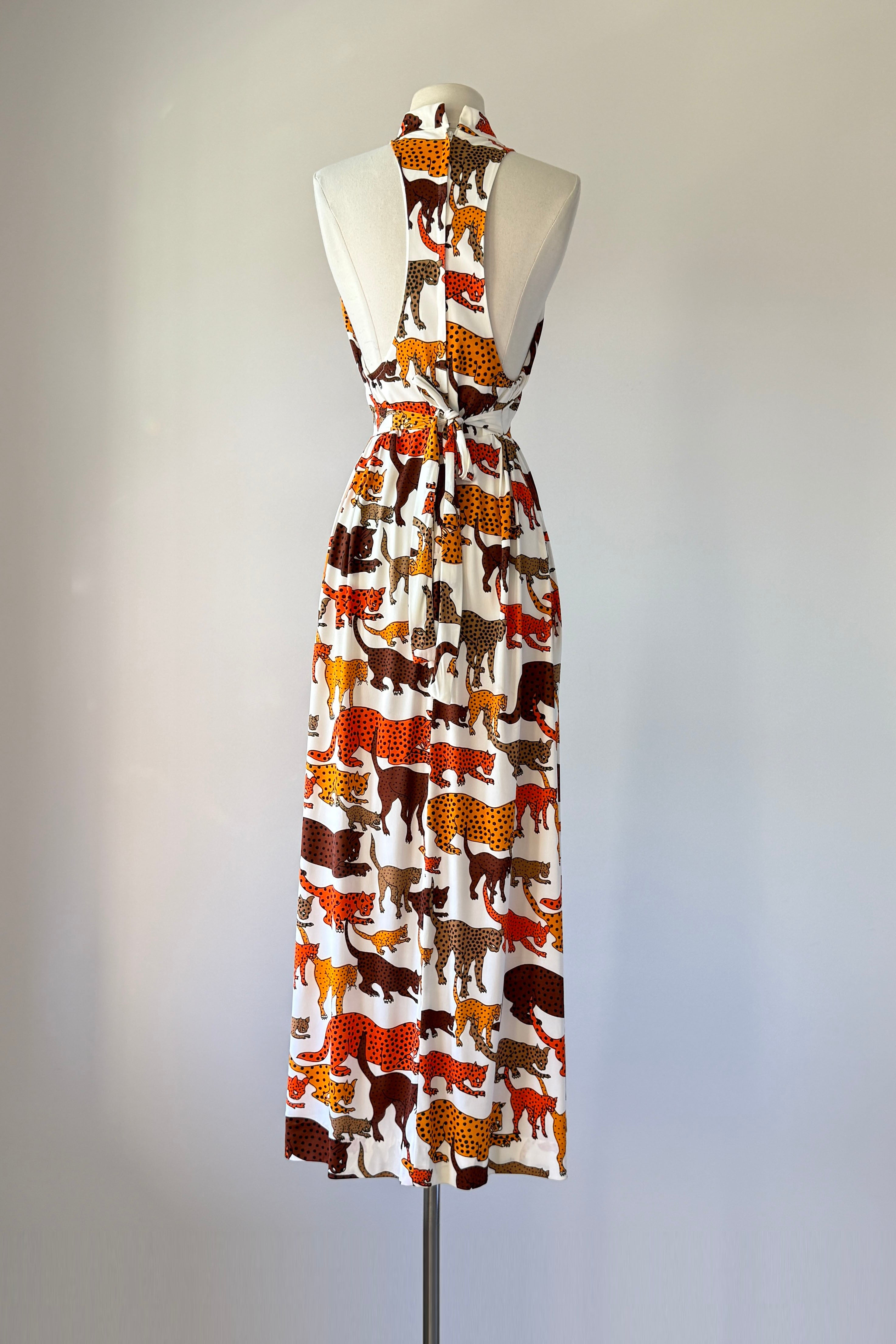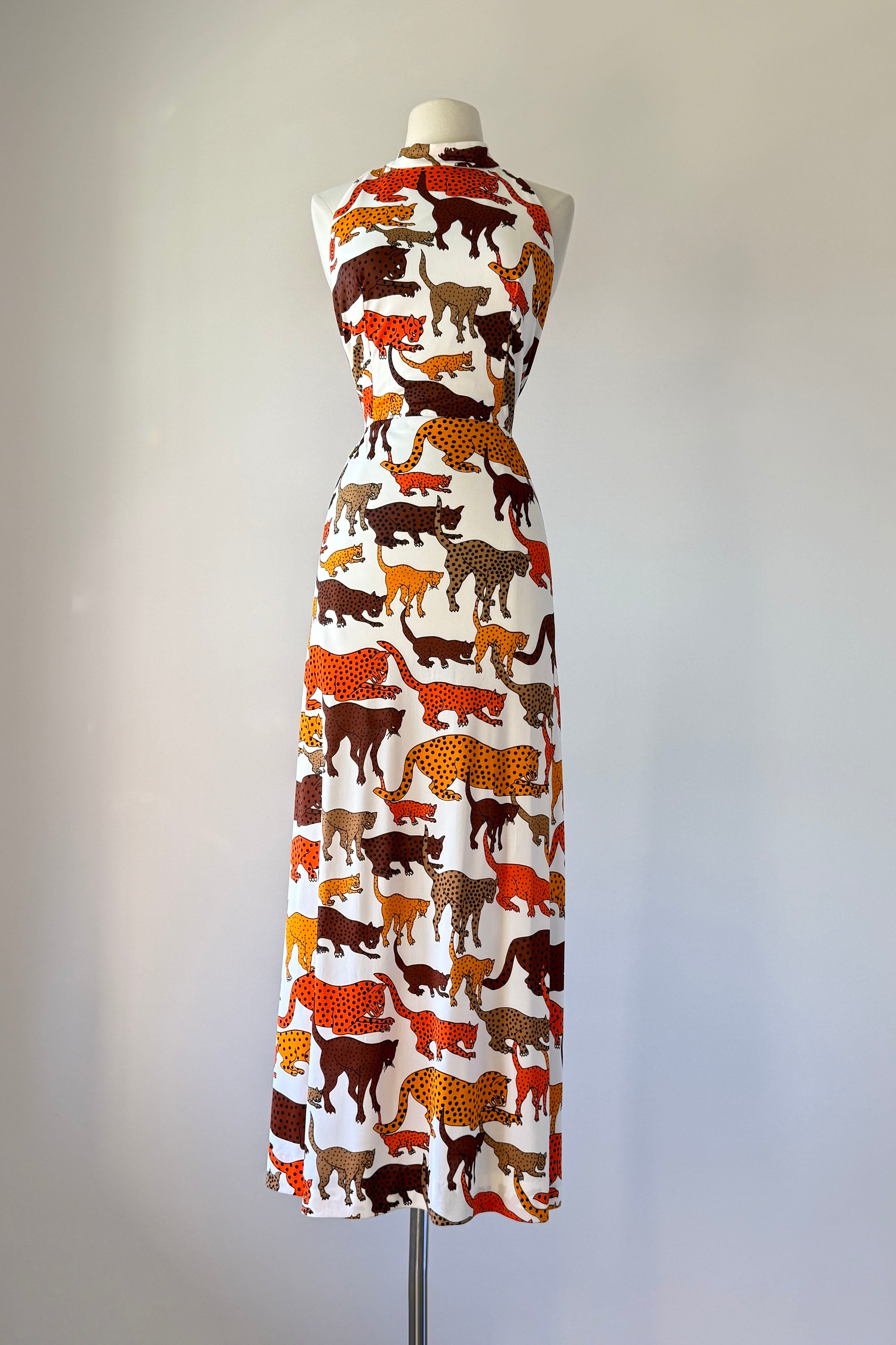 VINTAGE DRESSVintage 1970s dress. Features bold wild cat animal print, open back, tie waist, deep slits at each side. Poly.Excellent condition. SMALL. Length 57Bodice 17Bust 36Waist 28 untiedHip up to 46As with all vintage, please expect wear consistent with age. All sales are final. No order cancellations.0868 | 2609