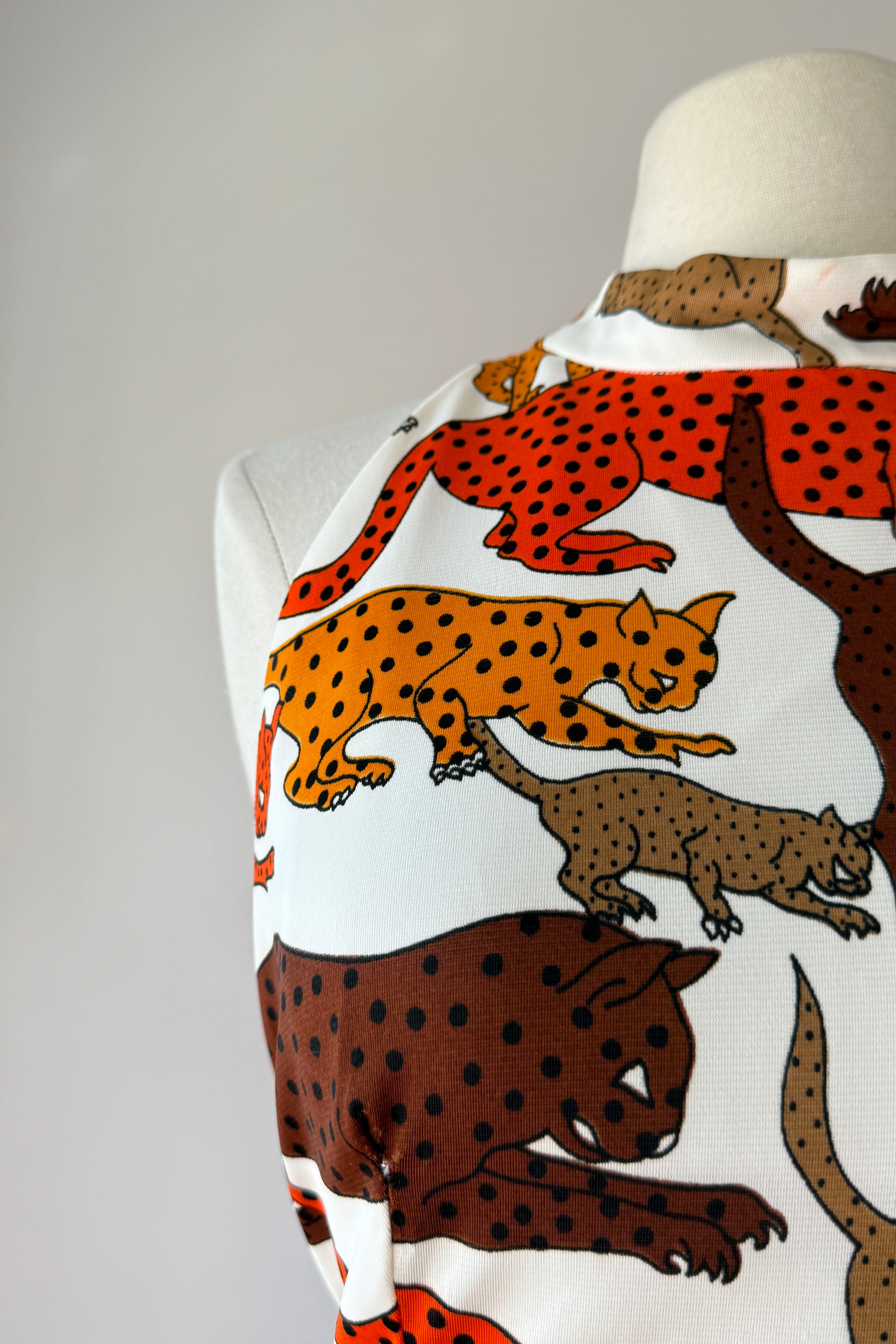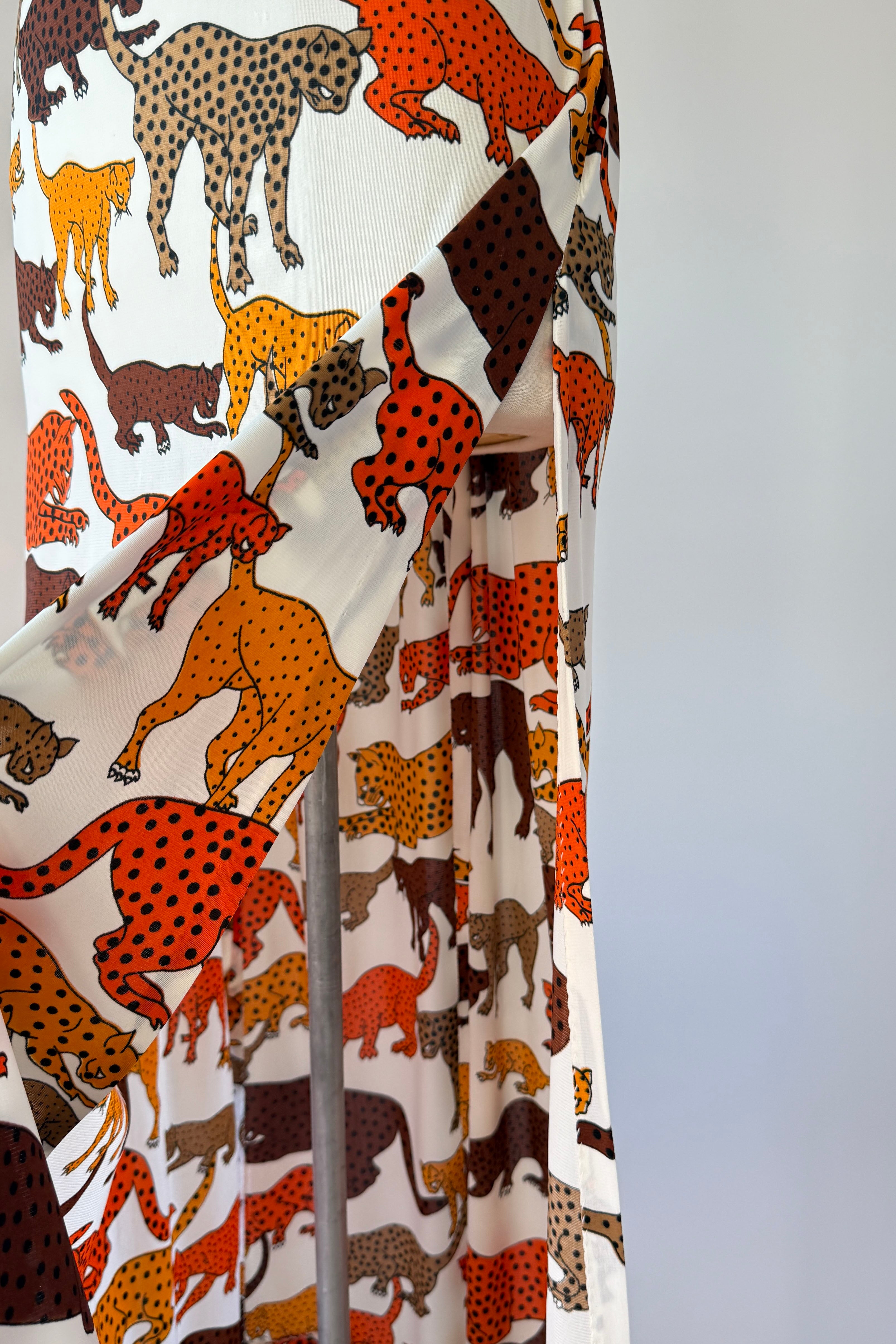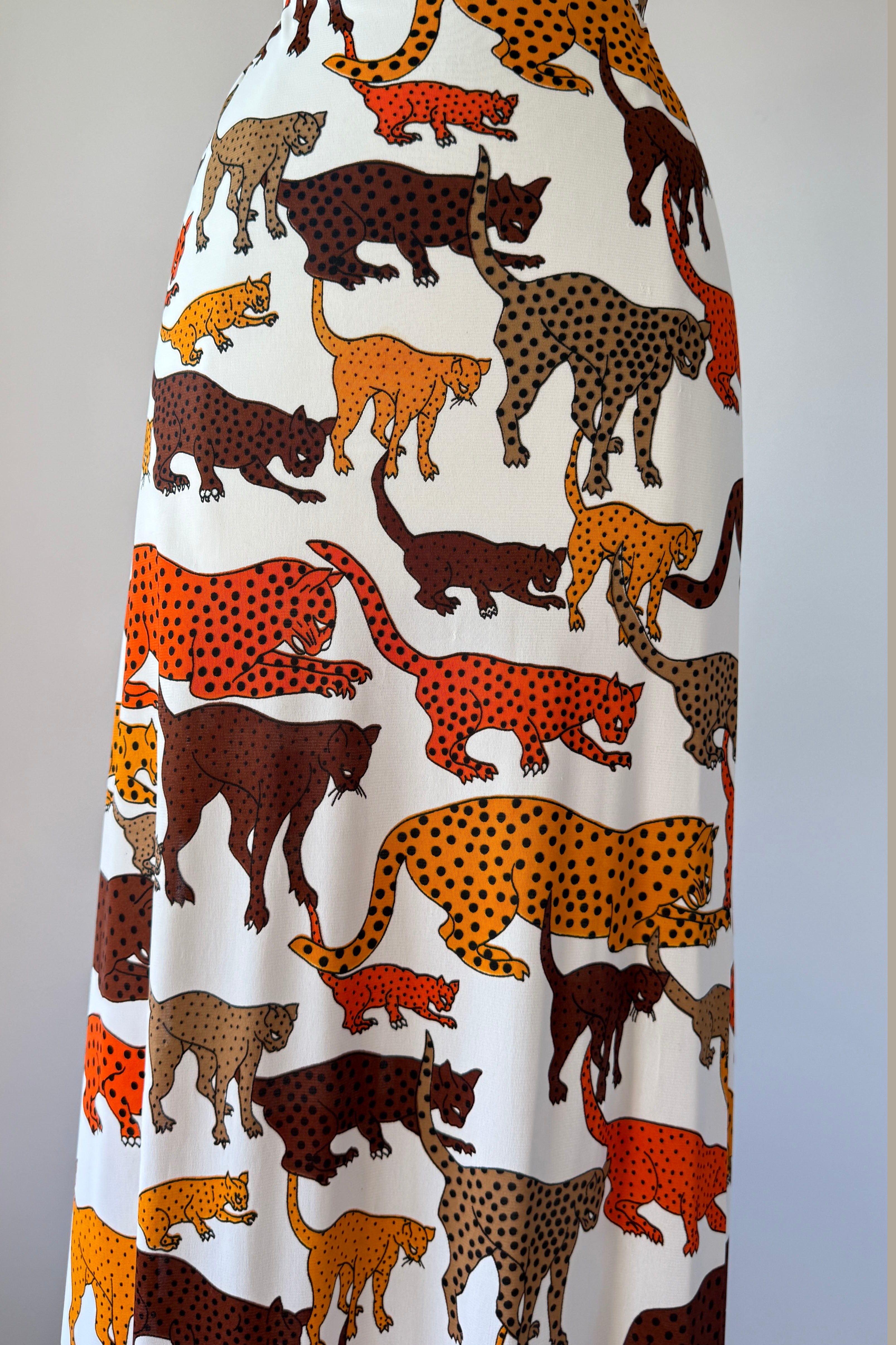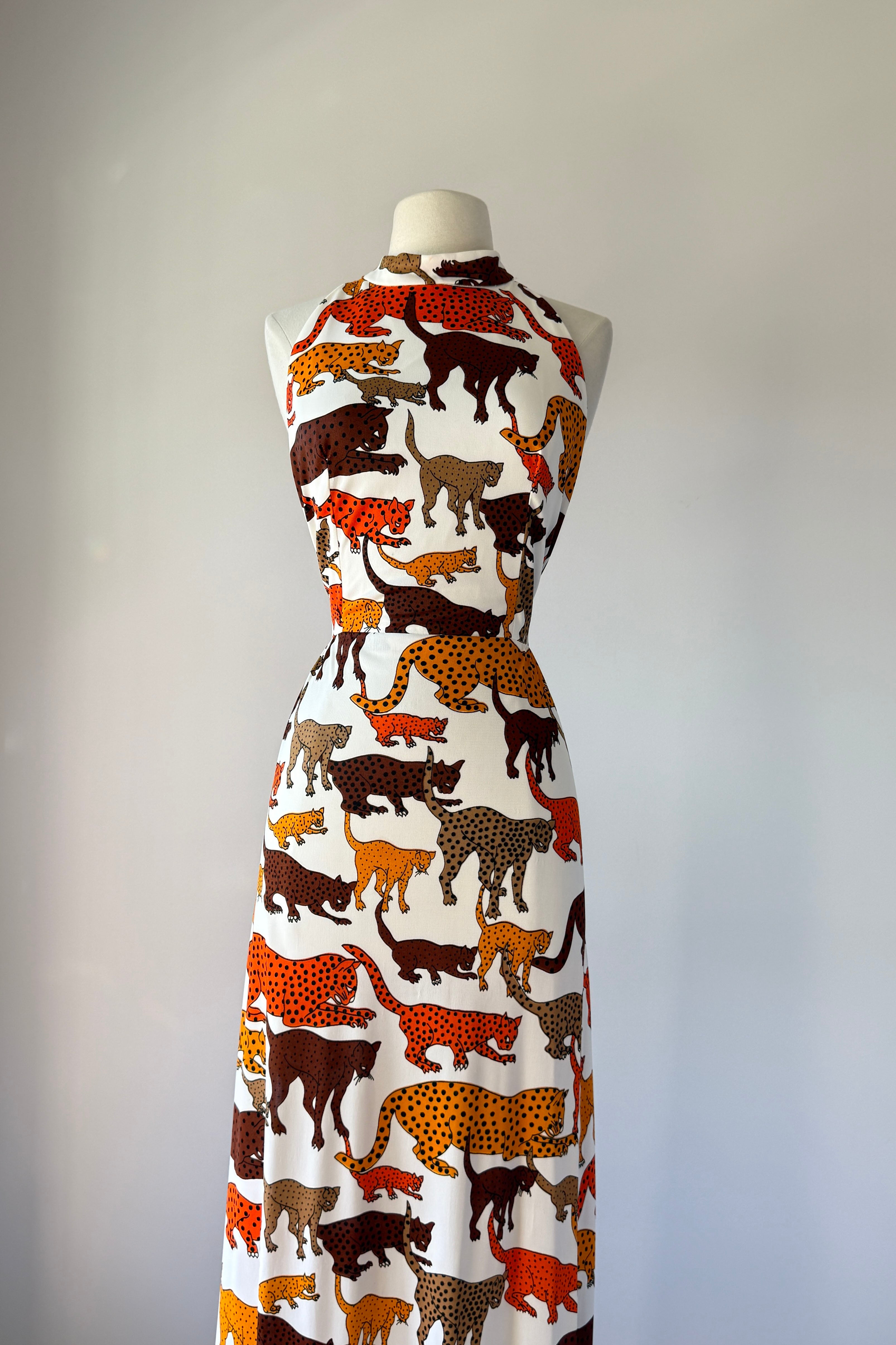 VINTAGE DRESSVintage 1970s dress. Features bold wild cat animal print, open back, tie waist, deep slits at each side. Poly.Excellent condition. SMALL. Length 57Bodice 17Bust 36Waist 28 untiedHip up to 46As with all vintage, please expect wear consistent with age. All sales are final. No order cancellations.0868 | 2609