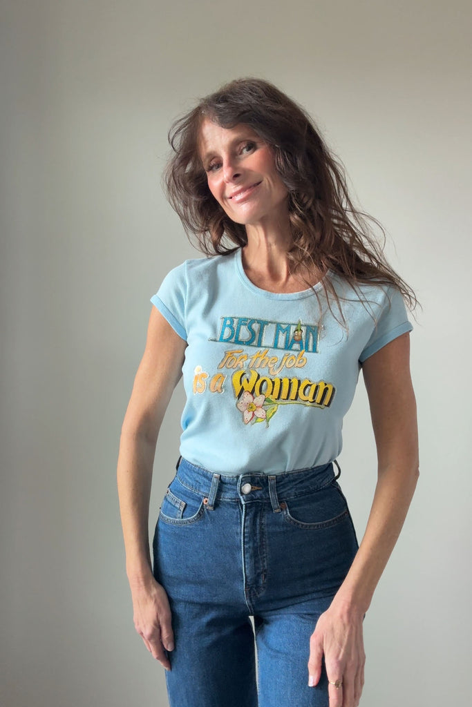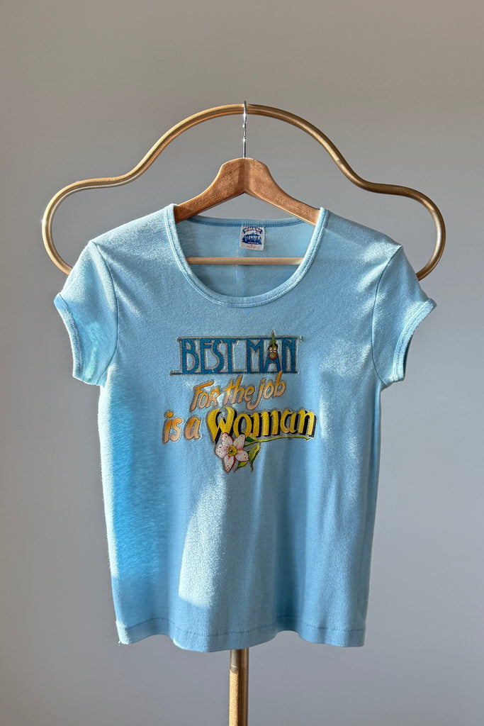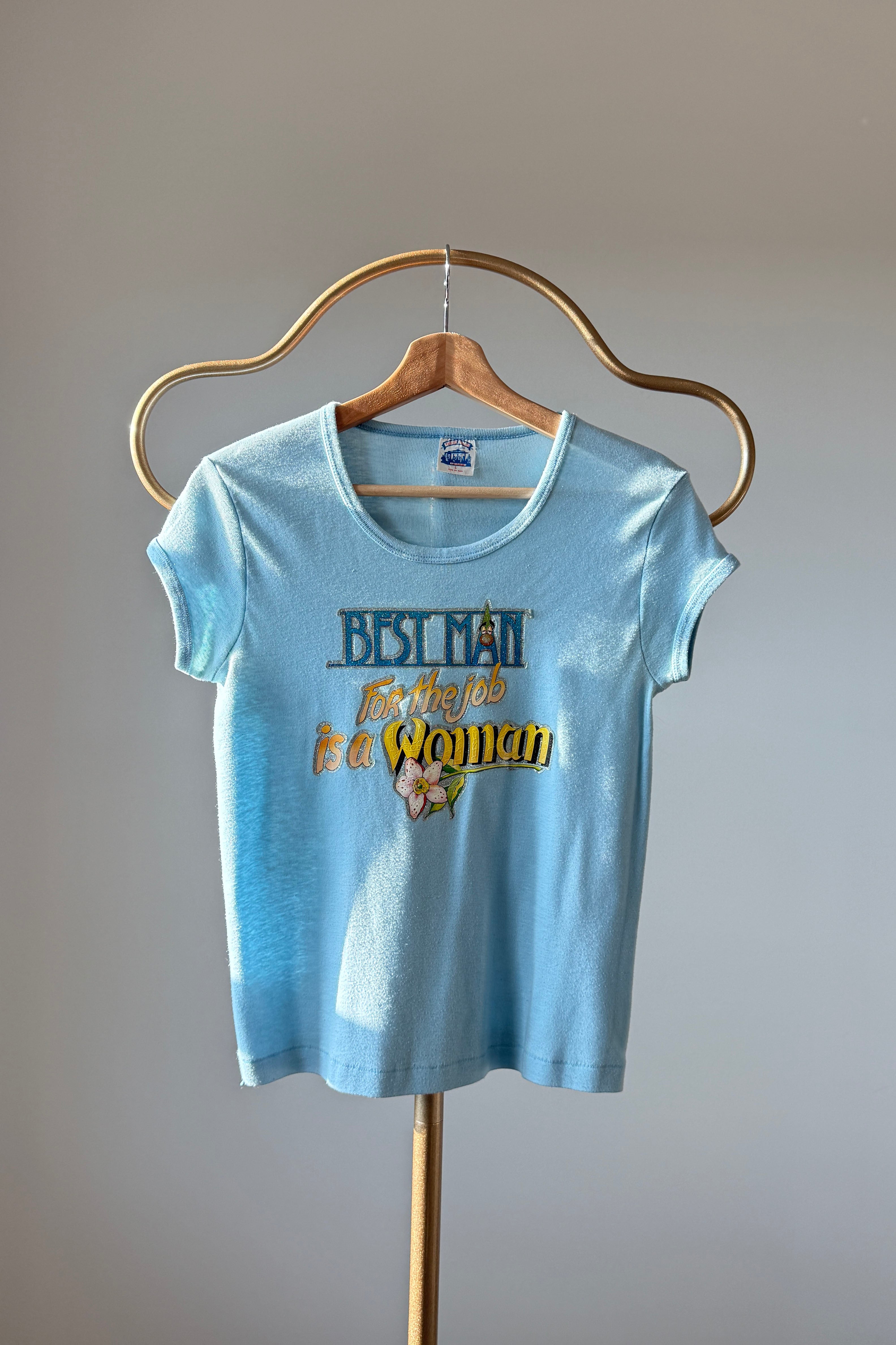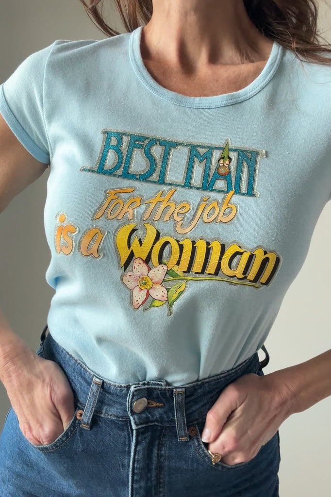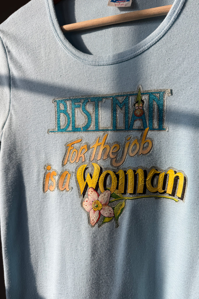 Powder blue cotton tee with glitter screenprint graphic: “Best man for the job is a woman”. Short sleeves, crew neckline.
