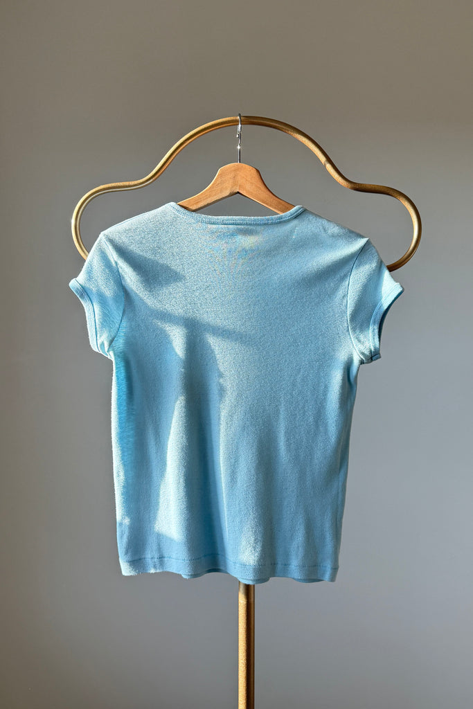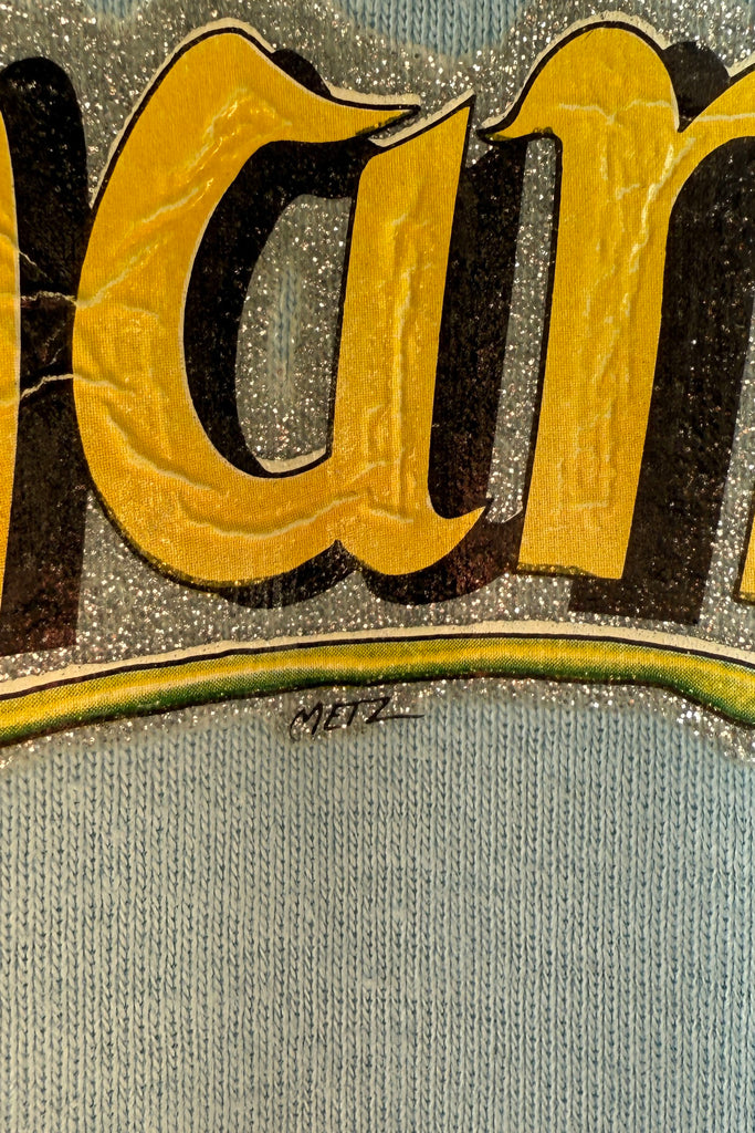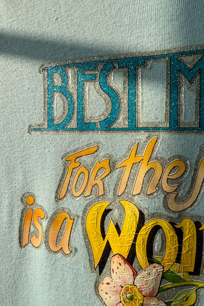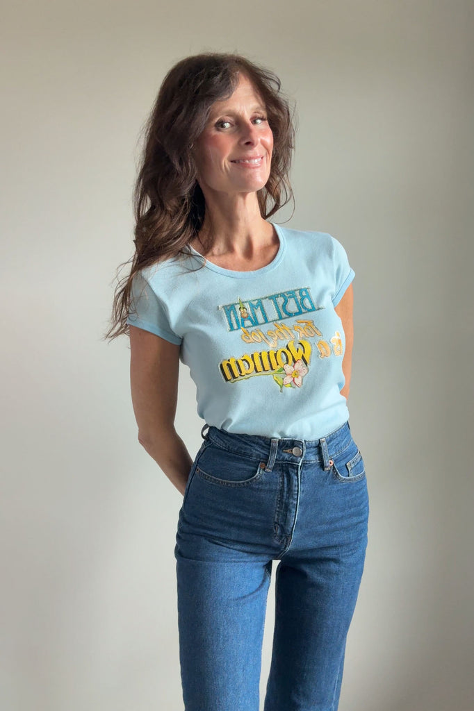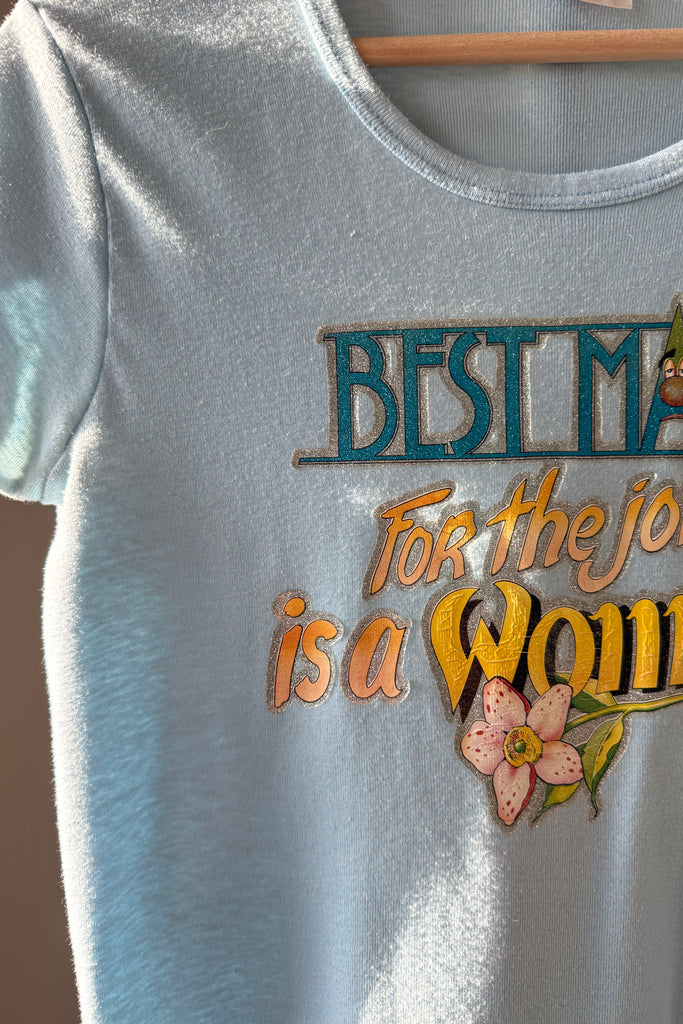 Powder blue cotton tee with glitter screenprint graphic: “Best man for the job is a woman”. Short sleeves, crew neckline.