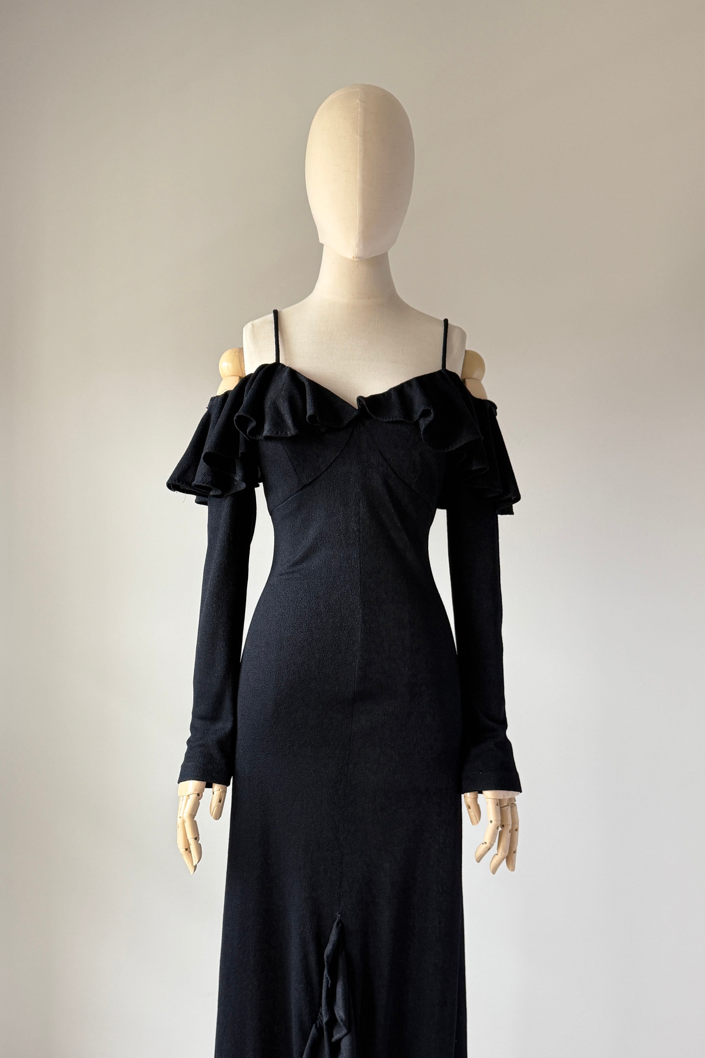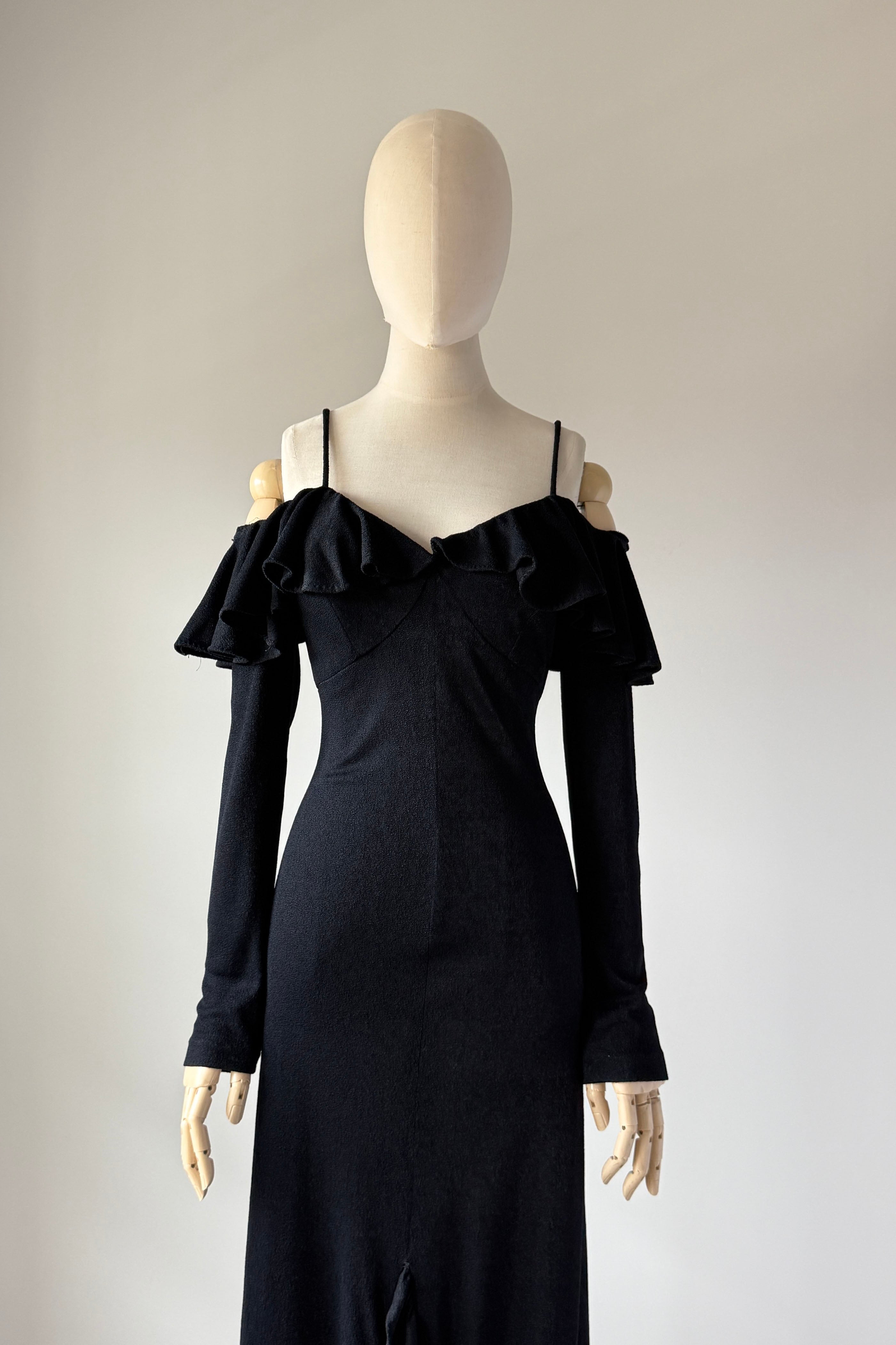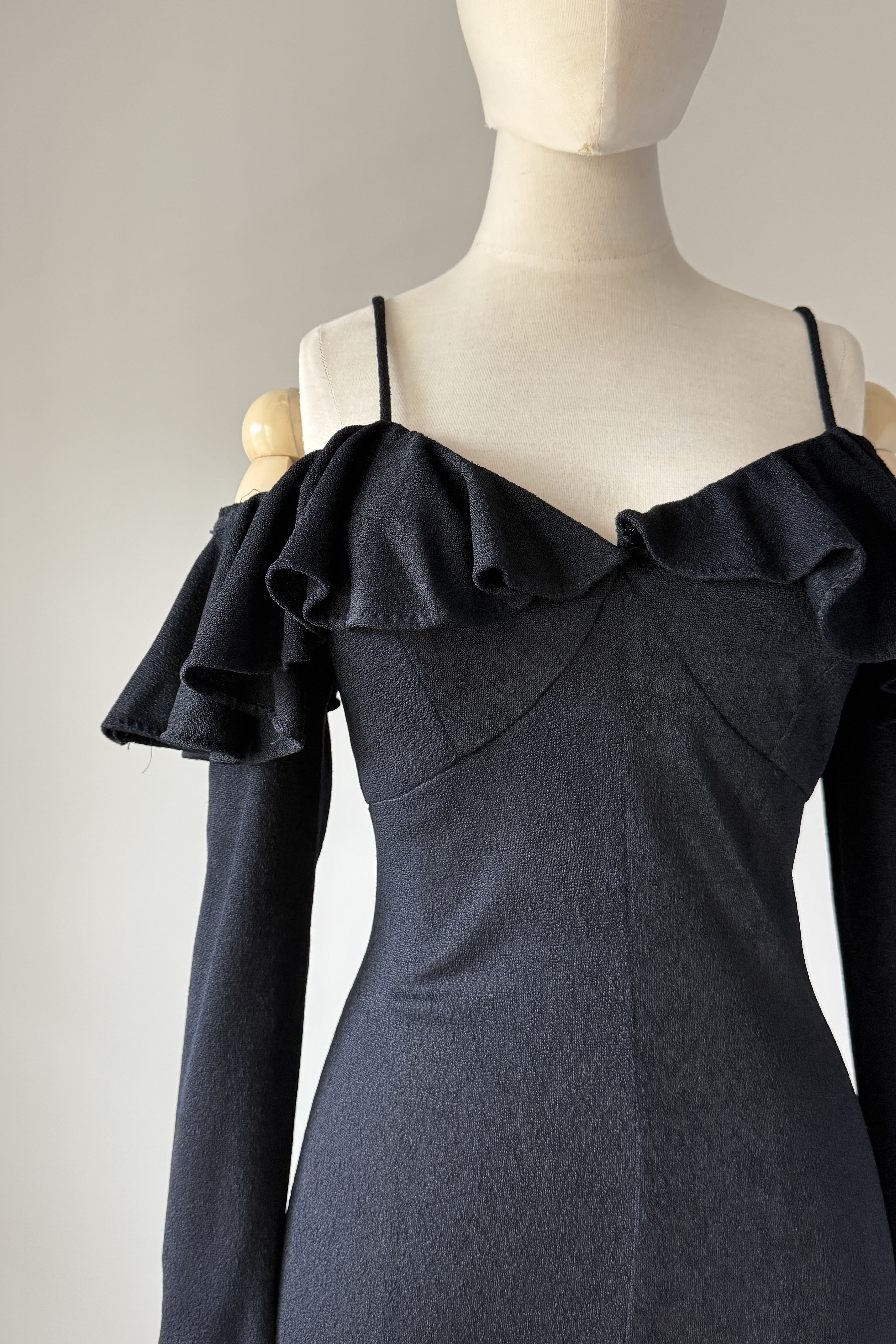 VINTAGE DRESSVintage 1970s dress. Features black stretchy polyester with a bit of texture, off shoulder design, ruffle at shoulders and front slit at hem. Back zipper. By Can't Miss.Excellent condition. Freshly cleaned and ready to wear.S/M. Length 58Bodice 14Bust 36-38Waist 26-30Hip up to 42As with all vintage, please expect wear consistent with age. All sales are final. No order cancellations.0789 | 2608