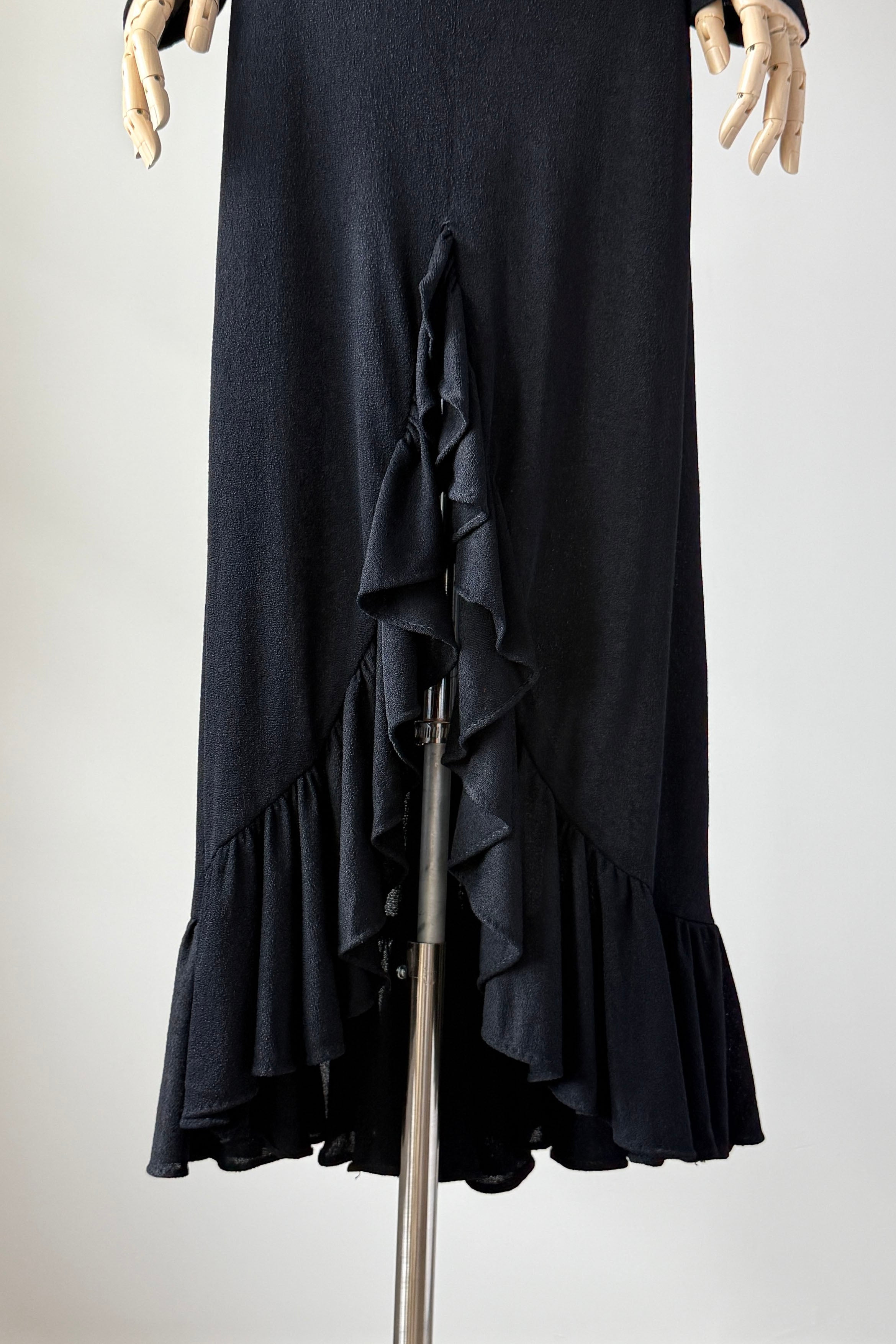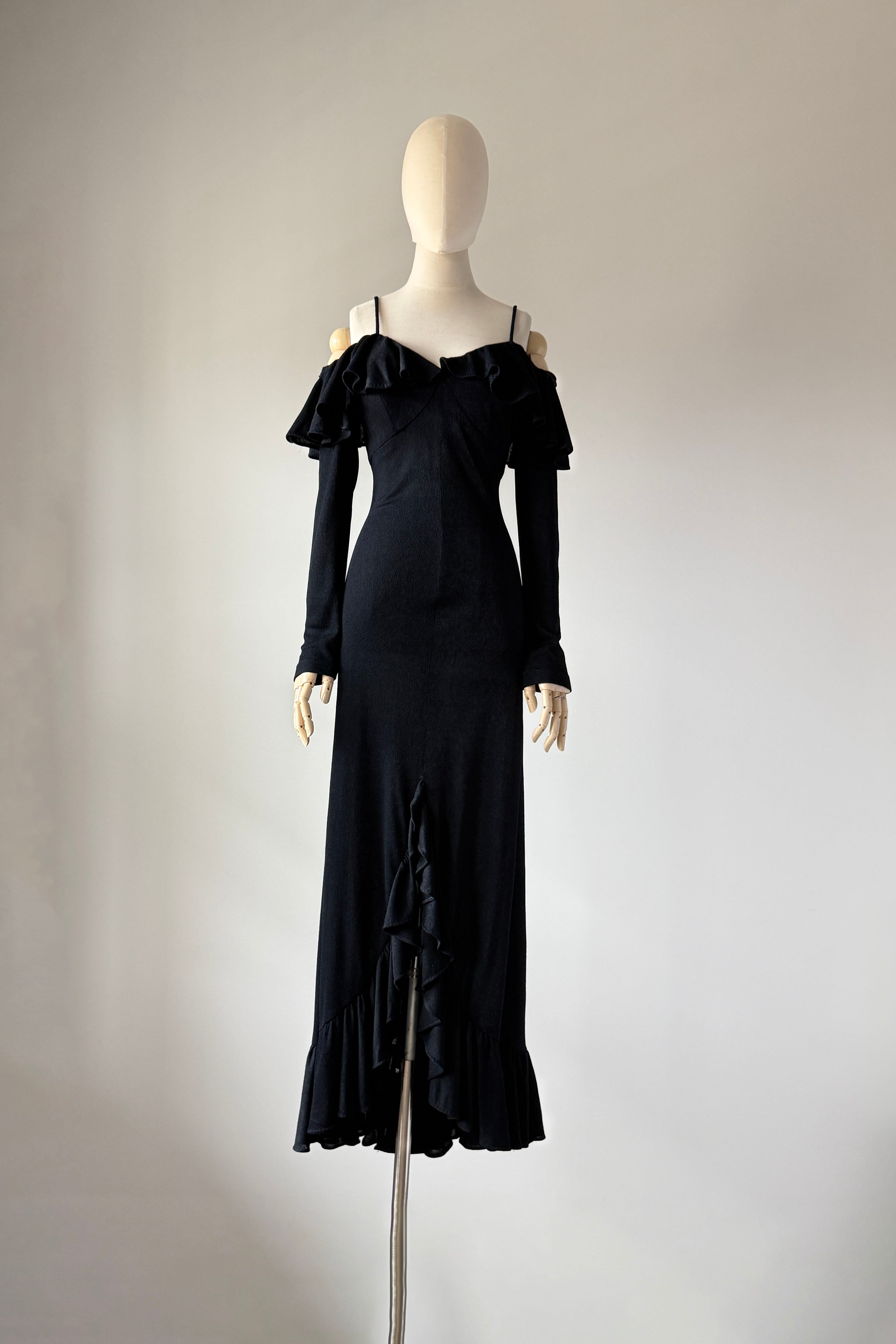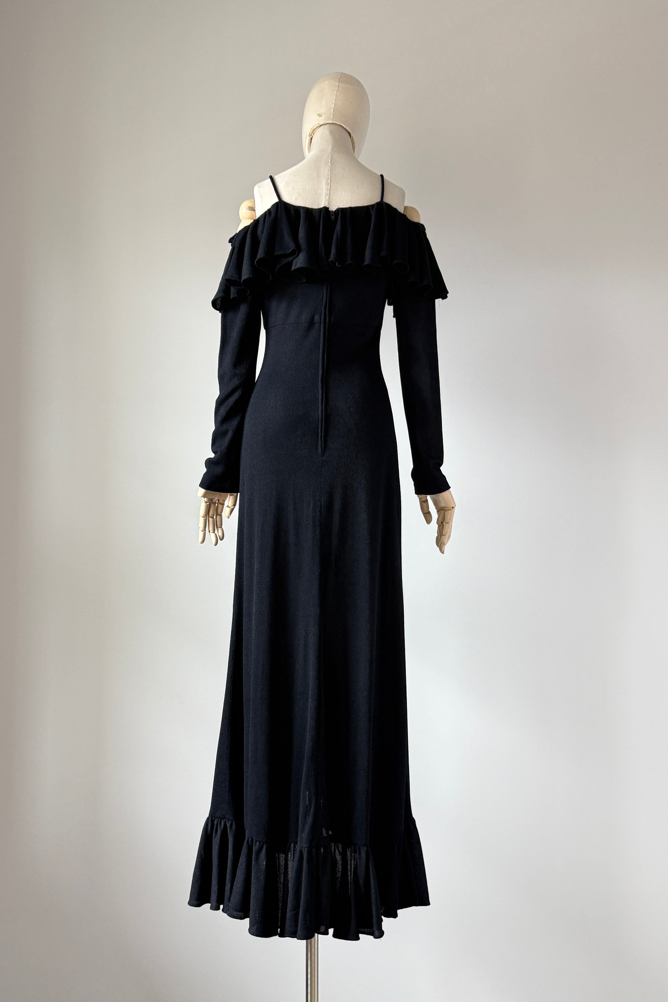 VINTAGE DRESSVintage 1970s dress. Features black stretchy polyester with a bit of texture, off shoulder design, ruffle at shoulders and front slit at hem. Back zipper. By Can't Miss.Excellent condition. Freshly cleaned and ready to wear.S/M. Length 58Bodice 14Bust 36-38Waist 26-30Hip up to 42As with all vintage, please expect wear consistent with age. All sales are final. No order cancellations.0789 | 2608