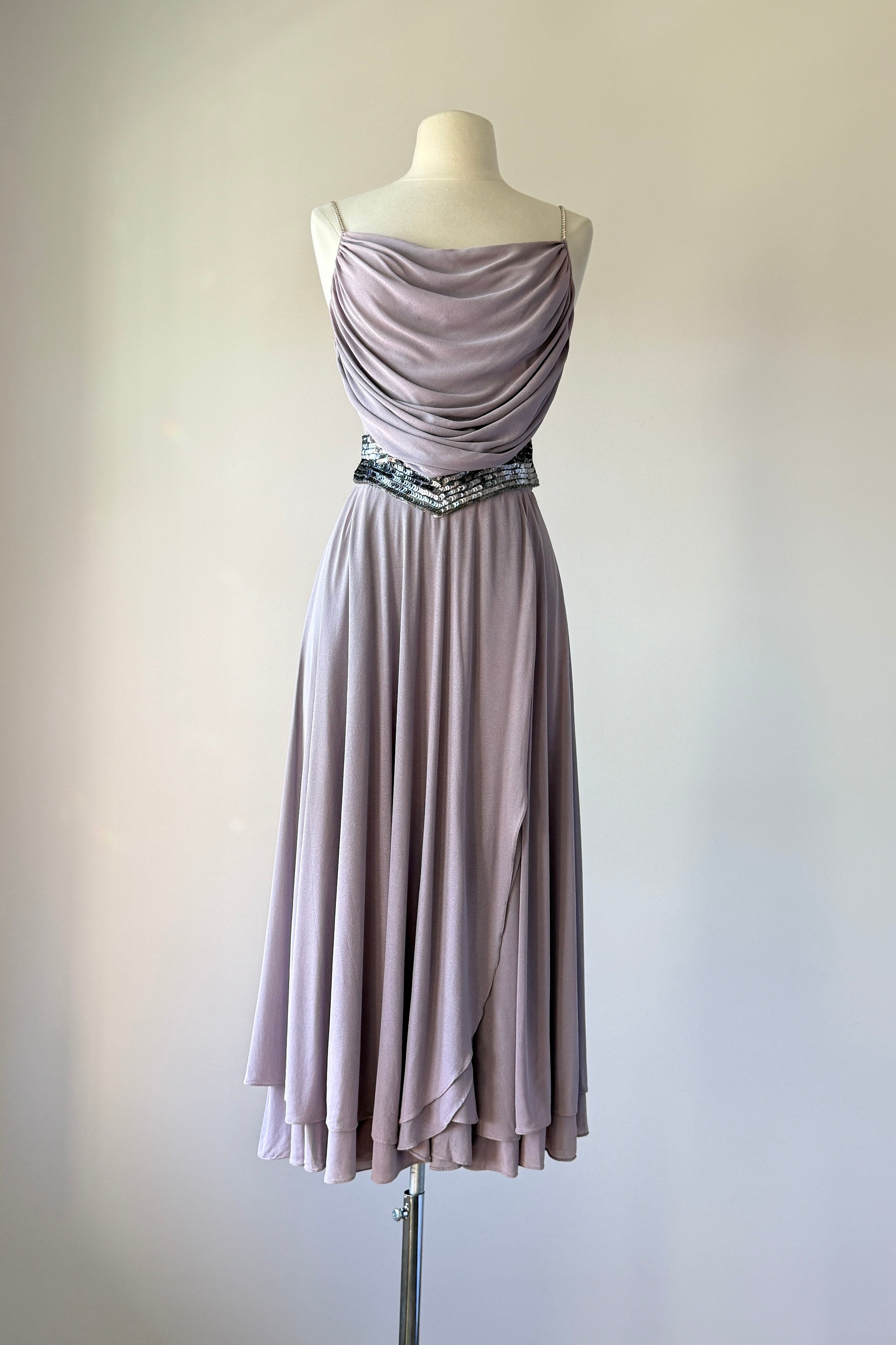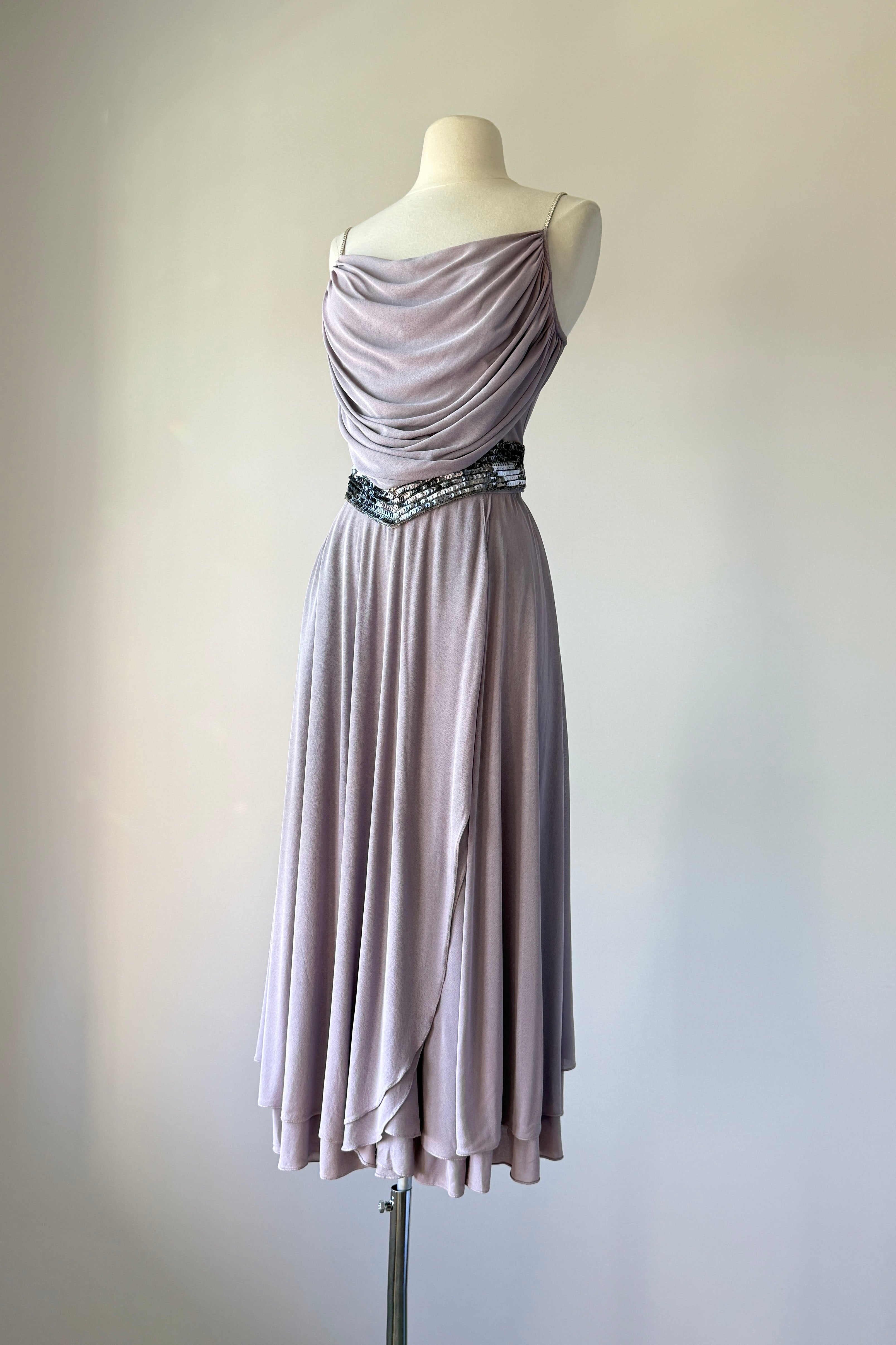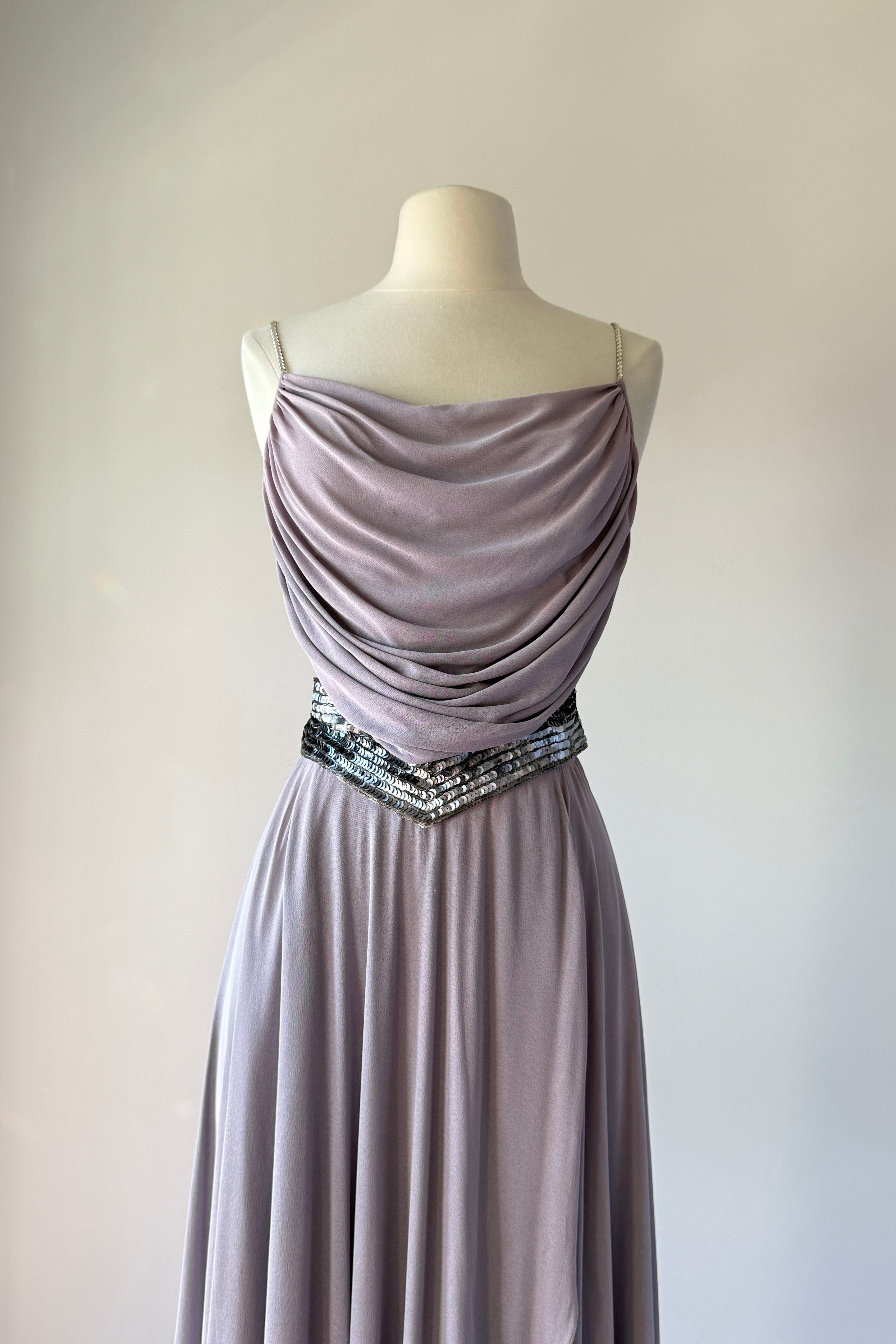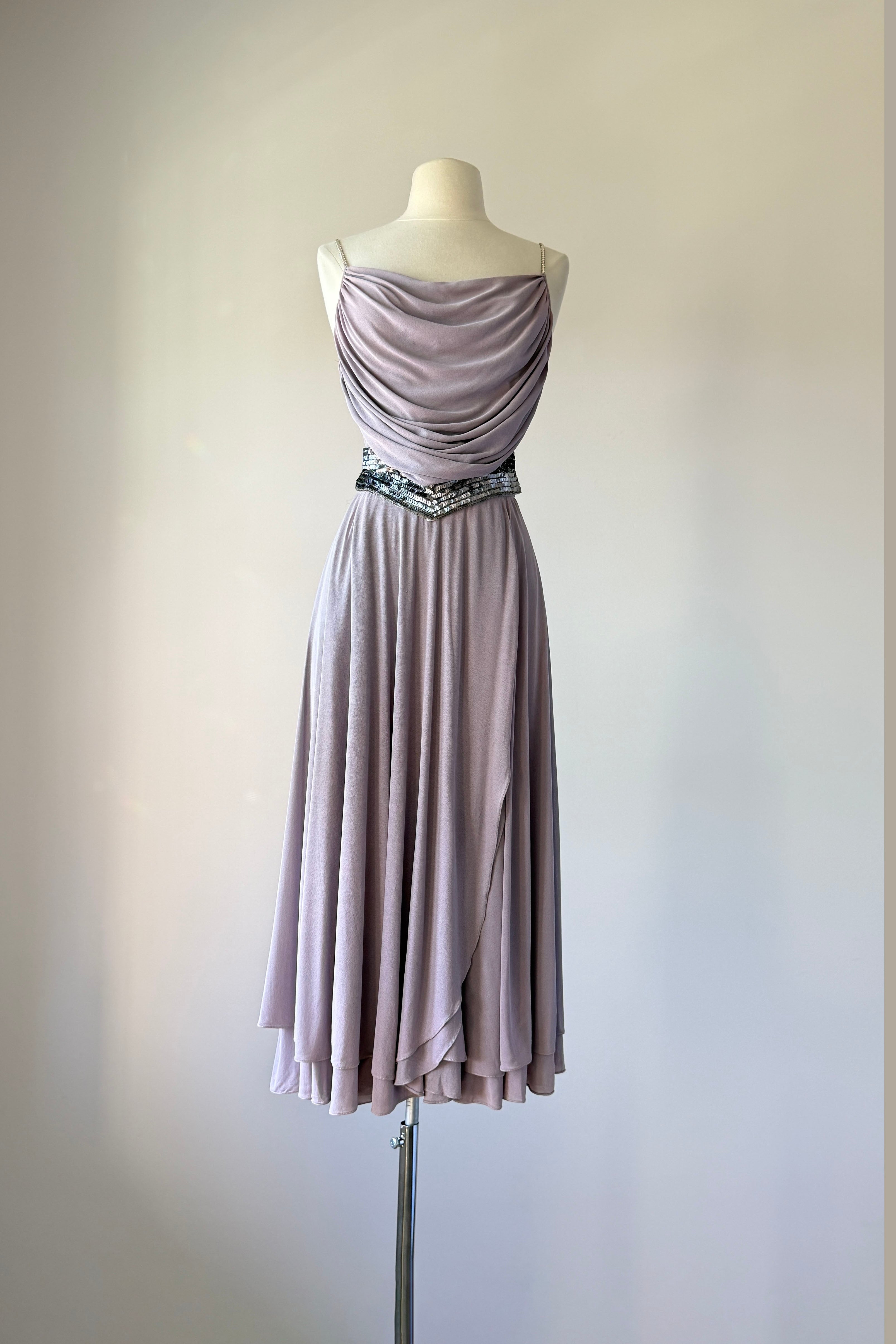 VINTAGE DRESSVintage 1970s dress. Features lilac jersey fabric with stretch, silver sequins waist band, rhinestone straps, back zipper, waist tie. By Roger Milot for Jo-Ed Sophisticates.Excellent condition. One tiny pinhead sized hole back bodice.MEDIUM. Length 50Bodice 17Bust 38Waist 28As with all vintage, please expect wear consistent with age. All sales are final. No order cancellations.0256 | 2609