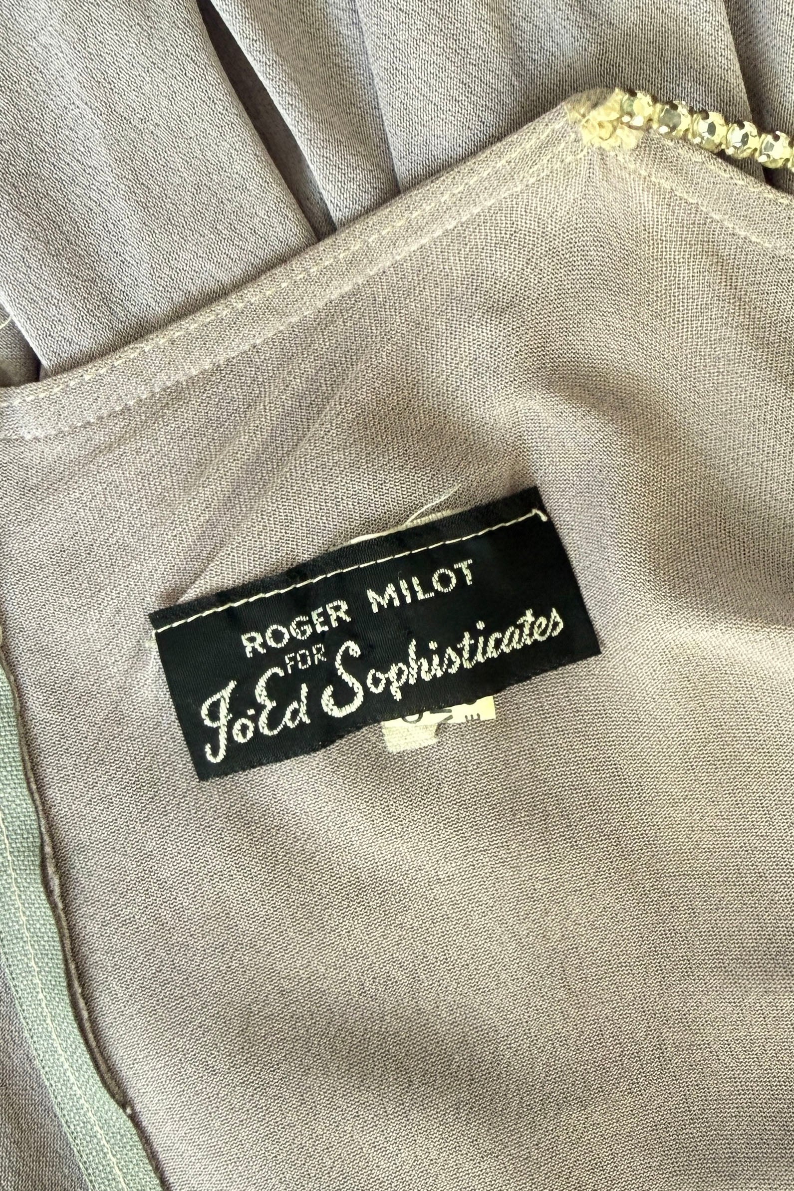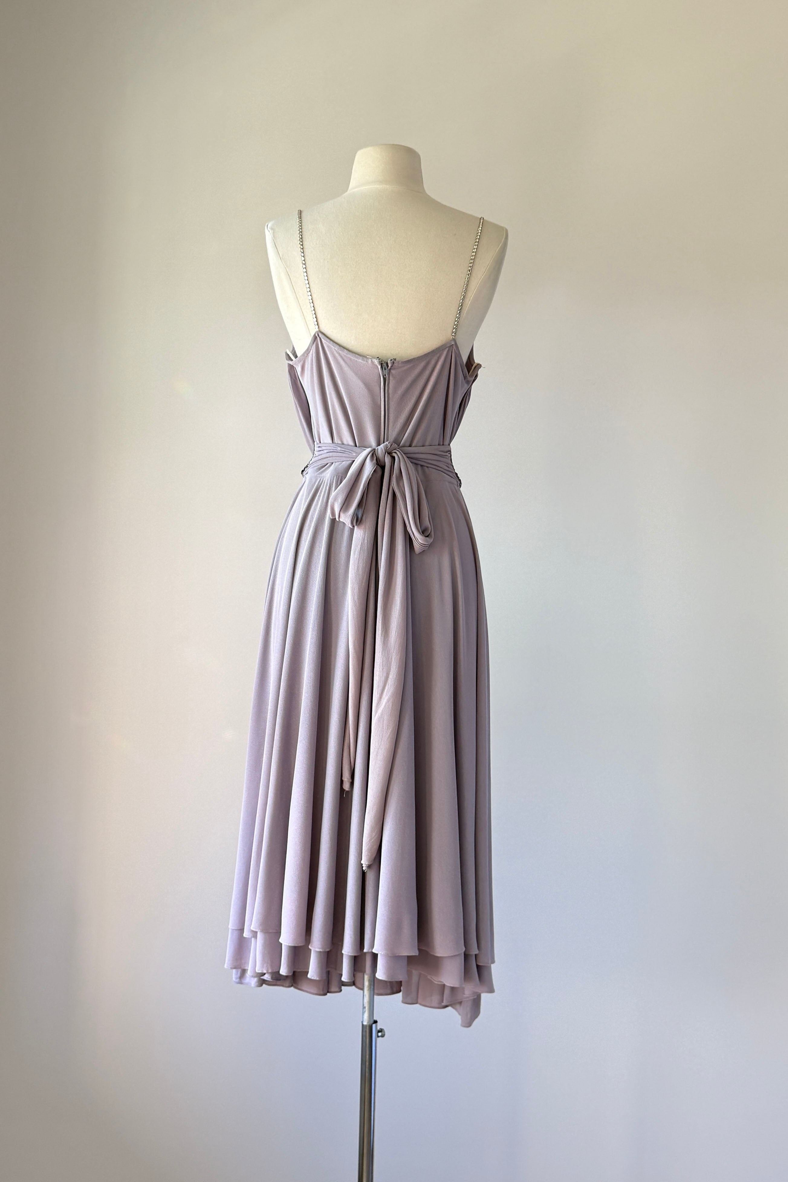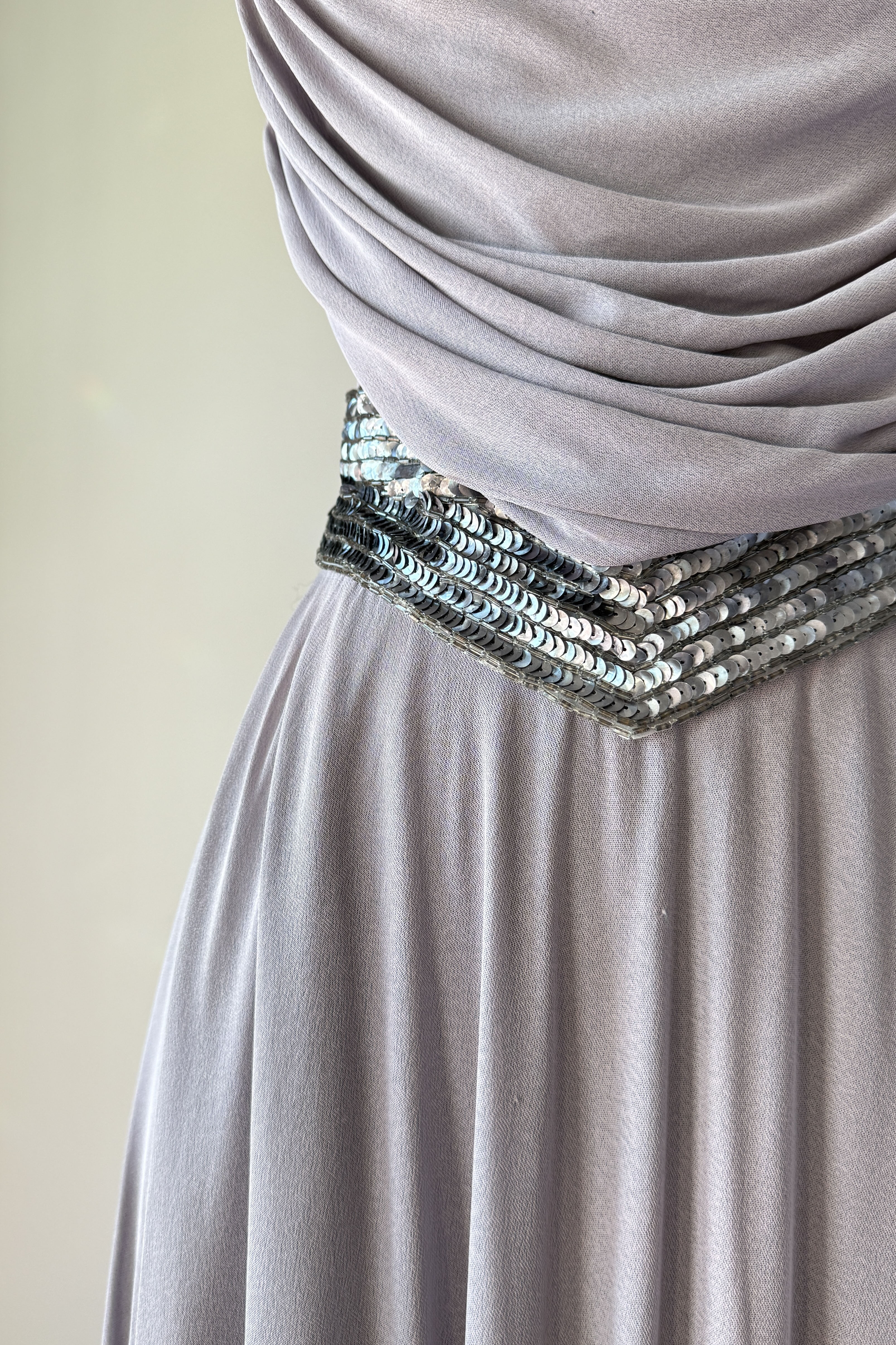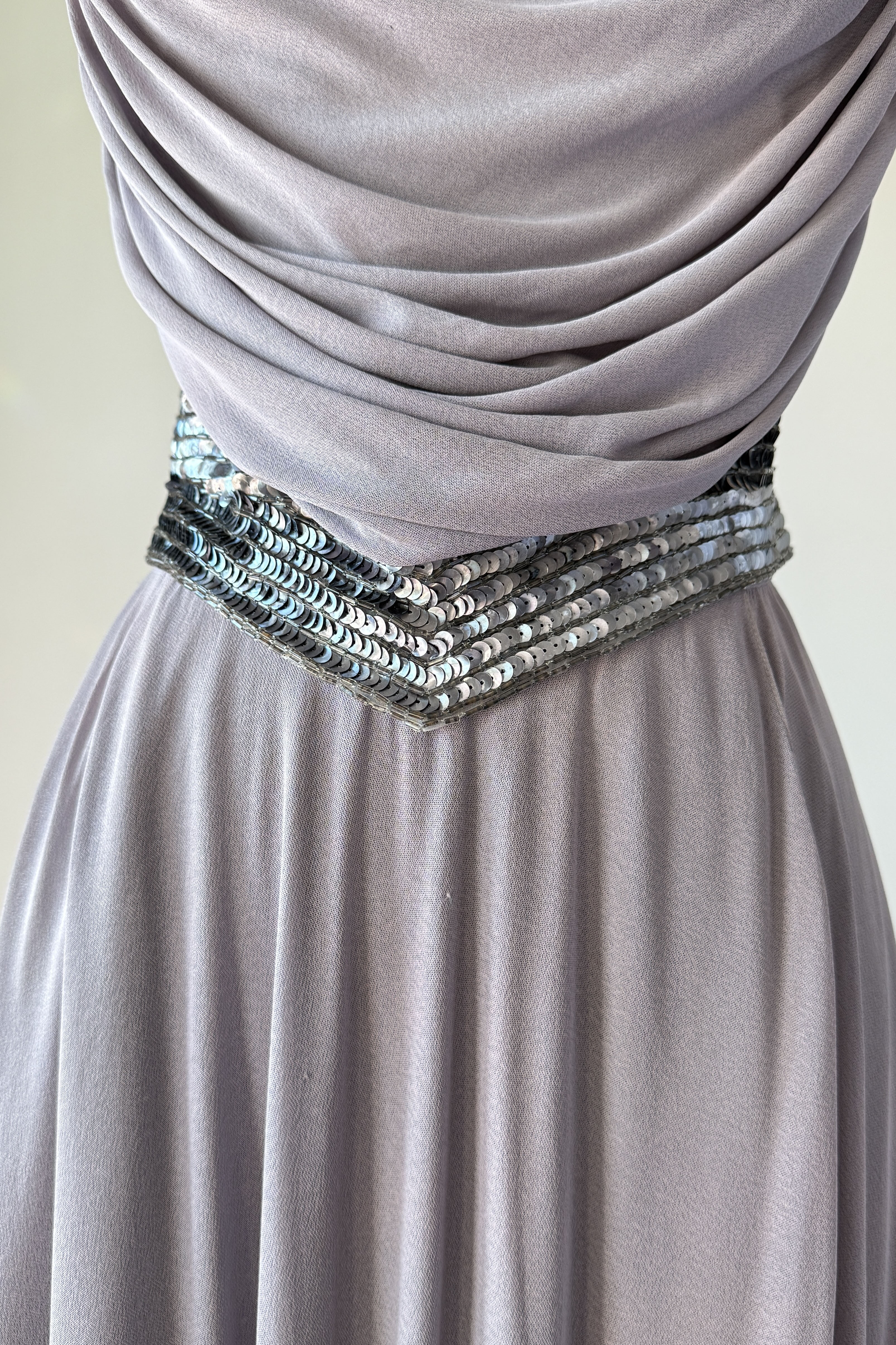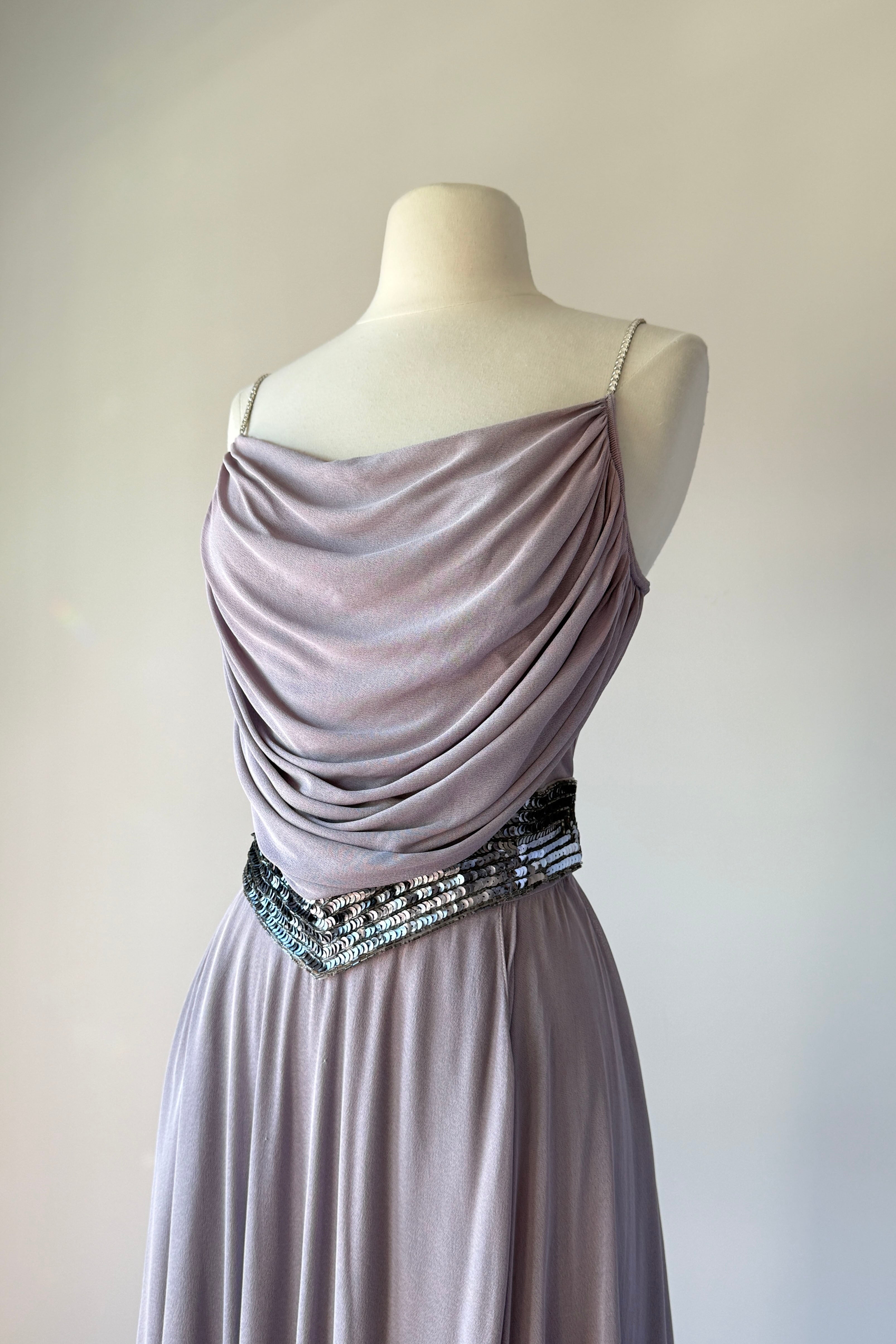 VINTAGE DRESSVintage 1970s dress. Features lilac jersey fabric with stretch, silver sequins waist band, rhinestone straps, back zipper, waist tie. By Roger Milot for Jo-Ed Sophisticates.Excellent condition. One tiny pinhead sized hole back bodice.MEDIUM. Length 50Bodice 17Bust 38Waist 28As with all vintage, please expect wear consistent with age. All sales are final. No order cancellations.0256 | 2609