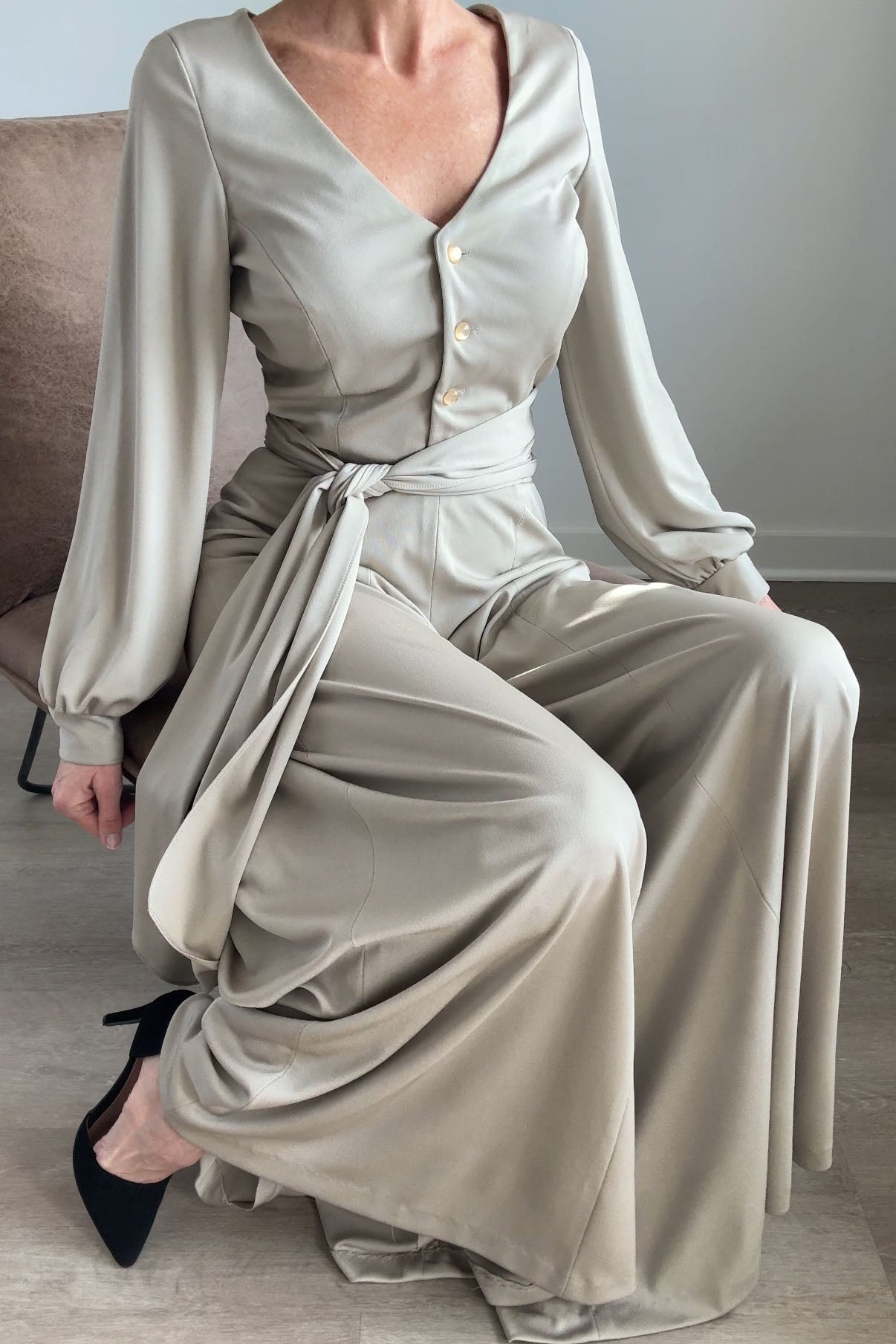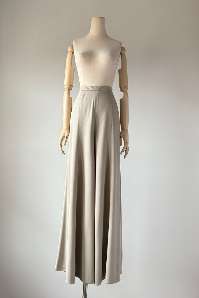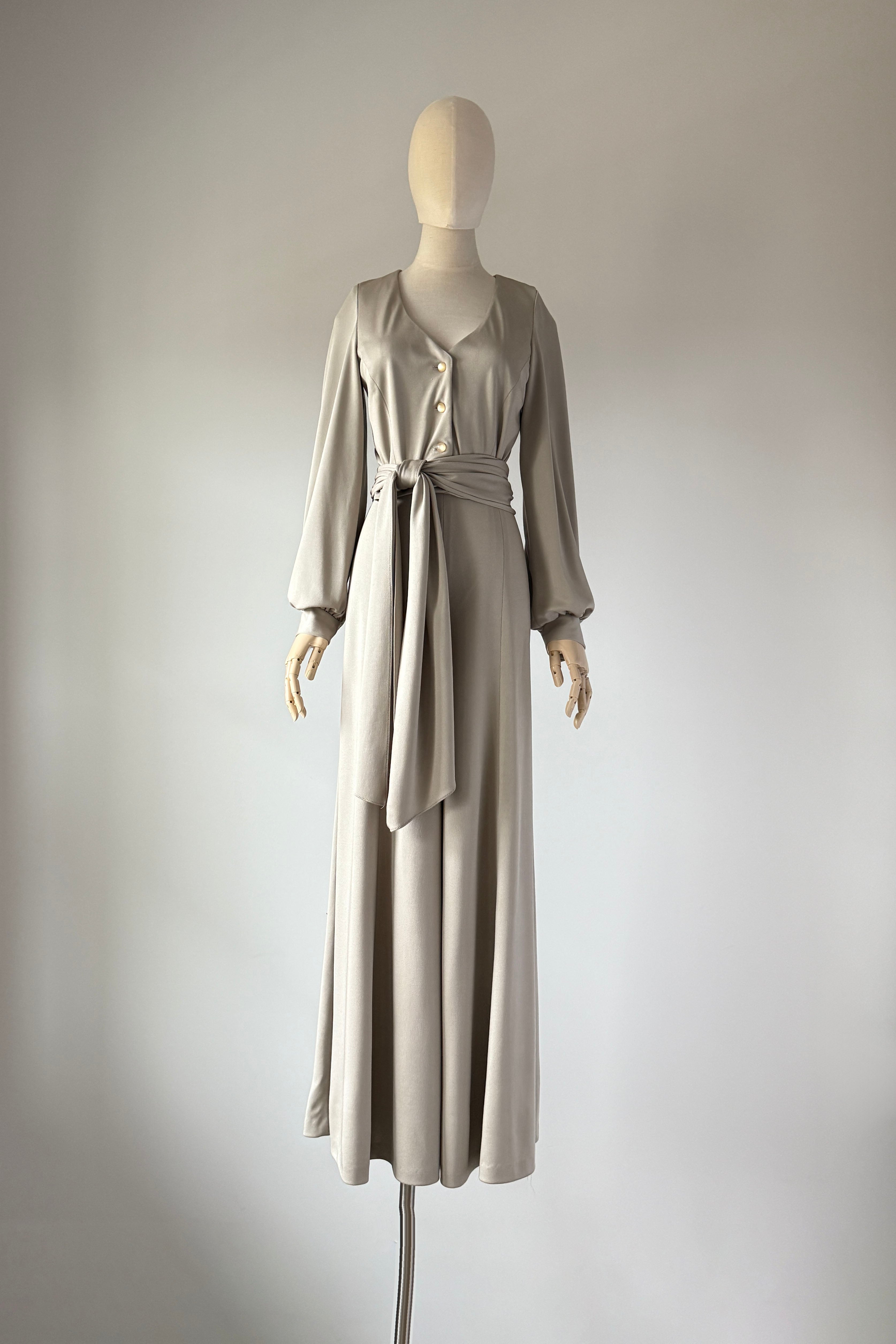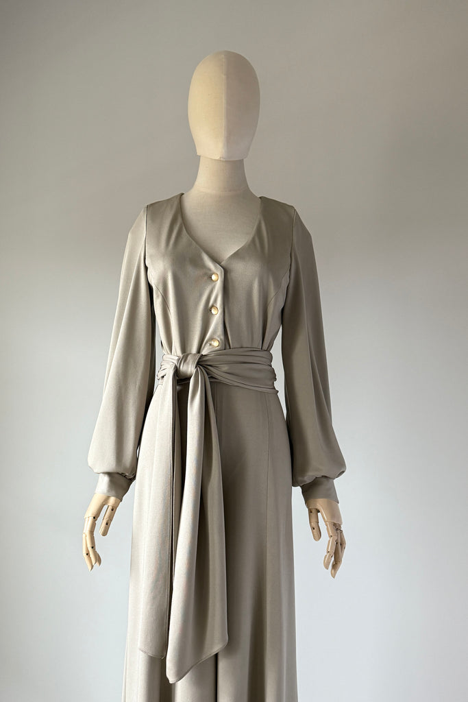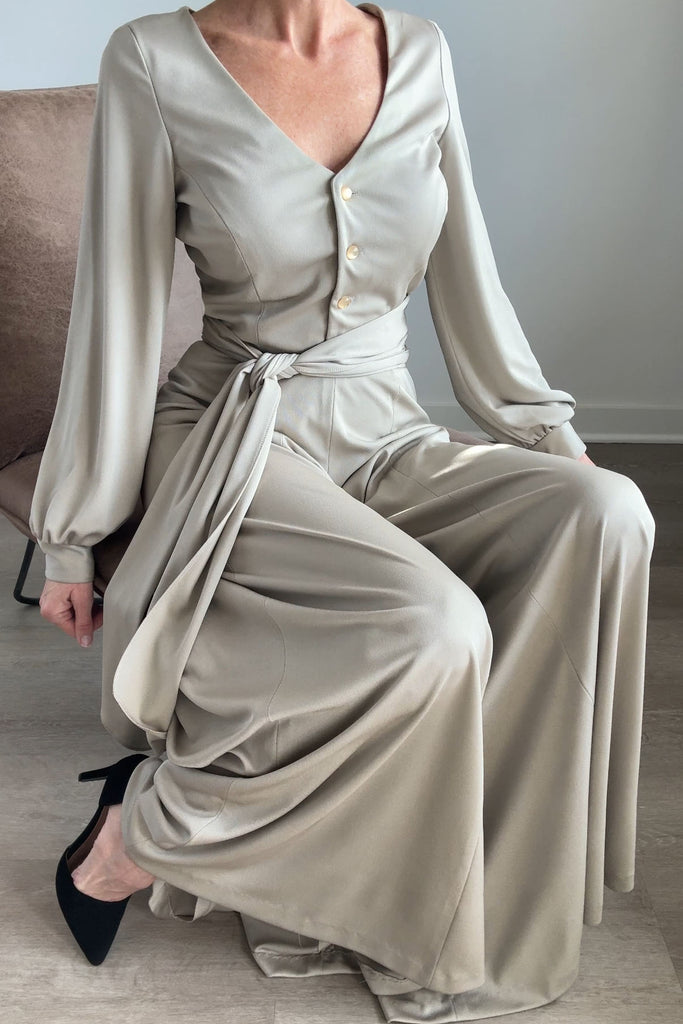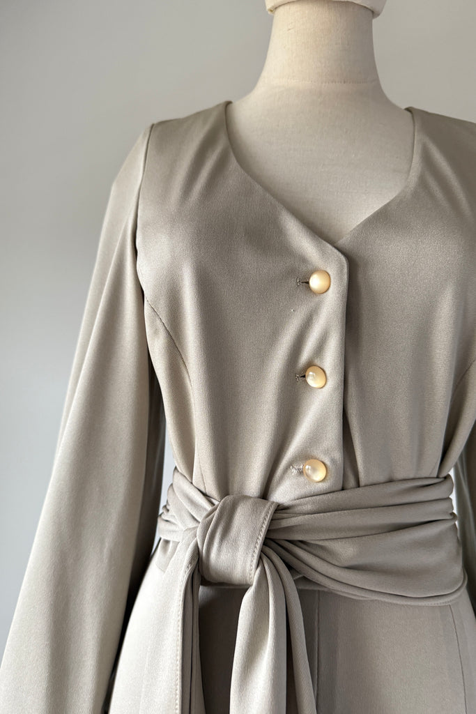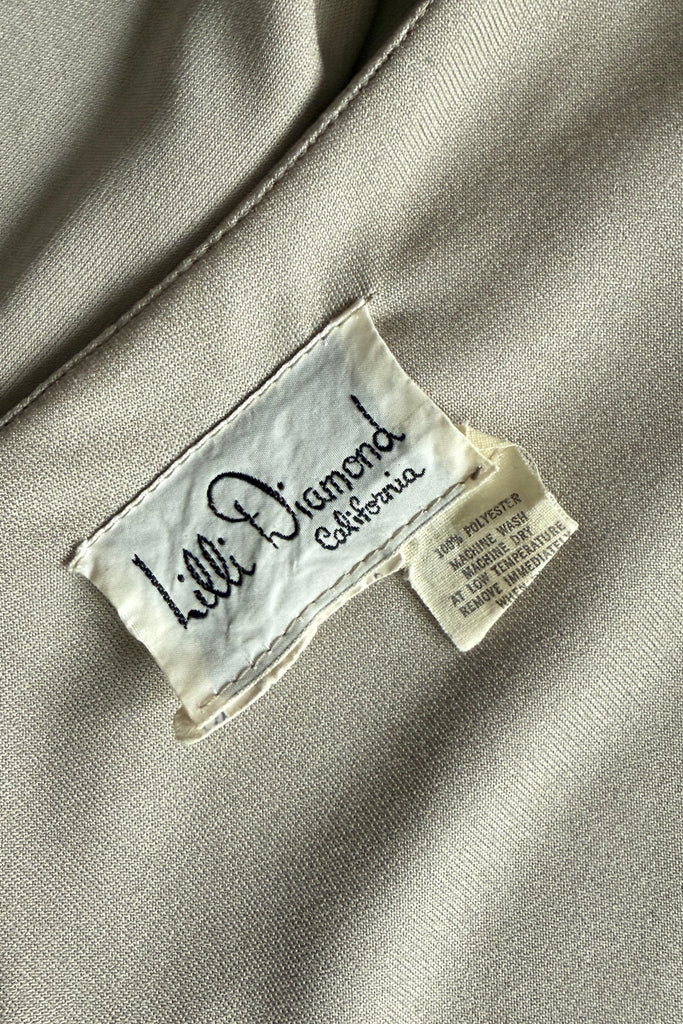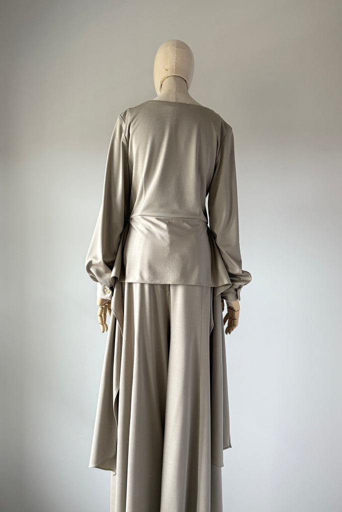 1970s Lilli Diamond California wide-leg palazzo pantsuit in pewter gray, made from a soft, fluid stretch polyester with a subtle sheen. The wrap-style top features a deep V-neckline, pearlized buttons, and an attached wide waist sash that ties dramatically at the front or side. High-waisted trousers zip at the back with a long, sweeping drape and beautiful movement. No flaws. Best fits modern MEDIUMpants — length: 43.5" | waist: 28" | rise: 14" | inseam: 30.5"top — length: 17" | bust: 38–40" | waist: 28–30" Ref 9927 | 2543