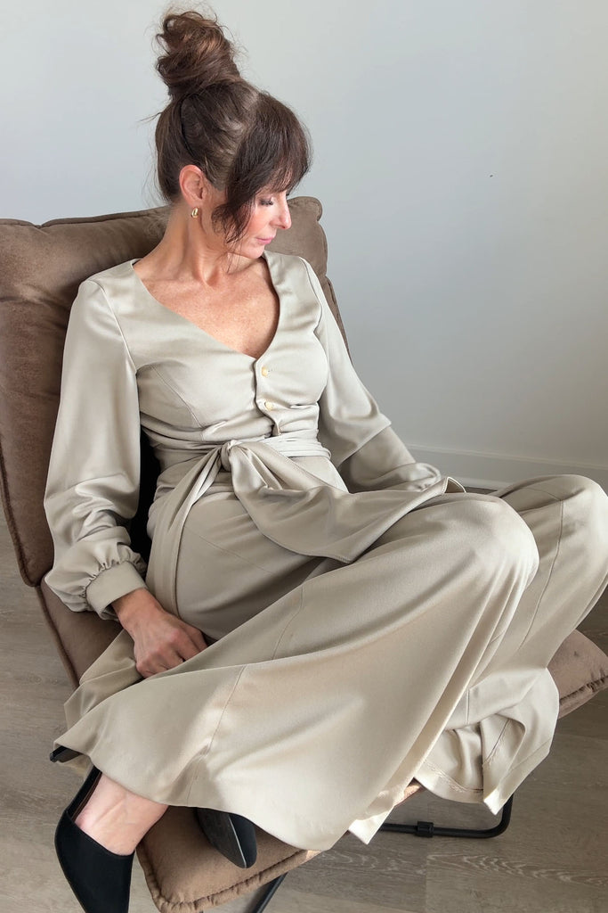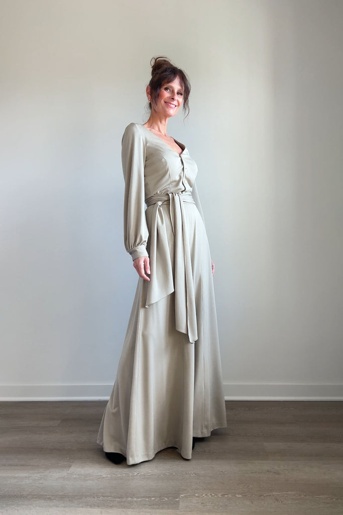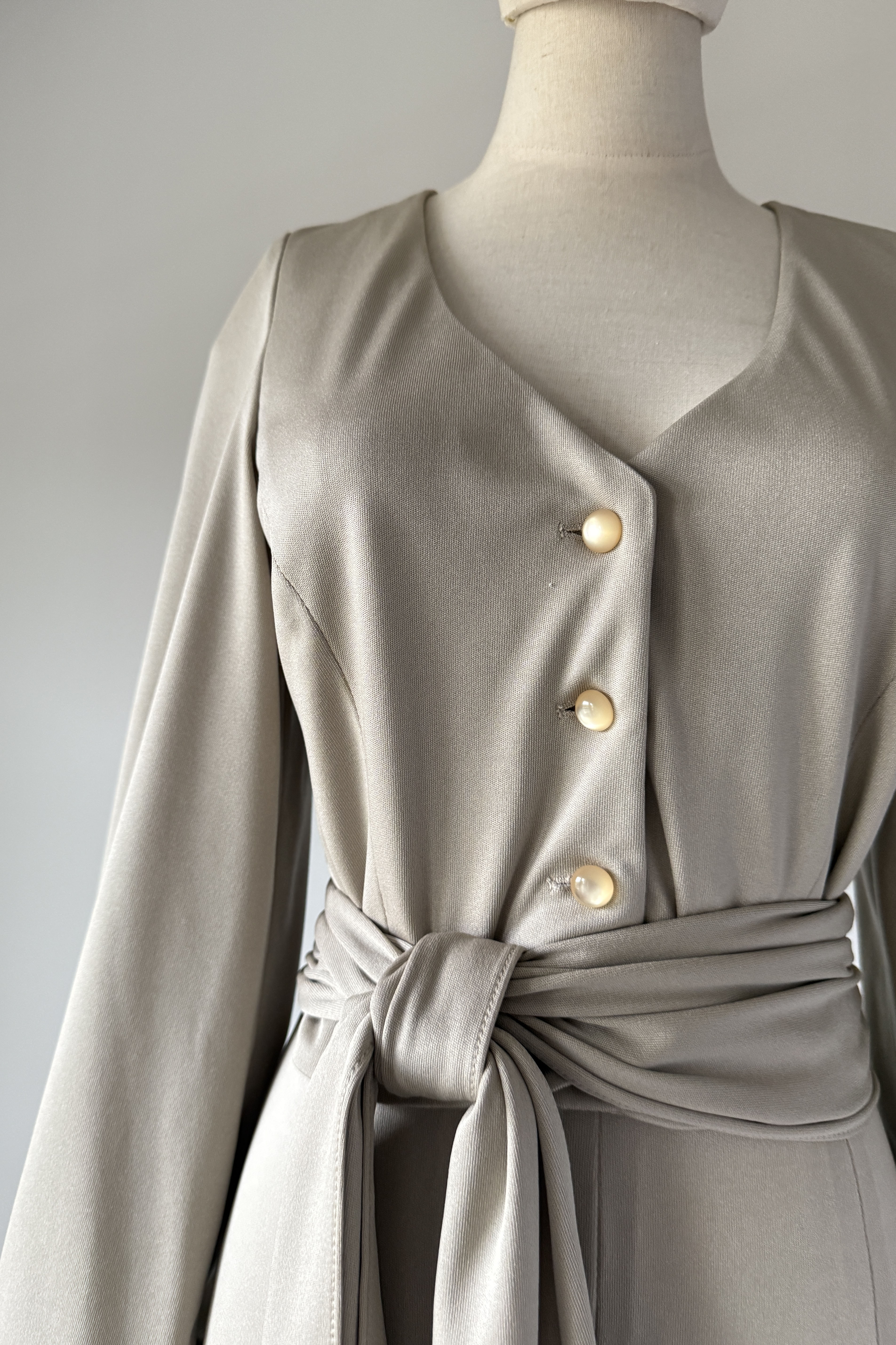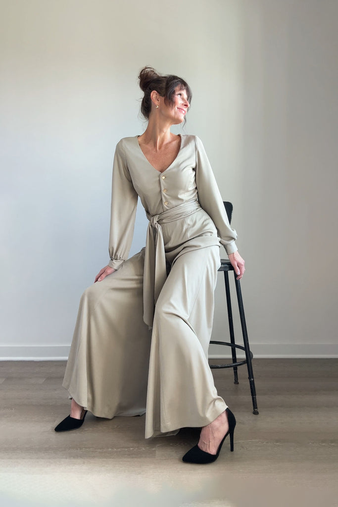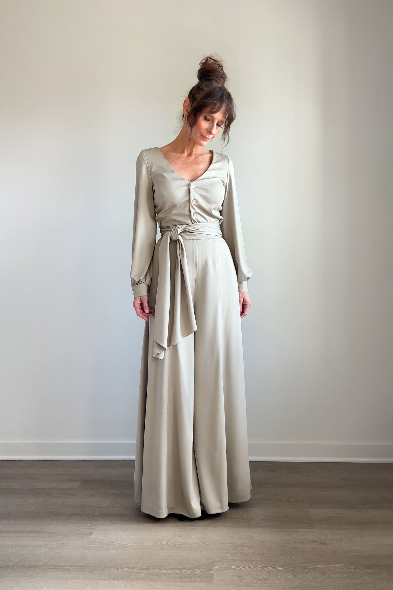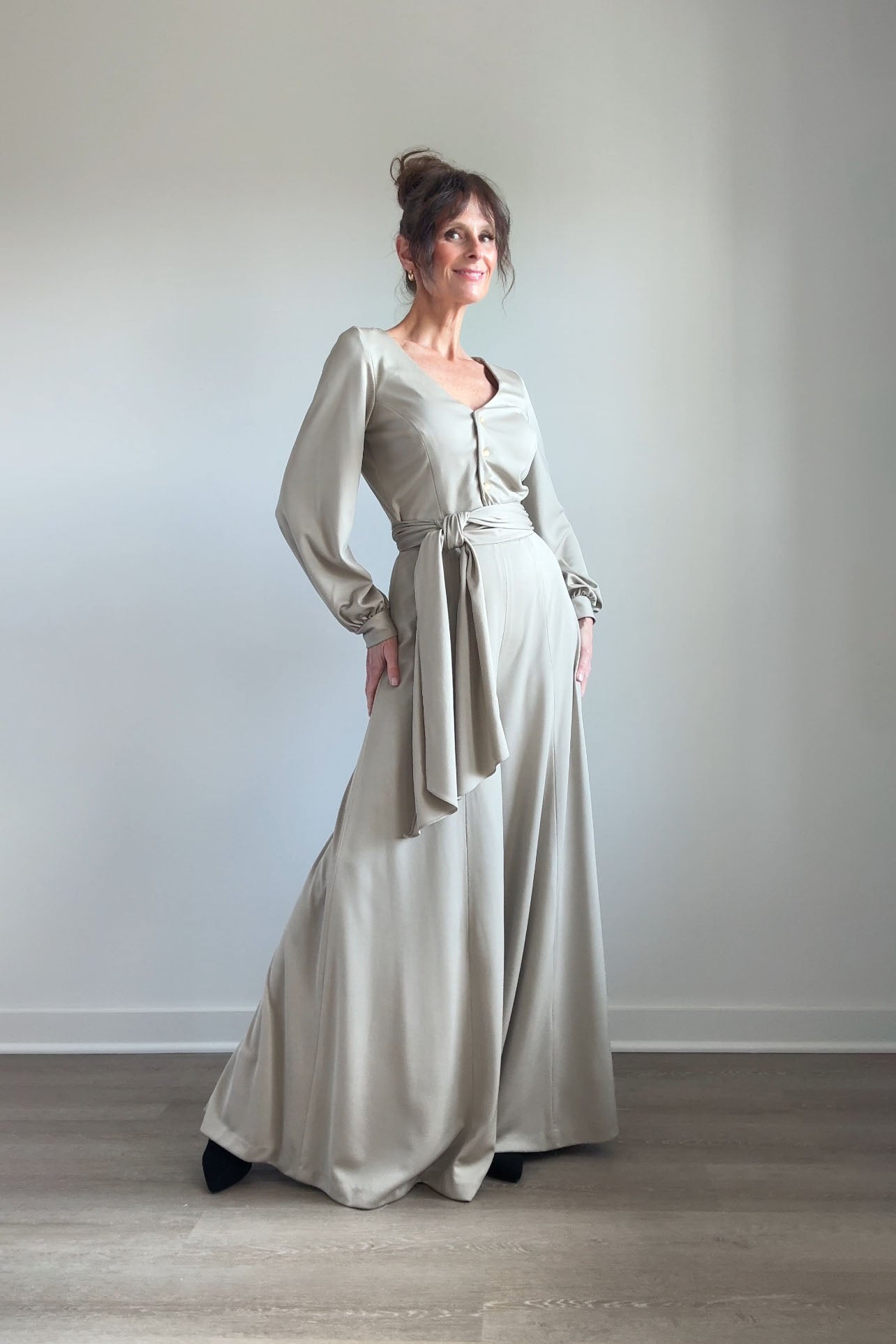 1970s Lilli Diamond California wide-leg palazzo pantsuit in pewter gray, made from a soft, fluid stretch polyester with a subtle sheen. The wrap-style top features a deep V-neckline, pearlized buttons, and an attached wide waist sash that ties dramatically at the front or side. High-waisted trousers zip at the back with a long, sweeping drape and beautiful movement. No flaws. Best fits modern MEDIUMpants — length: 43.5" | waist: 28" | rise: 14" | inseam: 30.5"top — length: 17" | bust: 38–40" | waist: 28–30" Ref 9927 | 2543