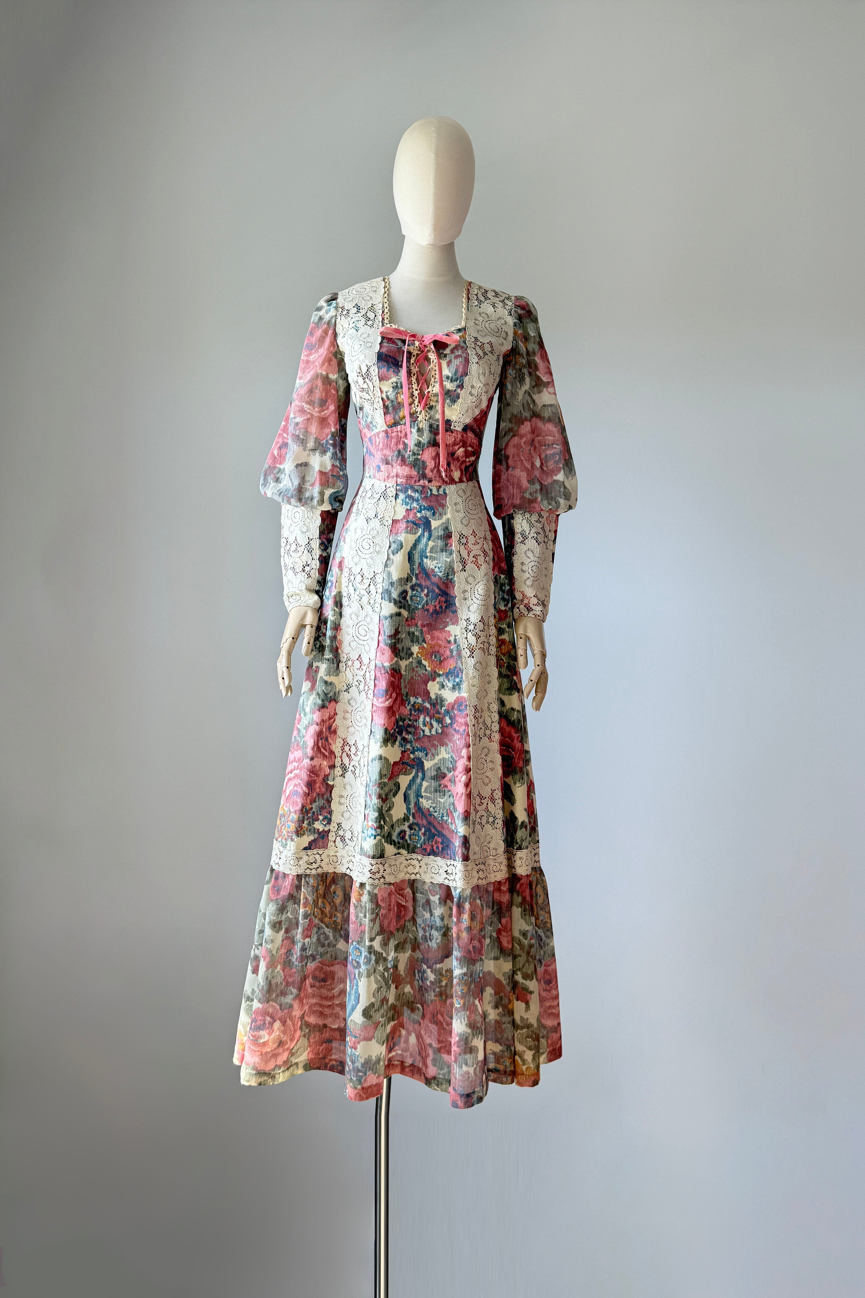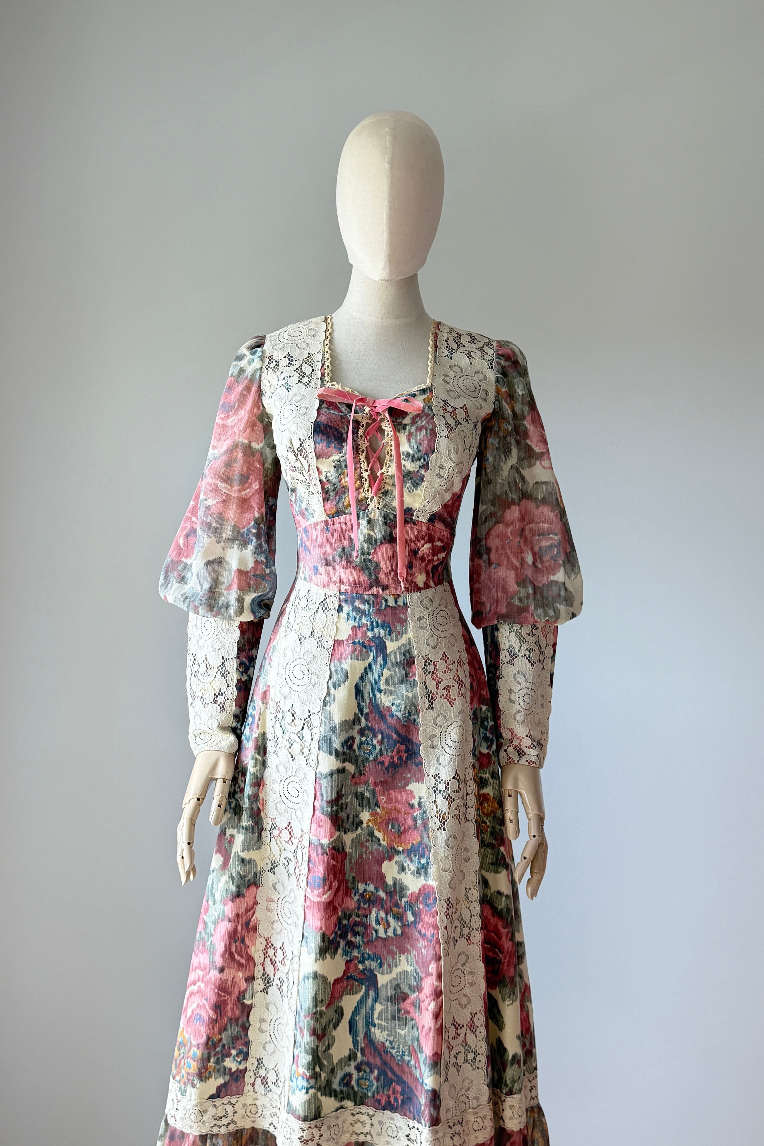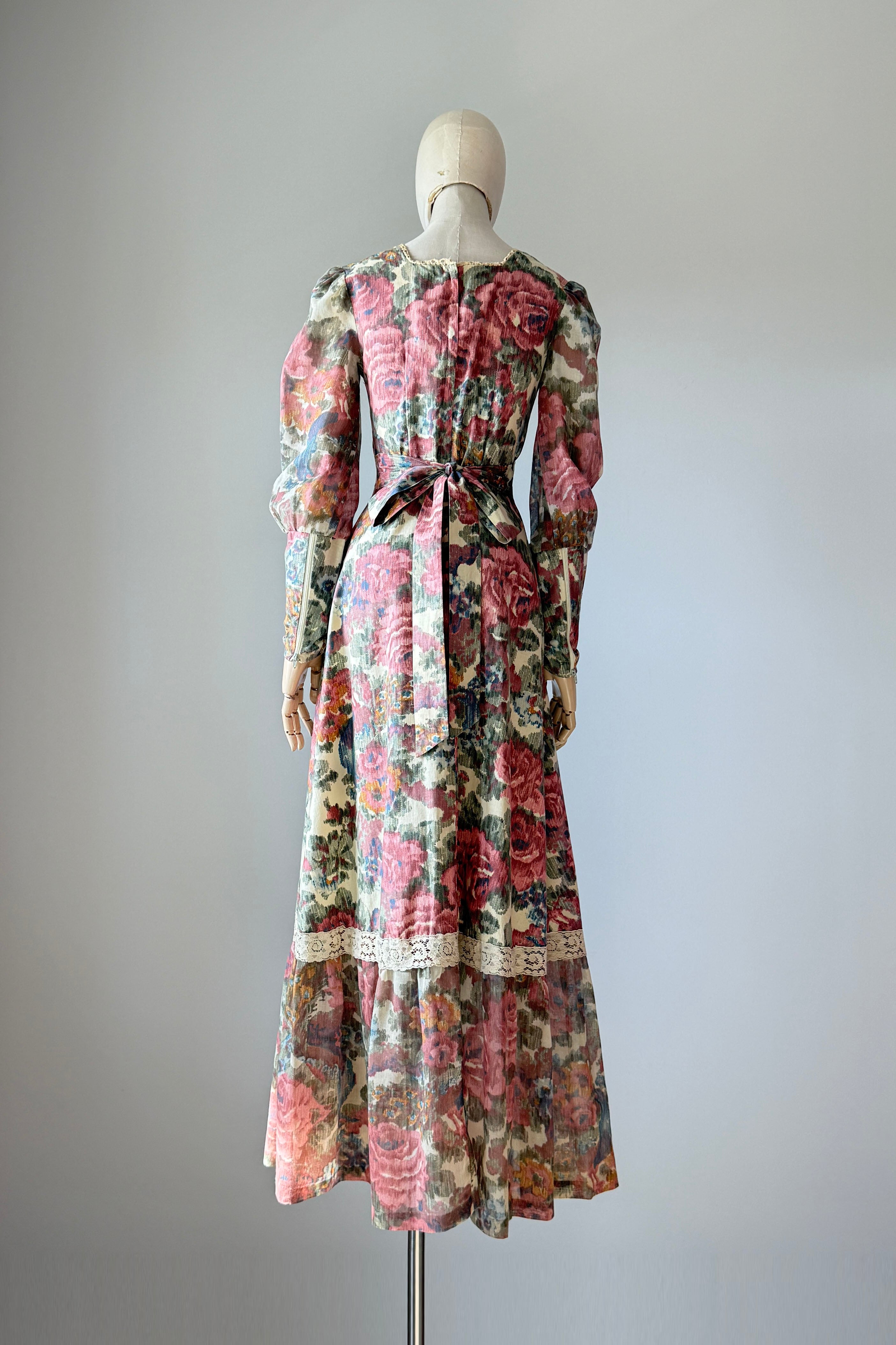 VINTAGE DRESS Vintage 1970s dress. Features romantic rose print, dramatic juliet sleeves, empire waist, self belt, zippers at back and cuffs. Cotton. By Vicky Vaughn. Excellent condition. Velvet tie shows wear.Fits like XS/S.Length 55Bodice 15Bust 34Waist 26Hip 38As with all vintage, please expect wear consistent with age. All sales are final. No order cancellations.0981 | 2615