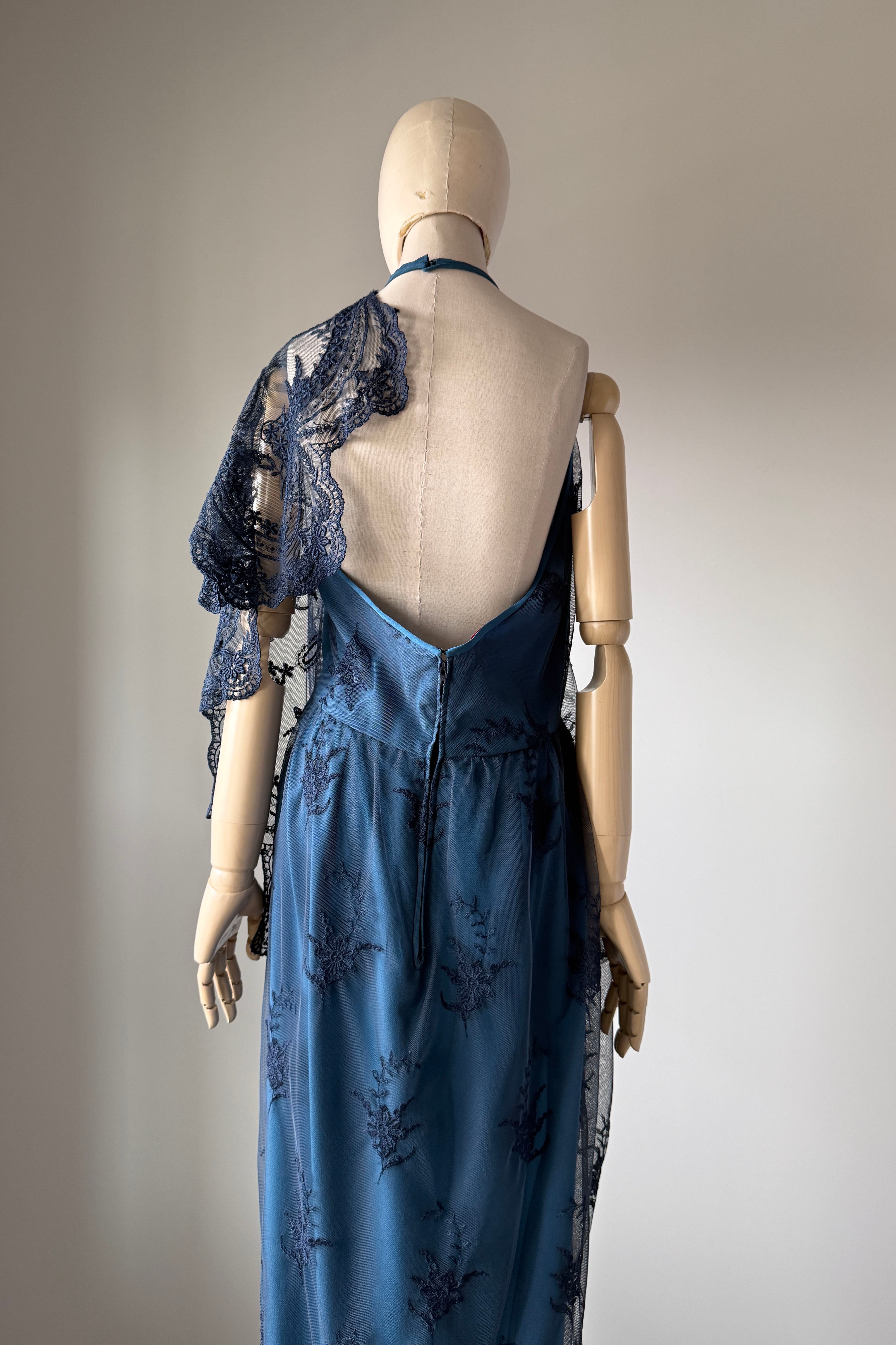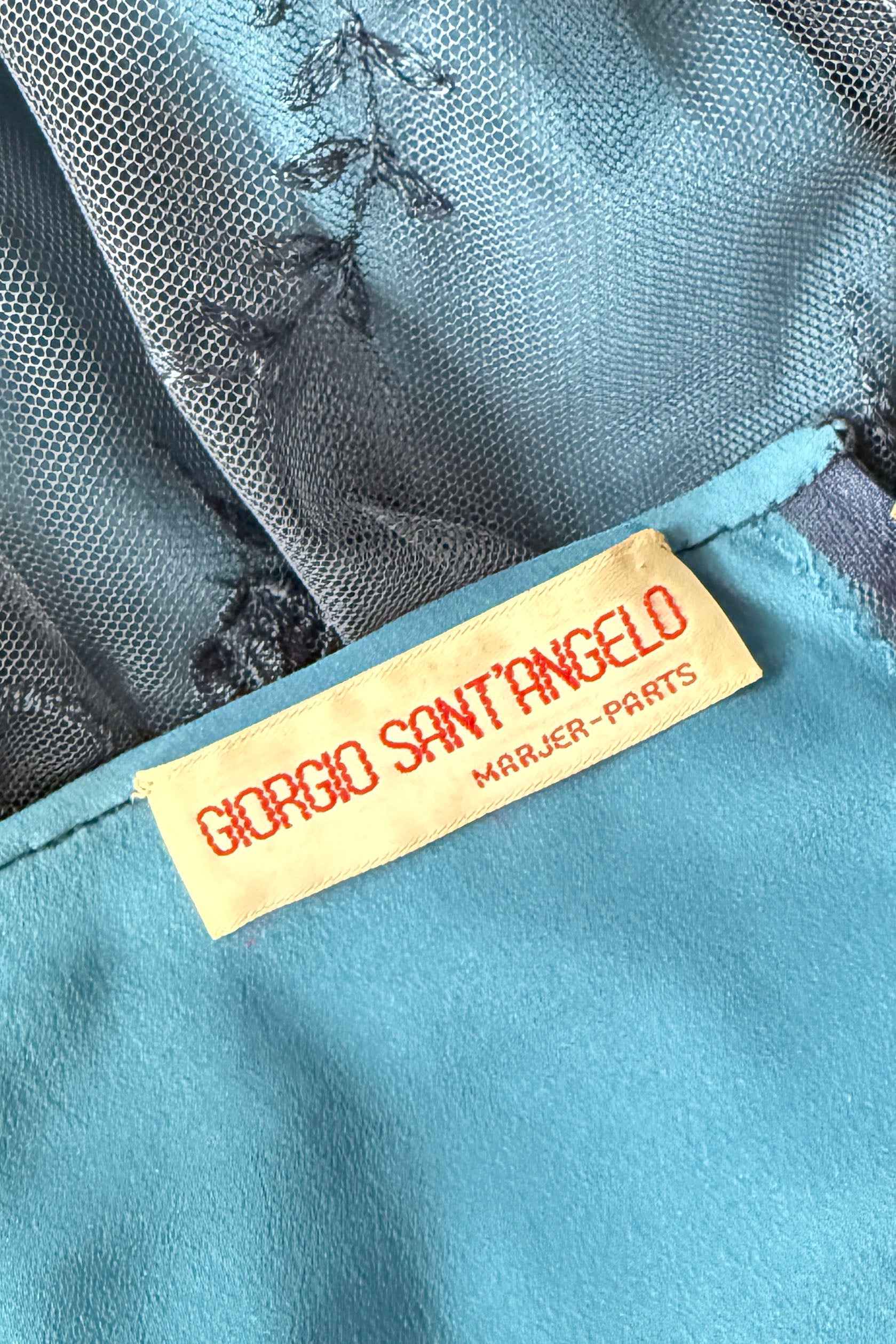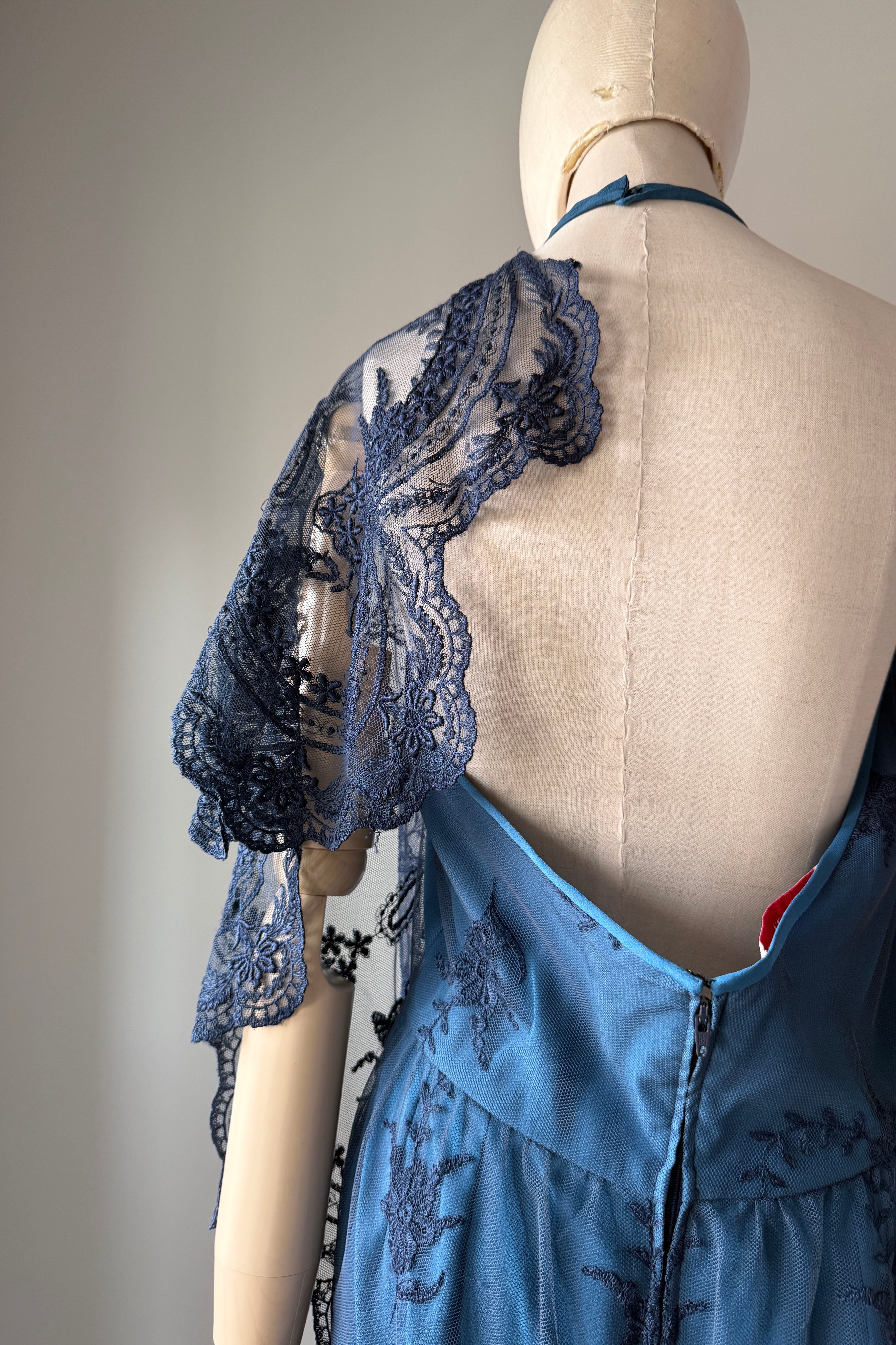 VINTAGE DRESSVintage 1970s dress. Features blue silk and cotton embroidered mesh, back zipper, halter neckline, lace draped over left shoulder. By Giorgio Sant' Angelo.Giorgio di Sant’Angelo (1936-1989) shot to fame in 1968, when Diana Vreeland chose him to create clothing for the model Veruschka on a fashion shoot in the Arizona desert. He continued to create rich, unstructured clothing, with multicultural influences. Info courtesy of The Vintage Fashion GuildExcellent condition.MEDIUM. Length 56Bodice 16Bust 38-40Waist 28-30Hip 38-40As with all vintage, please expect wear consistent with age. All sales are final. No order cancellations.0864 | 2607