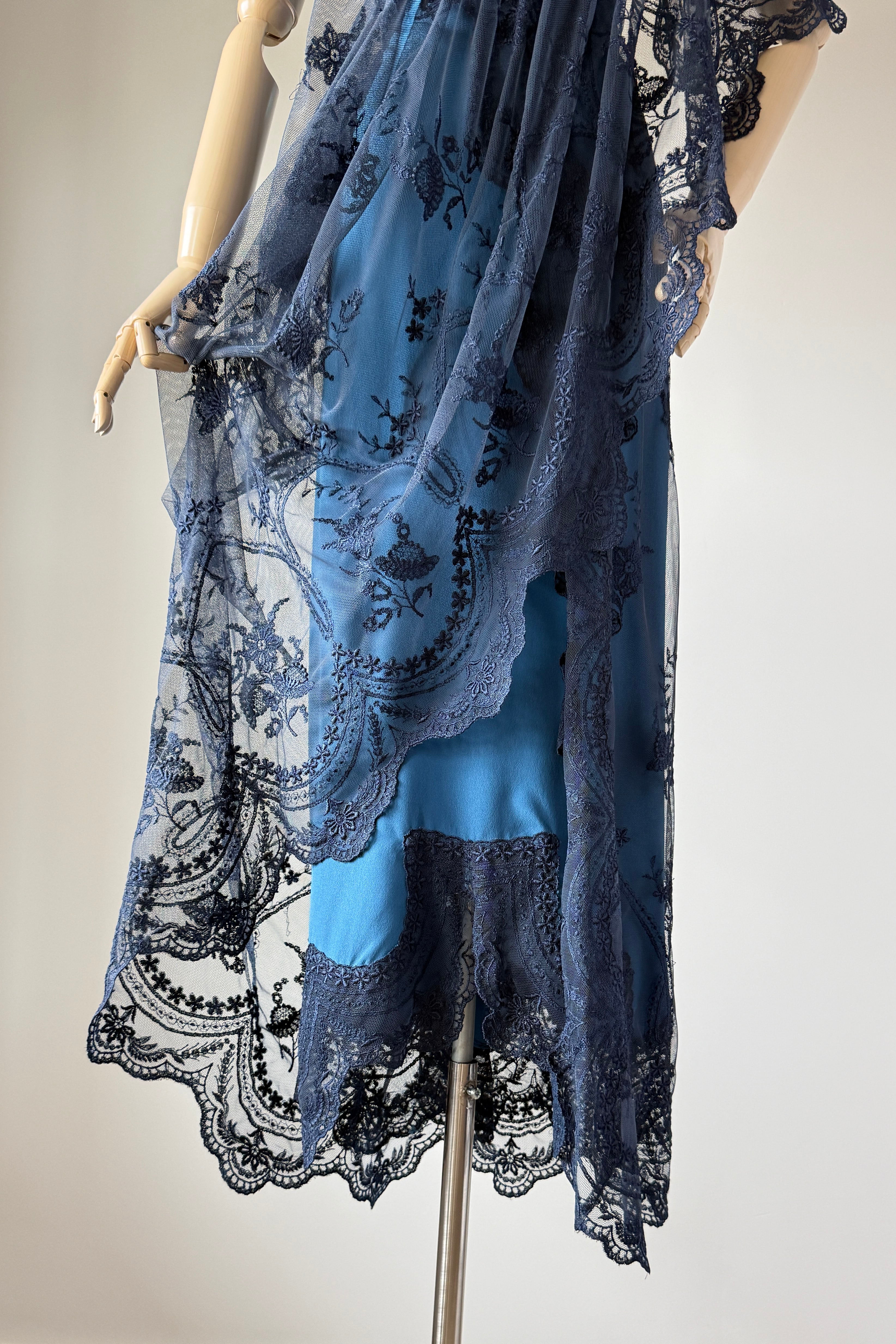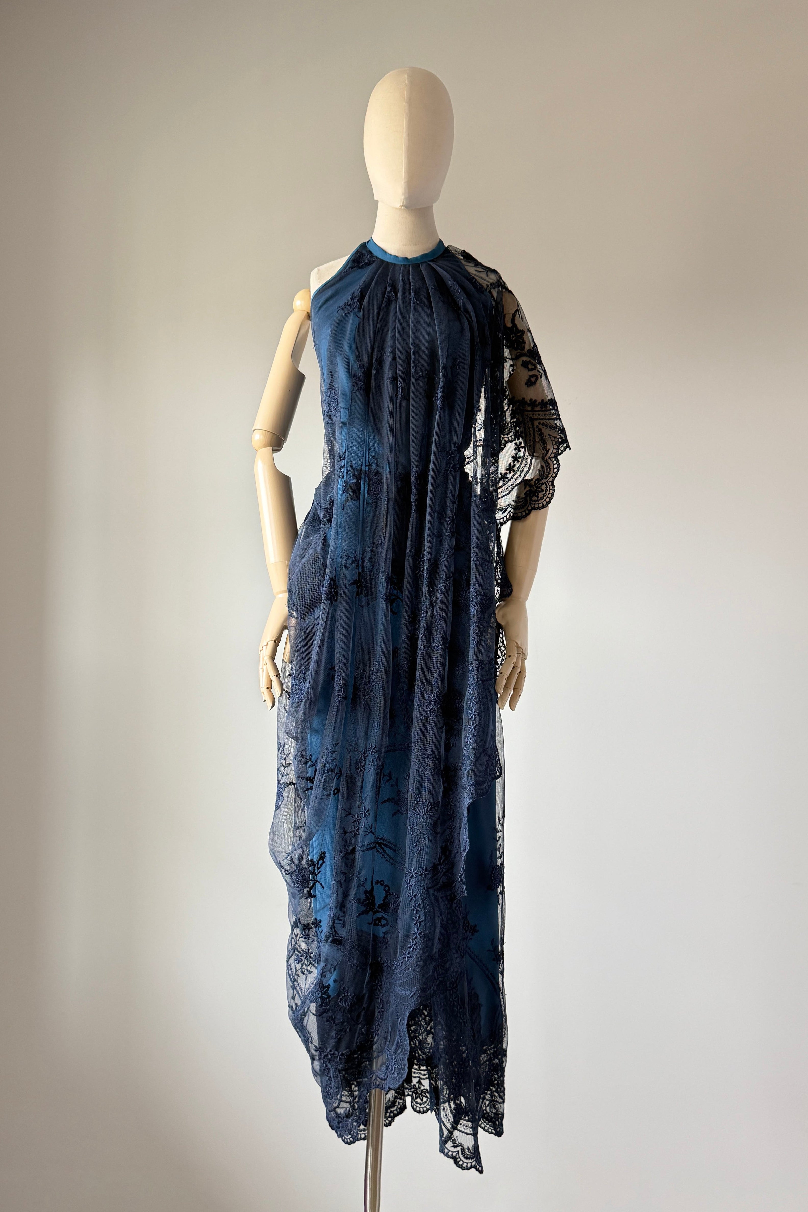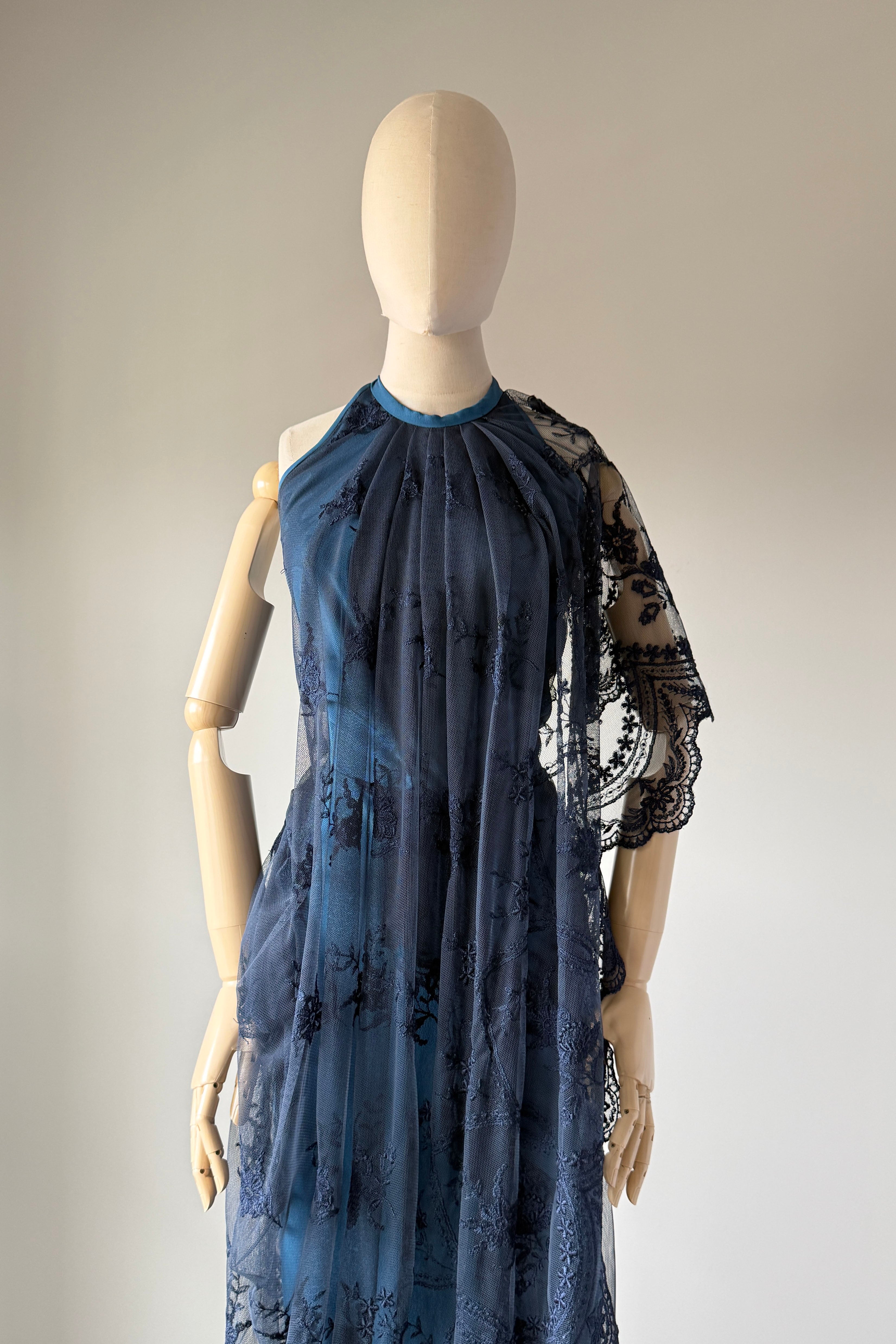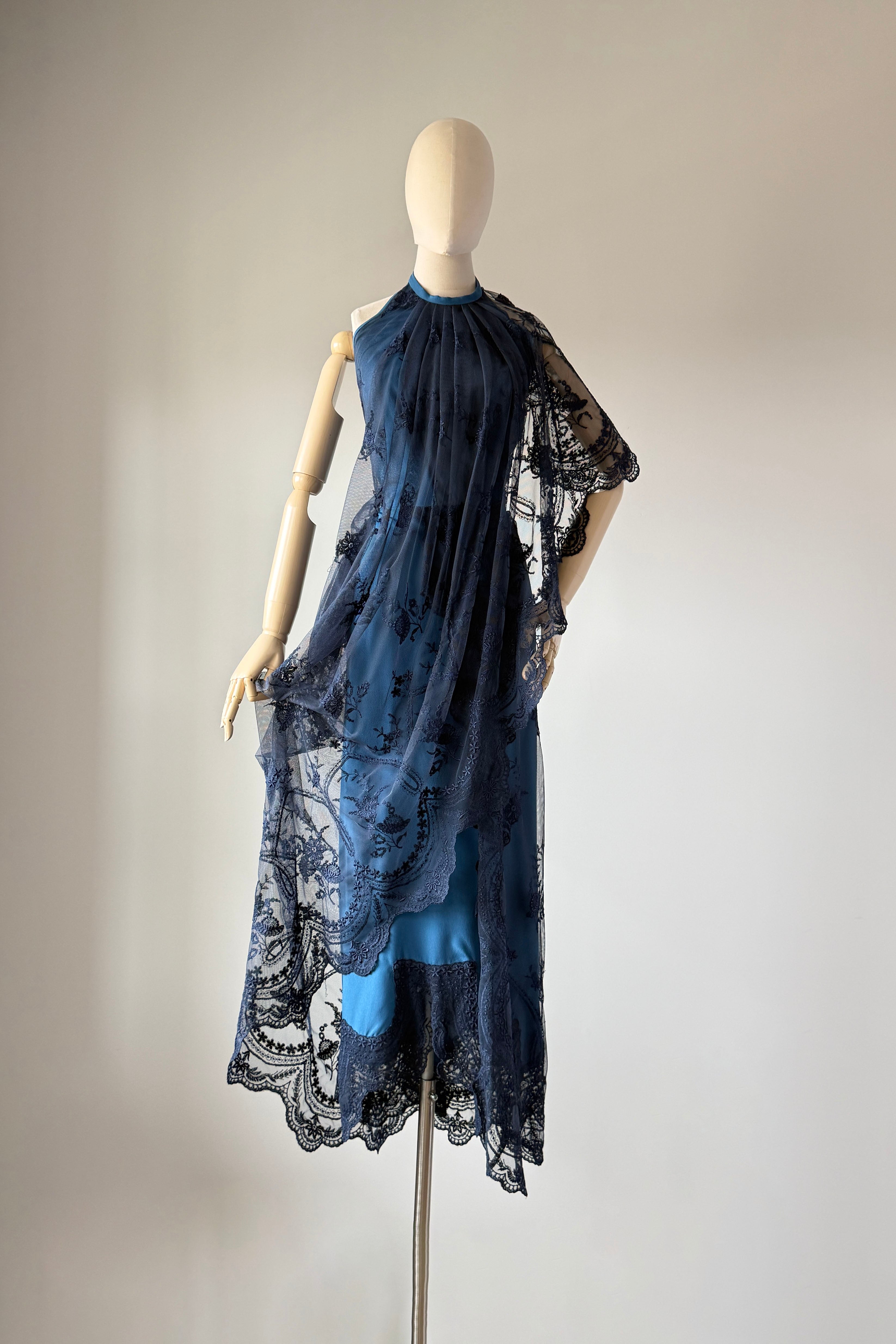 VINTAGE DRESSVintage 1970s dress. Features blue silk and cotton embroidered mesh, back zipper, halter neckline, lace draped over left shoulder. By Giorgio Sant' Angelo.Giorgio di Sant’Angelo (1936-1989) shot to fame in 1968, when Diana Vreeland chose him to create clothing for the model Veruschka on a fashion shoot in the Arizona desert. He continued to create rich, unstructured clothing, with multicultural influences. Info courtesy of The Vintage Fashion GuildExcellent condition.MEDIUM. Length 56Bodice 16Bust 38-40Waist 28-30Hip 38-40As with all vintage, please expect wear consistent with age. All sales are final. No order cancellations.0864 | 2607