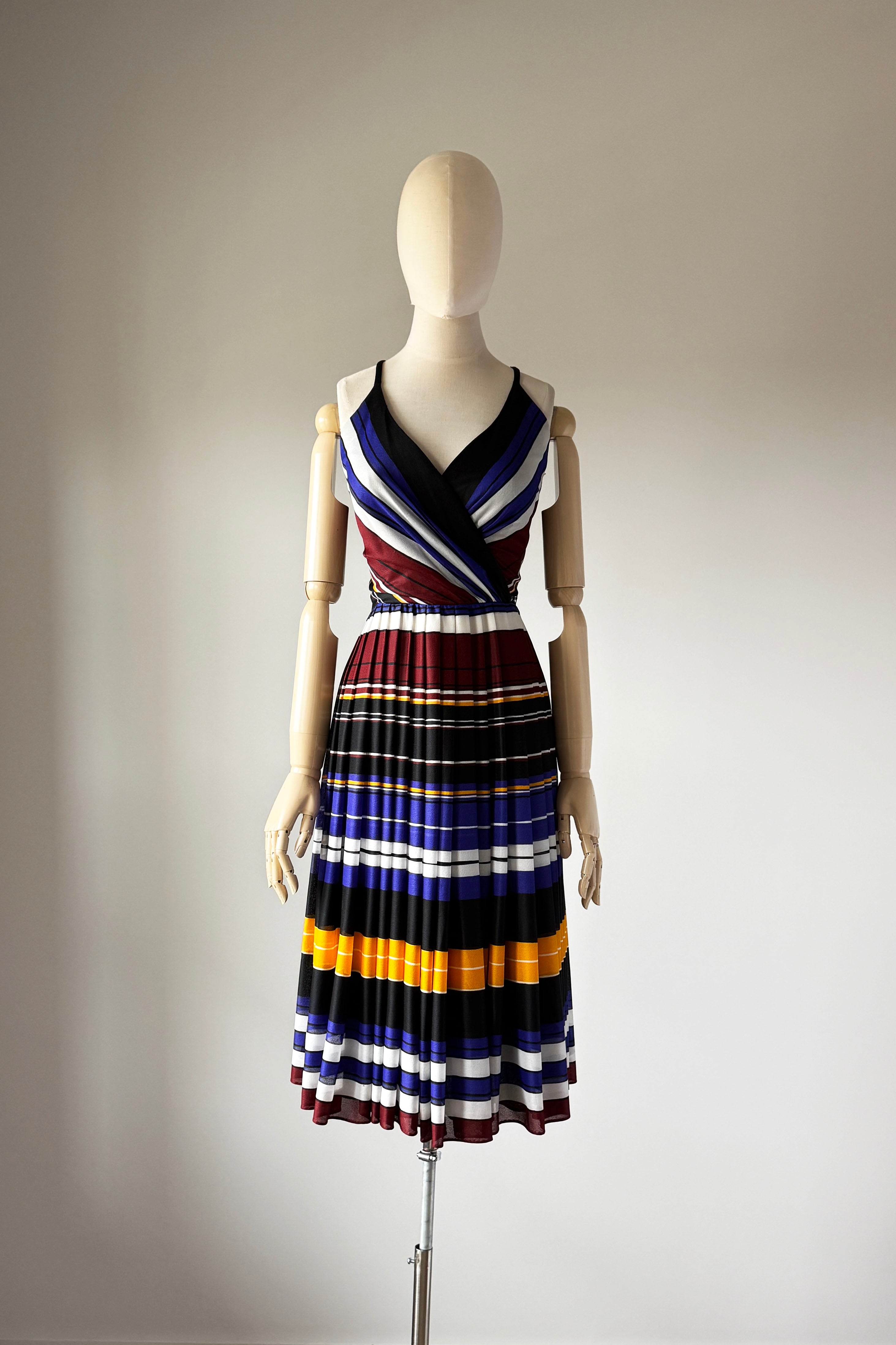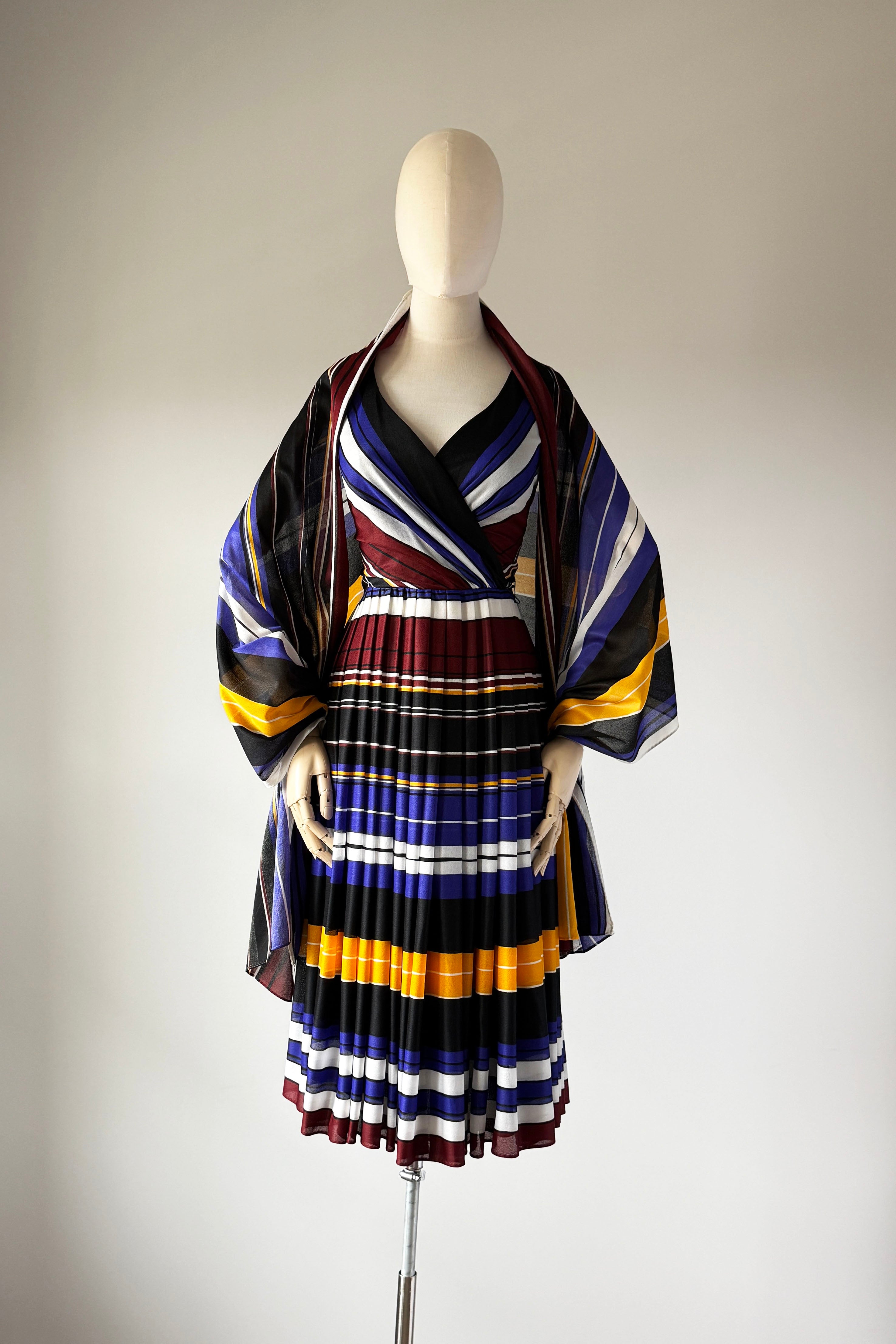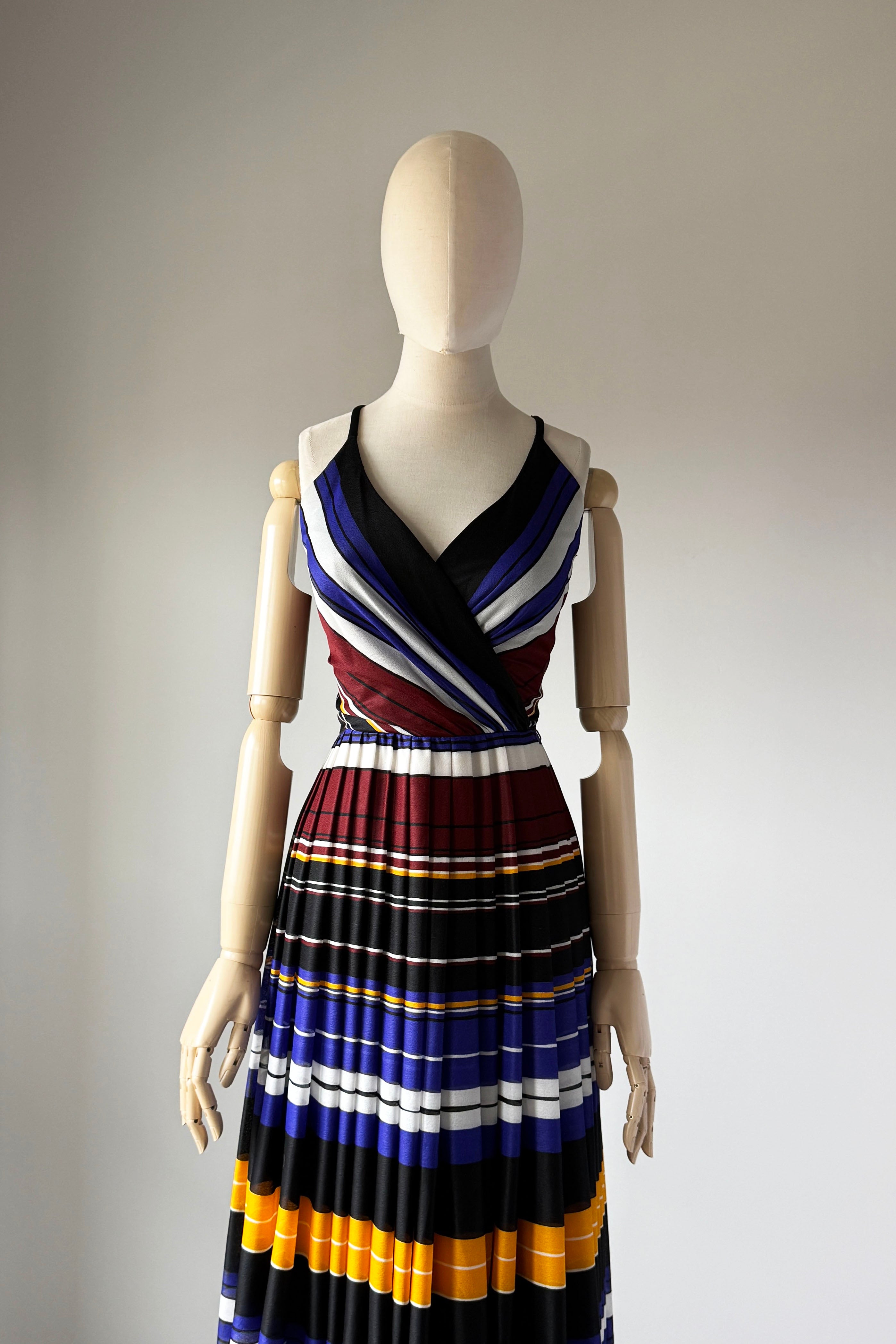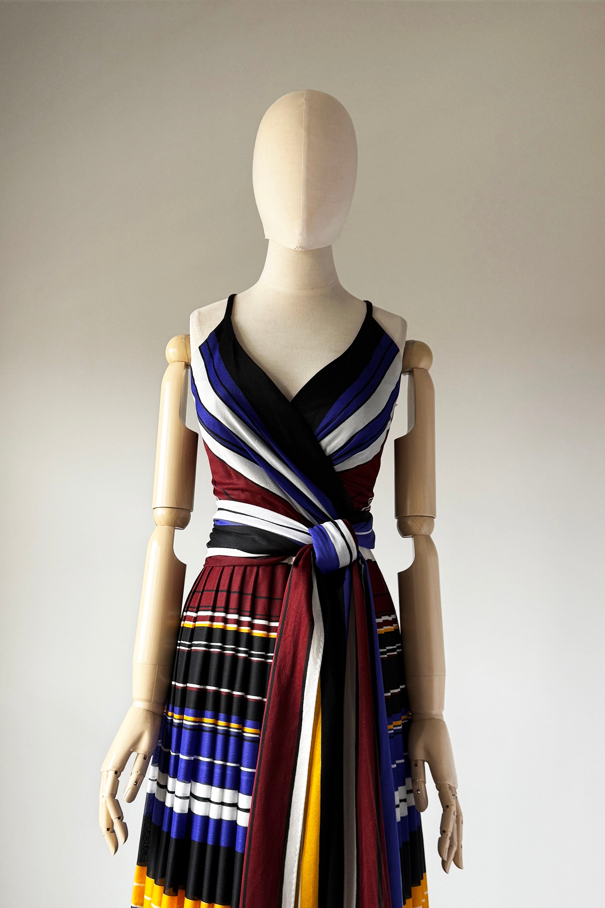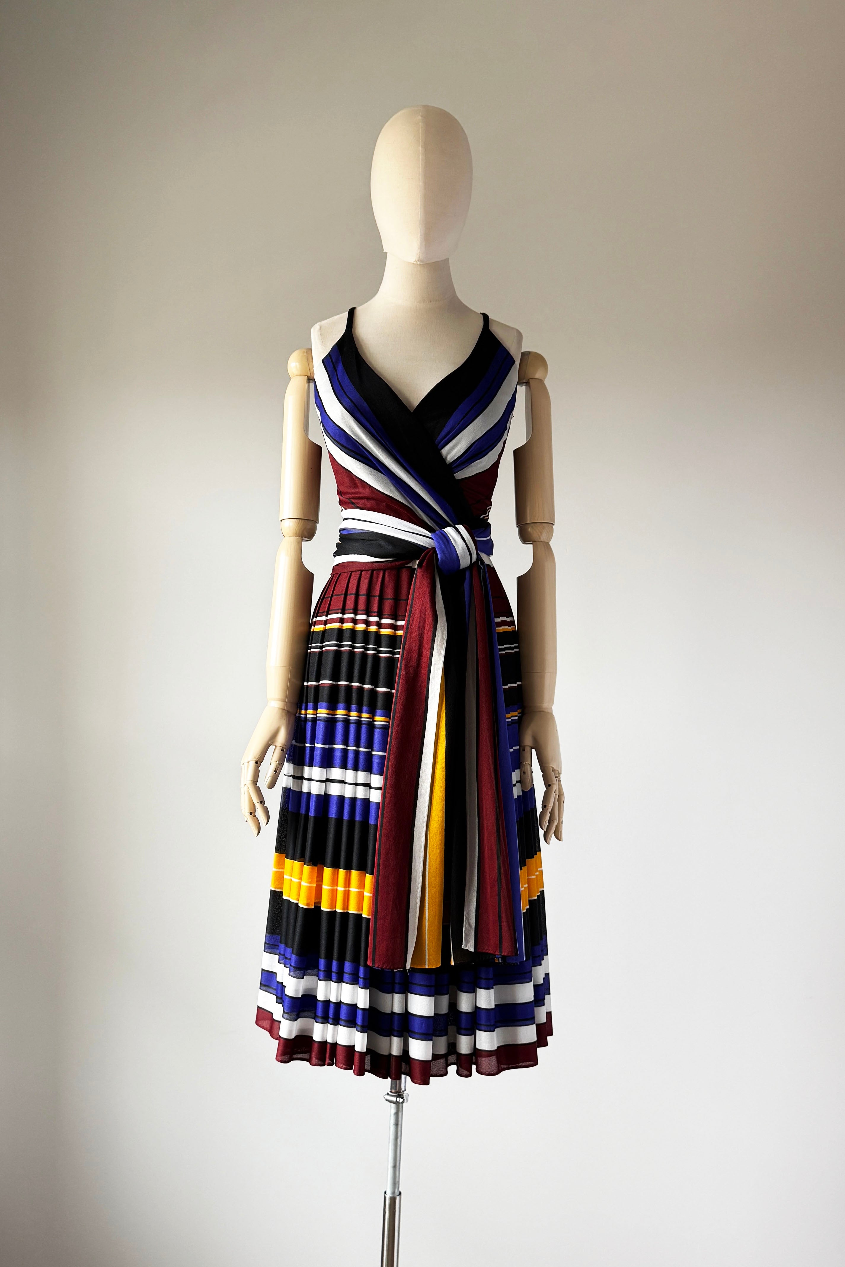 VINTAGE DRESSVintage 1970s dress. Features striped heavy poly with wide sash belt can also be worn as wrap, poly lining, back zipper. By Lilli Diamond.Excellent condition. XS/S. Length 43Bodice 17Bust 36Waist 26As with all vintage, please expect wear consistent with age. All sales are final. No order cancellations.0891 | 2609