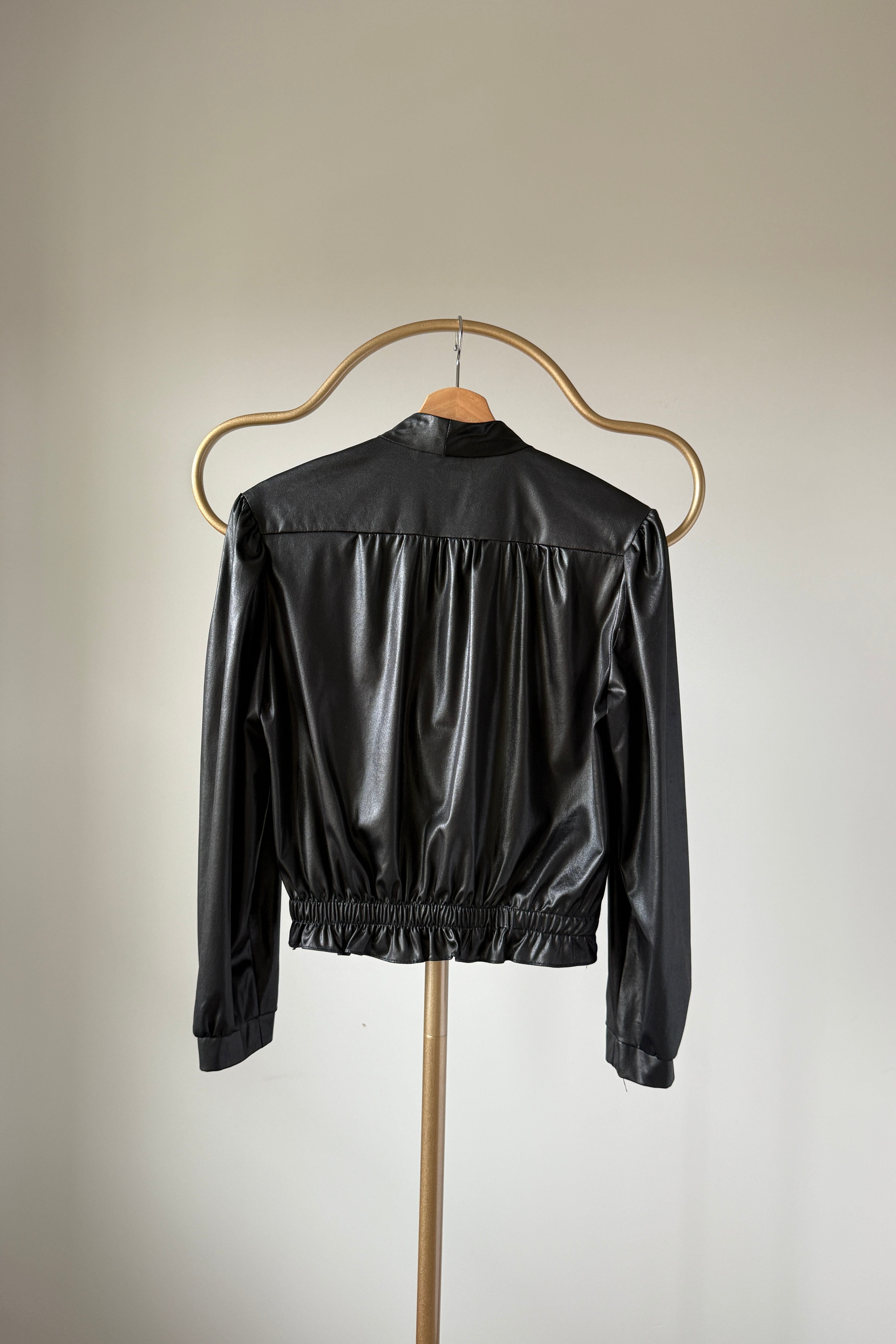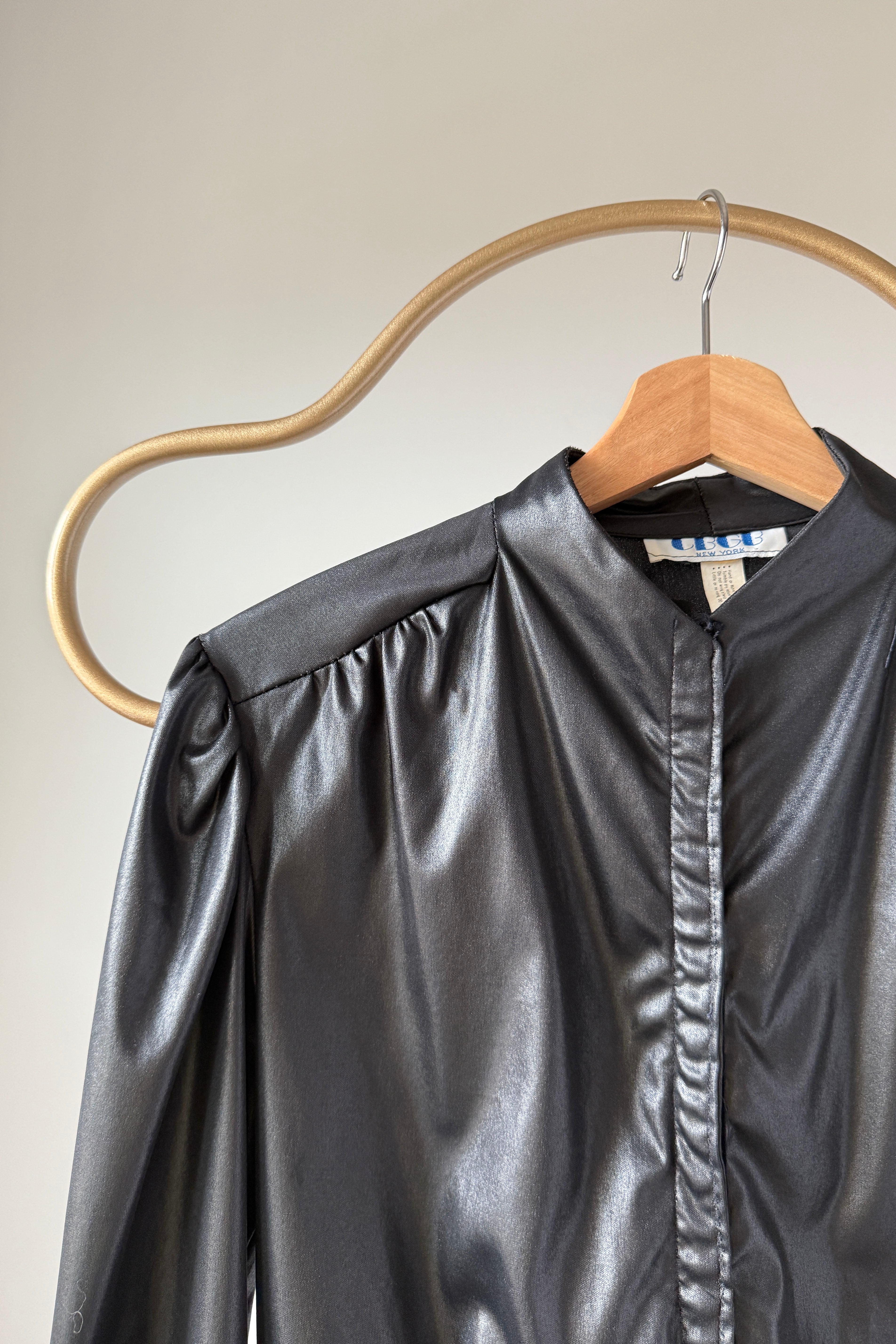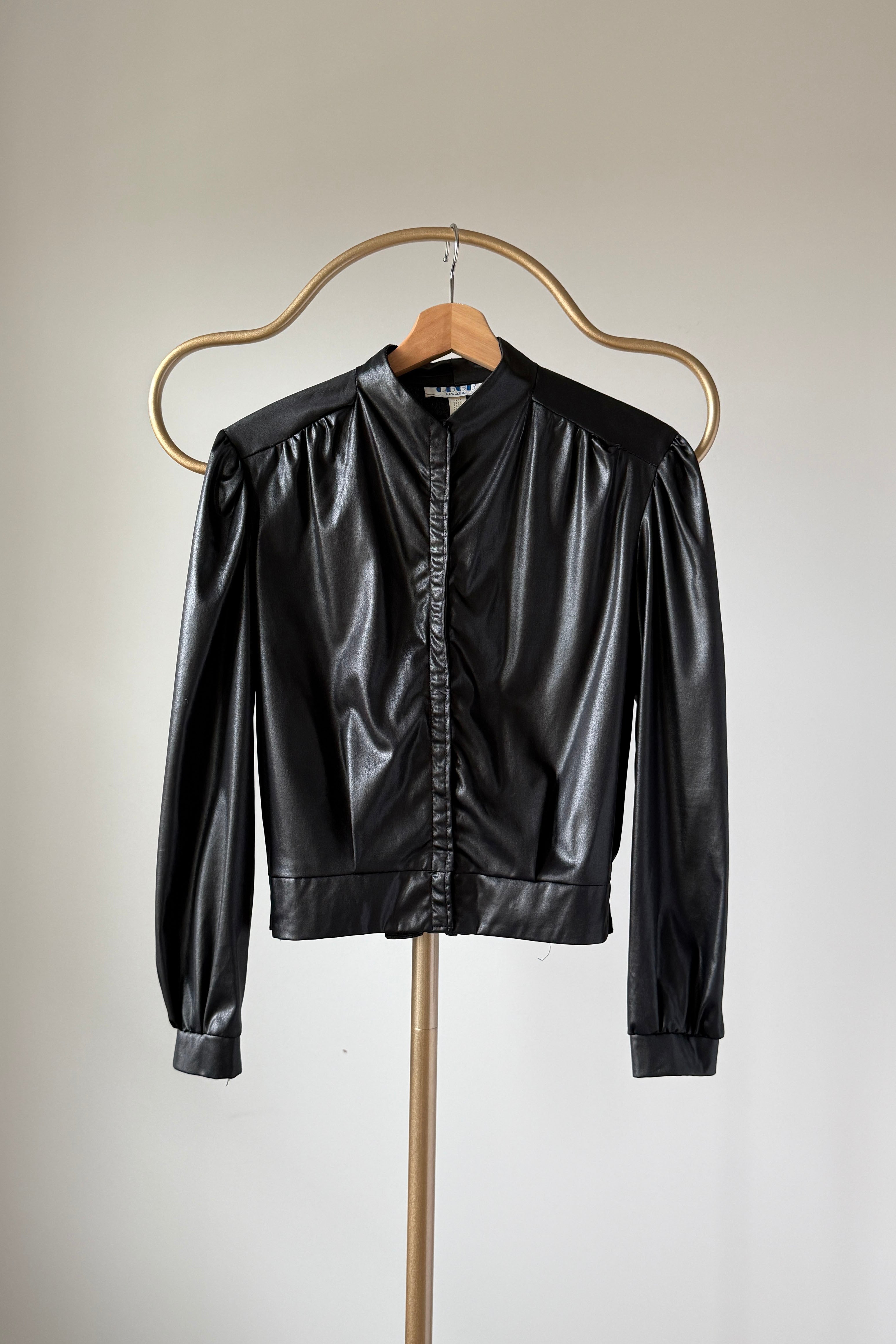 Black wet-look bomber-style jacket from legendary music venue CBGB. Features gathered front placket, subtle puffed shoulders, elasticized waistband, and button cuffs. Lightweight with slight sheen.