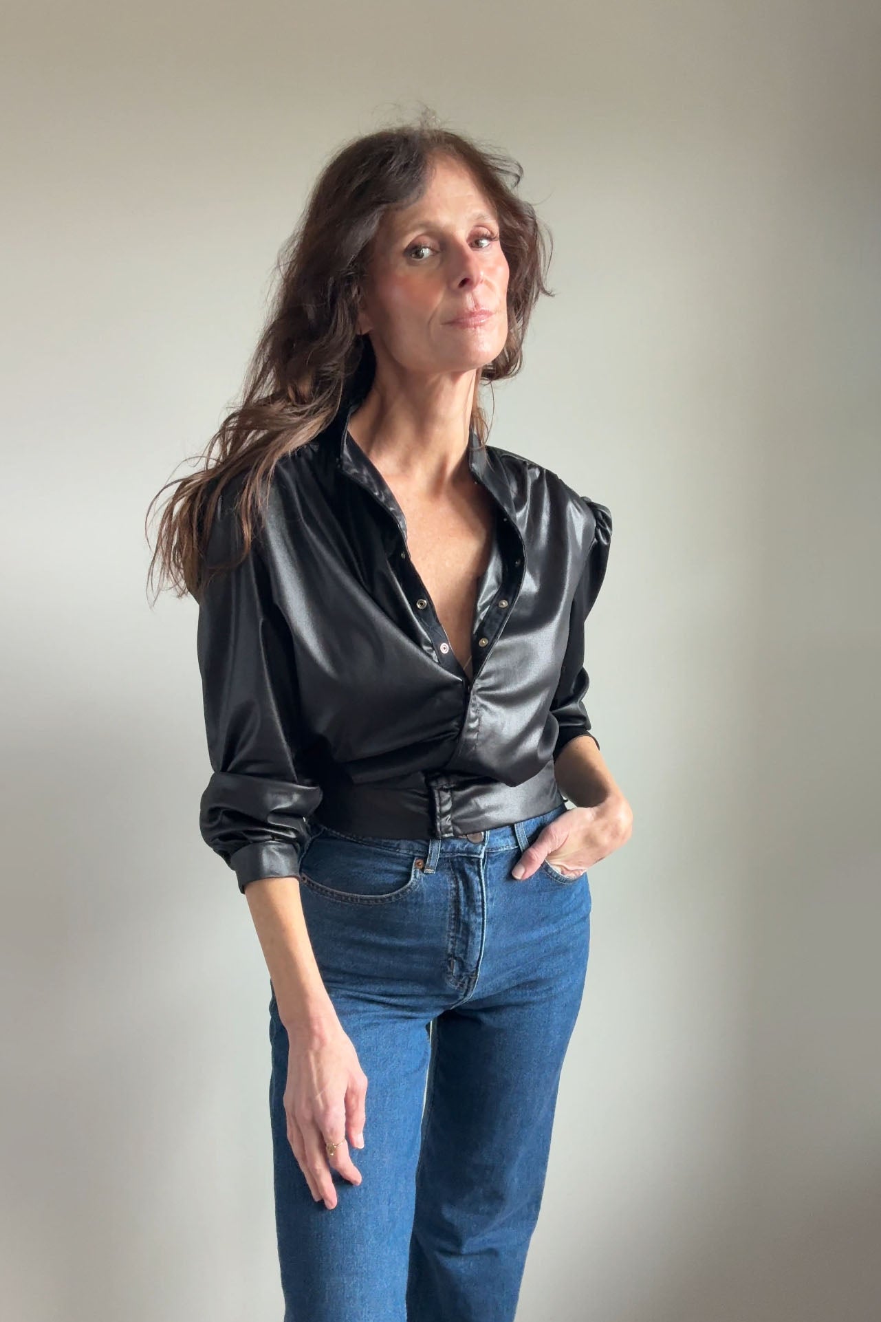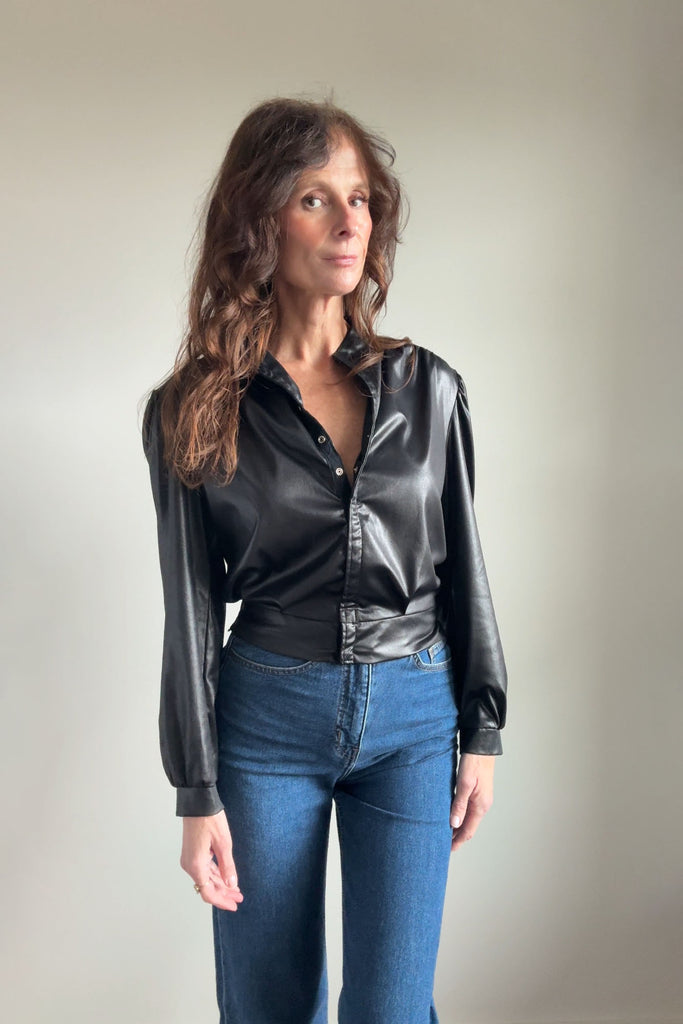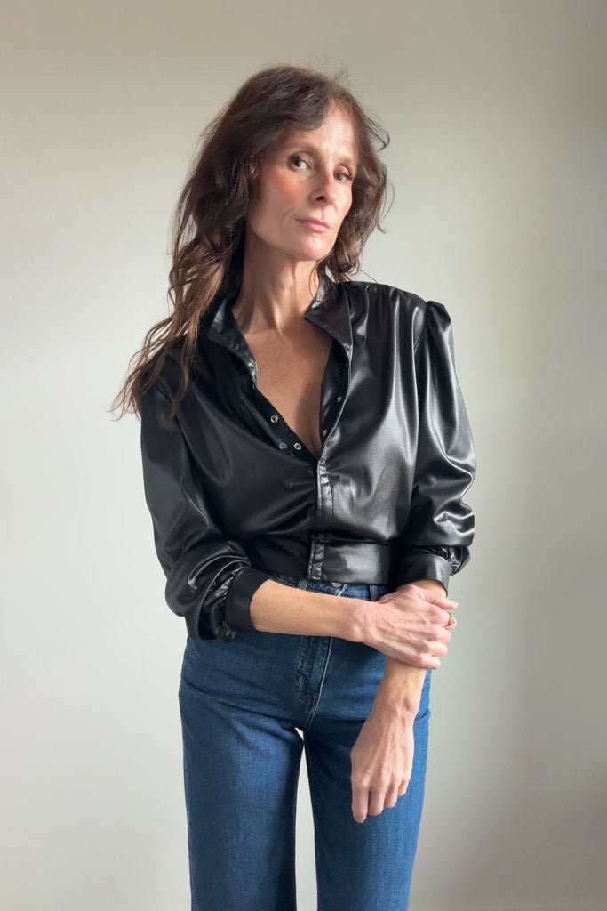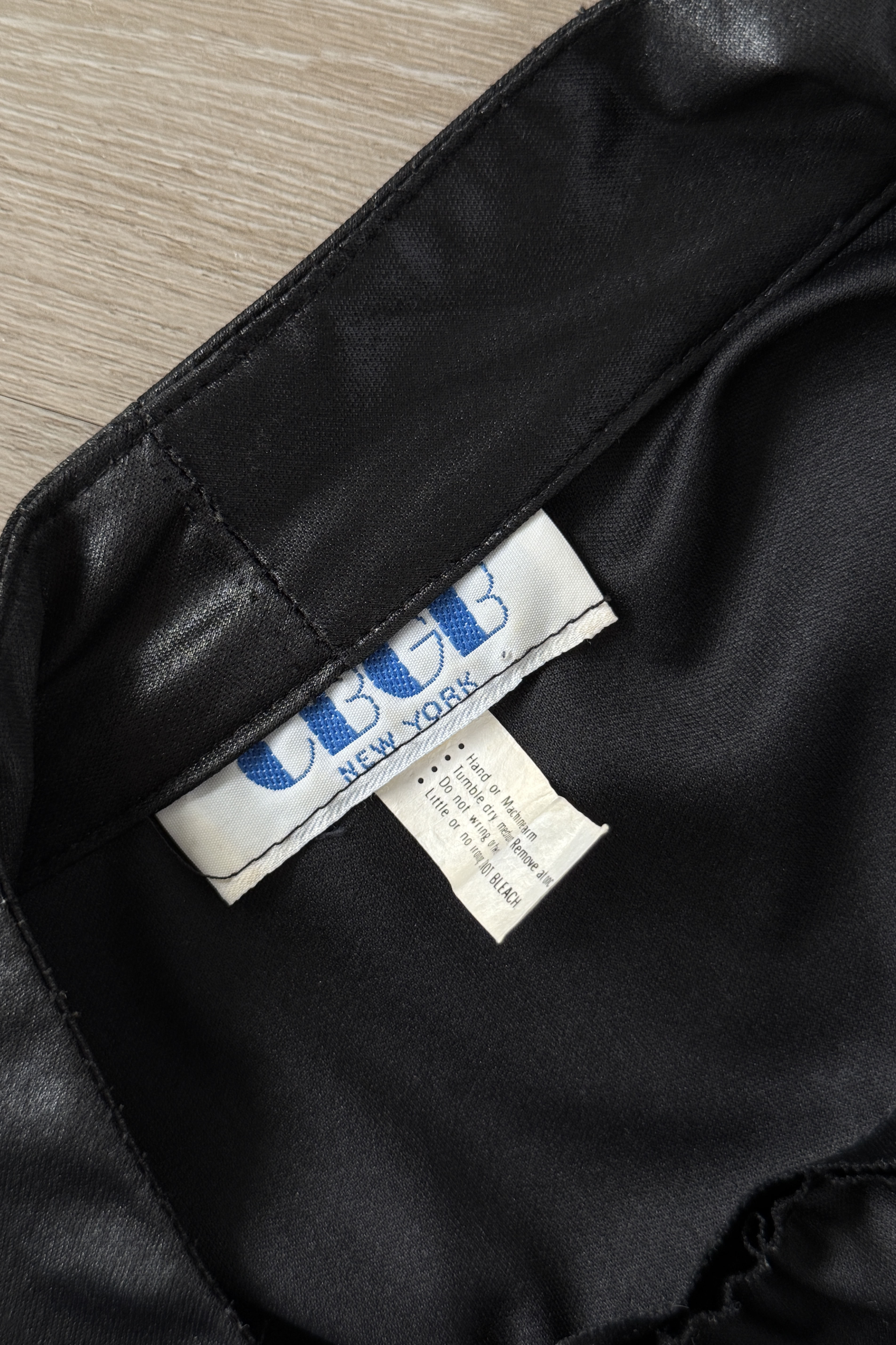Black wet-look bomber-style jacket from legendary music venue CBGB. Features gathered front placket, subtle puffed shoulders, elasticized waistband, and button cuffs. Lightweight with slight sheen.